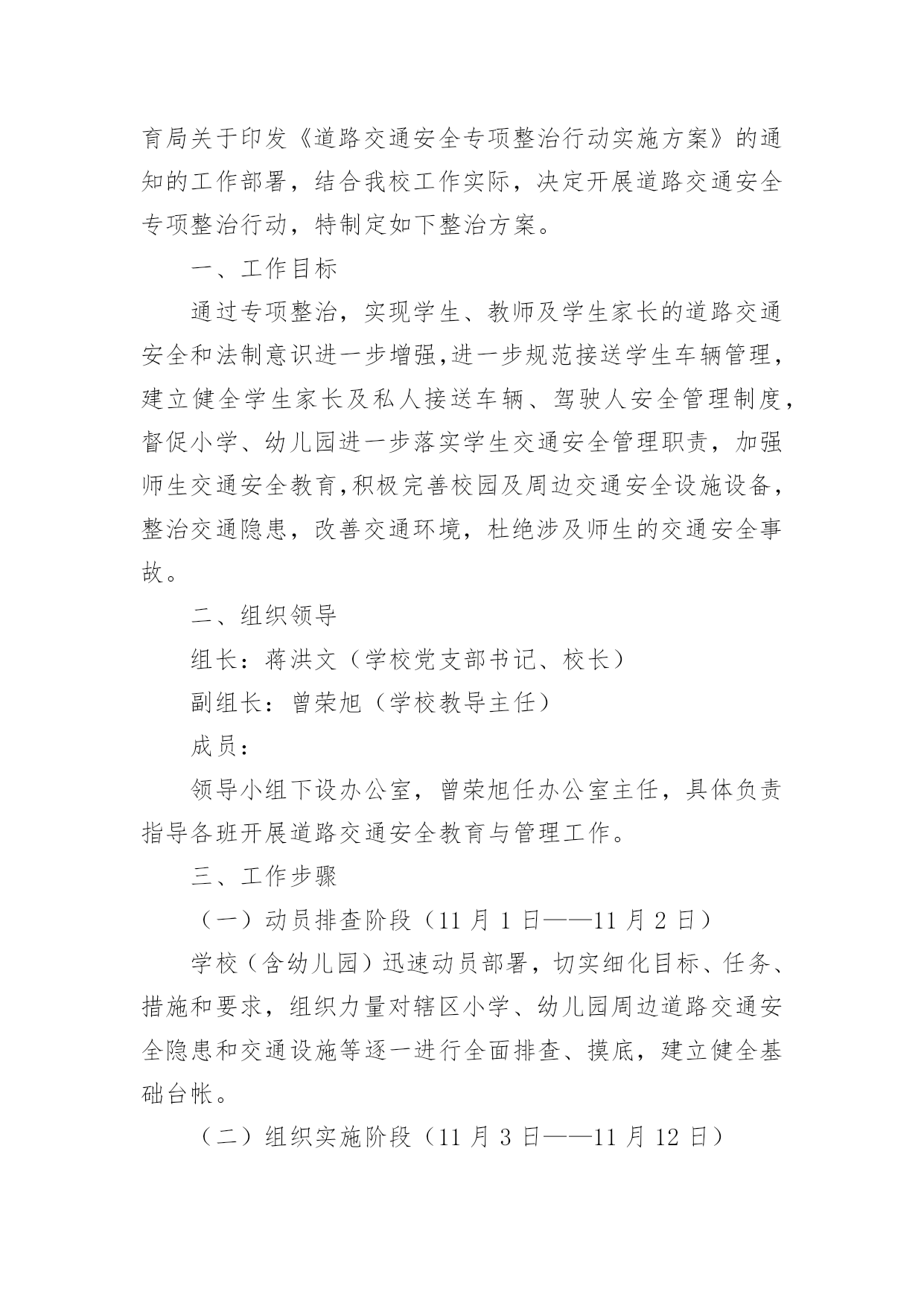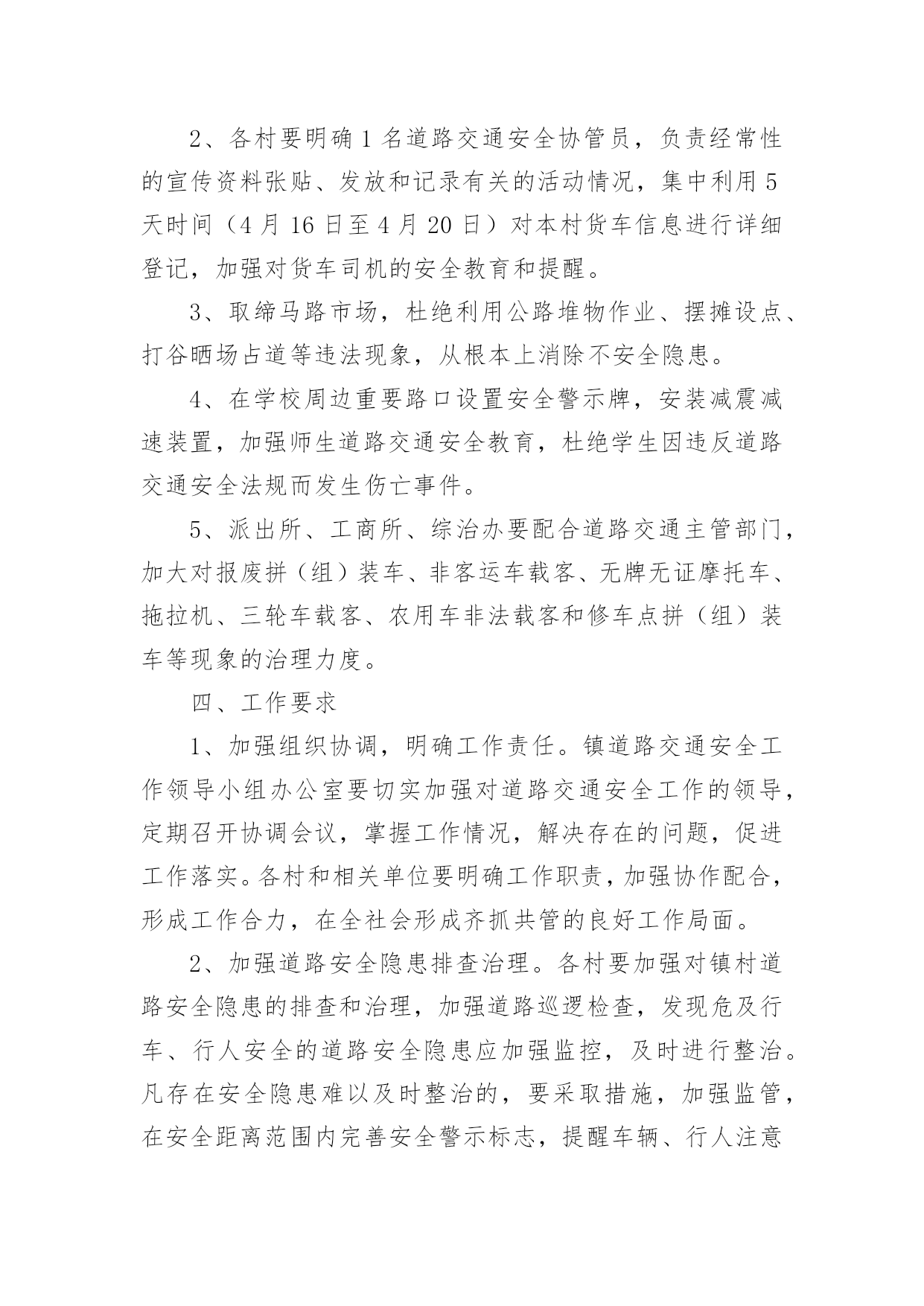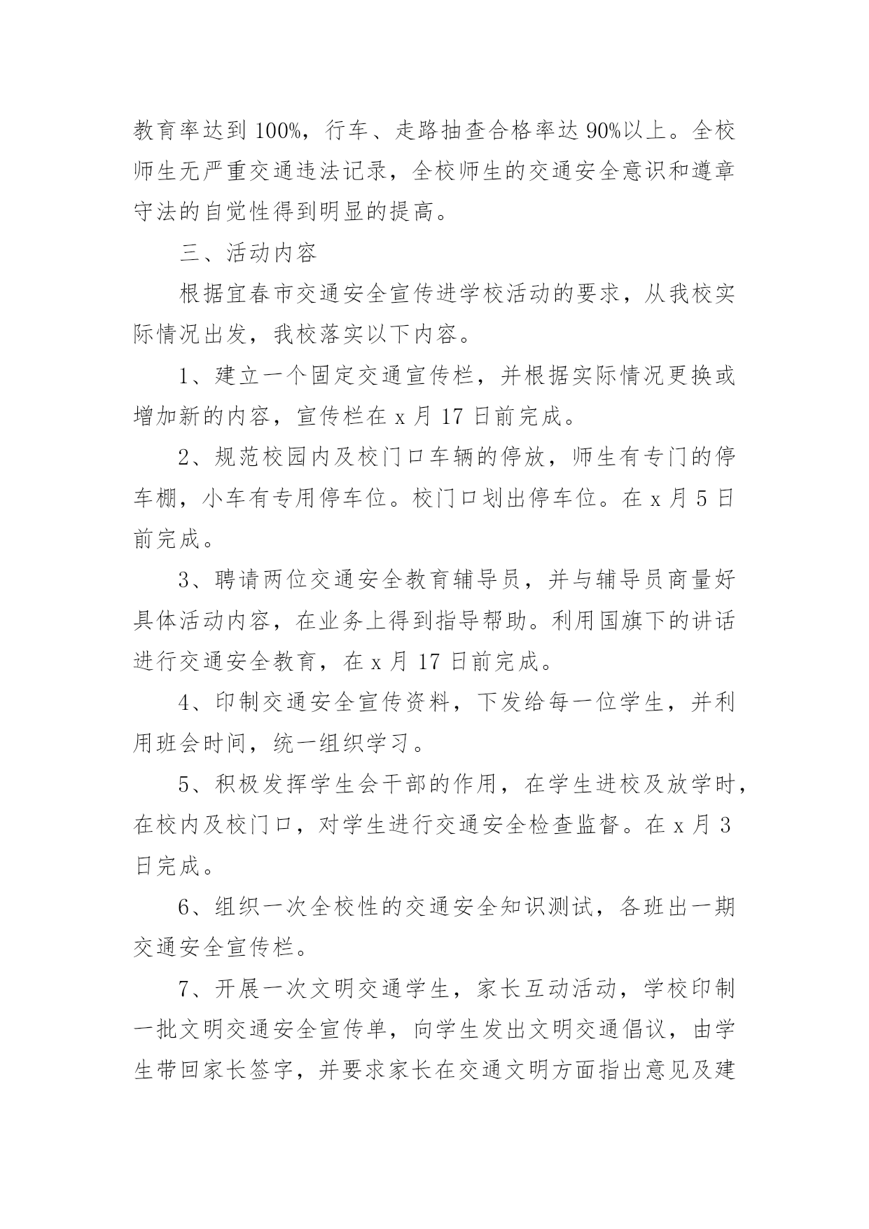 交通安全防范方案交通安全防范方案(通用5篇)为了确保事情或工作有效开展,常常需要提前准备一份具体、详细、针对性强的方案,一份好的方案一定会注重受众的参与性及互动性。方案要怎么制定呢?下面是小编为大家整理的交通安全防范方案(通用5篇),欢迎阅读与收藏。交通安全防范方案1为加强道路交通安全管理,有效预防和减少道路交通事故,根据国务院《国务院关于加强道路交通安全工作的意见》精神,按照省公安厅开展“大排查、大教育、大整治”货车违法行为专项行动方案工作部署,20xx年4月1日至9月30日,集中整治强行超车、强行会车、逆向行驶、闯红灯、超速行驶、疲劳驾驶、抢占道路霸道行驶、驾驶无牌证、驾驶报废及非法改装拼装车辆等十大野蛮危险驾驶行为,规范货车通行秩序,防范减少货车交通事故。根据省、市、市有关要求,结合实际,制订如下工作方案:一、组织领导经镇党委、政府研究决定,成立以镇长任组长,副镇长任常务副组长,综治办专职副主任、司法所长、交警四中队队长任副组长,信访办主任、各村支部书记、派出所长、教研中心主任程新有、工商所长、巡防队长任成员的镇道路交通安全工作领导小组,领导小组下设办公室,兼任办公室主任。各村也要成立相应的组织,加强对此项工作的领导。二、工作重点镇道路交通安全工作领导小组办公室配合交通运输管理部门重点做好货运车辆交通违法行为的综合执法行动。1、整治重型货车不按规定车道行驶、疲劳驾驶、酒后、醉酒驾驶、未审、违法停车、超速行驶、逆向行驶、强超强会、无牌无证、套牌驾驶、报废、非法改装。对超限超载的货车、要引导至治超站点依法处理。2、整治重型货车、挂车非法改装,尾灯不亮、违规安装后射灯、车身反光标识设置、侧后部防护装置不规范严重影响安全的违法行为。3、整治道路工程运输车、渣土车无牌套牌遮挡污损号牌、闯红灯、闯禁行、超速行驶、违法掉头等严重交通违法行为。4、整治危险化学品运输车未按规定设置警示标志、灯具、超速行驶、低速占道行驶、不按照运输通行证注明内容运输、未随身携带运输通行证明、不按规定的通行时间路线速度行驶、不配备押运人员、无证运输等交通违法行为。5、整治货运车辆驾驶人准驾车型不符、驾驶证未审、记分达12分的。三、工作措施1、利用镇电视台播发公告、张贴宣传标语、悬挂条幅、办板报等多种形式,全面宣传综合执法行动,加强道路交通安全法规宣传,提高全民道路交通安全意识。2、各村要明确1名道路交通安全协管员,负责经常性的宣传资料张贴、发放和记录有关的活动情况,集中利用5天时间(4月16日至4月20日)对本村货车信息进行详细登记,加强对货车司机的安全教育和提醒。3、取缔马路市场,杜绝利用公路堆物作业、摆摊设点、打谷晒场占道等违法现象,从根本上消除不安全隐患。4、在学校周边重要路口设置安全警示牌,安装减震减速装置,加强师生道路交通安全教育,杜绝学生因违反道路交通安全法规而发生伤亡事件。5、派出所、工商所、综治办要配合道路交通主管部门,加大对报废拼(组)装车、非客运车载客、无牌无证摩托车、拖拉机、三轮车载客、农用车非法载客和修车点拼(组)装车等现象的治理力度。四、工作要求1、加强组织协调,明确工作责任。镇道路交通安全工作领导小组办公室要切实加强对道路交通安全工作的领导,定期召开协调会议,掌握工作情况,解决存在的问题,促进工作落实。各村和相关单位要明确工作职责,加强协作配合,形成工作合力,在全社会形成齐抓共管的良好工作局面。2、加强道路安全隐患排查治理。各村要加强对镇村道路安全隐患的排查和治理,加强道路巡逻检查,发现危及行车、行人安全的道路安全隐患应加强监控,及时进行整治。凡存在安全隐患难以及时整治的,要采取措施,加强监管,在安全距离范围内完善安全警示标志,提醒车辆、行人注意安全,必要时安排人员巡查。对通行条件差、不宜通行车辆的,要坚决采取措施禁止车辆通行,并加强对管辖道路的巡逻检查,及时发现和治理道路安全隐患,杜绝事故的发生。交通安全防范方案2为响应市政府号召,切实加强我校师生交通安全管理,提高广大师生交通安全意识、交通文明意识、社会公德意识、自我保护意识,充分发挥交通安全宣传教育在预防和减少道路交通事故的重要作用,有效防范师生的交通事故的发生,全力打造“平安校园”。遵照《宜春市中心城区交通安全宣传进学校活动实施方案》,根据我校实际情况特制定本方案:一、指导思想根据《宜春市开展交通安全宣传进学校活动工作方案》为指导思想,以“关心师生,爱护生命”为主题,以教育“一个学生、影响一个家庭、带动整个社会”为目标,广泛深入的在全校师生中开展交通安全宣传教育活动,使广大师生受到深刻教育,进一步的增强师生的交通安全意识,提高遵章守法的自觉性,在整个校园内形成“珍爱生命,安全出行”的浓厚氛围。针对校园交通安全管理的薄弱环节,采取有效的措施,扎实的做好校园交通安全宣传工作