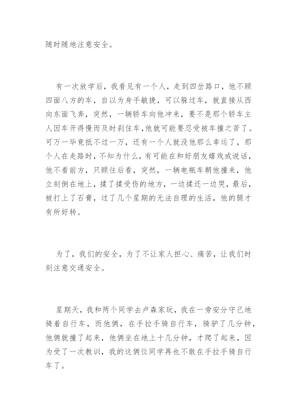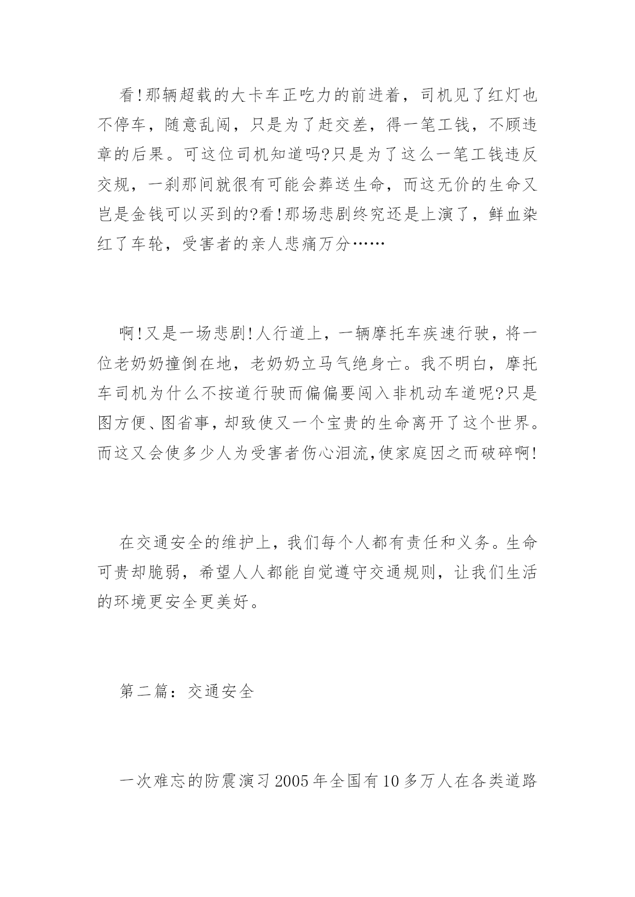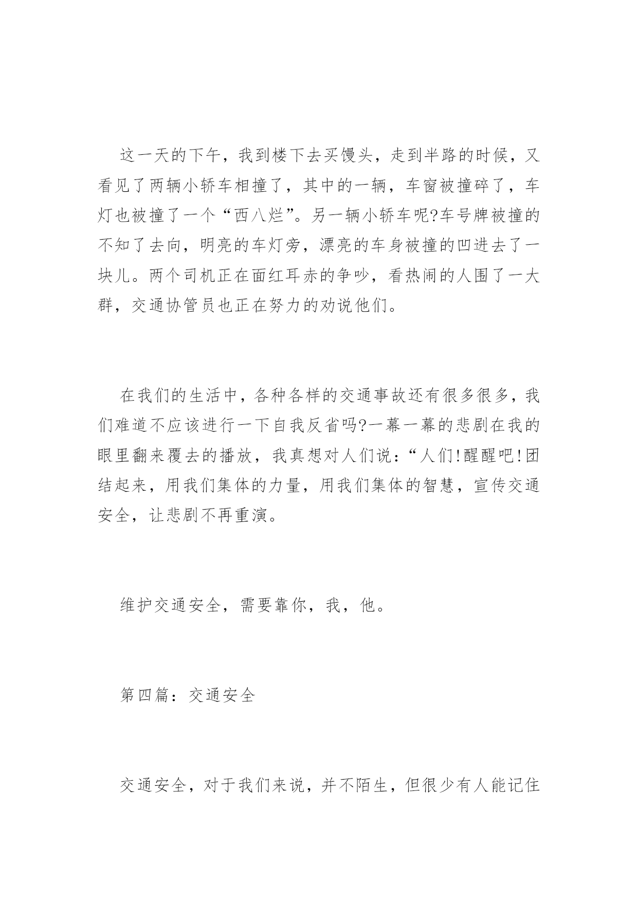交通安全初一优秀作文每天大约有100人死于交通安全,安全对我们来讲固然重要。而因为每天死神都会降临,一个个幸福美满的家庭而因此变得支离破碎。小编收集了交通安全作文,欢迎阅读。第一篇:交通安全宽阔的马路,先进的道路安全设施,一直在更新的交通法规,难道真能对交通安全起到持久稳固的作用吗?如果是,那为何交通事故还是年年不断的频繁发生?可见交通安全保障并没有达到真正的效果。而这究竟又是谁的错呢?这是人们的错。国家给了我们交通安全的保障,得失我们往往却只顾自己的方便,只顾自己的利益,并未能好好的遵守交通法规。大家想过如此的后果会是怎样的吗?看!那辆超载的大卡车正吃力的前进着,司机见了红灯也不停车,随意乱闯,只是为了赶交差,得一笔工钱,不顾违章的后果。可这位司机知道吗?只是为了这么一笔工钱违反交规,一刹那间就很有可能会葬送生命,而这无价的生命又岂是金钱可以买到的?看!那场悲剧终究还是上演了,鲜血染红了车轮,受害者的亲人悲痛万分……啊!又是一场悲剧!人行道上,一辆摩托车疾速行驶,将一位老奶奶撞倒在地,老奶奶立马气绝身亡。我不明白,摩托车司机为什么不按道行驶而偏偏要闯入非机动车道呢?只是图方便、图省事,却致使又一个宝贵的生命离开了这个世界。而这又会使多少人为受害者伤心泪流,使家庭因之而破碎啊!在交通安全的维护上,我们每个人都有责任和义务。生命可贵却脆弱,希望人人都能自觉遵守交通规则,让我们生活的环境更安全更美好。第二篇:交通安全一次难忘的防震演习2005年全国有10多万人在各类道路交通事故中死亡,其中有7000多名儿童被道路交通事故夺去了生命,有近30000名儿童在道路交通事故中受伤。在每年非正常死亡的学生中,因交通事故死亡的占近一半;原来一个幸福美满的家庭,因为父亲酒后驾驶发生车祸结果家破人亡;一个正当花季年华的学生在上学路上因为贪图方便,横穿公路,结果惨死街头……面对着这一个个血淋淋的数字;一幕幕触目惊心的景象;一条条活生生的生命,顷刻间走上不归路,同学们惊呆了,有人落泪,有人叹息,更多的是从心灵里得到了教育??交通安全要记一生。这是学校开展交通安全教育系列活动,观看交通安全教育片的一幕。是啊,人生在世,平安是福。这是每一个人心中的祈望。但因漠视交通法规酿成人间悲剧的事,却一次次刺痛我们善良的心。在三月份,学校开展了一系列宣传交通安全的活动,交通安全的标语,内容丰富的交通安全宣传栏,琅琅上口的交通安全四字歌,都使每一个同学意识到遵守交通法规是那样重要。一连几天的交通安全教育片放映更是把活动推向了高潮。家破人亡,白发人送黑发人,这些往往都是由于人们不遵守交通法规,麻痹大意造成的。一失足会成千古恨,同学们这一个个惨痛的教训难道还不能让我们铭记交通安全的重要性吗?听老师说我们中山是全国交通管理信息化的先进城市,我们中山的交通设施在全国也是走在前列的。这一切都为我们出行的交通安全提供了可靠的保证,我庆幸自己是一个中山人!但是我认为这还远远不够,要保证每一个人的交通安全,更重要的是让交通安全的意识活在每一个人的心里,人人都能自觉遵守交通法规。同学们,让我们从现在起就成为遵守交通法规的一份子吧。高高兴兴上学来,平平安安回家去。让我们与交通安全共成长!第三篇:交通安全在现代生活中,人们的消费能力越来越强了,买汽车的人自然也就多了。随之而来的,是一场接一场的交通事故。一天的上午,我和爸爸妈妈各骑着一辆自行车,出去玩儿,忽然,传来了汽车急刹车的声音,接着,就是“砰”的一声,我寻着声响望去,只见,在川流不息的车流中,停着一辆小轿车,小轿车后面的马路上,有几道明显的黑色刹车的痕迹,小轿车的前边,是一辆被撞倒了的自行车,自行车的旁边,一位中年人,从他的面部表情上不难看出,他很痛苦,在痛苦的同时,他在低声的呻吟。这一天的下午,我到楼下去买馒头,走到半路的时候,又看见了两辆小轿车相撞了,其中的一辆,车窗被撞碎了,车灯也被撞了一个“西八烂”。另一辆小轿车呢?车号牌被撞的不知了去向,明亮的车灯旁,漂亮的车身被撞的凹进去了一块儿。两个司机正在面红耳赤的争吵,看热闹的人围了一大群,交通协管员也正在努力的劝说他们。在我们的生活中,各种各样的交通事故还有很多很多,我们难道不应该进行一下自我反省吗?一幕一幕的悲剧在我的眼里翻来覆去的播放,我真想对人们说:“人们!醒醒吧!团结起来,用我们集体的力量,用我们集体的智慧,宣传交通安全,让悲剧不再重演。维护交通安全,需要靠你,我,他。第四篇:交通安全交通安全,对于我们来说,并不陌生,但很少有人能记住随时随地注意安全。有一次放学后,我看见有一个人,走到四岔路口,他不顾四面八方的车,自以为身手敏捷,可以躲过车,就直接从西向东面飞奔,突然,一辆轿车向他冲来,要不是那个轿车主人因车开得慢而及时刹住车,