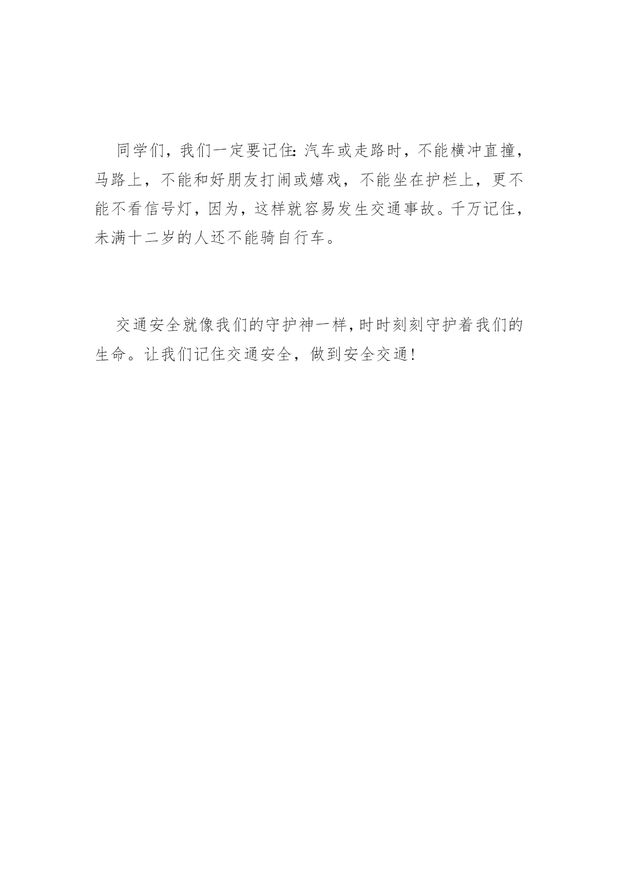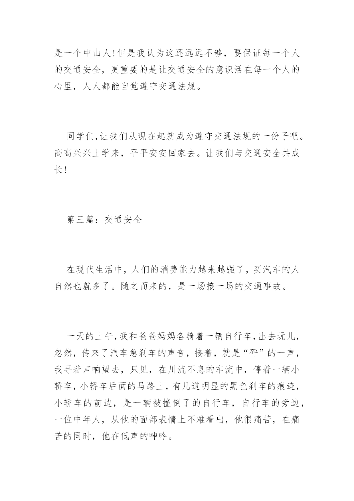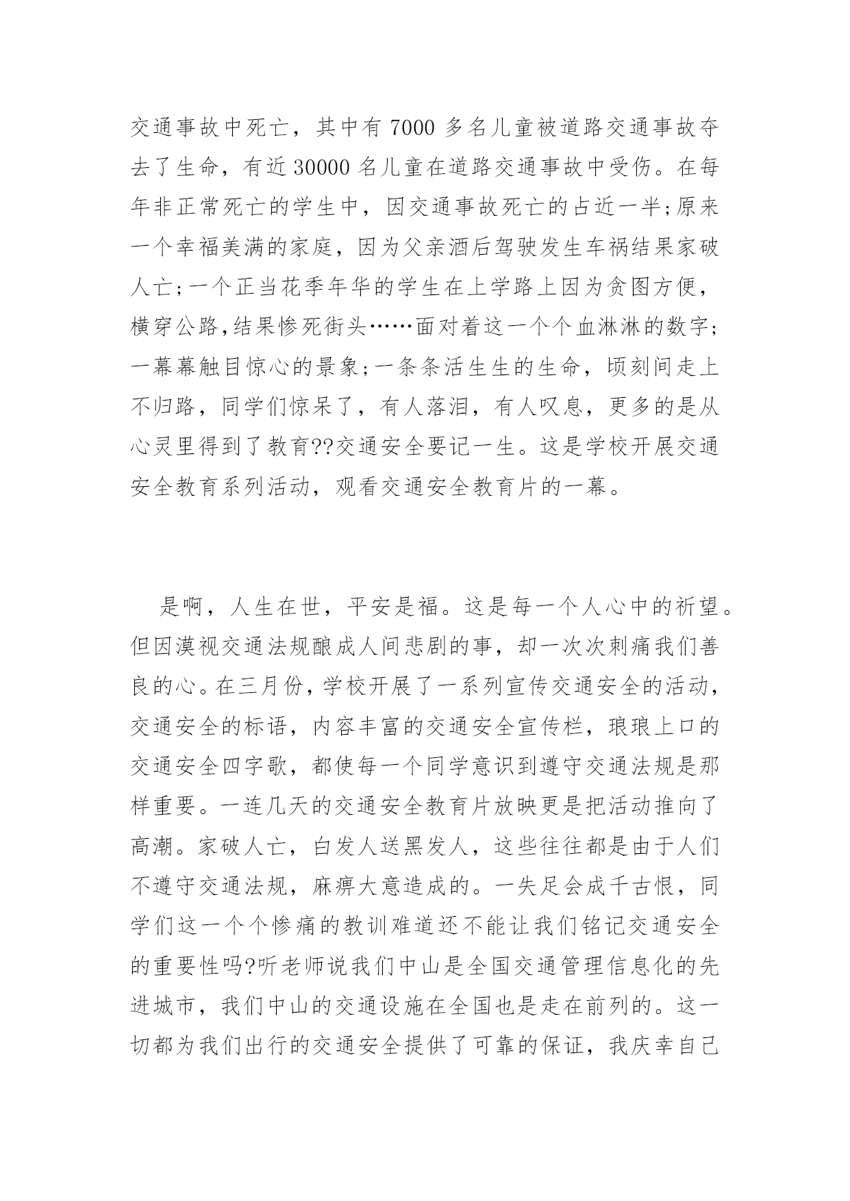 交通安全初一优秀作文每天大约有100人死于交通安全,安全对我们来讲固然重要。而因为每天死神都会降临,一个个幸福美满的家庭而因此变得支离破碎。小编收集了交通安全作文,欢迎阅读。第一篇:交通安全宽阔的马路,先进的道路安全设施,一直在更新的交通法规,难道真能对交通安全起到持久稳固的作用吗?如果是,那为何交通事故还是年年不断的频繁发生?可见交通安全保障并没有达到真正的效果。而这究竟又是谁的错呢?这是人们的错。国家给了我们交通安全的保障,得失我们往往却只顾自己的方便,只顾自己的利益,并未能好好的遵守交通法规。大家想过如此的后果会是怎样的吗?看!那辆超载的大卡车正吃力的前进着,司机见了红灯也不停车,随意乱闯,只是为了赶交差,得一笔工钱,不顾违章的后果。可这位司机知道吗?只是为了这么一笔工钱违反交规,一刹那间就很有可能会葬送生命,而这无价的生命又岂是金钱可以买到的?看!那场悲剧终究还是上演了,鲜血染红了车轮,受害者的亲人悲痛万分……啊!又是一场悲剧!人行道上,一辆摩托车疾速行驶,将一位老奶奶撞倒在地,老奶奶立马气绝身亡。我不明白,摩托车司机为什么不按道行驶而偏偏要闯入非机动车道呢?只是图方便、图省事,却致使又一个宝贵的生命离开了这个世界。而这又会使多少人为受害者伤心泪流,使家庭因之而破碎啊!在交通安全的维护上,我们每个人都有责任和义务。生命可贵却脆弱,希望人人都能自觉遵守交通规则,让我们生活的环境更安全更美好。第二篇:交通安全一次难忘的防震演习2005年全国有10多万人在各类道路交通事故中死亡,其中有7000多名儿童被道路交通事故夺去了生命,有近30000名儿童在道路交通事故中受伤。在每年非正常死亡的学生中,因交通事故死亡的占近一半;原来一个幸福美满的家庭,因为父亲酒后驾驶发生车祸结果家破人亡;一个正当花季年华的学生在上学路上因为贪图方便,横穿公路,结果惨死街头……面对着这一个个血淋淋的数字;一幕幕触目惊心的景象;一条条活生生的生命,顷刻间走上不归路,同学们惊呆了,有人落泪,有人叹息,更多的是从心灵里得到了教育??交通安全要记一生。这是学校开展交通安全教育系列活动,观看交通安全教育片的一幕。是啊,人生在世,平安是福。这是每一个人心中的祈望。但因漠视交通法规酿成人间悲剧的事,却一次次刺痛我们善良的心。在三月份,学校开展了一系列宣传交通安全的活动,交通安全的标语,内容丰富的交通安全宣传栏,琅琅上口的交通安全四字歌,都使每一个同学意识到遵守交通法规是那样重要。一连几天的交通安全教育片放映更是把活动推向了高潮。家破人亡,白发人送黑发人,这些往往都是由于人们不遵守交通法规,麻痹大意造成的。一失足会成千古恨,同学们这一个个惨痛的教训难道还不能让我们铭记交通安全的重要性吗?听老师说我们中山是全国交通管理信息化的先进城市,我们中山的交通设施在全国也是走在前列的。这一切都为我们出行的交通安全提供了可靠的保证,我庆幸自己是一个中山人!但是我认为这还远远不够,要保证每一个人的交通安全,更重要的是让交通安全的意识活在每一个人的心里,人人都能自觉遵守交通法规。同学们,让我们从现在起就成为遵守交通法规的一份子吧。高高兴兴上学来,平平安安回家去。让我们与交通安全共成长!第三篇:交通安全在现代生活中,人们的消费能力越来越强了,买汽车的人自然也就多了。随之而来的,是一场接一场的交通事故。一天的上午,我和爸爸妈妈各骑着一辆自行车,出去玩儿,忽然,传来了汽车急刹车的声音,接着,就是“砰”的一声,我寻着声响望去,只见,在川流不息的车流中,停着一辆小轿车,小轿车后面的马路上,有几道明显的黑色刹车的痕迹,小轿车的前边,是一辆被撞倒了的自行车,自行车的旁边,一位中年人,从他的面部表情上不难看出,他很痛苦,在痛苦的同时,他在低声的呻吟。这一天的下午,我到楼下去买馒头,走到半路的时候,又看见了两辆小轿车相撞了,其中的一辆,车窗被撞碎了,车灯也被撞了一个“西八烂”。另一辆小轿车呢?车号牌被撞的不知了去向,明亮的车灯旁,漂亮的车身被撞的凹进去了一块儿。两个司机正在面红耳赤的争吵,看热闹的人围了一大群,交通协管员也正在努力的劝说他们。在我们的生活中,各种各样的交通事故还有很多很多,我们难道不应该进行一下自我反省吗?一幕一幕的悲剧在我的眼里翻来覆去的播放,我真想对人们说:“人们!醒醒吧!团结起来,用我们集体的力量,用我们集体的智慧,宣传交通安全,让悲剧不再重演。维护交通安全,需要靠你,我,他。第四篇:交通安全交通安全,对于我们来说,并不陌生,但很少有人能记住随时随地注意安全。有一次放学后,我看见有一个人,走到四岔路口,他不顾四面八方的车,自以为身手敏捷,可以躲过车,就直接从西向东面飞奔,突然,一辆轿车向他冲来,要不是那个轿车主人因车开得慢而及时刹住车,