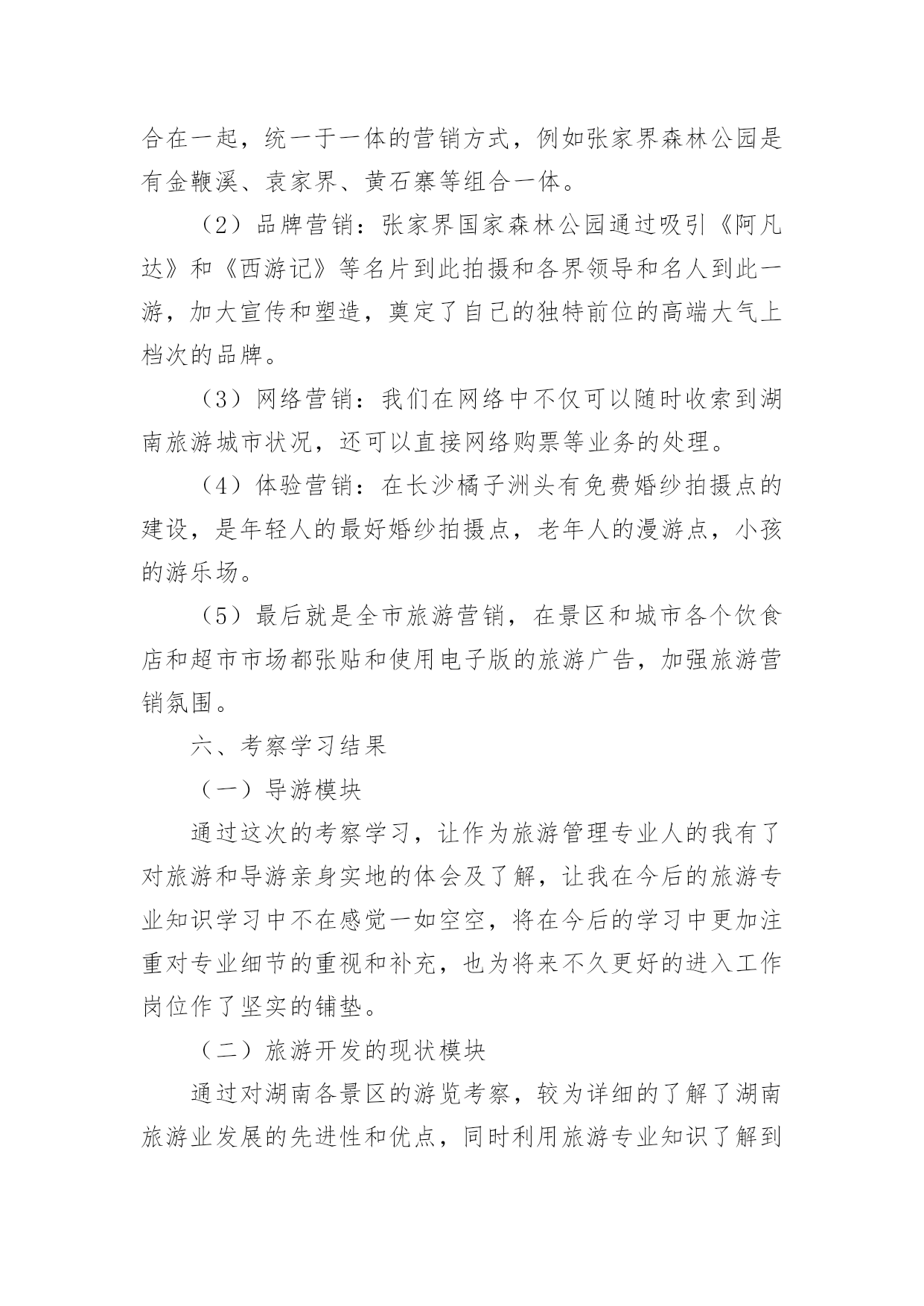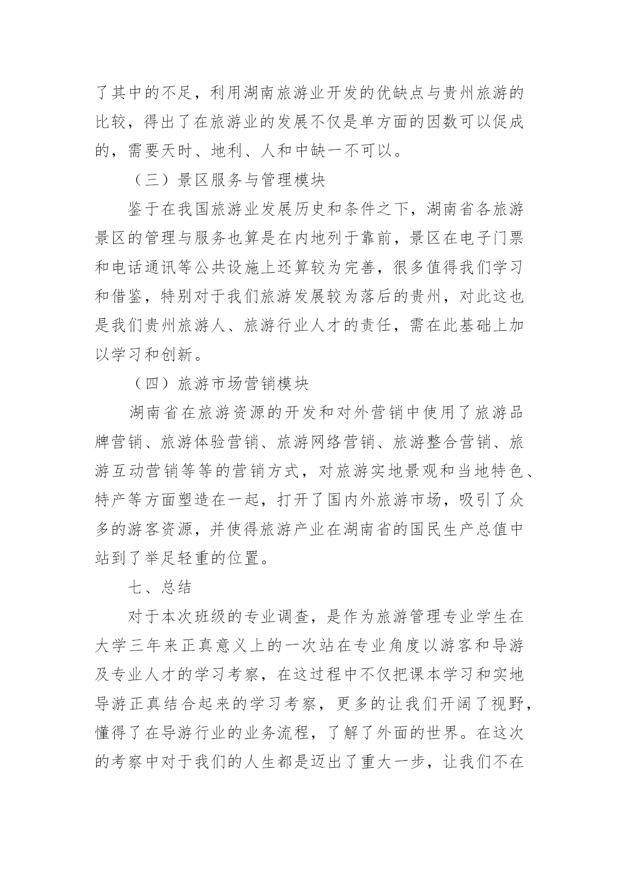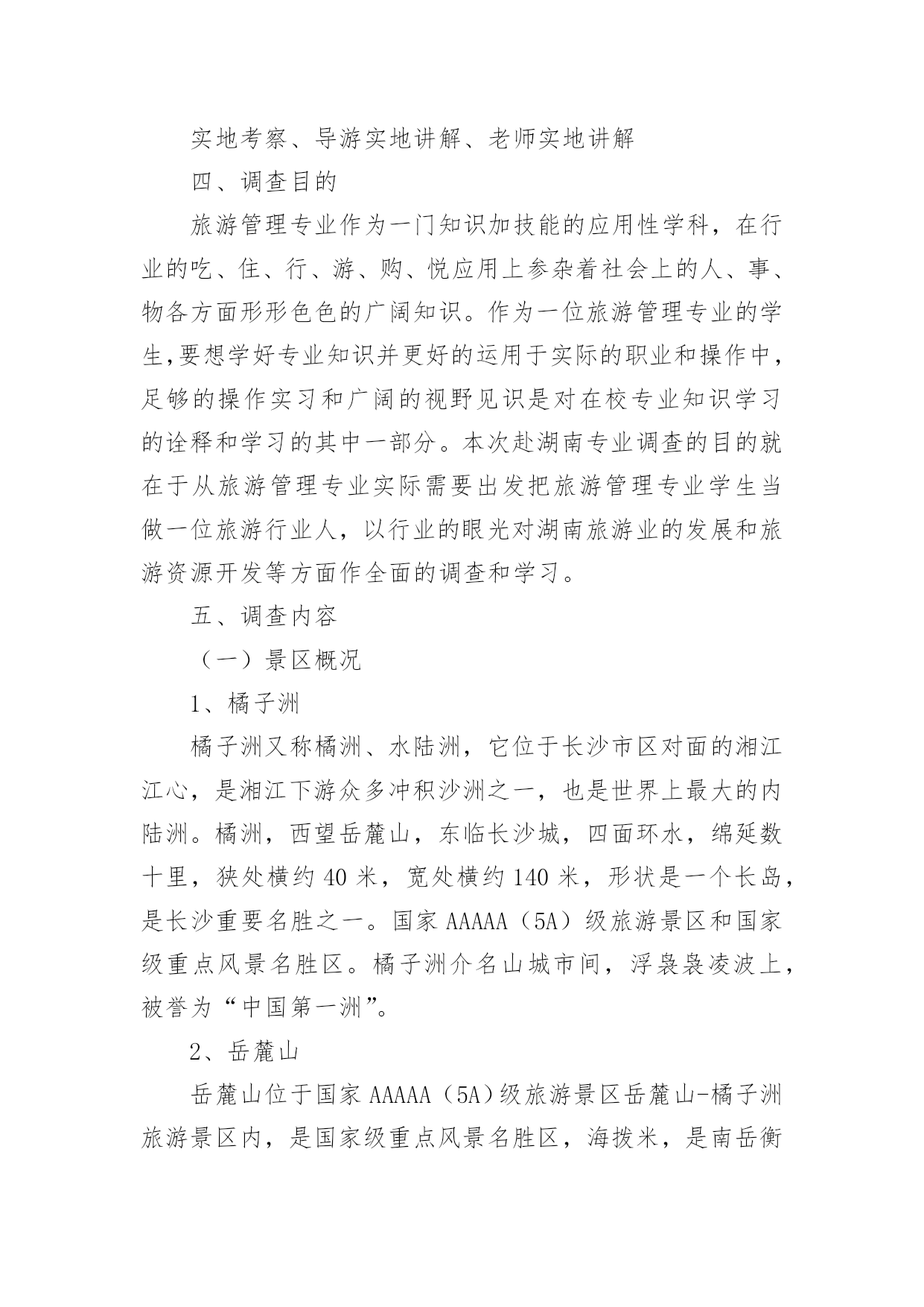 旅游景区调研报告旅游景区调研报告范文在不断进步的时代,报告有着举足轻重的地位,报告中提到的所有信息应该是准确无误的。一听到写报告就拖延症懒癌齐复发?下面是小编整理的旅游景区调研报告范文,希望对大家有所帮助。旅游景区调研报告范文1一、调查背景作为一名旅游管理专业的学生,对于旅游资源的考察和好的旅游景区的经营模式还有导游等一些列相关的了解作实地学习和考察是在大学学习期间的必修课程。而黔南师院坐落于贵州省都匀市这样的一座落后的县级旅游城市,都匀在旅游基础设施和各方面的建设都尤为落后,根本不足也满足我院旅游管理专业的学习要求。而对于我学院最临近的省份湖南的旅游资源和旅游资源开发及经营状况都在全国名列前茅,加之考虑到完全自费的专业调查,在节约经济和为更大限度的满足专业学习的要求之下,赴湖南旅游管理专业调查势在必行。二、调查地点湖南长沙、湖南张家界三、调查方式实地考察、导游实地讲解、老师实地讲解四、调查目的旅游管理专业作为一门知识加技能的应用性学科,在行业的吃、住、行、游、购、悦应用上参杂着社会上的人、事、物各方面形形色色的广阔知识。作为一位旅游管理专业的学生,要想学好专业知识并更好的运用于实际的职业和操作中,足够的操作实习和广阔的视野见识是对在校专业知识学习的诠释和学习的其中一部分。本次赴湖南专业调查的目的就在于从旅游管理专业实际需要出发把旅游管理专业学生当做一位旅游行业人,以行业的眼光对湖南旅游业的发展和旅游资源开发等方面作全面的调查和学习。五、调查内容(一)景区概况1、橘子洲橘子洲又称橘洲、水陆洲,它位于长沙市区对面的湘江江心,是湘江下游众多冲积沙洲之一,也是世界上最大的内陆洲。橘洲,西望岳麓山,东临长沙城,四面环水,绵延数十里,狭处横约40米,宽处横约140米,形状是一个长岛,是长沙重要名胜之一。国家AAAAA(5A)级旅游景区和国家级重点风景名胜区。橘子洲介名山城市间,浮袅袅凌波上,被誉为“中国第一洲”。2、岳麓山岳麓山位于国家AAAAA(5A)级旅游景区岳麓山-橘子洲旅游景区内,是国家级重点风景名胜区,海拨米,是南岳衡山72峰之一,是中国四大赏枫胜地之一。位于古城长沙湘江西岸,由丘陵低山、江、河、湖泊、自然动植物以及文化古迹、近代名人墓葬、革命纪念遗址等组成,为城市山岳型风景名胜区。已开放的景区有麓山景区、橘子洲景区。其中麓山景区系核心景区,景区内有岳麓书院、爱晚亭、麓山寺、云麓宫、新民学会旧址景点等。3、湖南第一师范第一师范前身,是南宋著名理学家张拭创办的城南书院,有近千年的历史文化渊源。1903年改为湖南师范馆,数易其名,师范教育史也有90多年了。该校校舍十分壮观,始建于1912年,但被1938年的“文夕大火”毁灭。其后历经劫难,直到1954年才迁回,1968年经_、_特准,按原貌复建。徐特立同时题写“实事求是,不自以为是”,以作校风。郭沫若、_也曾先后为纪念馆题写匾牌。湖南省第一师范学校于1972年被列为省级重点文物保护单位,1978年被定为国家首批重点师范学校,1995年起又作为省市爱国主义教育基地向社会开放。4、张家界简介:张家界市位于湖南省西北部,地处云贵高原隆起与洞庭湖沉降区结合部,介于东经109度40分至111度20分、北纬28度52分至29度48分之间,东接石门、桃源县,南邻沅陵县,北抵湖北省的鹤峰、宣恩县。市界东西最长167公里,南北最宽96公里。全市总面积9653平方公里,占全省面积的。张家界市的地层复杂多样,造化了当地的特色景观。5、黄龙洞黄龙洞(索溪)从水绕四门以下,至黄龙洞一段溪水,就是著名的索溪。据县志记载,因官军讨伐向王天子起义而得名索,古称索水。索溪汇集武陵源八百条溪涧之水,然后注入娄水,并入澧水。当代一位叫苏叶的女作家,为索溪之美所激动,竟然表示“来生甘作石,嫁与索溪水”,下辈子要作索溪的妻子。黄龙洞现已探明的洞底面积约10万平方米,全长7640米,垂直高度140米,内分两层旱洞两层水洞,有1库、2河、3潭、4瀑、13个厅、98廊以及上千个白玉池,上万座钟乳石峰。整个大洞犹如一株古木,错节盘根,散发开来,洞中有洞,天外有天,山重水复,峰回路转,由天生灰质溶液凝聚而成的洞穴景观琳琅满目、美不胜收、无所不奇、无所不有6、袁家界袁家界位于张家界国家森林公园北面砂刀沟北麓,是一方山台地。背依岩峰山峦,面临幽谷群峰,自东向西延伸。主要景点有后花园、迷魂台、天下第一桥等。7、天子山景区天子山原名青岩山,因古代土家族领袖向大坤率领当地农民起义自称“天子”而得名,武陵源的四大景区之一。它东起天子阁,西至将军岩,南接张家界国家森林公园,绵延盘绕近四十公里,总面积近百平方公里,至高点天子峰海拔米,最低海拔534米。因宋代土家族领袖向大坤在此率众起义,自称“天王”,后来殉难于此,故名天子山,更有“峰林之王”的