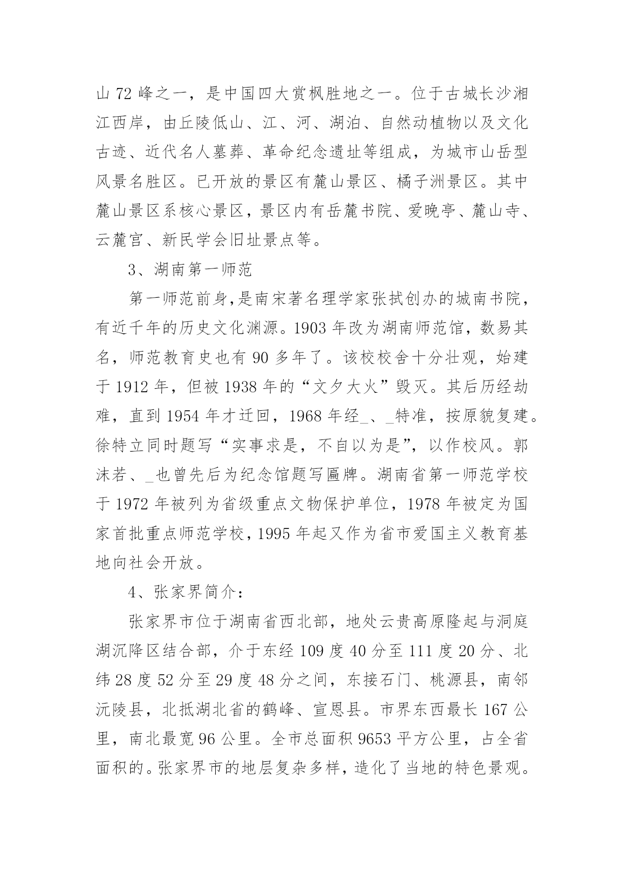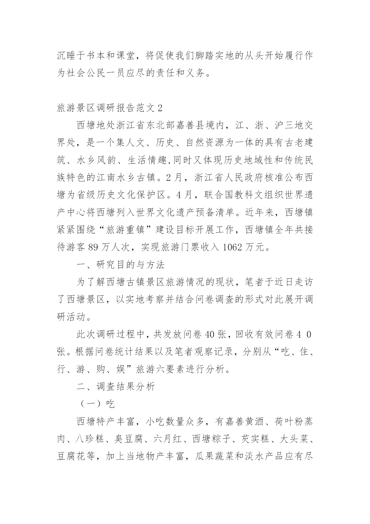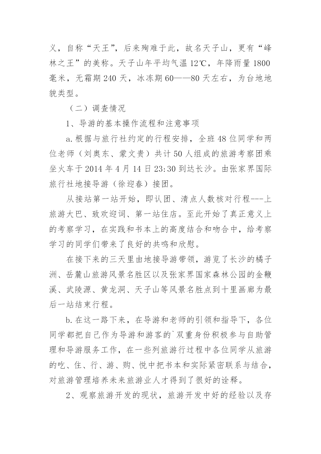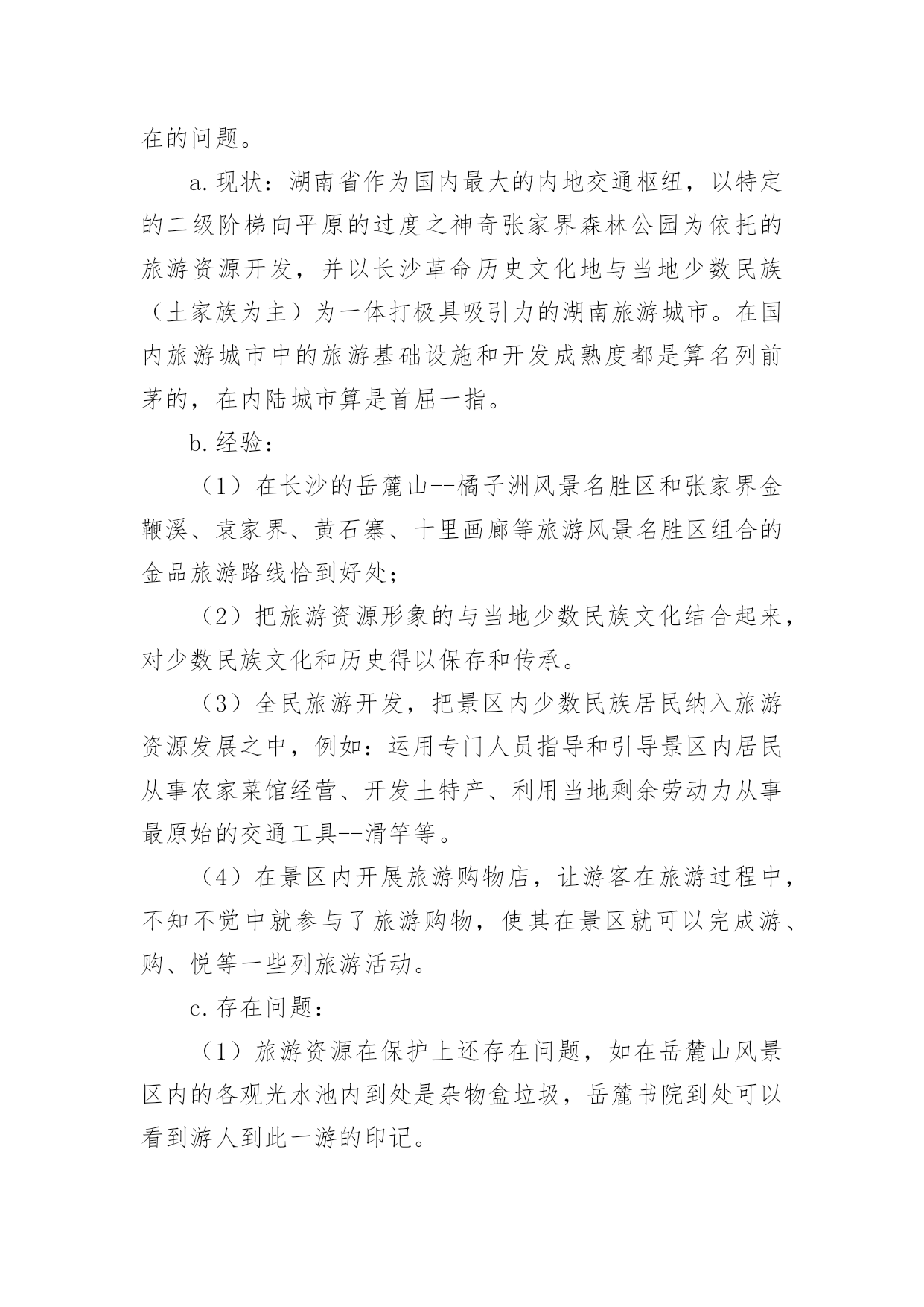 旅游景区调研报告旅游景区调研报告范文在不断进步的时代,报告有着举足轻重的地位,报告中提到的所有信息应该是准确无误的。一听到写报告就拖延症懒癌齐复发?下面是小编整理的旅游景区调研报告范文,希望对大家有所帮助。旅游景区调研报告范文1一、调查背景作为一名旅游管理专业的学生,对于旅游资源的考察和好的旅游景区的经营模式还有导游等一些列相关的了解作实地学习和考察是在大学学习期间的必修课程。而黔南师院坐落于贵州省都匀市这样的一座落后的县级旅游城市,都匀在旅游基础设施和各方面的建设都尤为落后,根本不足也满足我院旅游管理专业的学习要求。而对于我学院最临近的省份湖南的旅游资源和旅游资源开发及经营状况都在全国名列前茅,加之考虑到完全自费的专业调查,在节约经济和为更大限度的满足专业学习的要求之下,赴湖南旅游管理专业调查势在必行。二、调查地点湖南长沙、湖南张家界三、调查方式实地考察、导游实地讲解、老师实地讲解四、调查目的旅游管理专业作为一门知识加技能的应用性学科,在行业的吃、住、行、游、购、悦应用上参杂着社会上的人、事、物各方面形形色色的广阔知识。作为一位旅游管理专业的学生,要想学好专业知识并更好的运用于实际的职业和操作中,足够的操作实习和广阔的视野见识是对在校专业知识学习的诠释和学习的其中一部分。本次赴湖南专业调查的目的就在于从旅游管理专业实际需要出发把旅游管理专业学生当做一位旅游行业人,以行业的眼光对湖南旅游业的发展和旅游资源开发等方面作全面的调查和学习。五、调查内容(一)景区概况1、橘子洲橘子洲又称橘洲、水陆洲,它位于长沙市区对面的湘江江心,是湘江下游众多冲积沙洲之一,也是世界上最大的内陆洲。橘洲,西望岳麓山,东临长沙城,四面环水,绵延数十里,狭处横约40米,宽处横约140米,形状是一个长岛,是长沙重要名胜之一。国家AAAAA(5A)级旅游景区和国家级重点风景名胜区。橘子洲介名山城市间,浮袅袅凌波上,被誉为“中国第一洲”。2、岳麓山岳麓山位于国家AAAAA(5A)级旅游景区岳麓山-橘子洲旅游景区内,是国家级重点风景名胜区,海拨米,是南岳衡山72峰之一,是中国四大赏枫胜地之一。位于古城长沙湘江西岸,由丘陵低山、江、河、湖泊、自然动植物以及文化古迹、近代名人墓葬、革命纪念遗址等组成,为城市山岳型风景名胜区。已开放的景区有麓山景区、橘子洲景区。其中麓山景区系核心景区,景区内有岳麓书院、爱晚亭、麓山寺、云麓宫、新民学会旧址景点等。3、湖南第一师范第一师范前身,是南宋著名理学家张拭创办的城南书院,有近千年的历史文化渊源。1903年改为湖南师范馆,数易其名,师范教育史也有90多年了。该校校舍十分壮观,始建于1912年,但被1938年的“文夕大火”毁灭。其后历经劫难,直到1954年才迁回,1968年经_、_特准,按原貌复建。徐特立同时题写“实事求是,不自以为是”,以作校风。郭沫若、_也曾先后为纪念馆题写匾牌。湖南省第一师范学校于1972年被列为省级重点文物保护单位,1978年被定为国家首批重点师范学校,1995年起又作为省市爱国主义教育基地向社会开放。4、张家界简介:张家界市位于湖南省西北部,地处云贵高原隆起与洞庭湖沉降区结合部,介于东经109度40分至111度20分、北纬28度52分至29度48分之间,东接石门、桃源县,南邻沅陵县,北抵湖北省的鹤峰、宣恩县。市界东西最长167公里,南北最宽96公里。全市总面积9653平方公里,占全省面积的。张家界市的地层复杂多样,造化了当地的特色景观。5、黄龙洞黄龙洞(索溪)从水绕四门以下,至黄龙洞一段溪水,就是著名的索溪。据县志记载,因官军讨伐向王天子起义而得名索,古称索水。索溪汇集武陵源八百条溪涧之水,然后注入娄水,并入澧水。当代一位叫苏叶的女作家,为索溪之美所激动,竟然表示“来生甘作石,嫁与索溪水”,下辈子要作索溪的妻子。黄龙洞现已探明的洞底面积约10万平方米,全长7640米,垂直高度140米,内分两层旱洞两层水洞,有1库、2河、3潭、4瀑、13个厅、98廊以及上千个白玉池,上万座钟乳石峰。整个大洞犹如一株古木,错节盘根,散发开来,洞中有洞,天外有天,山重水复,峰回路转,由天生灰质溶液凝聚而成的洞穴景观琳琅满目、美不胜收、无所不奇、无所不有6、袁家界袁家界位于张家界国家森林公园北面砂刀沟北麓,是一方山台地。背依岩峰山峦,面临幽谷群峰,自东向西延伸。主要景点有后花园、迷魂台、天下第一桥等。7、天子山景区天子山原名青岩山,因古代土家族领袖向大坤率领当地农民起义自称“天子”而得名,武陵源的四大景区之一。它东起天子阁,西至将军岩,南接张家界国家森林公园,绵延盘绕近四十公里,总面积近百平方公里,至高点天子峰海拔米,最低海拔534米。因宋代土家族领袖向大坤在此率众起义,自称“天王”,后来殉难于此,故名天子山,更有“峰林之王”的