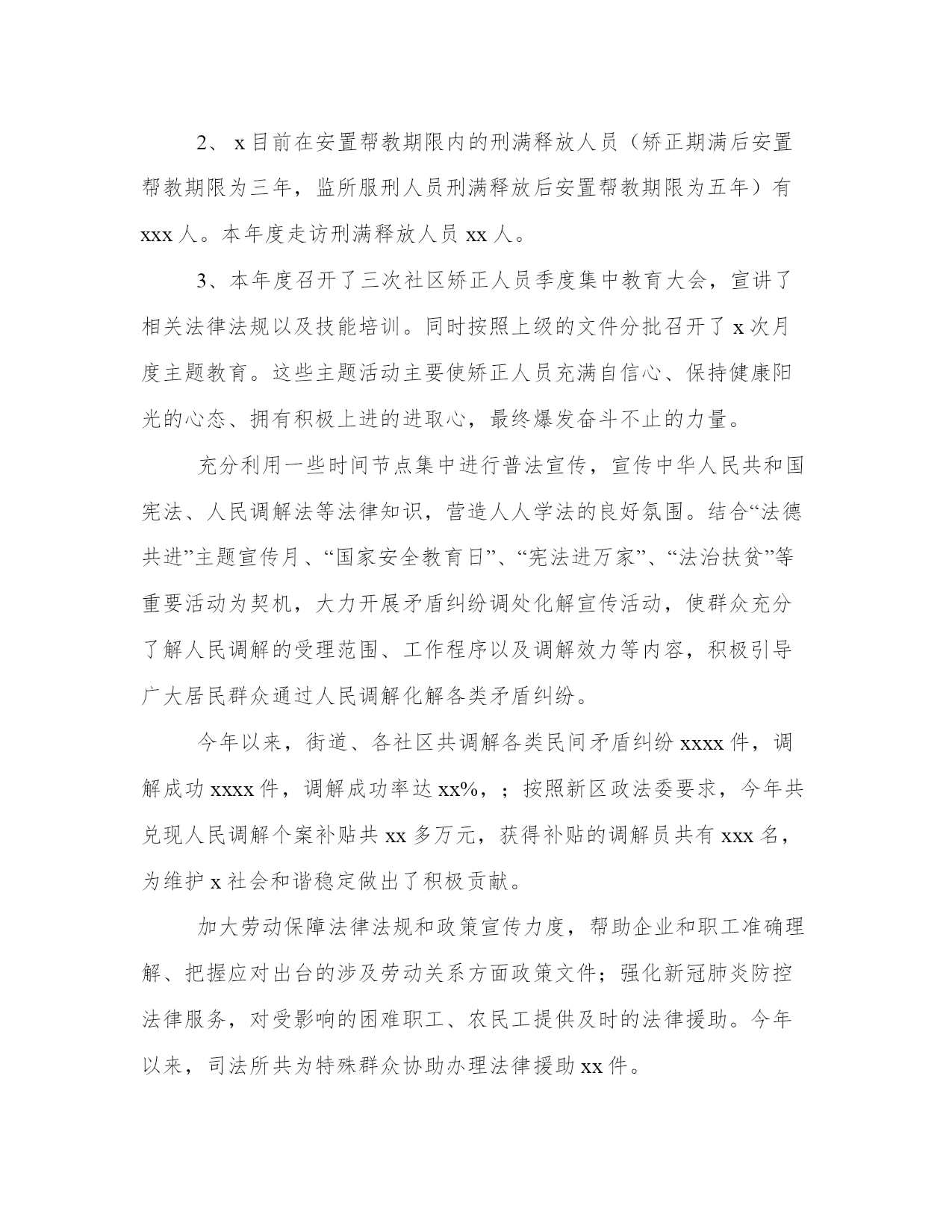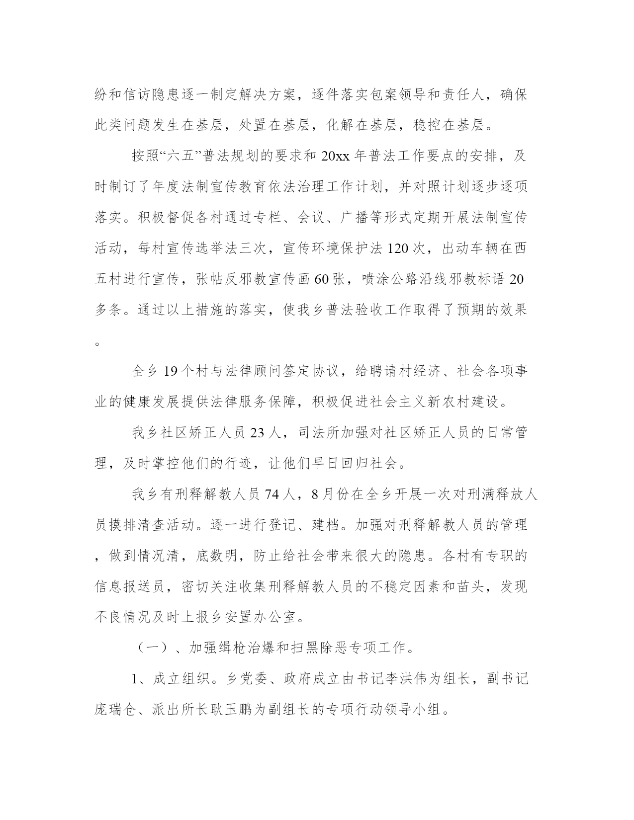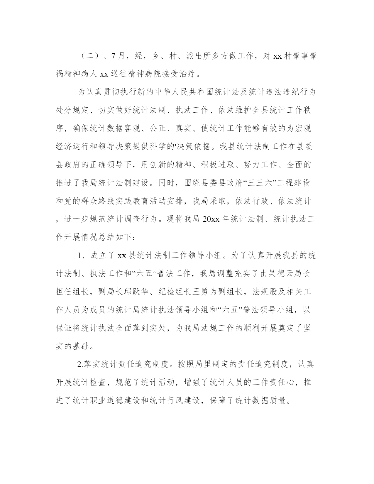 司法所工作总结(精选13篇)写总结最重要的一点就是要把每一个要点写清楚,写明白,实事求是。优秀的总结都具备一些什么特点呢?又该怎么写呢?下面是小编整理的个人今后的总结范文,欢迎阅读分享,希望对大家有所帮助。司法所工作总结篇一3、联系xx和西留村干部化解两村地界所属不明问题。20xx年,在县政法委、司法局、乡党委、政府的领导下,按照上级的各阶段工作部署,强化措施,全面落实,不断加强创新力度,不断拓展业务范围,现将工作开展情况汇报如下:狠抓业务资料的规范化建设,将司法行政、人民调解、矛盾排查、社区矫正、安置帮教、普法宣传、综合治理、日常工作各类文件、资料、台帐、记录、报表分门别类,整理归档。做到了存放齐全,管理有序,格式统一,登记规范,档案管理工作基本上达到了规范化、经常化的要求。按照矛盾排查工作“排查得早,发现得早,控制得住,解决得好”的工作要求,我乡司法所坚持每月25日召开一次驻村指导员民情分析会议,对各村各类矛盾纠纷进行摸底排查,对排查出的问题,明确包案领导,限时调处。今年以来,全乡共排查矛盾纠纷145起,乡成功调解12起,村级成功调解130起,调解成功率为98%。对各类矛盾纠纷和信访隐患逐一制定解决方案,逐件落实包案领导和责任人,确保此类问题发生在基层,处置在基层,化解在基层,稳控在基层。按照“六五”普法规划的要求和20xx年普法工作要点的安排,及时制订了年度法制宣传教育依法治理工作计划,并对照计划逐步逐项落实。积极督促各村通过专栏、会议、广播等形式定期开展法制宣传活动,每村宣传选举法三次,宣传环境保护法120次,出动车辆在西五村进行宣传,张帖反邪教宣传画60张,喷涂公路沿线邪教标语20多条。通过以上措施的落实,使我乡普法验收工作取得了预期的效果。全乡19个村与法律顾问签定协议,给聘请村经济、社会各项事业的健康发展提供法律服务保障,积极促进社会主义新农村建设。我乡社区矫正人员23人,司法所加强对社区矫正人员的日常管理,及时掌控他们的行迹,让他们早日回归社会。我乡有刑释解教人员74人,8月份在全乡开展一次对刑满释放人员摸排清查活动。逐一进行登记、建档。加强对刑释解教人员的管理,做到情况清,底数明,防止给社会带来很大的隐患。各村有专职的信息报送员,密切关注收集刑释解教人员的不稳定因素和苗头,发现不良情况及时上报乡安置办公室。(一)、加强缉枪治爆和扫黑除恶专项工作。1、成立组织。乡党委、政府成立由书记李洪伟为组长,副书记庞瑞仓、派出所长耿玉鹏为副组长的专项行动领导小组。2、强化宣传发动,营造浓厚氛围。(1)、7月2日召开各村书记、治保主任会议,并与村两委签定责任书。(2)、各重点路口、村庄共悬挂条幅32幅、标语20xx余条,发放宣传资料1500份,出动宣传车28车次进行宣传。(3)、利用集市组织专人进行宣传3次,使群众随时随地可以看到举报奖励内容,知道举报方式,做到家喻户晓、人人皆知。宣传营造声势贯穿行动始终。对举报线索查证属实的,严格落实一事一奖,一案一奖,按照3000-30000元的奖励幅度,及时兑现奖励,鼓舞群众,取信于民。3、深入细致清查,收缴枪爆物品。(1)、组织集中清查。今年7月10日在全乡开展一次地毯式集中排查行动,全面收缴流失民间的枪爆物品。目前共收缴枪7支,军用子弹16发。(2)、加大了政策和法律宣传,动员全乡群众主动上交私存私藏的枪爆物品,并积极提供案件线索。针对重点场所、部位,开展反复查、查反复的工作方法,确保不发生问题。(3)、今年8月,按照政法委的要求,在全乡19个村逐户签订承诺书,共计7050户,本人与家人愿意遵守承诺,承担一切法律责任和行政责任。承诺书一式三份,乡政府、派出所各持一份,另一份由承诺人持有。(二)、7月,经,乡、村、派出所多方做工作,对xx村肇事肇祸精神病人xx送往精神病院接受治疗。为认真贯彻执行新的中华人民共和国统计法及统计违法违纪行为处分规定、切实做好统计法制、执法工作、依法维护全县统计工作秩序,确保统计数据客观、公正、真实、使统计工作能够有效的为宏观经济运行和领导决策提供科学的'决策依据。我县统计法制工作在县委县政府的正确领导下,用创新的精神、积极进取、努力工作、全面的推进了我局统计法制建设。同时,围绕县委县政府“三三六”工程建设和党的群众路线实践教育活动安排,我局采取,依法行政、依法统计,进一步规范统计调查行为。现将我局20xx年统计法制、统计执法工作开展情况总结如下:1、成立了xx县统计法制工作领导小组。为了认真开展我县的统计法制、执法工作和“六五”普法工作,我局调整充实了由吴德云局长担任组长,副局长邱跃华、纪检组长王勇为副组长,法规股及相关工作人员为成员的统计局统计执法领导小组和“六五”普法领导小组,以保证将统计执法全面落到实