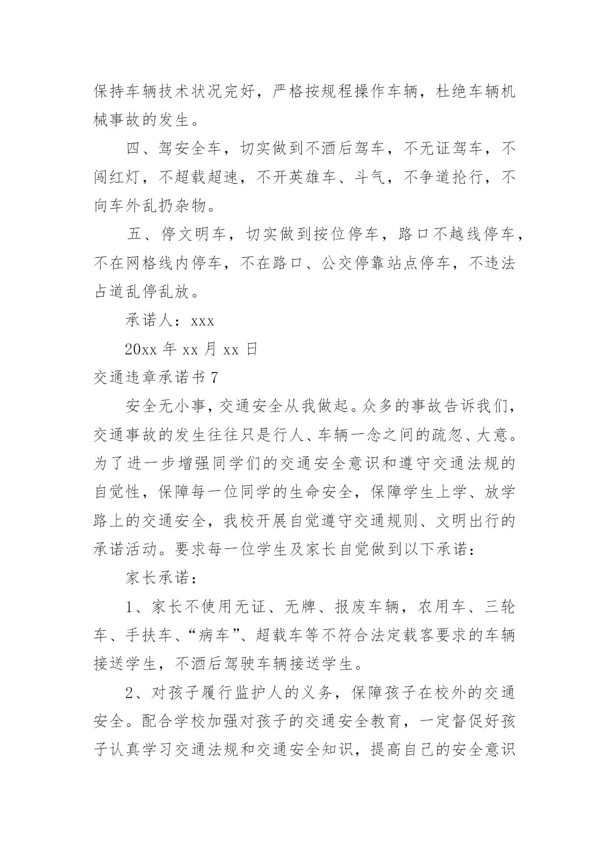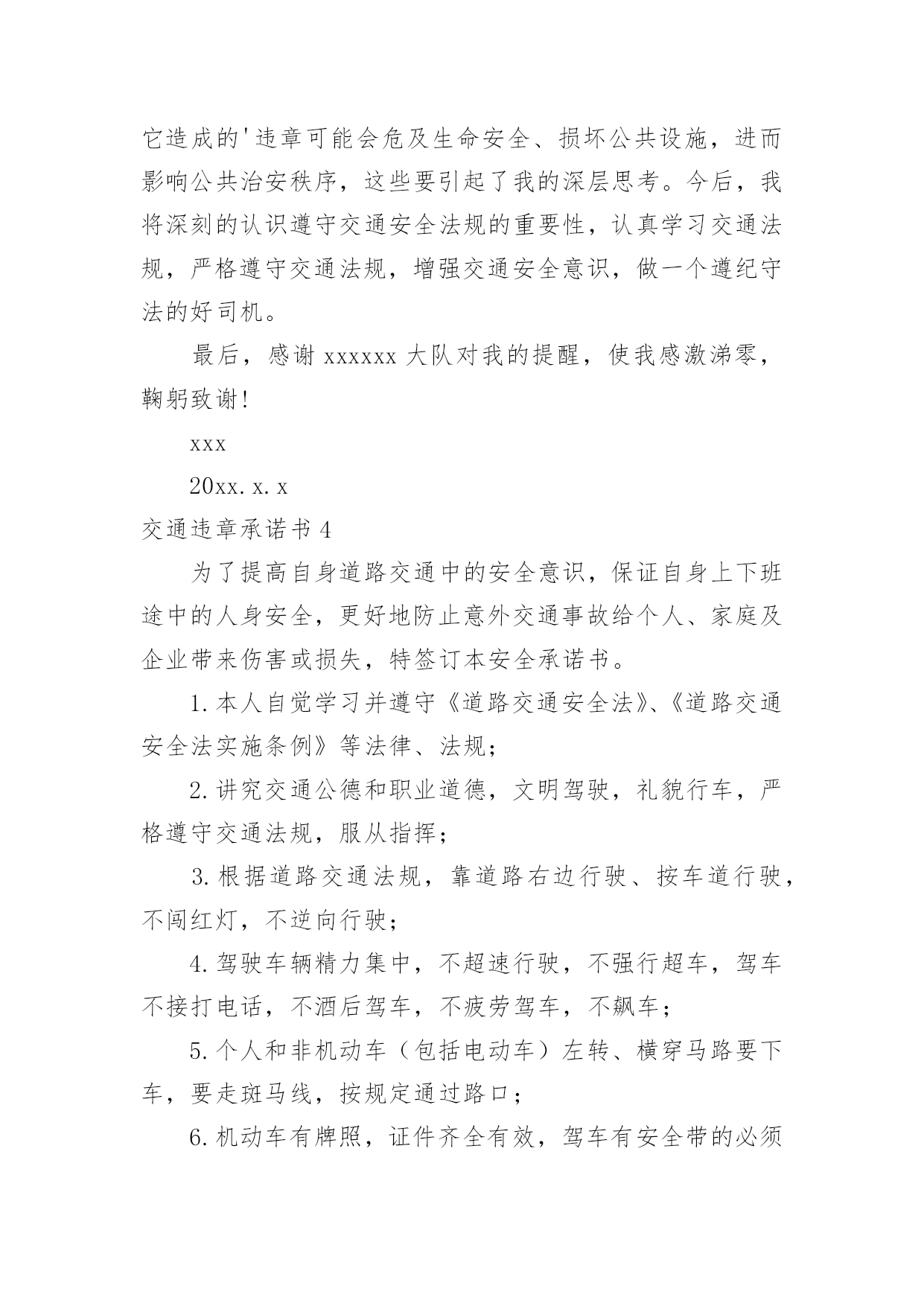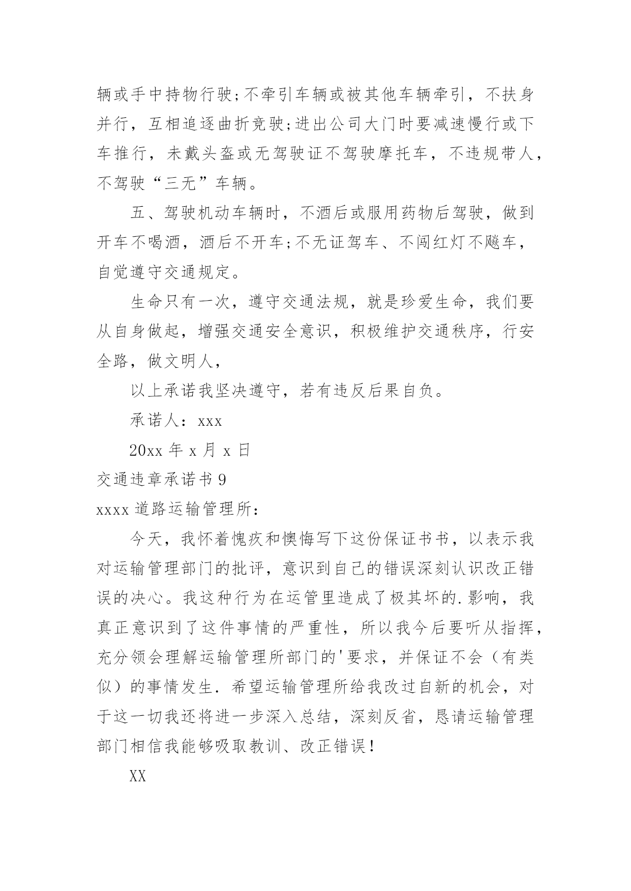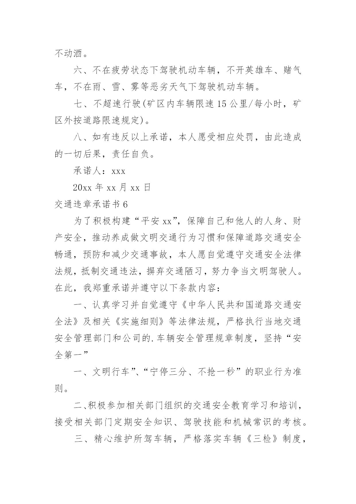 交通违章承诺书交通违章承诺书现如今,承诺书使用的情况越来越多,承诺书必须在要约的有效期作出。那么问题来了,到底应如何写一份恰当的承诺书呢?下面是小编为大家整理的交通违章承诺书,仅供参考,希望能够帮助到大家。交通违章承诺书1同学们的人身安全关系到每一个学生和家庭的幸福,惨痛的事实告诉我们,安全事故往往发生在一念之间。为了进一步提高我们同学的安全意识和遵守交通规则的.自觉性,确保学生的生命健康安全,特慎重承诺如下:1、不私自游泳,不到池塘、湖泊、河流边戏水、玩耍等。2、不骑有故障的车,不违章骑车,不违章过马路。不向过往车辆抛掷石块等。3、不骑摩托车,不扒车,不爬车,不吊车等。4、不乘坐三轮车,农用车,拖拉机等非营运车辆。5、不搭乘“三证”不全的车辆,不搭乘超载车辆,不搭乘车况不好的车,不搭乘有问题(酒后,疲劳等)的车辆。6、此承诺书一式两份,政教处和班级各执一份。自签字之日起生效。承诺人(签名):班级班主任(签名):20xx年xx月xx日交通违章承诺书2为养成良好文明交通行为,摒弃交通陋习,进一步提高交通安全意识,我向学校、家长、社会郑重承诺:1、认真学习交通安全知识,遵守交通法律法规,提高交通安全意识和自我防范事故的能力。2、在道路上行走时一定做到:遵守交通规则,在道路上行走,要走人行道;没有人行道的'.道路,要靠右边行走,做到“红灯停,绿灯行”及“一慢、二看、三通过”。3、不突然横穿马路,特别是马路对面有熟人、同学呼唤,或者自己要坐的车辆已到,千万不能贸然行事,以免发生意外。4、骑自行车时走非机动车道,没有非机动车道的靠路边右侧顺行;不脱手骑车、不骑车带人、不骑“病”车、不骑快车、不与机动车抢道、不平行骑车、不在恶劣天气骑车;骑自行车不在道路上互相追逐、扶身并行。5、骑自行车、电动车要严格遵守交通法律法规,未满12周岁不骑自行车,未满16周岁不骑电动车,坚决不无证驾驶摩托车。6、乘汽车要停稳后上下车,在车上要抓好扶手,头、手等身体部位不能伸出窗外。7、严格遵守交通法规,不乘坐超员、超速、拼装、无牌无证、拖拉机等有安全隐患的车辆,遇到各类危害学生交通安全违法行为要坚决抵制,并及时向学校、公安交管等部门举报。8、放学后不在学校逗留,不在路上、不到同学家逗留玩耍,不走亲串友,放学按时回家。双休、节假日不私自到校。不借故因事等理由到外村同学家。9、积极响应“小手拉大手”号召,提醒家人严格遵守交通法规,共创平安交通环境。以上承诺,我保证坚决做到,请老师、家长监督。承诺人:xxx时间:xxxx年xx月xx日交通违章承诺书3尊敬的xxxxxx交警大队:由于本人驾车行驶中违章调头等,违反了三次交通规则(车号:xxxx),给正常行驶的车辆及行人造成了不便,构成了严重的交通安全隐患。如若发生交通事故,后果将不堪设想,重则危及他人及自己的生命安全,轻则也会造成一定的经济损失。我扪心自问,我对道路交通安全法规是谙熟于心的,我也是有着几年驾龄的老司机了,深知每年交通事故伤亡人数列国家伤亡人数之首,当面对到自己时,却对交通法规没引起充分的重视。事已至此,请xxxxxx交x警大队的领导和交x警同志放心,我会以认真而严肃、虔诚而紧张的态度看待交通法规。违反交通法规可能引起的后果是非常严重的,它造成的'违章可能会危及生命安全、损坏公共设施,进而影响公共治安秩序,这些要引起了我的深层思考。今后,我将深刻的认识遵守交通安全法规的重要性,认真学习交通法规,严格遵守交通法规,增强交通安全意识,做一个遵纪守法的好司机。最后,感谢xxxxxx大队对我的提醒,使我感激涕零,鞠躬致谢!xxx20xx.x.x交通违章承诺书4为了提高自身道路交通中的安全意识,保证自身上下班途中的人身安全,更好地防止意外交通事故给个人、家庭及企业带来伤害或损失,特签订本安全承诺书。1.本人自觉学习并遵守《道路交通安全法》、《道路交通安全法实施条例》等法律、法规;2.讲究交通公德和职业道德,文明驾驶,礼貌行车,严格遵守交通法规,服从指挥;3.根据道路交通法规,靠道路右边行驶、按车道行驶,不闯红灯,不逆向行驶;4.驾驶车辆精力集中,不超速行驶,不强行超车,驾车不接打电话,不酒后驾车,不疲劳驾车,不飙车;5.个人和非机动车(包括电动车)左转、横穿马路要下车,要走斑马线,按规定通过路口;6.机动车有牌照,证件齐全有效,驾车有安全带的必须系安全带,骑摩托车必须戴头盔。无头盔、牌照、证件不全或不在有效期内的'机动车不上路和进入厂区;7.严格遵守单位交通安全管理规定,服从管理;8.雨雾雪天气谨慎缓行,出现特殊原因不能按时到岗,应及时与自己的直接领导或部门负责人的电话沟通,绝不赶时违规行驶。本人严格遵守以上内容做一个遵纪守法的好员工,时时刻刻把安全放在心中,体现在行动中,每天高高兴兴上班来、平平安安回家去!员