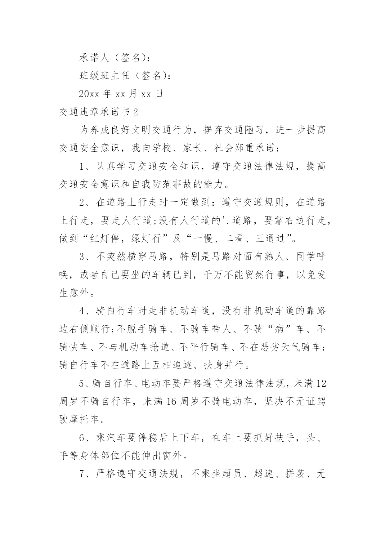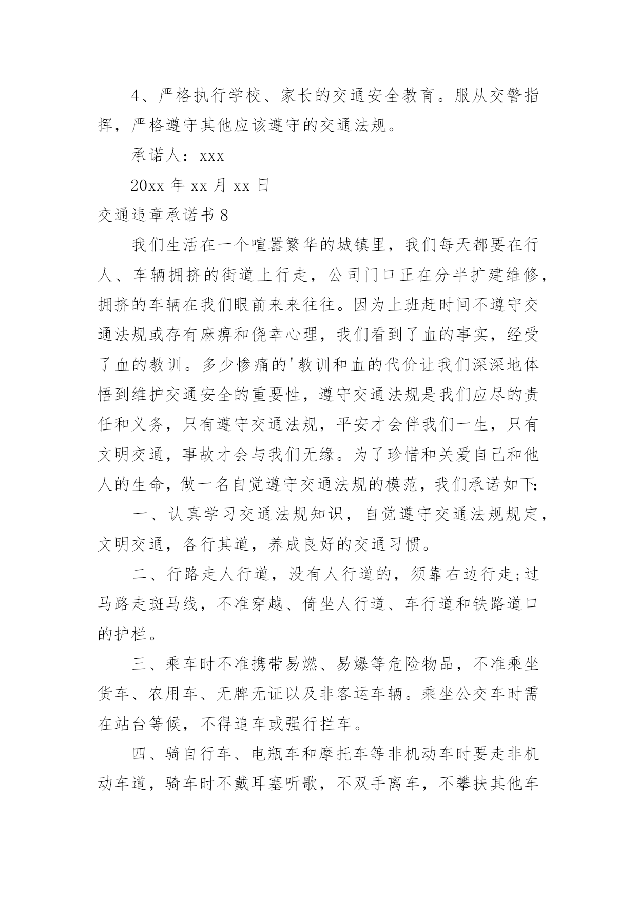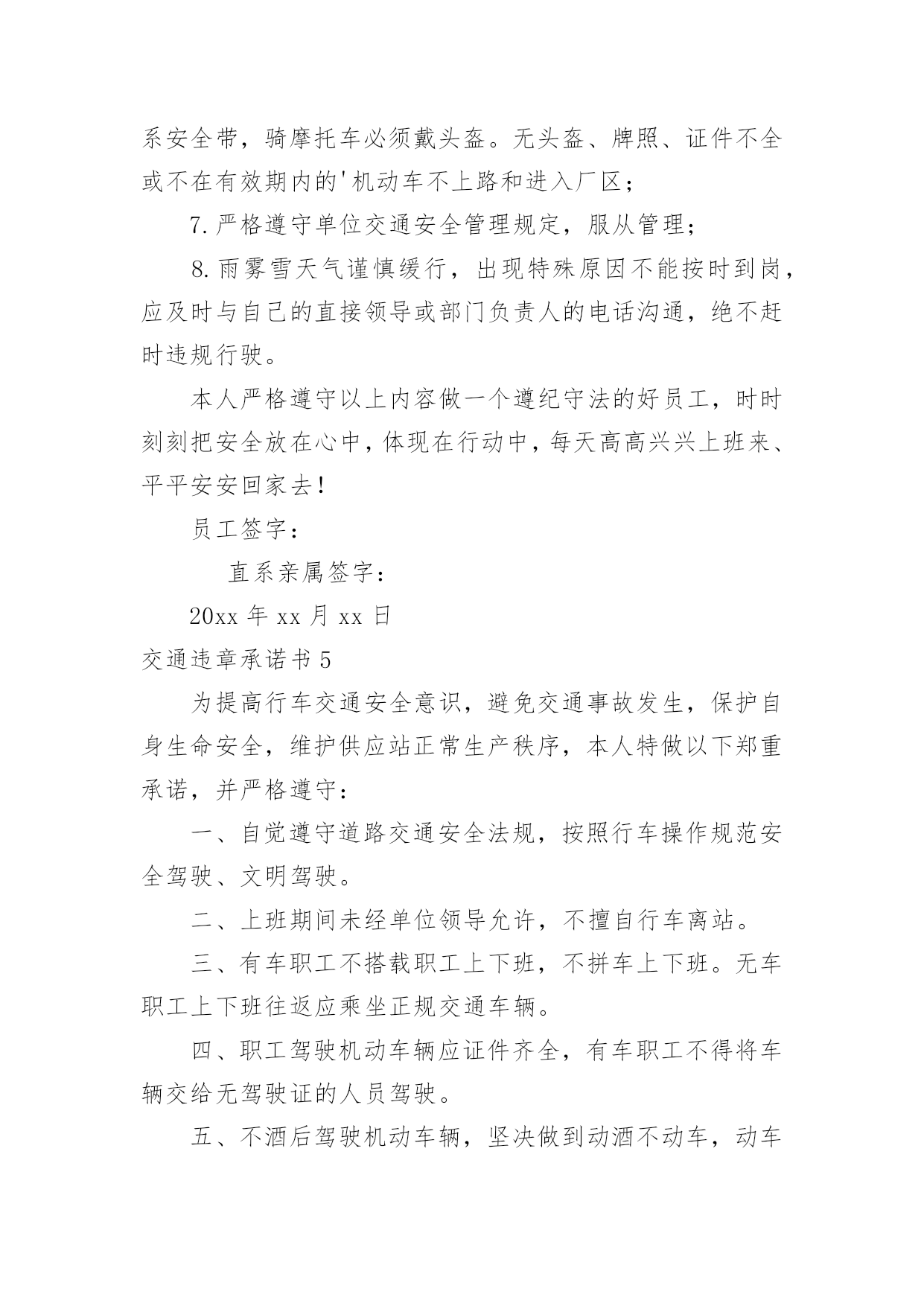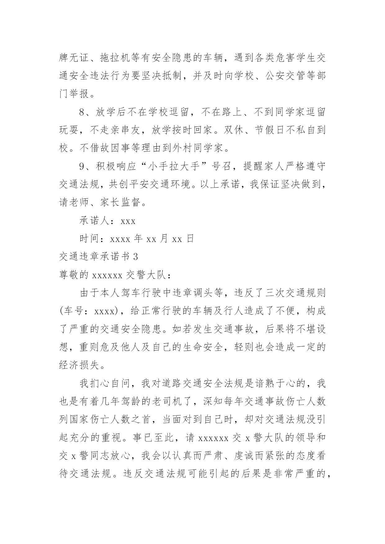 交通违章承诺书交通违章承诺书现如今,承诺书使用的情况越来越多,承诺书必须在要约的有效期作出。那么问题来了,到底应如何写一份恰当的承诺书呢?下面是小编为大家整理的交通违章承诺书,仅供参考,希望能够帮助到大家。交通违章承诺书1同学们的人身安全关系到每一个学生和家庭的幸福,惨痛的事实告诉我们,安全事故往往发生在一念之间。为了进一步提高我们同学的安全意识和遵守交通规则的.自觉性,确保学生的生命健康安全,特慎重承诺如下:1、不私自游泳,不到池塘、湖泊、河流边戏水、玩耍等。2、不骑有故障的车,不违章骑车,不违章过马路。不向过往车辆抛掷石块等。3、不骑摩托车,不扒车,不爬车,不吊车等。4、不乘坐三轮车,农用车,拖拉机等非营运车辆。5、不搭乘“三证”不全的车辆,不搭乘超载车辆,不搭乘车况不好的车,不搭乘有问题(酒后,疲劳等)的车辆。6、此承诺书一式两份,政教处和班级各执一份。自签字之日起生效。承诺人(签名):班级班主任(签名):20xx年xx月xx日交通违章承诺书2为养成良好文明交通行为,摒弃交通陋习,进一步提高交通安全意识,我向学校、家长、社会郑重承诺:1、认真学习交通安全知识,遵守交通法律法规,提高交通安全意识和自我防范事故的能力。2、在道路上行走时一定做到:遵守交通规则,在道路上行走,要走人行道;没有人行道的'.道路,要靠右边行走,做到“红灯停,绿灯行”及“一慢、二看、三通过”。3、不突然横穿马路,特别是马路对面有熟人、同学呼唤,或者自己要坐的车辆已到,千万不能贸然行事,以免发生意外。4、骑自行车时走非机动车道,没有非机动车道的靠路边右侧顺行;不脱手骑车、不骑车带人、不骑“病”车、不骑快车、不与机动车抢道、不平行骑车、不在恶劣天气骑车;骑自行车不在道路上互相追逐、扶身并行。5、骑自行车、电动车要严格遵守交通法律法规,未满12周岁不骑自行车,未满16周岁不骑电动车,坚决不无证驾驶摩托车。6、乘汽车要停稳后上下车,在车上要抓好扶手,头、手等身体部位不能伸出窗外。7、严格遵守交通法规,不乘坐超员、超速、拼装、无牌无证、拖拉机等有安全隐患的车辆,遇到各类危害学生交通安全违法行为要坚决抵制,并及时向学校、公安交管等部门举报。8、放学后不在学校逗留,不在路上、不到同学家逗留玩耍,不走亲串友,放学按时回家。双休、节假日不私自到校。不借故因事等理由到外村同学家。9、积极响应“小手拉大手”号召,提醒家人严格遵守交通法规,共创平安交通环境。以上承诺,我保证坚决做到,请老师、家长监督。承诺人:xxx时间:xxxx年xx月xx日交通违章承诺书3尊敬的xxxxxx交警大队:由于本人驾车行驶中违章调头等,违反了三次交通规则(车号:xxxx),给正常行驶的车辆及行人造成了不便,构成了严重的交通安全隐患。如若发生交通事故,后果将不堪设想,重则危及他人及自己的生命安全,轻则也会造成一定的经济损失。我扪心自问,我对道路交通安全法规是谙熟于心的,我也是有着几年驾龄的老司机了,深知每年交通事故伤亡人数列国家伤亡人数之首,当面对到自己时,却对交通法规没引起充分的重视。事已至此,请xxxxxx交x警大队的领导和交x警同志放心,我会以认真而严肃、虔诚而紧张的态度看待交通法规。违反交通法规可能引起的后果是非常严重的,它造成的'违章可能会危及生命安全、损坏公共设施,进而影响公共治安秩序,这些要引起了我的深层思考。今后,我将深刻的认识遵守交通安全法规的重要性,认真学习交通法规,严格遵守交通法规,增强交通安全意识,做一个遵纪守法的好司机。最后,感谢xxxxxx大队对我的提醒,使我感激涕零,鞠躬致谢!xxx20xx.x.x交通违章承诺书4为了提高自身道路交通中的安全意识,保证自身上下班途中的人身安全,更好地防止意外交通事故给个人、家庭及企业带来伤害或损失,特签订本安全承诺书。1.本人自觉学习并遵守《道路交通安全法》、《道路交通安全法实施条例》等法律、法规;2.讲究交通公德和职业道德,文明驾驶,礼貌行车,严格遵守交通法规,服从指挥;3.根据道路交通法规,靠道路右边行驶、按车道行驶,不闯红灯,不逆向行驶;4.驾驶车辆精力集中,不超速行驶,不强行超车,驾车不接打电话,不酒后驾车,不疲劳驾车,不飙车;5.个人和非机动车(包括电动车)左转、横穿马路要下车,要走斑马线,按规定通过路口;6.机动车有牌照,证件齐全有效,驾车有安全带的必须系安全带,骑摩托车必须戴头盔。无头盔、牌照、证件不全或不在有效期内的'机动车不上路和进入厂区;7.严格遵守单位交通安全管理规定,服从管理;8.雨雾雪天气谨慎缓行,出现特殊原因不能按时到岗,应及时与自己的直接领导或部门负责人的电话沟通,绝不赶时违规行驶。本人严格遵守以上内容做一个遵纪守法的好员工,时时刻刻把安全放在心中,体现在行动中,每天高高兴兴上班来、平平安安回家去!员