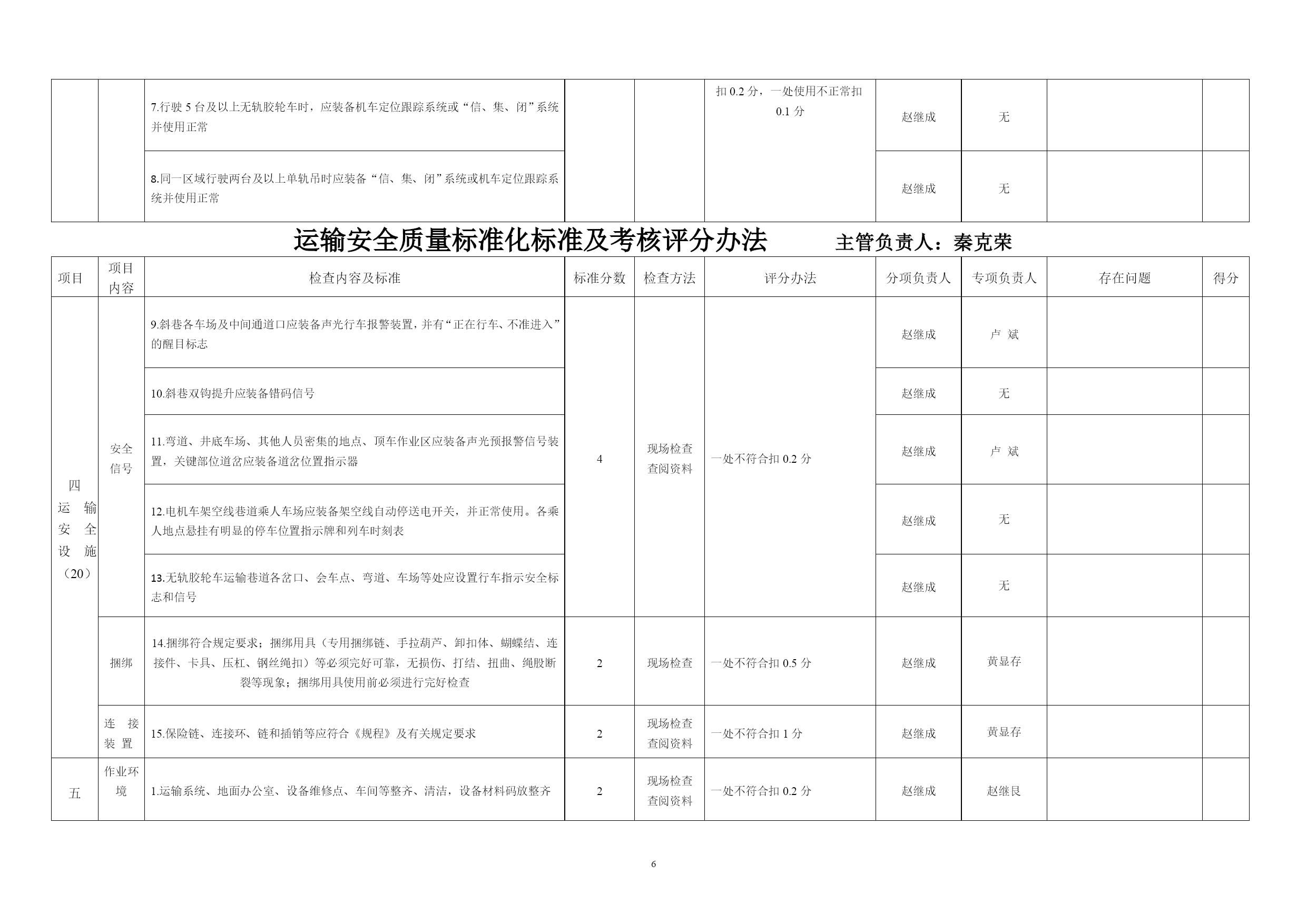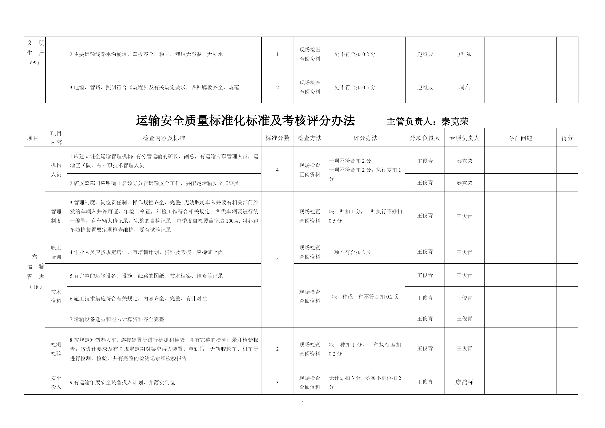煤矿安全质量标准化专业化验收表(六)地测防治水安全质量标准化总负责人:郭文奎主管负责人:郭文奎山西宁武大运华盛庄旺煤业有限公司二O一二年月(四)运输安全质量标准化标准及考核评级办法第一条运输专业安全质量标准化标准考核评级必须具备以下的条件:1、矿井运输无重大责任事故2、有便于操作的运输质量检查验收组织、检查制度及奖惩制度。第二条运输专业安全质量标准化标准考核共6大项,满分100分,专业总得分不得低于60分。第三条考核项目及评分办法(具体见附表):1、每一大项中有缺项时(影响安全的因素除外),按下列计算公式进行折算计分;本大项折合分数=本大项标准分数÷(本大项标准分数-缺项分数)×本大项检查实得分数。2、考核评级计分采用扣分方法,各单项及小项的最低分为零,不出现负分。3、月度运输专业考核得分=上、中、下各旬运输专业考核得分之各/3。4、季度运输专业考核得分=专业动态检查与市或集团公司季度检查综合考核得分。5、年度运输专业考核得分=年度内各季度运输专业考核得分这各/4.第四条本标准适用于轨道运输系统和无轨胶轮车运输矿井。运输安全质量标准化评分表矿井名称:宁煤集团庄旺煤业有限公司年月日必备条件内容检查情况检查结果无重大运输直接责任事故各月份123456789101112有便于操作的运输检查验收组织、检查制度项目项目内容标准分检查得分平均得分各队组得分之和÷检查队组数=一巷道硐室(5)巷道断面5车场车房事故情况运输直接责任死亡事故起人硐室设计躲避硐确认得分评定等级装卸载站二运输线路(30)轨道系统10评定等级异型轨2单轨吊3输入矿井分确认得分×0.15=无轨胶轮车4道岔5单轨吊道岔2架线电机车牵引网路4三运输设备(22)设备完好7运人条件2安全装置8无轨胶轮车3备注无极绳绞车2四运输安全设施(20)挡车装置6通讯信号3调度控制3安全信号4捆绑2连接装置2五文明生产(5)作业环境5六运输管理(18)机构人员4管理制度5职工培训检查人技术资料检测检验2安全投入3开口闭锁4运输安全质量标准化标准及考核评分办法主管负责人:秦克荣项目项目内容检查内容及标准标准分数检查方法评分办法分项负责人专项负责人存在问题得分一巷道硐室(5)巷道断面1.巷道断面符合《煤矿安全规程》(以下简称《规程》)及有关设计规定要求5现场检查查阅资料一处不符合要求扣1分张平辛银春车场车房2.车场、车房、巷道弯道半径、巷道连接方式、运输方式应设计合理,符合《规程》及有关设计规定要求张平辛银春硐室设计3.斜巷信号硐室、运输绞车车房、候车室、调度站、人车库、充电硐室、井下运输车辆检修硐室、井下加油硐室等符合《规程》及有关设计规定要求张平辛银春躲避硐4.斜巷躲避硐齐全,符合《规程》及有关设计规定要求张平辛银春装卸载站5.矿车装载站、矿车卸载站应符合《规程》及有关设计规定要求张平辛银春二运输线路(30)轨道系统1.运行7t及以上机车、3t及以上矿车、采区运送重量超过15t(包括平板车重量)及以上液压支架等设备时,线路轨型不低于30kg/m;其它线路轨型不低于22kg/m4现场检查一处不符合要求扣1分黄显存黄显存2.主要运输线路(主要运输大巷和主要运输石门、井底车场、主要斜巷绞车道,地面运煤、运矸干线和集中运载站车场的轨道)达到优良,其中行驶人车的斜巷轨道必须达到优良3现场检查一处线路不符合要求扣2分,行驶人车的斜巷轨道达不到优良扣4分黄显存黄显存3.一般运输线路质量达到合格,不得有杂拌道(异型轨道长度小于50m为杂拌道)3现场检查一处线路不符合要求扣1分,出现杂拌道此项不得分黄显存黄显存异型轨4.异型轨道线路、齿轨线路及道岔达到合格2现场检查一处不符合要求扣1分黄显存无单轨吊5.单轨吊线路达到合格3现场检查一处不符合要求扣1分黄显存无无轨胶轮车6.运输道路路面采用混凝土硬化、铺钢板等方式,水沟应用盖板封严、稳固,符合设计要求4现场检查一处不符合要求扣1分黄显存无道岔7.主要运输线路的道岔质量达到合格5现场检查合格率每降低1%扣0.15分,低于70%扣4.5分,扣至4.5分为止黄显存黄显存8.一般运输线路的道岔合格率达到60%及以上现场检查合格率每降低1%扣0.05分,低于60%扣3分,扣至3分为止黄显存黄显存9.无非标准道岔,道岔轨型不低于线路轨型现场检查发现一组非标准道岔扣1分,一组轨型不符合要求扣0.5分,扣至4为止黄显存黄显存运输安全质量标准化标准及考核评分办法主管负责人:秦克荣项目项目内容检查内容及标准标准分数检查方法评分办法分项负责人专项负责人存在问题得分二运输线路(30)单轨吊道岔10.单轨吊道岔达到合格2现场检查合格率每降