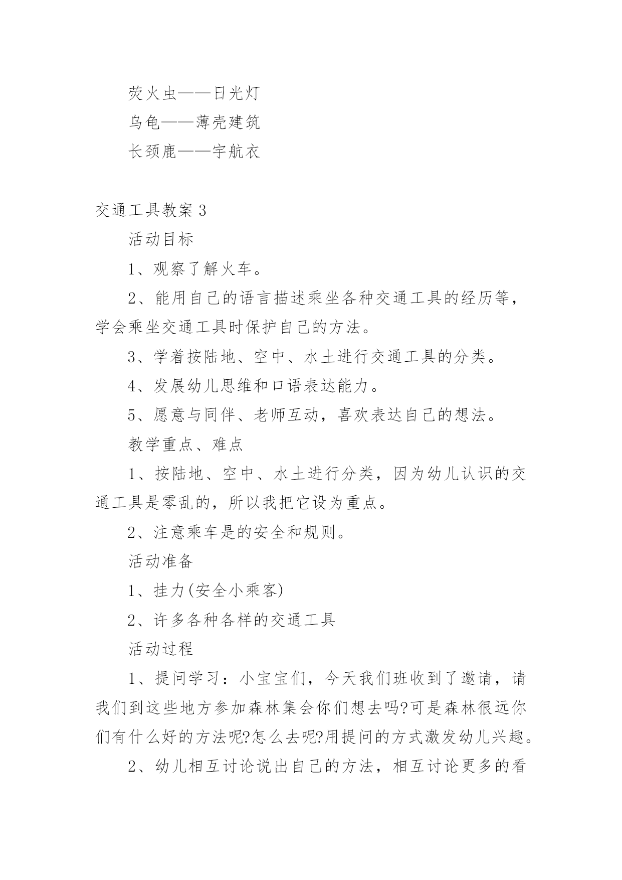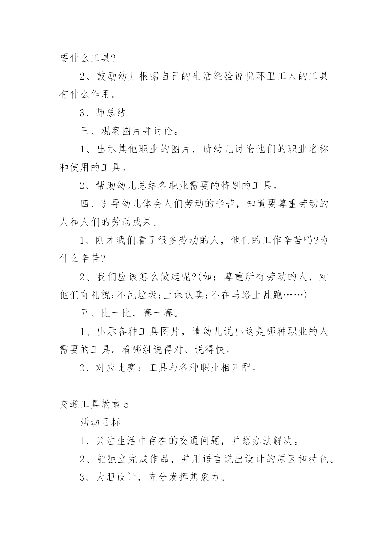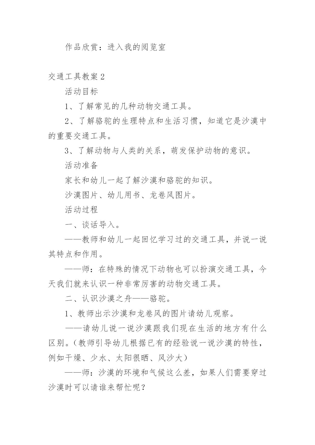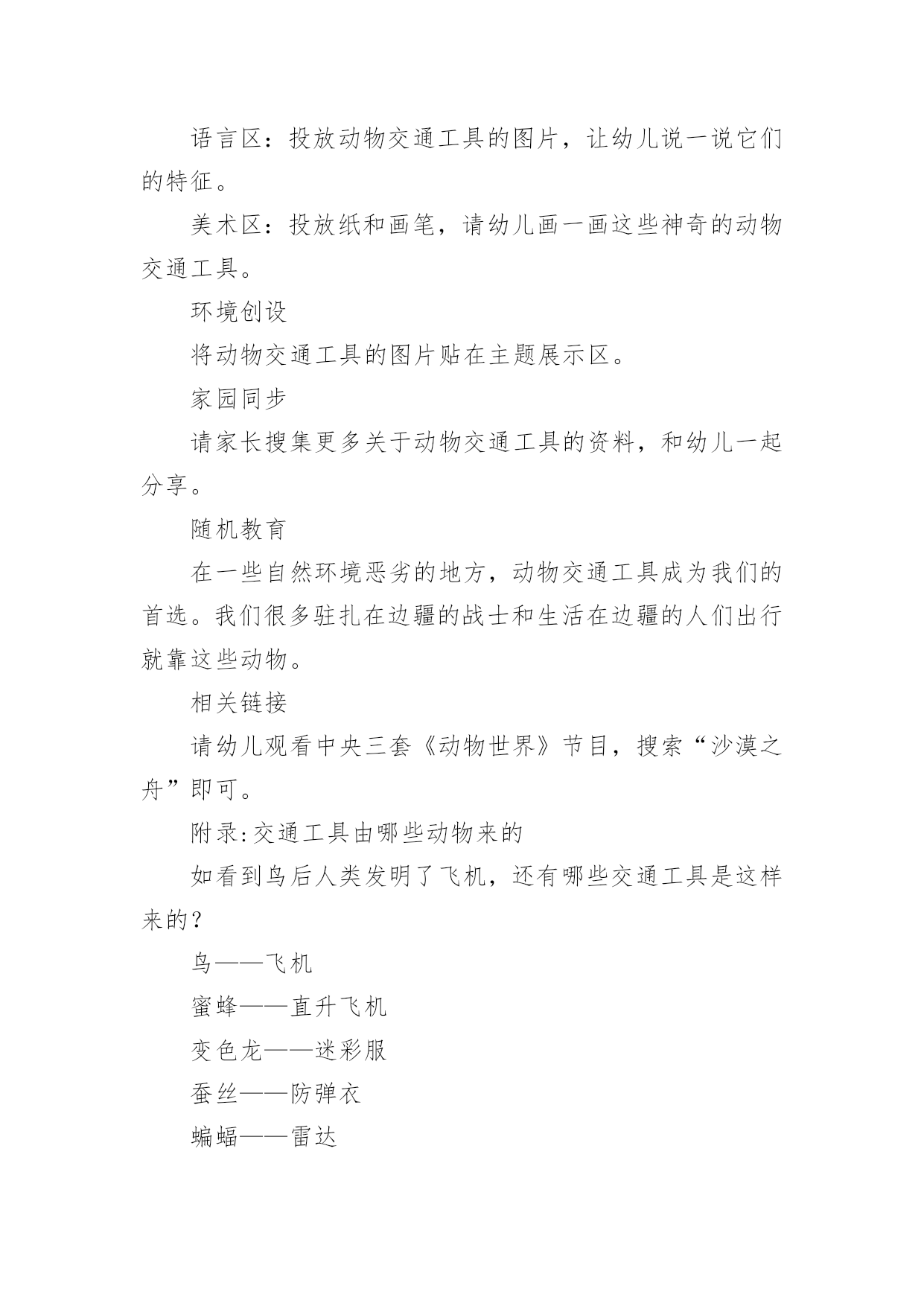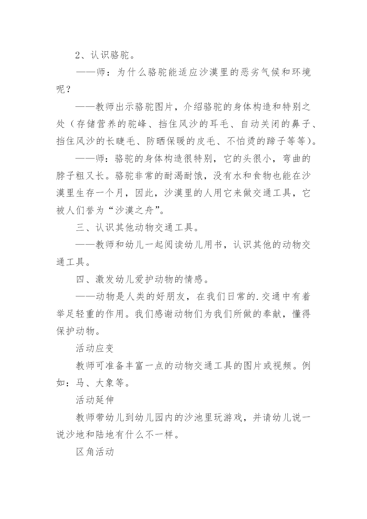 交通工具教案作为一位杰出的教职工,时常需要用到教案,借助教案可以更好地组织教学活动。那么什么样的教案才是好的呢?以下是小编帮大家整理的交通工具教案,供大家参考借鉴,希望可以帮助到有需要的朋友。交通工具教案11、尝试利用塑料瓶和辅助材料,通过剪切、粘贴等方法,制作各种交通工具。2、体验亲子合作的快乐和创造的乐趣。活动准备1、塑料瓶(饮料瓶、牛奶瓶等洗净晾干)、彩色卡纸、牛皮纸、贴纸、锡箔纸、毛根、吸管。2、剪刀、双面胶、透明胶。3、有关交通工具的图片和示范作品。活动过程一、出示塑料瓶,引发创作兴趣教师出示塑料瓶,讲解活动内容,提出要求。师:大家在哪里见过这些塑料瓶?塑料瓶在我们的生活中随处可见,这些塑料瓶我们还可以用它来做什么?我们今天就把塑料瓶变废为宝,每个家庭为一组,制作一个独一无二的、有创意的交通工具。二、欣赏感知,拓宽创作思维1、播放飞机、汽车、轮船、火箭等各种交通工具的构造,引导家长和幼儿一起观察、思考。师:你都认识那些交通工具?这种交通工具都有哪些部分组成?2、播放各种示范作品的照片,发散创作思维。师:这是什么交通工具?这个作品是由什么材料做成的?三、亲子创作,感受制作乐趣1、家長和幼儿一组,共同协商、探索,明确自己的作品主题,并选择需要的材料。师:你们打算制作什么样的交通工具?都想用哪些材料?2、播放轻音乐,幼儿和家长共同制作。3、教师巡回指导并提示:家长不要包办代替,亲子分工合作完成。用剪刀注意安全,保持桌面卫生,垃圾及时入篓。四、交流分享,体验成功的自豪感1、以家庭为小组交流分享。尽量请幼儿介绍作品名称,以及制作经验。提示:作品的'名称是什么?你们都用到了哪些材料?是怎样合作完成的?2、为每位家庭和作品拍照留念,享受亲子制作成功的喜悦。作品欣赏:进入我的阅览室交通工具教案2活动目标1、了解常见的几种动物交通工具。2、了解骆驼的生理特点和生活习惯,知道它是沙漠中的重要交通工具。3、了解动物与人类的关系,萌发保护动物的意识。活动准备家长和幼儿一起了解沙漠和骆驼的知识。沙漠图片、幼儿用书、龙卷风图片。活动过程一、谈话导入。——教师和幼儿一起回忆学习过的交通工具,并说一说其特点和作用。——师:在特殊的情况下动物也可以扮演交通工具,今天我们就来认识一种非常厉害的动物交通工具。二、认识沙漠之舟——骆驼。1、教师出示沙漠和龙卷风的图片请幼儿观察。——请幼儿说一说沙漠跟我们现在生活的地方有什么区别。(教师引导幼儿根据已有的经验说一说沙漠的特性,例如干燥、少水、太阳很晒、风沙大)——师:沙漠的环境和气候这么差,如果人们需要穿过沙漠时可以请谁来帮忙呢?2、认识骆驼。——师:为什么骆驼能适应沙漠里的恶劣气候和环境呢?——教师出示骆驼图片,介绍骆驼的身体构造和特别之处(存储营养的驼峰、挡住风沙的耳毛、自动关闭的鼻子、挡住风沙的长睫毛、防晒保暖的皮毛、不怕烫的蹄子等等)。——师:骆驼的身体构造很特别,它的头很小,弯曲的脖子粗又长。骆驼非常的耐渴耐饿,没有水和食物也能在沙漠里生存一个月,因此,沙漠里的人用它来做交通工具,它被人们誉为“沙漠之舟”。三、认识其他动物交通工具。——教师和幼儿一起阅读幼儿用书,认识其他的动物交通工具。四、激发幼儿爱护动物的情感。——动物是人类的好朋友,在我们日常的.交通中有着举足轻重的作用。我们感谢动物们为我们所做的奉献,懂得保护动物。活动应变教师可准备丰富一点的动物交通工具的图片或视频。例如:马、大象等。活动延伸教师带幼儿到幼儿园内的沙池里玩游戏,并请幼儿说一说沙地和陆地有什么不一样。区角活动语言区:投放动物交通工具的图片,让幼儿说一说它们的特征。美术区:投放纸和画笔,请幼儿画一画这些神奇的动物交通工具。环境创设将动物交通工具的图片贴在主题展示区。家园同步请家长搜集更多关于动物交通工具的资料,和幼儿一起分享。随机教育在一些自然环境恶劣的地方,动物交通工具成为我们的首选。我们很多驻扎在边疆的战士和生活在边疆的人们出行就靠这些动物。相关链接请幼儿观看中央三套《动物世界》节目,搜索“沙漠之舟”即可。附录:交通工具由哪些动物来的如看到鸟后人类发明了飞机,还有哪些交通工具是这样来的?鸟——飞机蜜蜂——直升飞机变色龙——迷彩服蚕丝——防弹衣蝙蝠——雷达荧火虫——日光灯乌龟——薄壳建筑长颈鹿——宇航衣交通工具教案3活动目标1、观察了解火车。2、能用自己的语言描述乘坐各种交通工具的经历等,学会乘坐交通工具时保护自己的方法。3、学着按陆地、空中、水土进行交通工具的分类。4、发展幼儿思维和口语表达能力。5、愿意与同伴、老师互动,喜欢表达自己的想法。教学重点、难点1、按陆地、空中、水土进行分类,因为幼儿认识的交通工具是零乱的,所以我把它设为重点。2、注意乘车是的安全和规则。活动准备1、挂力(安全小乘客)2、许多各种各样的交通工具
