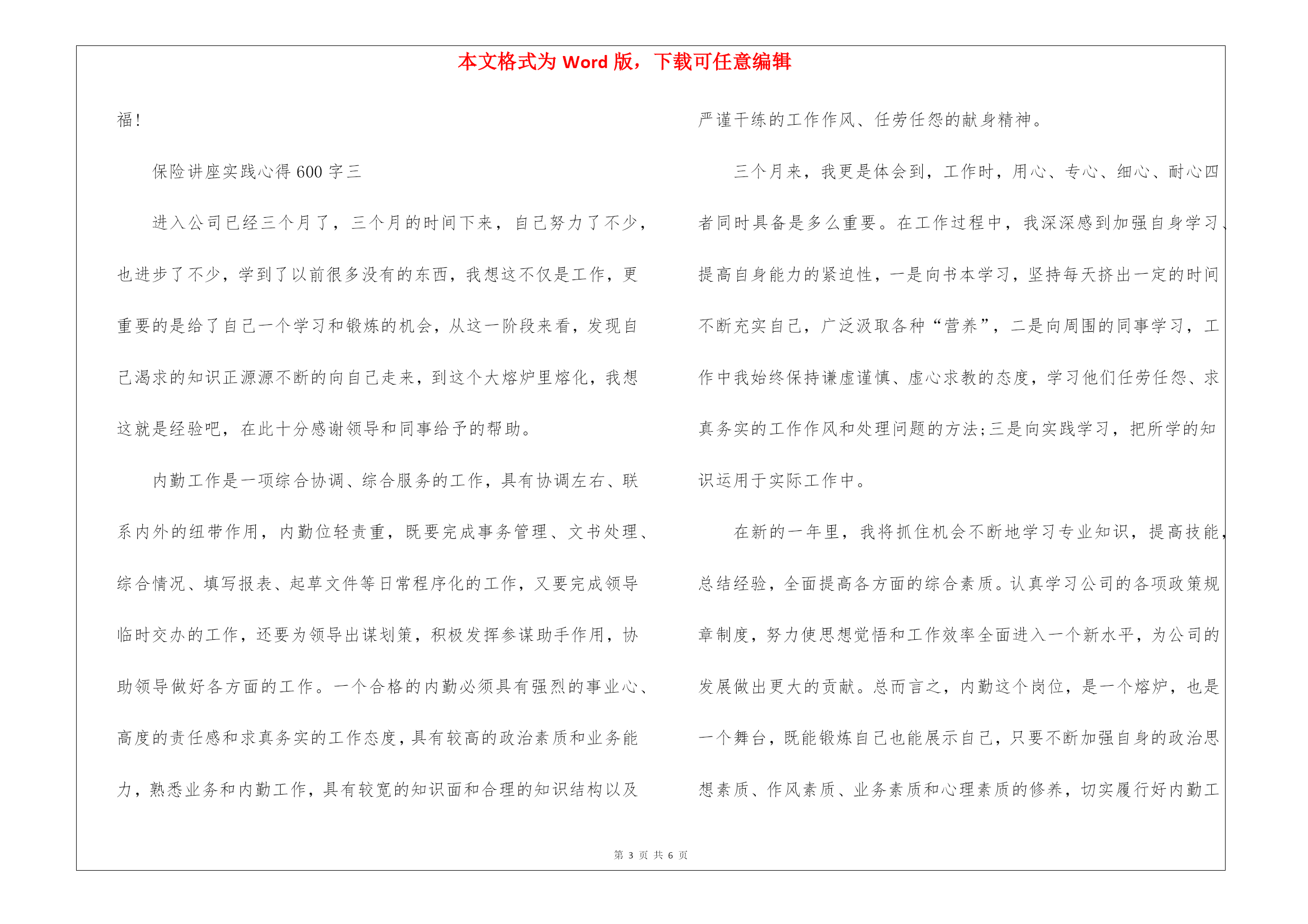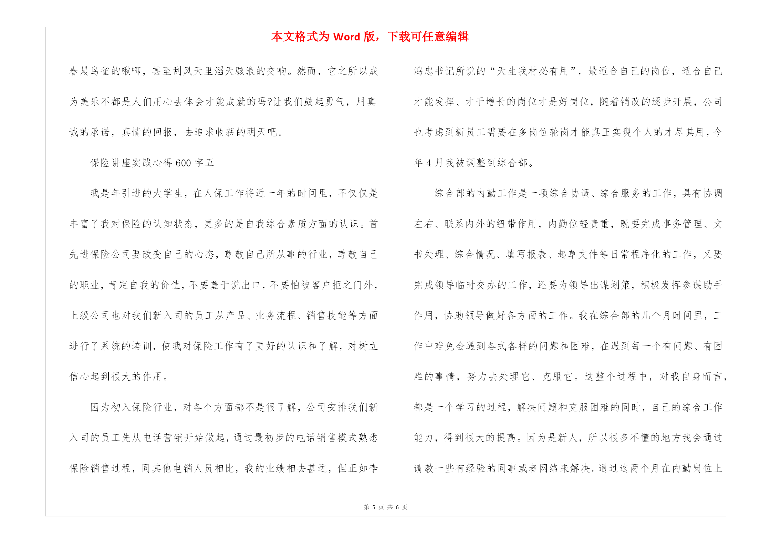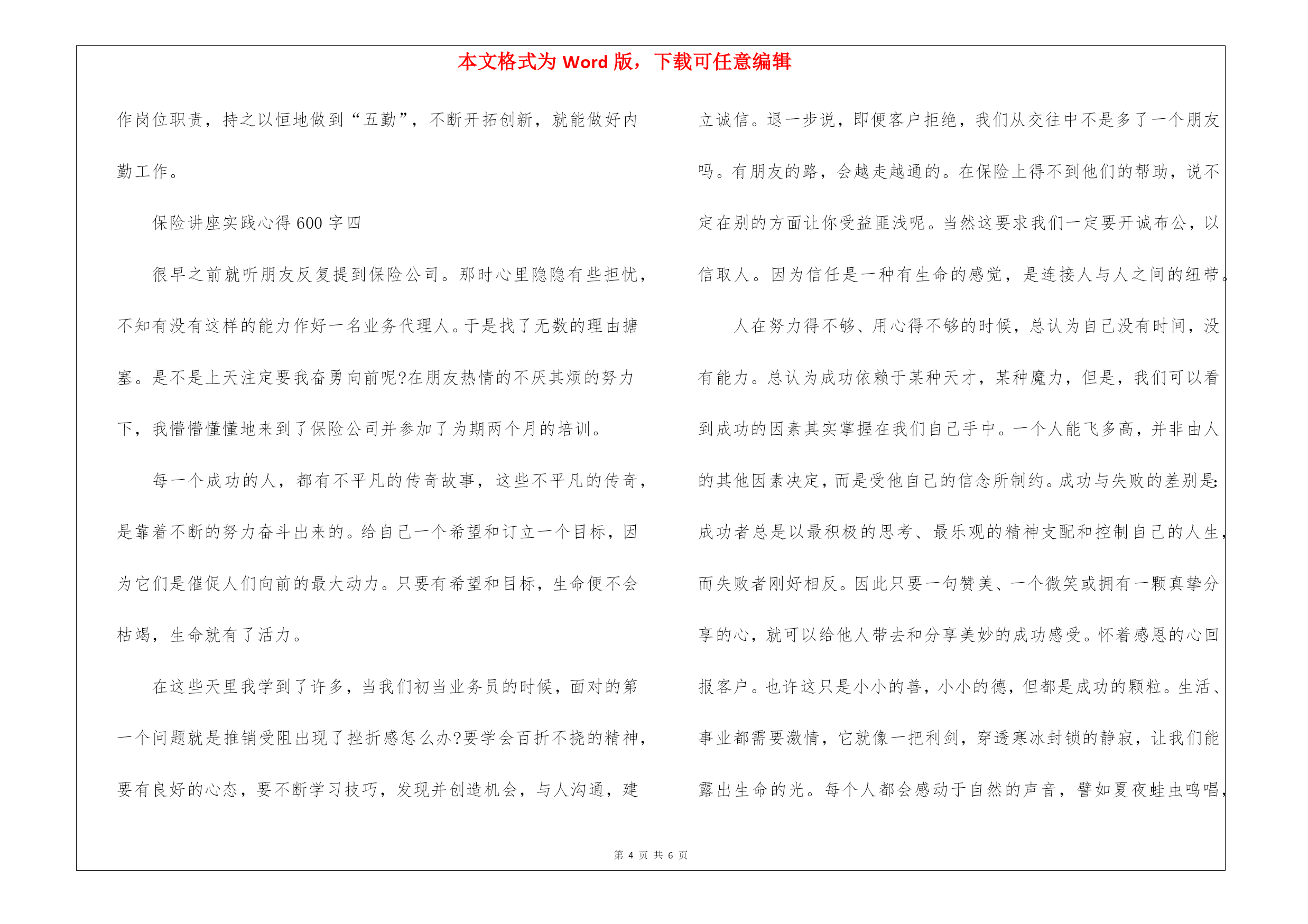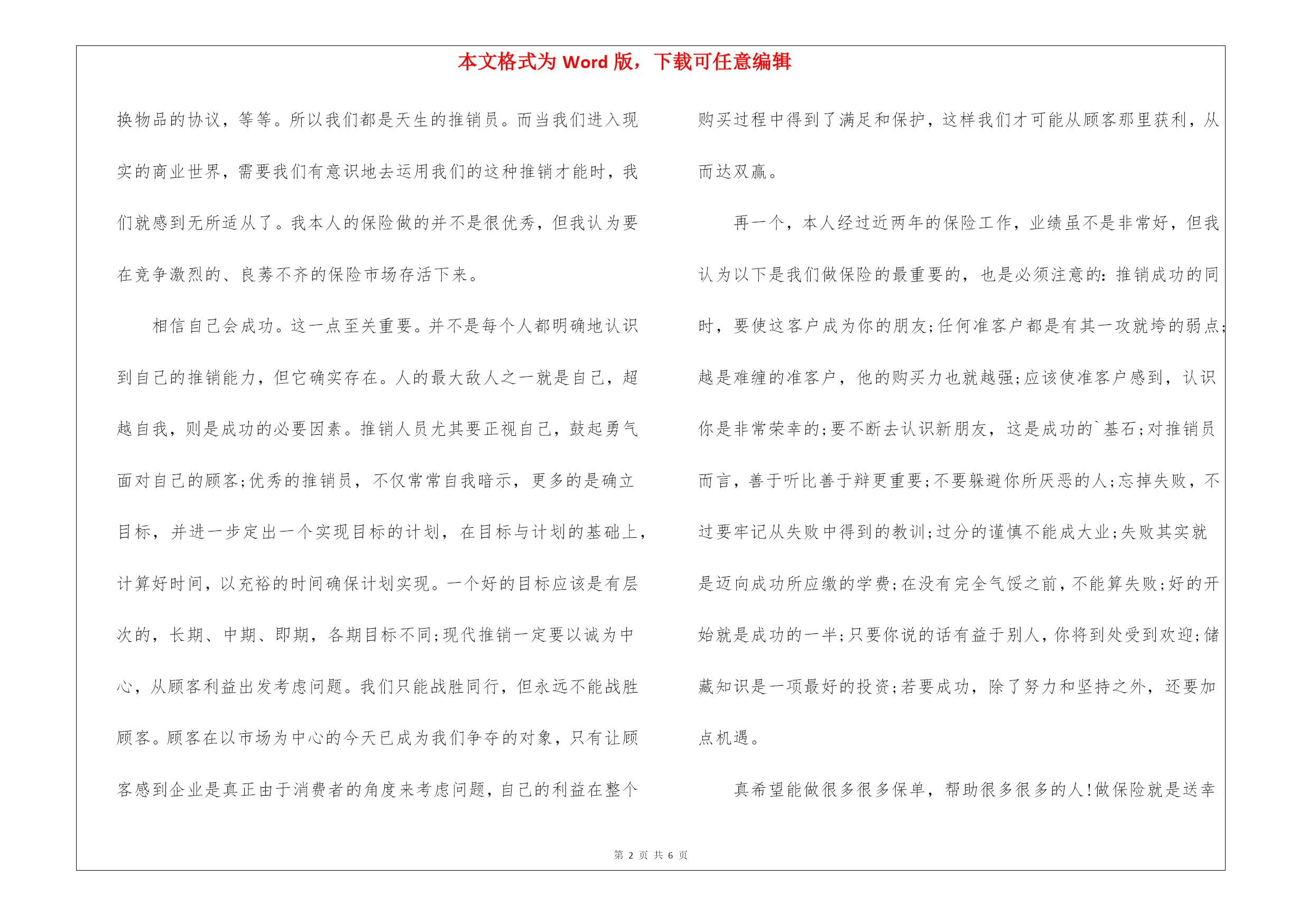 本文格式为Word版,下载可任意编辑第PAGE\*MERGEFORMAT6页共NUMPAGES\*MERGEFORMAT6页保险讲座实践心得600字人常说:风险无处不在。我却说:机遇也无处不在。这不,无意中,我与民生人寿保险相遇,且一见钟情,仅不足一周时间,便擦出爱的火花。我想,这也许是命中注定,也许是我人生的又一转折点。下面由我给大家分享一些关于保险讲座实践心得,方便大家学习,希望可以帮到你。保险讲座实践心得600字一保险行业是一个全新的行业,特别是寿险在中国发展的历史其实并不长。保险业也是一个综合性的行业,保险公司的各个部门岗位都需要我们自己摸索,从头开始。所以不管是学什么专业,到保险公司都是新人。从x到现在,不知不觉在太平人寿学习了17天。17天当中,学习了很多,收获了很多,提高了很多。从入司当天的一个对保险一无所知的应届毕业生到现在已经开始展业的业务实习生,时间虽短但是转变却大。下面我从但各方面谈谈这段时间的心得体会:选择比机遇重要。在太平人寿的招聘专场报告会上,杨雪莲经理与我们分享了她人生的三次成功选择。来太平之前,我在福建天宇职业培训学校做校长助理一份在很多同学看来还可以的一份工作。但是经过反复的思索,最后还是选择来太平人寿。在天宇工作期间,我很受重用,半个月时间之内独立完成了两个培训项目。校长当听说我要走的时候反复挽留我,但是我最终还是选择离开。因为我觉得目前我最需要的是一个可以学习环境而不是一个可以发挥的舞台。刚走出校门的我们对社会还知之甚少,需要学习的还有好多,所以要在人生刚起步的时候积累更多的能量,这样人生的道路才会走的更远、更辉煌。保险讲座实践心得600字二从很小的时候起,我们就不断地把自己推销给周围的人,让他们喜欢自己,接纳自己;说服别人借给自己某种东西;和别人达成某个交换物品的协议,等等。所以我们都是天生的推销员。而当我们进入现实的商业世界,需要我们有意识地去运用我们的这种推销才能时,我们就感到无所适从了。我本人的保险做的并不是很优秀,但我认为要在竞争激烈的、良莠不齐的保险市场存活下来。相信自己会成功。这一点至关重要。并不是每个人都明确地认识到自己的推销能力,但它确实存在。人的最大敌人之一就是自己,超越自我,则是成功的必要因素。推销人员尤其要正视自己,鼓起勇气面对自己的顾客;优秀的推销员,不仅常常自我暗示,更多的是确立目标,并进一步定出一个实现目标的计划,在目标与计划的基础上,计算好时间,以充裕的时间确保计划实现。一个好的目标应该是有层次的,长期、中期、即期,各期目标不同;现代推销一定要以诚为中心,从顾客利益出发考虑问题。我们只能战胜同行,但永远不能战胜顾客。顾客在以市场为中心的今天已成为我们争夺的对象,只有让顾客感到企业是真正由于消费者的角度来考虑问题,自己的利益在整个购买过程中得到了满足和保护,这样我们才可能从顾客那里获利,从而达双赢。再一个,本人经过近两年的保险工作,业绩虽不是非常好,但我认为以下是我们做保险的最重要的,也是必须注意的:推销成功的同时,要使这客户成为你的朋友;任何准客户都是有其一攻就垮的弱点;越是难缠的准客户,他的购买力也就越强;应该使准客户感到,认识你是非常荣幸的;要不断去认识新朋友,这是成功的`基石;对推销员而言,善于听比善于辩更重要;不要躲避你所厌恶的人;忘掉失败,不过要牢记从失败中得到的教训;过分的谨慎不能成大业;失败其实就是迈向成功所应缴的学费;在没有完全气馁之前,不能算失败;好的开始就是成功的一半;只要你说的话有益于别人,你将到处受到欢迎;储藏知识是一项最好的投资;若要成功,除了努力和坚持之外,还要加点机遇。真希望能做很多很多保单,帮助很多很多的人!做保险就是送幸福!保险讲座实践心得600字三进入公司已经三个月了,三个月的时间下来,自己努力了不少,也进步了不少,学到了以前很多没有的东西,我想这不仅是工作,更重要的是给了自己一个学习和锻炼的机会,从这一阶段来看,发现自己渴求的知识正源源不断的向自己走来,到这个大熔炉里熔化,我想这就是经验吧,在此十分感谢领导和同事给予的帮助。内勤工作是一项综合协调、综合服务的工作,具有协调左右、联系内外的纽带作用,内勤位轻责重,既要完成事务管理、文书处理、综合情况、填写报表、起草文件等日常程序化的工作,又要完成领导临时交办的工作,还要为领导出谋划策,积极发挥参谋助手作用,协助领导做好各方面的工作。一个合格的内勤必须具有强烈的事业心、高度的责任感和求真务实的工作态度,具有较高的政治素质和业务能力,熟悉业务和内勤工作,具有较宽的知识面和合理的知识结构以及严谨干练的工作作风、任劳任怨的献身精神。三个月来,我更是体会到,工作时,用心、专心、细心、耐心四者同时具备是多么重要。在工作过程中,我深深感到加强自身学习、提高自身能力的紧