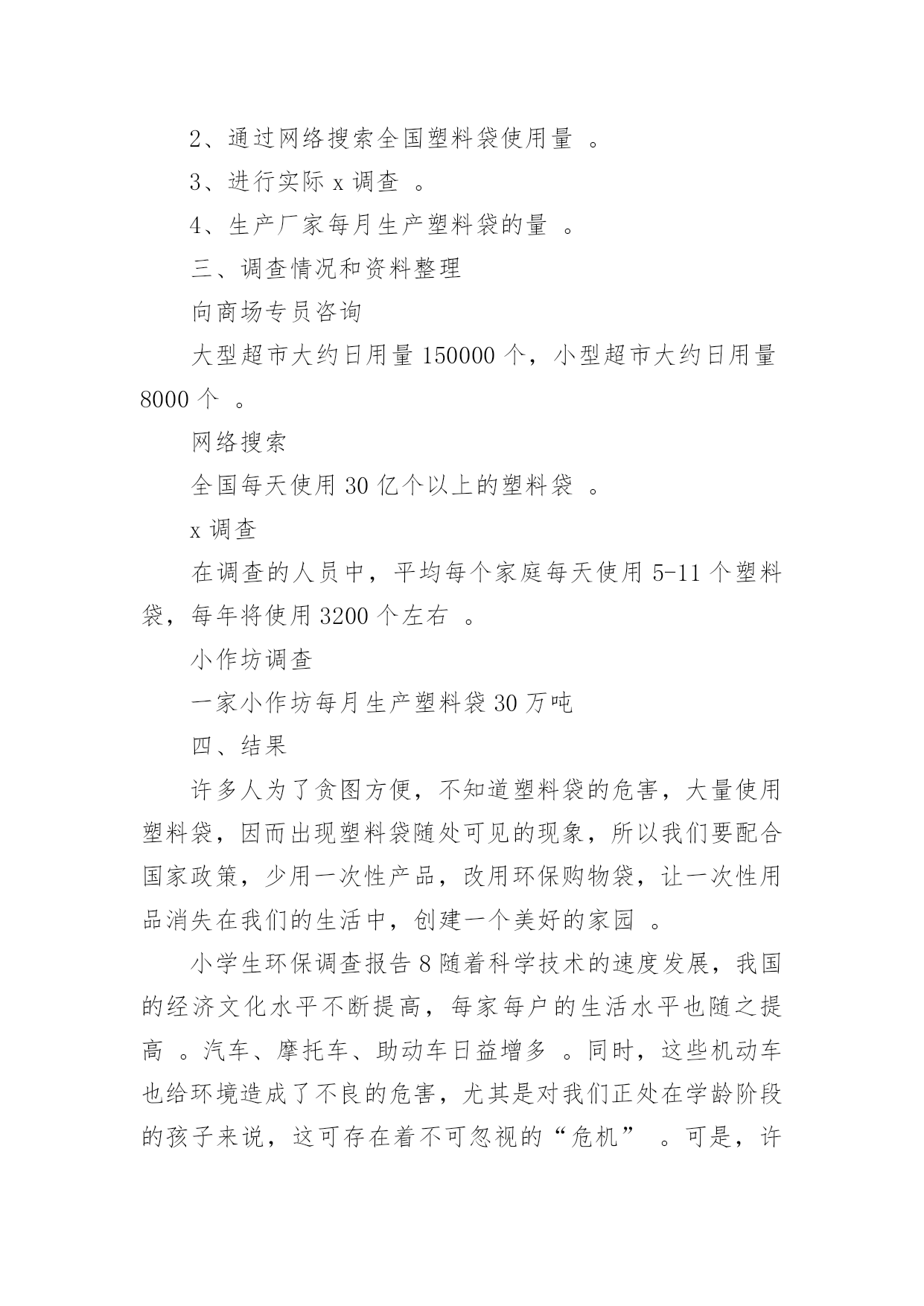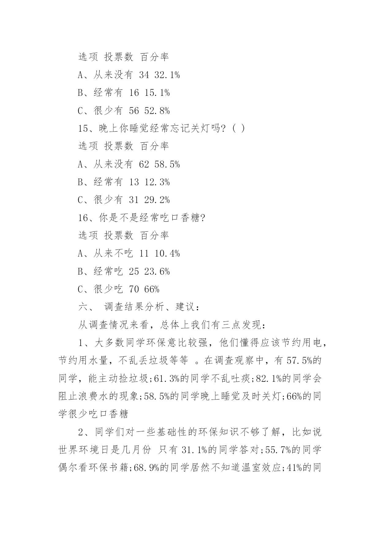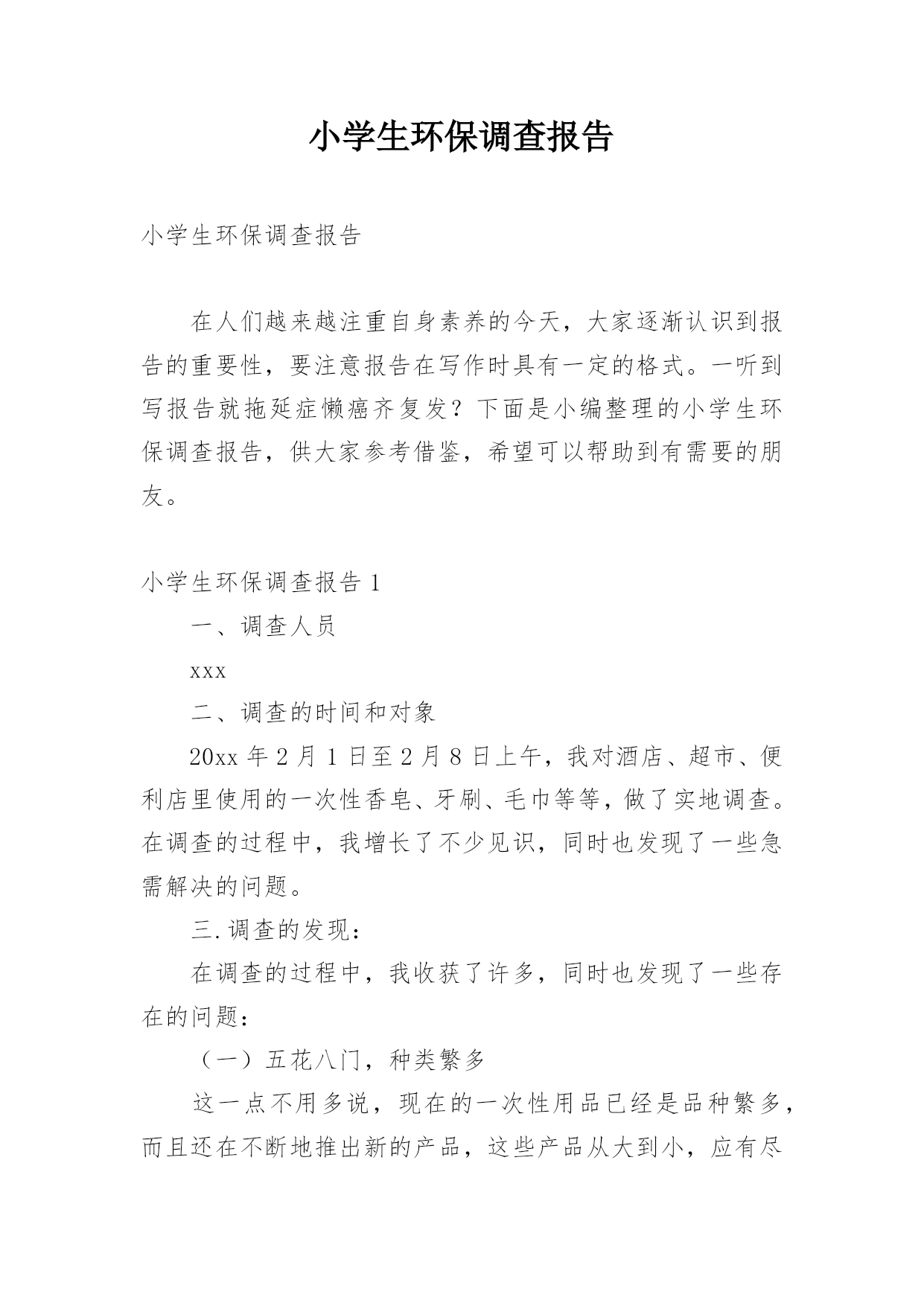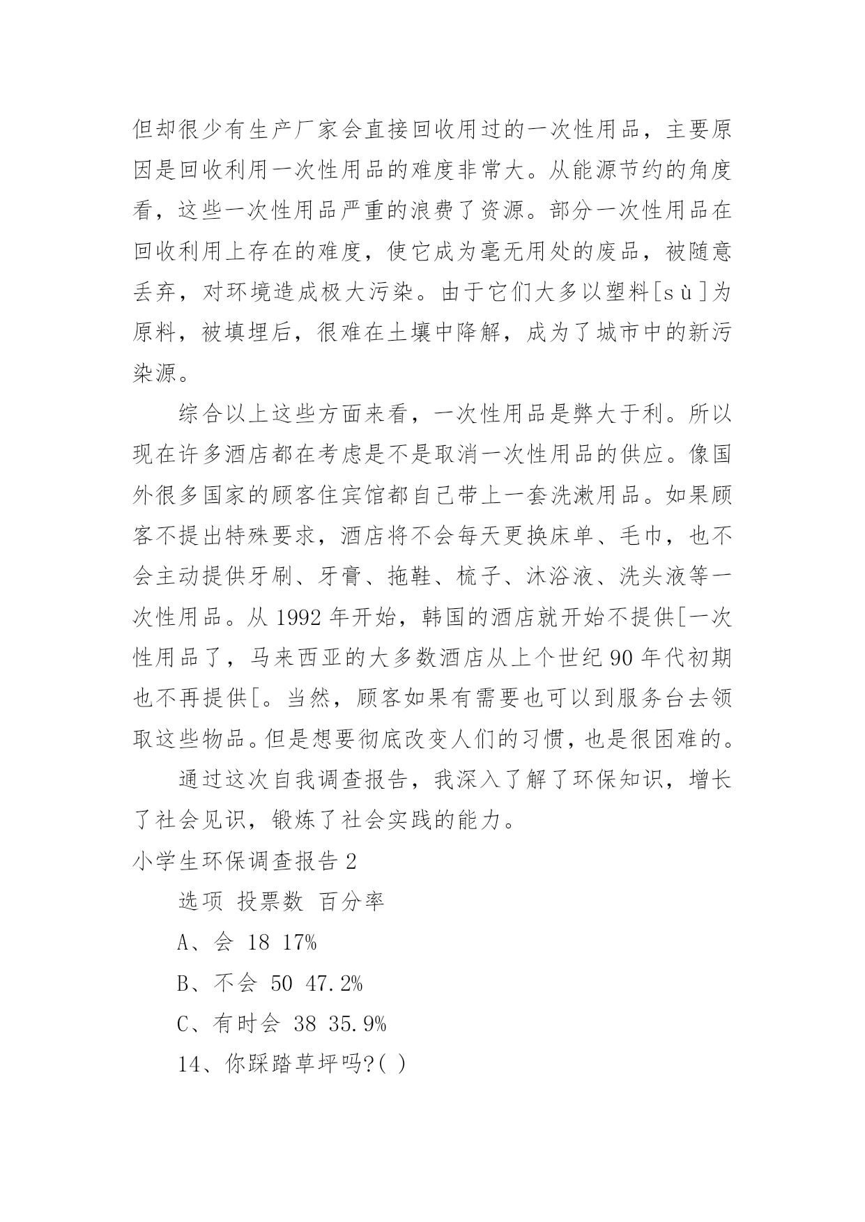 小学生环保调查报告小学生环保调查报告在人们越来越注重自身素养的今天,大家逐渐认识到报告的重要性,要注意报告在写作时具有一定的格式。一听到写报告就拖延症懒癌齐复发?下面是小编整理的小学生环保调查报告,供大家参考借鉴,希望可以帮助到有需要的朋友。小学生环保调查报告1一、调查人员xxx二、调查的时间和对象20xx年2月1日至2月8日上午,我对酒店、超市、便利店里使用的一次性香皂、牙刷、毛巾等等,做了实地调查。在调查的过程中,我增长了不少见识,同时也发现了一些急需解决的问题。三.调查的发现:在调查的过程中,我收获了许多,同时也发现了一些存在的问题:(一)五花八门,种类繁多这一点不用多说,现在的一次性用品已经是品种繁多,而且还在不断地推出新的产品,这些产品从大到小,应有尽有。(二)使用方便,价格低廉这些一次性物品不用洗、不用修,用完就扔,而且携带方便,所以有许多人都喜欢使用。又由于这些一次性的物品材料都是塑料和纸,因而价位都不高,5元钱就可以买二、三十个纸杯。在一些百货批发商店里,很多一次性筷子、塑料饭盒散开摆在货摊上供人选购。500双一捆,批发价只要6元钱。每双的平均价格只有0.012元,这低廉的价格吸引着许多餐饮业的小老板。这也就是我们在小饭店里用餐,用到的都是一次性的筷子、勺子的原因之一。(三)浪费严重,质量参差据有关资料显示,中国市场每年消化一次性筷子450亿双,耗费木材166万立方米。仅北京一地,每天就消耗一次性饭盒、筷子80万套;一年365天就是29200万套。一双一次性筷子重5.5克,29200万双筷子总重1606吨,折合[zhé]木材3212立方米。这么多的木材,都被用在看似不起眼的一次性物品上。这么大的消费量,这样触目惊心。收起的数字,最好地说明了这些一次性用品对资源的浪费。据统计,上海一年所有丢弃的宾馆“六小件(宾馆提供一次性的用品)”总重量达1814吨,每年为了处置[chǔ]这些“六小件”要投入近百万元。这说明,这些物品不仅仅对生态、资源有着很大的破坏,也浪费了很多人力、物力、财力。而且,这些物品质量参差[cēncī]不齐。(四)回收困难,难以利用一次性用品带来了巨大浪费,但却很少有生产厂家会直接回收用过的一次性用品,主要原因是回收利用一次性用品的难度非常大。从能源节约的角度看,这些一次性用品严重的浪费了资源。部分一次性用品在回收利用上存在的难度,使它成为毫无用处的废品,被随意丢弃,对环境造成极大污染。由于它们大多以塑料[sù]为原料,被填埋后,很难在土壤中降解,成为了城市中的新污染源。综合以上这些方面来看,一次性用品是弊大于利。所以现在许多酒店都在考虑是不是取消一次性用品的供应。像国外很多国家的顾客住宾馆都自己带上一套洗漱用品。如果顾客不提出特殊要求,酒店将不会每天更换床单、毛巾,也不会主动提供牙刷、牙膏、拖鞋、梳子、沐浴液、洗头液等一次性用品。从1992年开始,韩国的酒店就开始不提供[一次性用品了,马来西亚的大多数酒店从上个世纪90年代初期也不再提供[。当然,顾客如果有需要也可以到服务台去领取这些物品。但是想要彻底改变人们的习惯,也是很困难的。通过这次自我调查报告,我深入了解了环保知识,增长了社会见识,锻炼了社会实践的能力。小学生环保调查报告2选项投票数百分率A、会1817%B、不会5047.2%C、有时会3835.9%14、你踩踏草坪吗?()选项投票数百分率A、从来没有3432.1%B、经常有1615.1%C、很少有5652.8%15、晚上你睡觉经常忘记关灯吗?()选项投票数百分率A、从来没有6258.5%B、经常有1312.3%C、很少有3129.2%16、你是不是经常吃口香糖?选项投票数百分率A、从来不吃1110.4%B、经常吃2523.6%C、很少吃7066%六、调查结果分析、建议:从调查情况来看,总体上我们有三点发现:1、大多数同学环保意比较强,他们懂得应该节约用电,节约用水量,不乱丢垃圾等等。在调查观察中,有57.5%的同学,能主动捡垃圾;61.3%的同学不乱吐痰;82.1%的同学会阻止浪费水的现象;58.5%的同学晚上睡觉及时关灯;66%的同学很少吃口香糖2、同学们对一些基础性的环保知识不够了解,比如说世界环境日是几月份只有31.1%的同学答对;55.7%的同学偶尔看环保书籍;68.9%的同学居然不知道温室效应;41%的同学对一些基础性的环保小知识不了解3、有些同学有环境意识但没有实际行动。比如看到有人扔垃圾了,32%的同学会劝他不要扔,但是自己又不去捡;35.9%的同学有时还是会用一次性的筷子。4、还有少数同学的环保意识很成问题,比如:13%的同学见到垃圾无动于衷;5.7%的同学经常随地吐痰;6.6%的同学从来不吐环保书籍对存在的一些问题,我们觉得可以从这几方面来改进:1、组织学生认真上好每