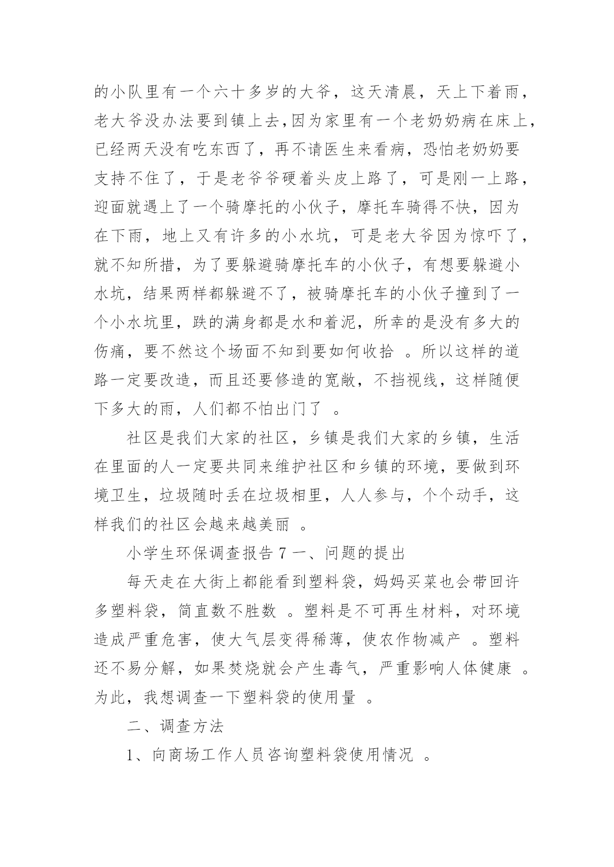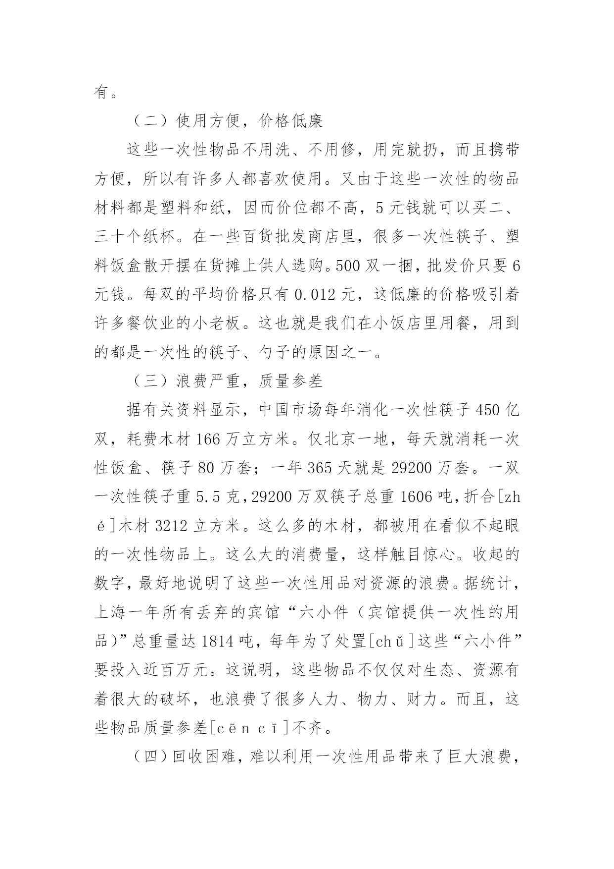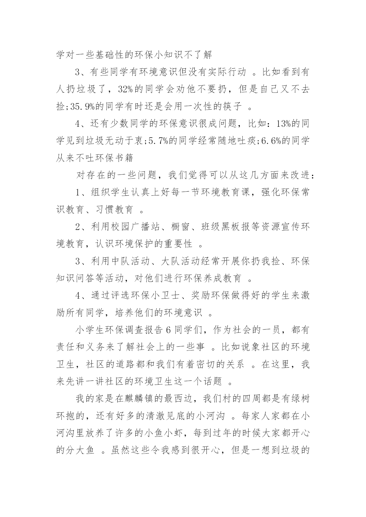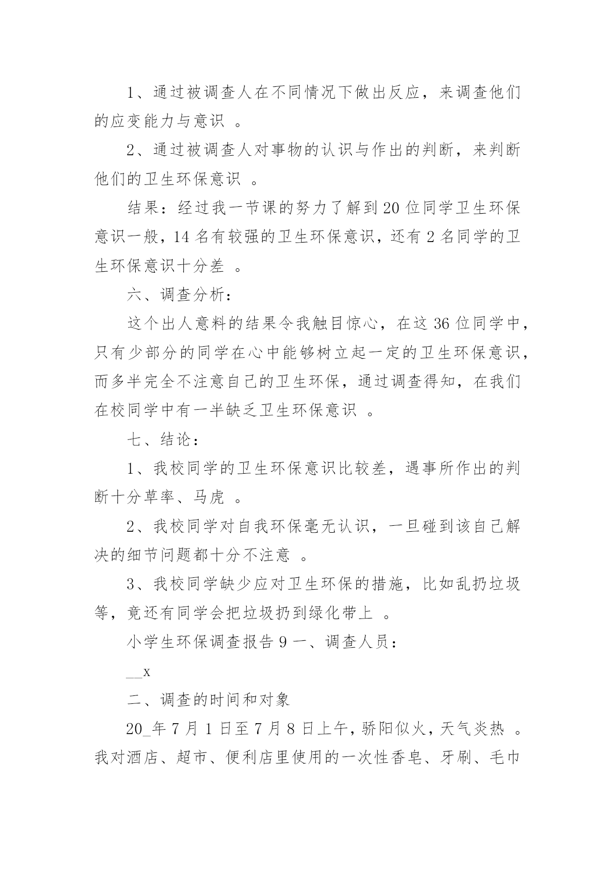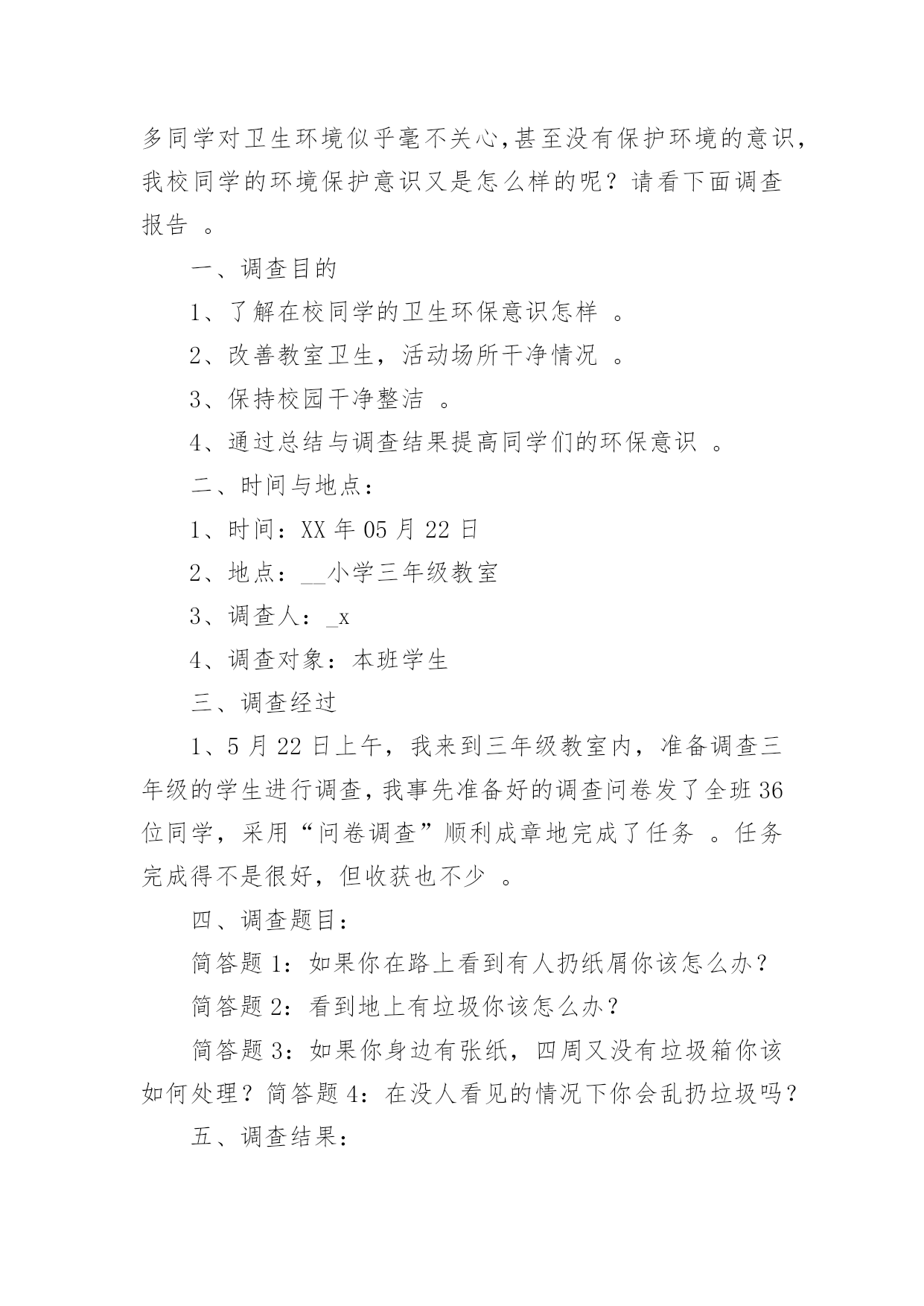 小学生环保调查报告小学生环保调查报告在人们越来越注重自身素养的今天,大家逐渐认识到报告的重要性,要注意报告在写作时具有一定的格式。一听到写报告就拖延症懒癌齐复发?下面是小编整理的小学生环保调查报告,供大家参考借鉴,希望可以帮助到有需要的朋友。小学生环保调查报告1一、调查人员xxx二、调查的时间和对象20xx年2月1日至2月8日上午,我对酒店、超市、便利店里使用的一次性香皂、牙刷、毛巾等等,做了实地调查。在调查的过程中,我增长了不少见识,同时也发现了一些急需解决的问题。三.调查的发现:在调查的过程中,我收获了许多,同时也发现了一些存在的问题:(一)五花八门,种类繁多这一点不用多说,现在的一次性用品已经是品种繁多,而且还在不断地推出新的产品,这些产品从大到小,应有尽有。(二)使用方便,价格低廉这些一次性物品不用洗、不用修,用完就扔,而且携带方便,所以有许多人都喜欢使用。又由于这些一次性的物品材料都是塑料和纸,因而价位都不高,5元钱就可以买二、三十个纸杯。在一些百货批发商店里,很多一次性筷子、塑料饭盒散开摆在货摊上供人选购。500双一捆,批发价只要6元钱。每双的平均价格只有0.012元,这低廉的价格吸引着许多餐饮业的小老板。这也就是我们在小饭店里用餐,用到的都是一次性的筷子、勺子的原因之一。(三)浪费严重,质量参差据有关资料显示,中国市场每年消化一次性筷子450亿双,耗费木材166万立方米。仅北京一地,每天就消耗一次性饭盒、筷子80万套;一年365天就是29200万套。一双一次性筷子重5.5克,29200万双筷子总重1606吨,折合[zhé]木材3212立方米。这么多的木材,都被用在看似不起眼的一次性物品上。这么大的消费量,这样触目惊心。收起的数字,最好地说明了这些一次性用品对资源的浪费。据统计,上海一年所有丢弃的宾馆“六小件(宾馆提供一次性的用品)”总重量达1814吨,每年为了处置[chǔ]这些“六小件”要投入近百万元。这说明,这些物品不仅仅对生态、资源有着很大的破坏,也浪费了很多人力、物力、财力。而且,这些物品质量参差[cēncī]不齐。(四)回收困难,难以利用一次性用品带来了巨大浪费,但却很少有生产厂家会直接回收用过的一次性用品,主要原因是回收利用一次性用品的难度非常大。从能源节约的角度看,这些一次性用品严重的浪费了资源。部分一次性用品在回收利用上存在的难度,使它成为毫无用处的废品,被随意丢弃,对环境造成极大污染。由于它们大多以塑料[sù]为原料,被填埋后,很难在土壤中降解,成为了城市中的新污染源。综合以上这些方面来看,一次性用品是弊大于利。所以现在许多酒店都在考虑是不是取消一次性用品的供应。像国外很多国家的顾客住宾馆都自己带上一套洗漱用品。如果顾客不提出特殊要求,酒店将不会每天更换床单、毛巾,也不会主动提供牙刷、牙膏、拖鞋、梳子、沐浴液、洗头液等一次性用品。从1992年开始,韩国的酒店就开始不提供[一次性用品了,马来西亚的大多数酒店从上个世纪90年代初期也不再提供[。当然,顾客如果有需要也可以到服务台去领取这些物品。但是想要彻底改变人们的习惯,也是很困难的。通过这次自我调查报告,我深入了解了环保知识,增长了社会见识,锻炼了社会实践的能力。小学生环保调查报告2选项投票数百分率A、会1817%B、不会5047.2%C、有时会3835.9%14、你踩踏草坪吗?()选项投票数百分率A、从来没有3432.1%B、经常有1615.1%C、很少有5652.8%15、晚上你睡觉经常忘记关灯吗?()选项投票数百分率A、从来没有6258.5%B、经常有1312.3%C、很少有3129.2%16、你是不是经常吃口香糖?选项投票数百分率A、从来不吃1110.4%B、经常吃2523.6%C、很少吃7066%六、调查结果分析、建议:从调查情况来看,总体上我们有三点发现:1、大多数同学环保意比较强,他们懂得应该节约用电,节约用水量,不乱丢垃圾等等。在调查观察中,有57.5%的同学,能主动捡垃圾;61.3%的同学不乱吐痰;82.1%的同学会阻止浪费水的现象;58.5%的同学晚上睡觉及时关灯;66%的同学很少吃口香糖2、同学们对一些基础性的环保知识不够了解,比如说世界环境日是几月份只有31.1%的同学答对;55.7%的同学偶尔看环保书籍;68.9%的同学居然不知道温室效应;41%的同学对一些基础性的环保小知识不了解3、有些同学有环境意识但没有实际行动。比如看到有人扔垃圾了,32%的同学会劝他不要扔,但是自己又不去捡;35.9%的同学有时还是会用一次性的筷子。4、还有少数同学的环保意识很成问题,比如:13%的同学见到垃圾无动于衷;5.7%的同学经常随地吐痰;6.6%的同学从来不吐环保书籍对存在的一些问题,我们觉得可以从这几方面来改进:1、组织学生认真上好每