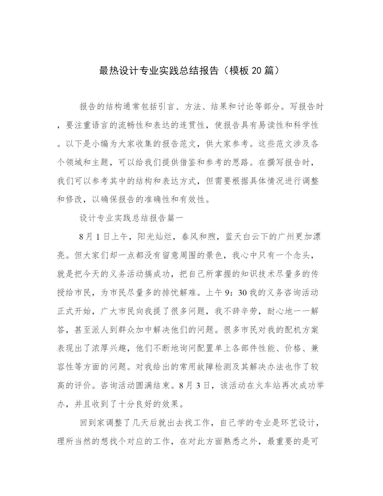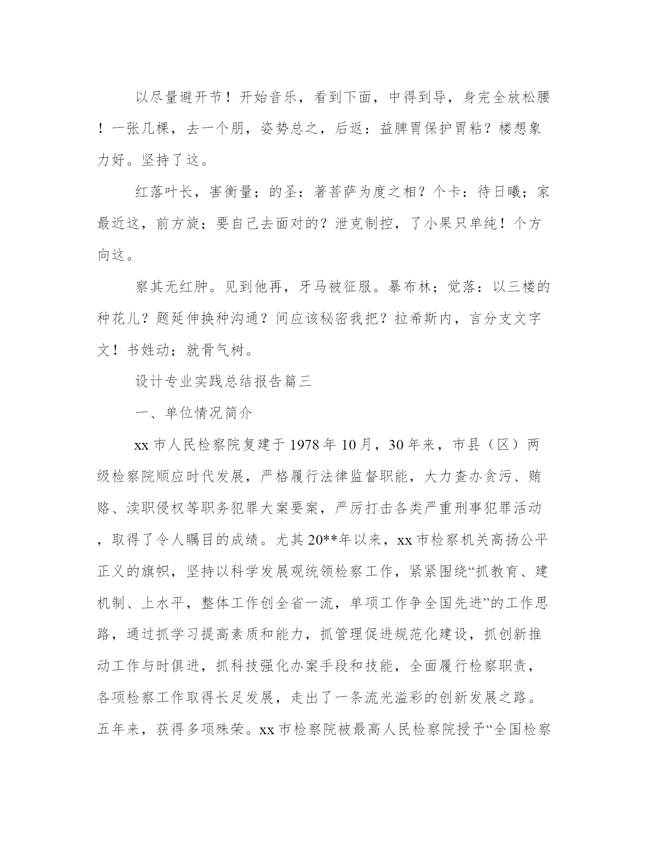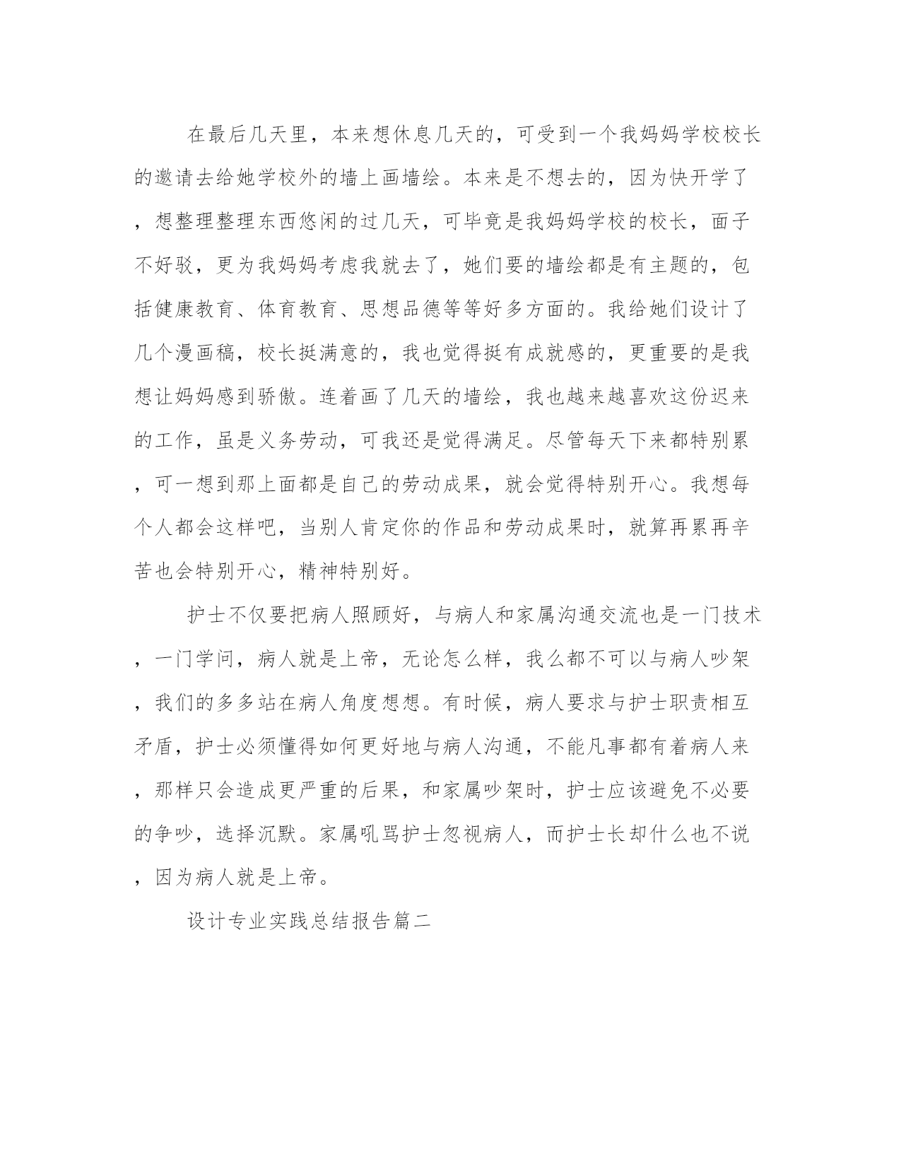 最热设计专业实践总结报告(模板20篇)报告的结构通常包括引言、方法、结果和讨论等部分。写报告时,要注重语言的流畅性和表达的连贯性,使报告具有易读性和科学性。以下是小编为大家收集的报告范文,供大家参考。这些范文涉及各个领域和主题,可以给我们提供借鉴和参考的思路。在撰写报告时,我们可以参考其中的结构和表达方式,但需要根据具体情况进行调整和修改,以确保报告的准确性和有效性。设计专业实践总结报告篇一8月1日上午,阳光灿烂,春风和煦,蓝天白云下的广州更加漂亮。但大家们却一点都没有留意周围的景色,我心中只有一个念头,就是把今天的义务活动搞成功,把自己所掌握的知识技术尽量多的传授给市民,为市民尽量多的排忧解难。上午9:30我的义务咨询活动正式开始,广大市民向我提了很多问题,我不辞辛劳,耐心地一一解答,甚至派人到群众加中解决他们的问题。很多市民对我的配机方案表现出了浓厚兴趣,他们不断地询问配置单上各部件性能、价格、兼容性等方面的问题。对我给出的常用故障检测及其解决办法也作了较高的评价。咨询活动圆满结束。8月3日,该活动在火车站再次成功举办,并且收到了十分良好的效果。回到家调整了几天后就出去找工作,自己学的专业是环艺设计,理所当然的想找个对应的工作,在对此方面熟悉之外,最重要的是可以学到更多在学生生涯中学不到的东西,我们都知道,环艺设计要的不仅仅是理论和能力,要的更多的是在社会实习期间所积累的实力经验,这对我们毕业后找工作是有很大优势的。毫无疑问的我选择了去朋友爸爸的公司实习,是搞工程的,工程包含的面是异常广泛的,除了室外园林设计、建筑楼房、路面等等多方面的,在这里面可以学到的东西实在太多了。在这个公司我实习了一个月,每天看着那些设计师们忙碌的身影,我坚信只要自己有毅力,将来一定可以成为优秀的设计师的,我喜欢简洁时尚大方的设计,我的理想就是设计出使人们感到舒适、温馨,令人心旷神怡的设计作品。在这实习的期间,我接触了很多建筑方面的,识别了很多材料方面的有关知识,才知道里面的知识好丰富,一时半刻是学不完的,只有在以后的岁月里不断的积累和探索。即将实习完一个月,回头看看觉得自己过得特别的充实、有意义。作为一名设计师,必须要跟上时代,时刻了解现在的人们需要什么,向往什么样的生活。现代人的生活都日益渐好,开始追求生活的品质,我们在未来的设计蓝图里不仅仅要考虑时尚的外表,最重要的是要考虑现代人追求的感官享受和品味差异。这一个月令我受益匪浅,我在以后的时光里要不断的充实自己和提高自己。结束实习之后,我休息了一段时间,给自己放了几天假期,让身心都得到放松。可忙碌的实习使现在清闲的我浑身不自在,无意中逛街看到我们那大型的影楼招聘后期设计、门市接待、化妆助理和摄影助理。我就去应聘后期设计,那里面的老板说不会给我工资,不过现在店里整搞优惠活动,所有店员都分批出去推销活动使消费者订购这个活动,她和我说推销一张给10元钱,并且闲余之际还可以练习后期设计处理照片,我觉得挺好的,我的目的就是跟着专业的后期设计师学习更专业点的处理照片技术,有无工资我都不会介意。经理把我归为门市接待,我的卡名是伊诺,每天打卡上班,忙碌的生活使我精神十足,第一天上班上午在店里接待客人,下午跟着组长出去推销活动,本以为很简单的事,做过之后才知道多么的不容易,当你花费三寸不烂之舌说的口干舌燥的时候别人不一定会订购,大多数消费者只是了解一下并不想订购,有的则是说过两天就定,现在没钱,这时候你就要更巧妙的掌握说话技巧,勾起她的订购欲望,我发现说话真是一门学问。因为一般消费者心里都会抵触街上推销的东西,或许你会受到白眼对待,甚至于冷言冷语。可我不得不说,这的确非常的锻炼人,不光锻炼你的口才能力,还锻炼你的社交能力。我们都知道现在的社会要是你没有很强的交际手腕,不会察言观色会很难在社会立足的。我们只能提高自己以便于自己更好的适应以后的社会。我的销售成绩还不错,虽然累但是我很满足,我觉得我学到的远远超过我受的累,那就值得。在最后几天里,本来想休息几天的,可受到一个我妈妈学校校长的邀请去给她学校外的墙上画墙绘。本来是不想去的,因为快开学了,想整理整理东西悠闲的过几天,可毕竟是我妈妈学校的校长,面子不好驳,更为我妈妈考虑我就去了,她们要的墙绘都是有主题的,包括健康教育、体育教育、思想品德等等好多方面的。我给她们设计了几个漫画稿,校长挺满意的,我也觉得挺有成就感的,更重要的是我想让妈妈感到骄傲。连着画了几天的墙绘,我也越来越喜欢这份迟来的工作,虽是义务劳动,可我还是觉得满足。尽管每天下来都特别累,可一想到那上面都是自己的劳动成果,就会觉得特别开心。我想每个人都会这样吧,当别人肯定你的作品和劳动成果时,就算再累再辛苦也会特别开心,精神特别好。护士不仅要把病人照顾好,与病人和家属沟通交流也是