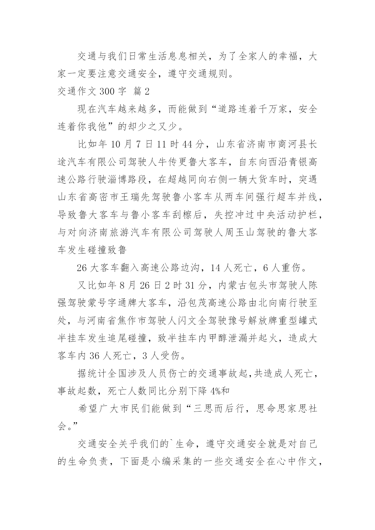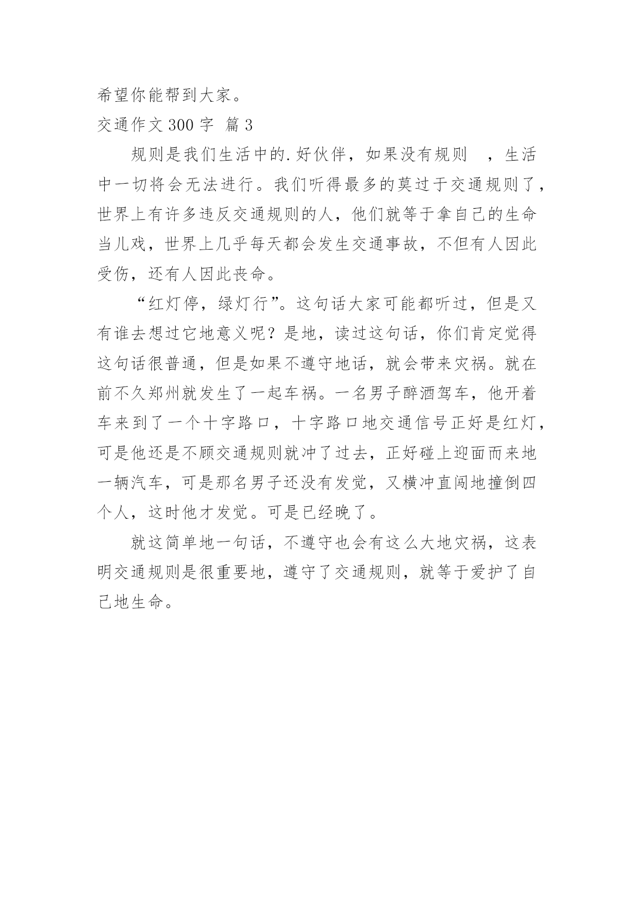 交通作文300字交通作文300字必备[3篇]在现实生活或工作学习中,大家都有写作文的经历,对作文很是熟悉吧,作文是人们把记忆中所存储的有关知识、经验和思想用书面形式表达出来的记叙方式。你知道作文怎样写才规范吗?以下是小编为大家整理的交通作文300字3篇,仅供参考,大家一起来看看吧。交通作文300字篇1爸爸又带我去看他的战友了。房间里,军军的爸爸躺在床上,身上插了很多管子,那是在输液。军军的爸爸不能吃饭,只能靠输液维持生命。关于交通规则的'作文我上去叫他:“伯伯,你好些了吗?”可他躺在那儿,只是嘴巴很艰难地微微动了一下,说不出话来。这时军军的奶奶进来了,白发苍苍的她颤微微的端来一碗绿豆汤,喂他的儿子,他的儿子根本不会张口喝汤,绿豆汤都从嘴边流了出来,奶奶心痛地流着眼泪说:“天气热了,喝点绿豆汤解解热吧。”这是怎么一回事呢?原来是军军的爸爸不遵守交通规则,一次酒后驾车出了车祸,成了植物人。回来的路上我紧紧地抓着爸爸的手对他说:“爸爸,你一定要注意交通安全,少开快车,多开慢车,千万不能酒后驾驶啊!”关于交通规则的作文交通与我们日常生活息息相关,为了全家人的幸福,大家一定要注意交通安全,遵守交通规则。交通作文300字篇2现在汽车越来越多,而能做到“道路连着千万家,安全连着你我他”的却少之又少。比如年10月7日11时44分,山东省济南市商河县长途汽车有限公司驾驶人牛传更鲁大客车,自东向西沿青银高速公路行驶淄博路段,在超越同向右侧一辆大货车时,突遇山东省高密市王瑞先驾驶鲁小客车从两车间强行超车并线,导致鲁大客车与鲁小客车刮檫后,失控冲过中央活动护栏,与对向济南旅游汽车有限公司驾驶人周玉山驾驶的鲁大客车发生碰撞致鲁26大客车翻入高速公路边沟,14人死亡,6人重伤。又比如年8月26日2时31分,内蒙古包头市驾驶人陈强驾驶蒙号字通牌大客车,沿包茂高速公路由北向南行驶至处,与河南省焦作市驾驶人闪文全驾驶豫号解放牌重型罐式半挂车发生追尾碰撞,致半挂车内甲醇泄漏并起火,造成大客车内36人死亡,3人受伤。据统计全国涉及人员伤亡的交通事故起,共造成人死亡,事故起数,死亡人数同比分别下降4%和希望广大市民们能做到“三思而后行,思命思家思社会。”交通安全关乎我们的`生命,遵守交通安全就是对自己的生命负责,下面是小编采集的一些交通安全在心中作文,希望你能帮到大家。交通作文300字篇3规则是我们生活中的.好伙伴,如果没有规则,生活中一切将会无法进行。我们听得最多的莫过于交通规则了,世界上有许多违反交通规则的人,他们就等于拿自己的生命当儿戏,世界上几乎每天都会发生交通事故,不但有人因此受伤,还有人因此丧命。“红灯停,绿灯行”。这句话大家可能都听过,但是又有谁去想过它地意义呢?是地,读过这句话,你们肯定觉得这句话很普通,但是如果不遵守地话,就会带来灾祸。就在前不久郑州就发生了一起车祸。一名男子醉酒驾车,他开着车来到了一个十字路口,十字路口地交通信号正好是红灯,可是他还是不顾交通规则就冲了过去,正好碰上迎面而来地一辆汽车,可是那名男子还没有发觉,又横冲直闯地撞倒四个人,这时他才发觉。可是已经晚了。就这简单地一句话,不遵守也会有这么大地灾祸,这表明交通规则是很重要地,遵守了交通规则,就等于爱护了自己地生命。