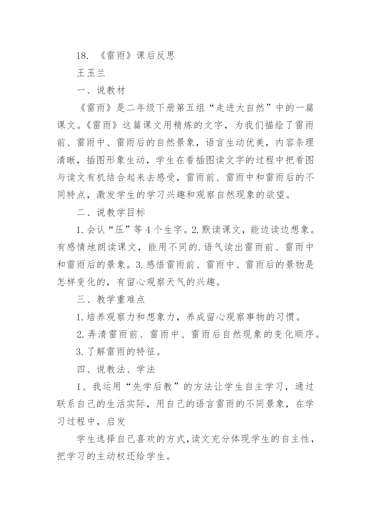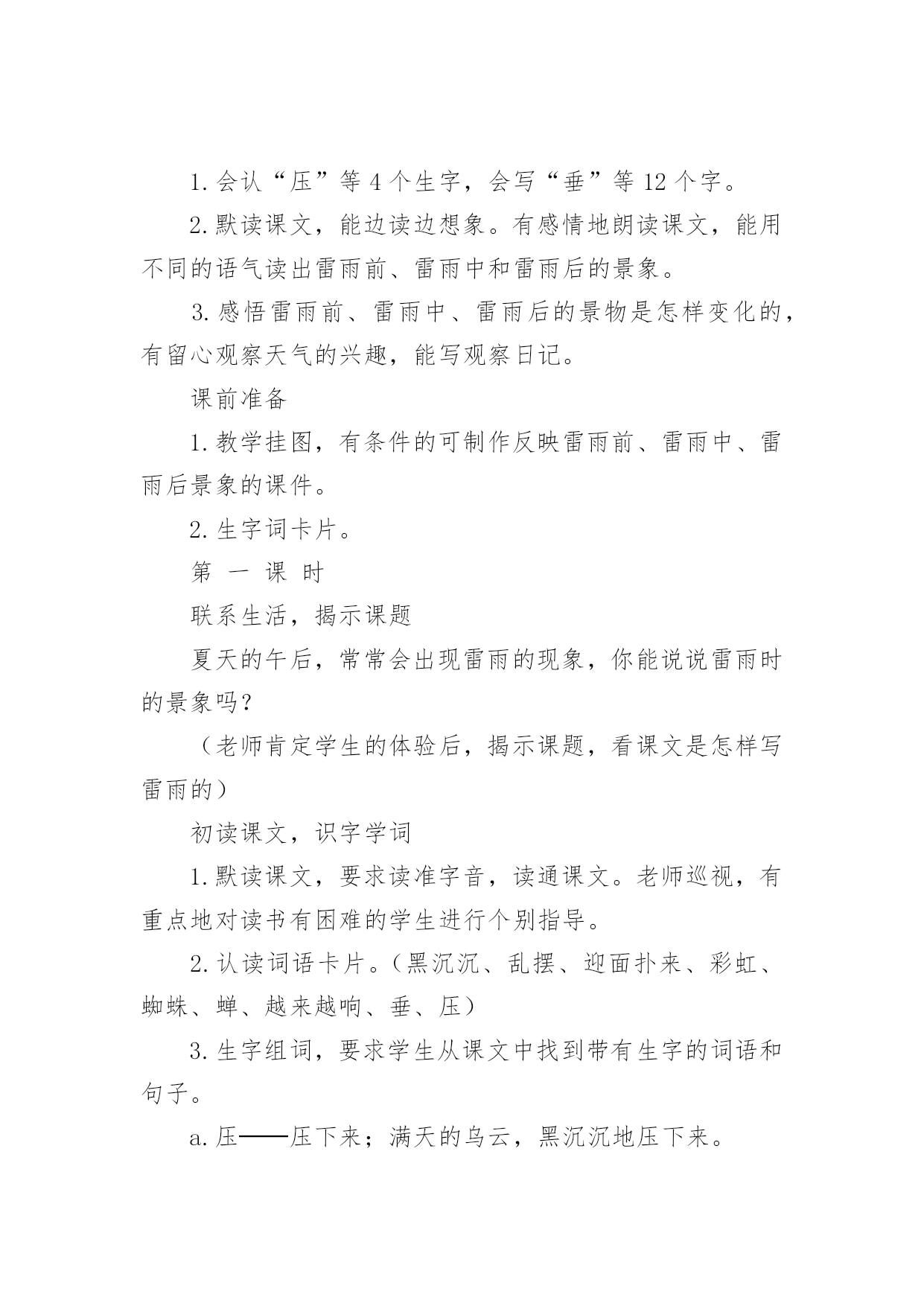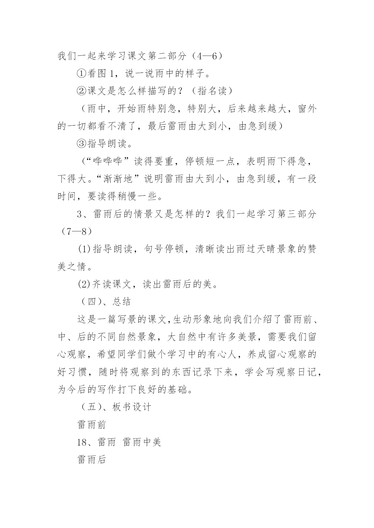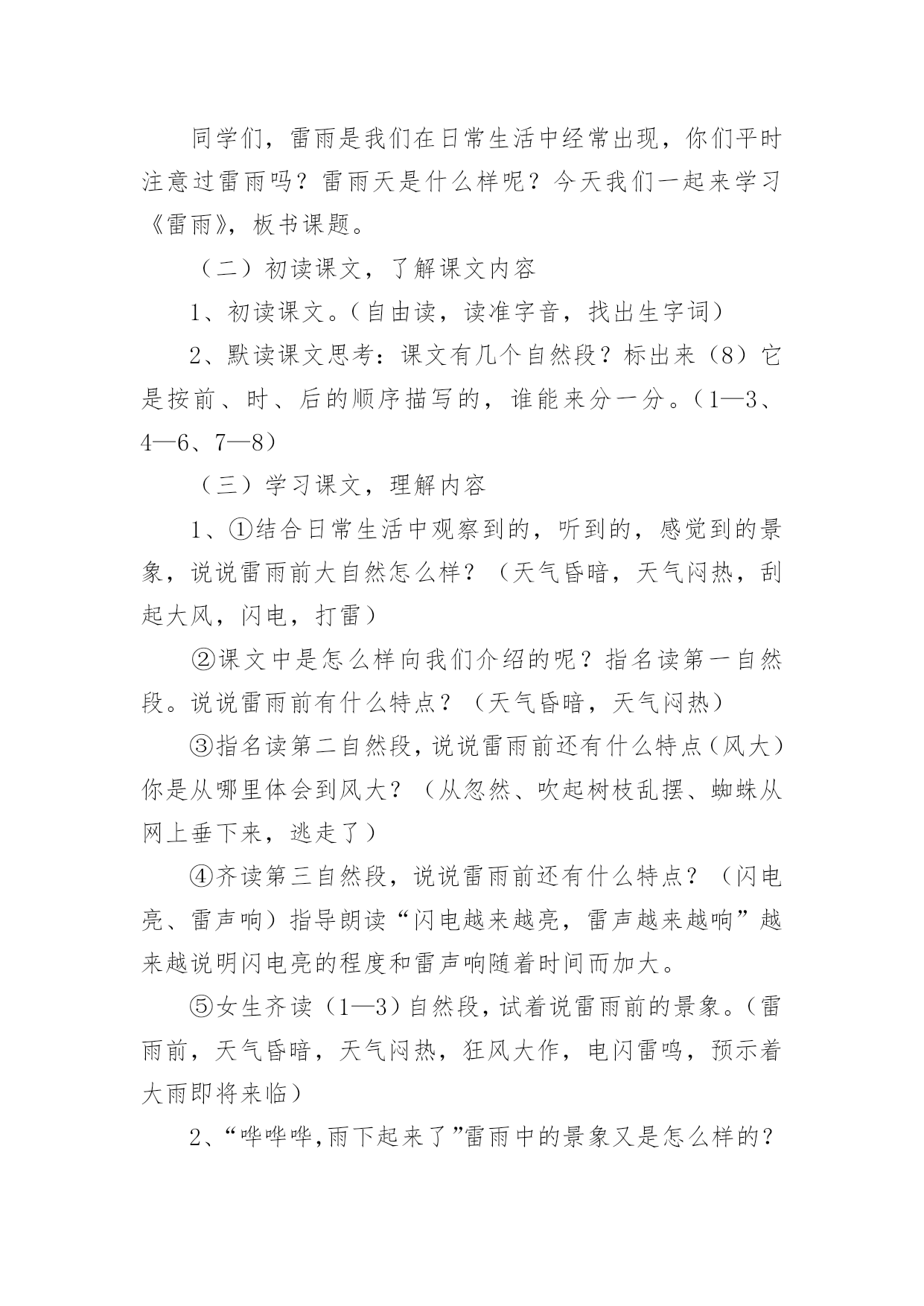 雷雨教学设计作为一名默默奉献的教育工作者,可能需要进行教学设计编写工作,教学设计是连接基础理论与实践的桥梁,对于教学理论与实践的紧密结合具有沟通作用。我们该怎么去写教学设计呢?下面是小编为大家收集的雷雨教学设计,仅供参考,欢迎大家阅读。雷雨教学设计1一、教学要求:1、默读课文,能边读边想象,有感情地朗读课文,通过声音表现雷雨前后的不同景象。2、会认本课生字,会写本课生字。3、有留心观察天气的兴趣,能写观察日记。二、教学重难点:1、学习生字、新词,初步认识雷雨前、雷雨中、雷雨后景象变化的特点。2、有感情地朗读课文。3、能按一定顺序观察图画,培养观察能力,有留心观察天气的兴趣,能写观察日记。三、课前准备:生字、词语卡片,本课插图。四、教学过程:(一)导入同学们,雷雨是我们在日常生活中经常出现,你们平时注意过雷雨吗?雷雨天是什么样呢?今天我们一起来学习《雷雨》,板书课题。(二)初读课文,了解课文内容1、初读课文。(自由读,读准字音,找出生字词)2、默读课文思考:课文有几个自然段?标出来(8)它是按前、时、后的顺序描写的,谁能来分一分。(1—3、4—6、7—8)(三)学习课文,理解内容1、①结合日常生活中观察到的,听到的,感觉到的景象,说说雷雨前大自然怎么样?(天气昏暗,天气闷热,刮起大风,闪电,打雷)②课文中是怎么样向我们介绍的呢?指名读第一自然段。说说雷雨前有什么特点?(天气昏暗,天气闷热)③指名读第二自然段,说说雷雨前还有什么特点(风大)你是从哪里体会到风大?(从忽然、吹起树枝乱摆、蜘蛛从网上垂下来,逃走了)④齐读第三自然段,说说雷雨前还有什么特点?(闪电亮、雷声响)指导朗读“闪电越来越亮,雷声越来越响”越来越说明闪电亮的程度和雷声响随着时间而加大。⑤女生齐读(1—3)自然段,试着说雷雨前的景象。(雷雨前,天气昏暗,天气闷热,狂风大作,电闪雷鸣,预示着大雨即将来临)2、“哗哗哗,雨下起来了”雷雨中的景象又是怎么样的?我们一起来学习课文第二部分(4—6)①看图1,说一说雨中的样子。②课文是怎么样描写的?(指名读)(雨中,开始雨特别急,特别大,后来越来越大,窗外的一切都看不清了,最后雷雨由大到小,由急到缓)③指导朗读。(“哗哗哗”读得要重,停顿短一点,表明雨下得急,下得大。“渐渐地”说明雷雨由大到小,由急到缓,有一段时间,要读得稍慢一些。3、雷雨后的情景又是怎样的?我们一起学习第三部分(7—8)(1)指导朗读,句号停顿,清晰读出雨过天晴景象的赞美之情。(2)齐读课文,读出雷雨后的美。(四)、总结这是一篇写景的课文,生动形象地向我们介绍了雷雨前、中、后的不同自然景象,大自然中有许多美景,需要我们留心观察,希望同学们做个学习中的有心人,养成留心观察的好习惯,随时将观察到的东西记录下来,学会写观察日记,为今后的写作打下良好的基础。(五)、板书设计雷雨前18、雷雨雷雨中美雷雨后18.《雷雨》课后反思王玉兰一、说教材《雷雨》是二年级下册第五组“走进大自然”中的一篇课文。《雷雨》这篇课文用精炼的文字,为我们描绘了雷雨前、雷雨中、雷雨后的自然景象,语言生动优美,内容条理清晰,插图形象生动,学生在看插图读文字的过程中把看图与读文有机结合起来去感受,雷雨前、雷雨中和雷雨后的不同特点,激发学生的学习兴趣和观察自然现象的欲望。二、说教学目标1.会认“压”等4个生字。2.默读课文,能边读边想象。有感情地朗读课文,能用不同的.语气读出雷雨前、雷雨中和雷雨后的景象。3.感悟雷雨前、雷雨中、雷雨后的景物是怎样变化的,有留心观察天气的兴趣。三、教学重难点1.培养观察力和想象力,养成留心观察事物的习惯。2.弄清雷雨前、雷雨中、雷雨后自然现象的变化顺序。3.了解雷雨的特征。四、说教法、学法1、我运用“先学后教”的方法让学生自主学习,通过联系自己的生活实际,用自己的语言雷雨的不同景象,在学习过程中,启发学生选择自己喜欢的方式,读文充分体现学生的自主性,把学习的主动权还给学生。2、运用朗读教学法,让学生在朗读中感悟,在教学本文时,紧扣重点和难点,发挥学生的想象,指导学生朗读课文,在朗读中,理解感悟课文。享受雷雨为我们的生活增添的乐趣。五、说教学过程我在教学课文的过程中,通过对字、词的复习让学生进一步的掌握了生字。在本课中利用问题来贯穿全文的教学,在解决问题的过程中让学生领悟课文。利用有感情的朗读课文来让学生进一步体会到雷雨前、雷雨中、雷雨后的变化过程。总结在组织教学上还欠缺,对于这点,在今后的教学中,我将加以改进。还在整个教学过程中存在许多问题,望各位老师给于宝贵的建议,在以后的教学中不断改进。雷雨教学设计21、课前布置学生预习。1、要求学生分角2、展示学习色朗读。2、给学目标。生展示目标并提1、熟悉戏剧故事情节。1、学生分角色朗2、让学生了解和记住学读,体会角色情习
