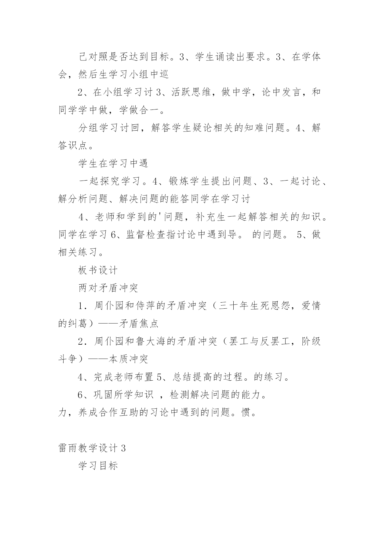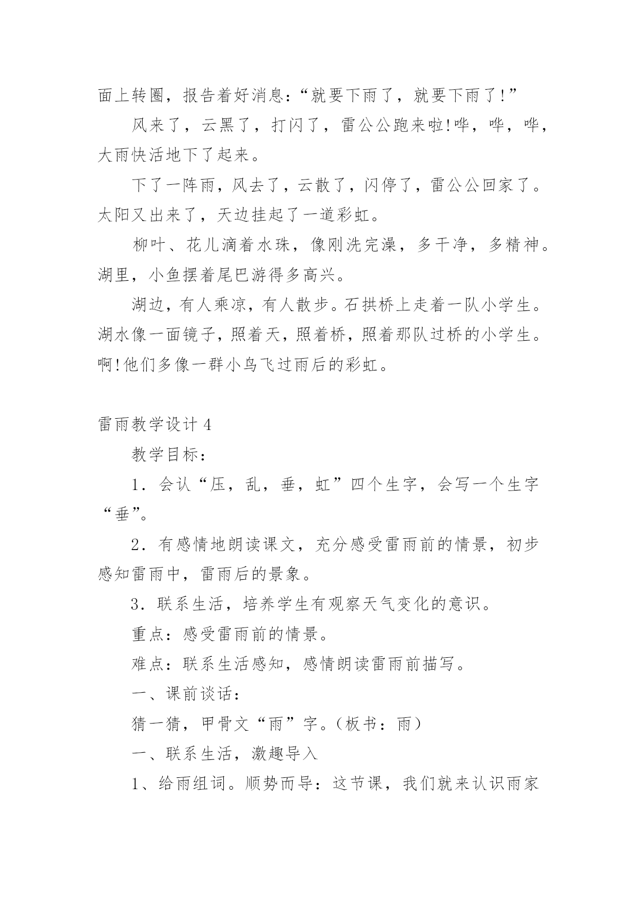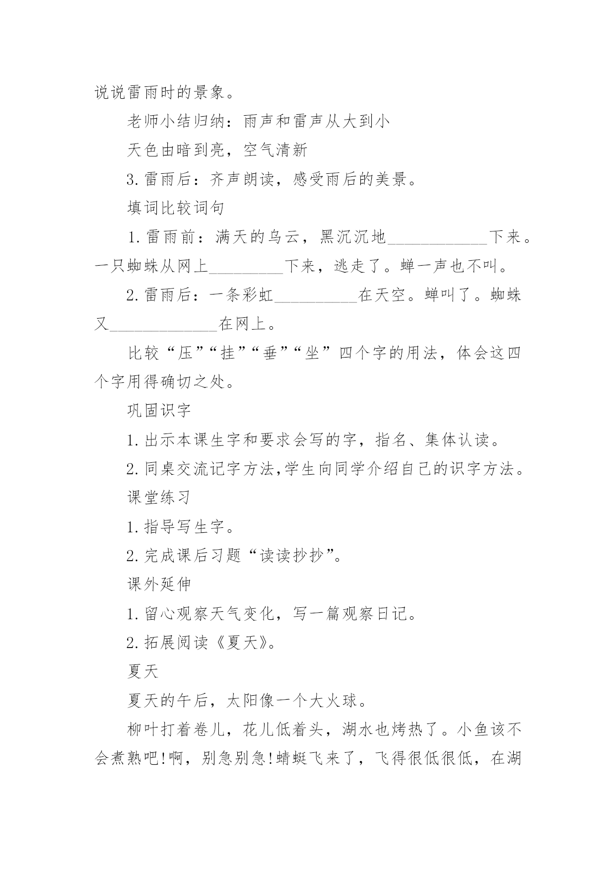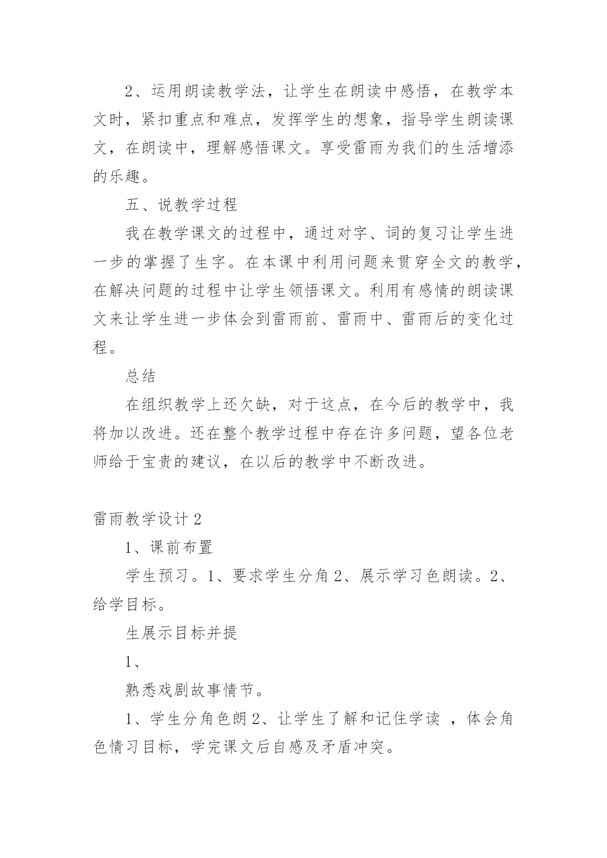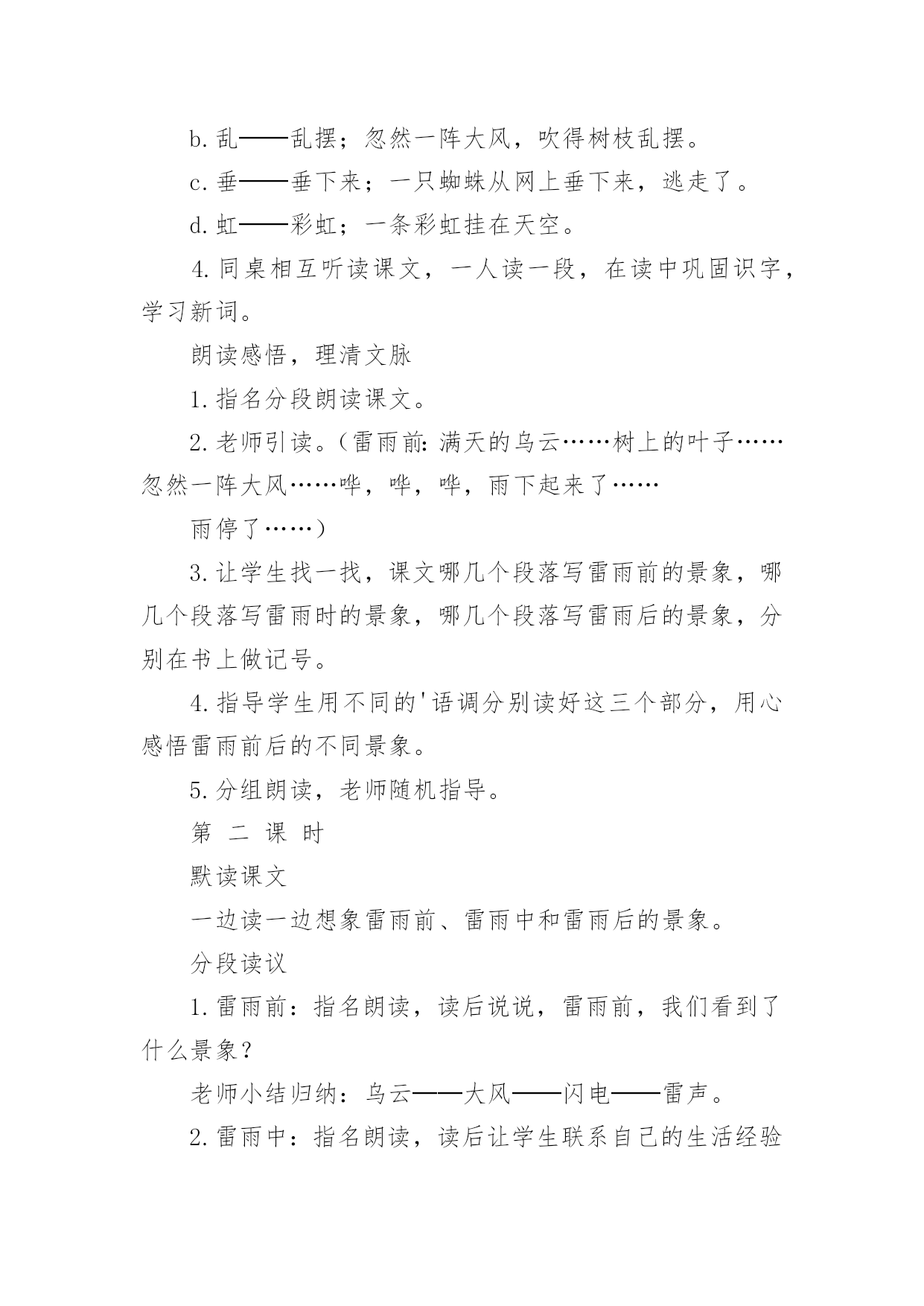 雷雨教学设计作为一名默默奉献的教育工作者,可能需要进行教学设计编写工作,教学设计是连接基础理论与实践的桥梁,对于教学理论与实践的紧密结合具有沟通作用。我们该怎么去写教学设计呢?下面是小编为大家收集的雷雨教学设计,仅供参考,欢迎大家阅读。雷雨教学设计1一、教学要求:1、默读课文,能边读边想象,有感情地朗读课文,通过声音表现雷雨前后的不同景象。2、会认本课生字,会写本课生字。3、有留心观察天气的兴趣,能写观察日记。二、教学重难点:1、学习生字、新词,初步认识雷雨前、雷雨中、雷雨后景象变化的特点。2、有感情地朗读课文。3、能按一定顺序观察图画,培养观察能力,有留心观察天气的兴趣,能写观察日记。三、课前准备:生字、词语卡片,本课插图。四、教学过程:(一)导入同学们,雷雨是我们在日常生活中经常出现,你们平时注意过雷雨吗?雷雨天是什么样呢?今天我们一起来学习《雷雨》,板书课题。(二)初读课文,了解课文内容1、初读课文。(自由读,读准字音,找出生字词)2、默读课文思考:课文有几个自然段?标出来(8)它是按前、时、后的顺序描写的,谁能来分一分。(1—3、4—6、7—8)(三)学习课文,理解内容1、①结合日常生活中观察到的,听到的,感觉到的景象,说说雷雨前大自然怎么样?(天气昏暗,天气闷热,刮起大风,闪电,打雷)②课文中是怎么样向我们介绍的呢?指名读第一自然段。说说雷雨前有什么特点?(天气昏暗,天气闷热)③指名读第二自然段,说说雷雨前还有什么特点(风大)你是从哪里体会到风大?(从忽然、吹起树枝乱摆、蜘蛛从网上垂下来,逃走了)④齐读第三自然段,说说雷雨前还有什么特点?(闪电亮、雷声响)指导朗读“闪电越来越亮,雷声越来越响”越来越说明闪电亮的程度和雷声响随着时间而加大。⑤女生齐读(1—3)自然段,试着说雷雨前的景象。(雷雨前,天气昏暗,天气闷热,狂风大作,电闪雷鸣,预示着大雨即将来临)2、“哗哗哗,雨下起来了”雷雨中的景象又是怎么样的?我们一起来学习课文第二部分(4—6)①看图1,说一说雨中的样子。②课文是怎么样描写的?(指名读)(雨中,开始雨特别急,特别大,后来越来越大,窗外的一切都看不清了,最后雷雨由大到小,由急到缓)③指导朗读。(“哗哗哗”读得要重,停顿短一点,表明雨下得急,下得大。“渐渐地”说明雷雨由大到小,由急到缓,有一段时间,要读得稍慢一些。3、雷雨后的情景又是怎样的?我们一起学习第三部分(7—8)(1)指导朗读,句号停顿,清晰读出雨过天晴景象的赞美之情。(2)齐读课文,读出雷雨后的美。(四)、总结这是一篇写景的课文,生动形象地向我们介绍了雷雨前、中、后的不同自然景象,大自然中有许多美景,需要我们留心观察,希望同学们做个学习中的有心人,养成留心观察的好习惯,随时将观察到的东西记录下来,学会写观察日记,为今后的写作打下良好的基础。(五)、板书设计雷雨前18、雷雨雷雨中美雷雨后18.《雷雨》课后反思王玉兰一、说教材《雷雨》是二年级下册第五组“走进大自然”中的一篇课文。《雷雨》这篇课文用精炼的文字,为我们描绘了雷雨前、雷雨中、雷雨后的自然景象,语言生动优美,内容条理清晰,插图形象生动,学生在看插图读文字的过程中把看图与读文有机结合起来去感受,雷雨前、雷雨中和雷雨后的不同特点,激发学生的学习兴趣和观察自然现象的欲望。二、说教学目标1.会认“压”等4个生字。2.默读课文,能边读边想象。有感情地朗读课文,能用不同的.语气读出雷雨前、雷雨中和雷雨后的景象。3.感悟雷雨前、雷雨中、雷雨后的景物是怎样变化的,有留心观察天气的兴趣。三、教学重难点1.培养观察力和想象力,养成留心观察事物的习惯。2.弄清雷雨前、雷雨中、雷雨后自然现象的变化顺序。3.了解雷雨的特征。四、说教法、学法1、我运用“先学后教”的方法让学生自主学习,通过联系自己的生活实际,用自己的语言雷雨的不同景象,在学习过程中,启发学生选择自己喜欢的方式,读文充分体现学生的自主性,把学习的主动权还给学生。2、运用朗读教学法,让学生在朗读中感悟,在教学本文时,紧扣重点和难点,发挥学生的想象,指导学生朗读课文,在朗读中,理解感悟课文。享受雷雨为我们的生活增添的乐趣。五、说教学过程我在教学课文的过程中,通过对字、词的复习让学生进一步的掌握了生字。在本课中利用问题来贯穿全文的教学,在解决问题的过程中让学生领悟课文。利用有感情的朗读课文来让学生进一步体会到雷雨前、雷雨中、雷雨后的变化过程。总结在组织教学上还欠缺,对于这点,在今后的教学中,我将加以改进。还在整个教学过程中存在许多问题,望各位老师给于宝贵的建议,在以后的教学中不断改进。雷雨教学设计21、课前布置学生预习。1、要求学生分角2、展示学习色朗读。2、给学目标。生展示目标并提1、熟悉戏剧故事情节。1、学生分角色朗2、让学生了解和记住学读,体会角色情习