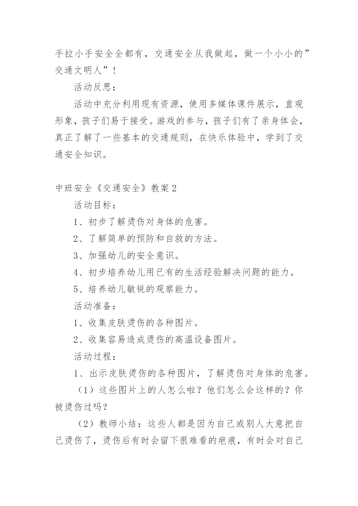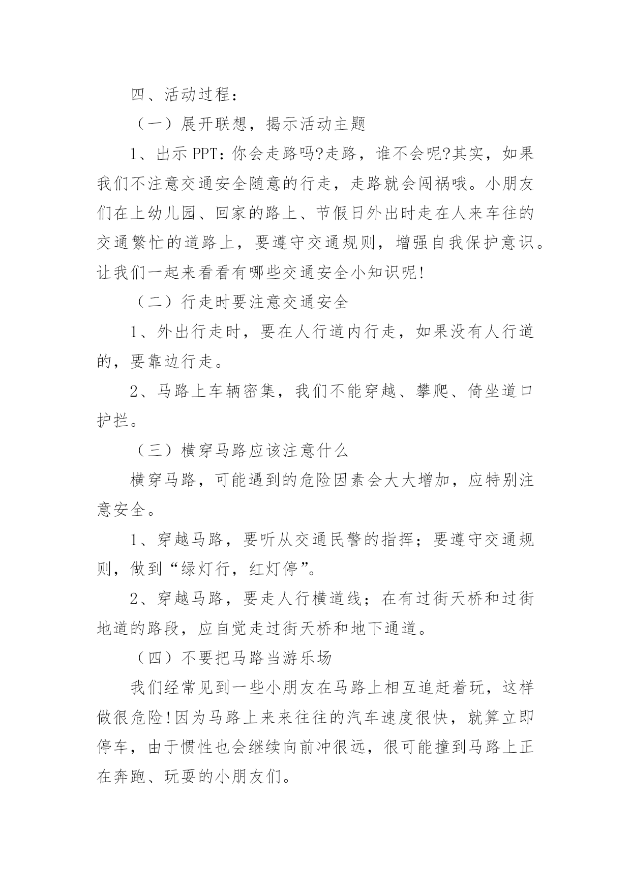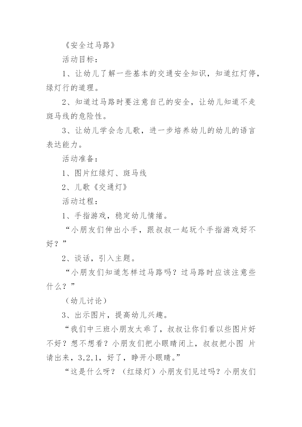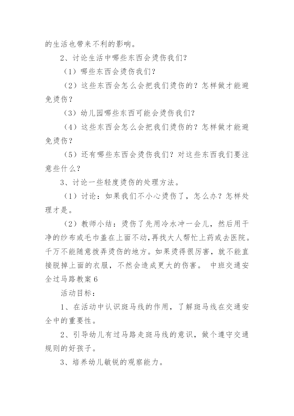 中班安全《交通安全》教案在教学工作者开展教学活动前,常常需要准备教案,借助教案可以恰当地选择和运用教学方法,调动学生学习的积极性。那么问题来了,教案应该怎么写?下面是小编为大家整理的中班安全《交通安全》教案,欢迎阅读与收藏。中班安全《交通安全》教案1一、设计意图:中班年龄阶段的幼儿,具有活泼好动、好奇、模仿力强等特点,是最容易引发交通事故的群体。虽然他们出去一般都有成人监护,但稍有不慎,就会严重影响幼儿的身心健康甚至酿成悲剧,独自穿越马路,独自活动的机会增多了。通过此次活动,让幼儿了解交通信号灯及安全标志与人们生活的密切关系。初步养成自觉遵守交通规则的意识,提高自我安全防护能力。二、活动目标:1、认识信号等标识了解基本的交通规则。2、在游戏活动中体验交通规则的重要性,养成自觉遵守交通规则的意识,提高自我安全防护能力。3、初步培养幼儿的安全意识,提高自我保护能力。4、考验小朋友们的反应能力,锻炼他们的个人能力。三、活动准备:PPT《交通安全伴我行》四、活动过程:(一)展开联想,揭示活动主题1、出示PPT:你会走路吗?走路,谁不会呢?其实,如果我们不注意交通安全随意的行走,走路就会闯祸哦。小朋友们在上幼儿园、回家的路上、节假日外出时走在人来车往的交通繁忙的道路上,要遵守交通规则,增强自我保护意识。让我们一起来看看有哪些交通安全小知识呢!(二)行走时要注意交通安全1、外出行走时,要在人行道内行走,如果没有人行道的,要靠边行走。2、马路上车辆密集,我们不能穿越、攀爬、倚坐道口护拦。(三)横穿马路应该注意什么横穿马路,可能遇到的危险因素会大大增加,应特别注意安全。1、穿越马路,要听从交通民警的指挥;要遵守交通规则,做到“绿灯行,红灯停”。2、穿越马路,要走人行横道线;在有过街天桥和过街地道的路段,应自觉走过街天桥和地下通道。(四)不要把马路当游乐场我们经常见到一些小朋友在马路上相互追赶着玩,这样做很危险!因为马路上来来往往的汽车速度很快,就算立即停车,由于惯性也会继续向前冲很远,很可能撞到马路上正在奔跑、玩耍的小朋友们。提示:小朋友们千万不要在马路上追逐、踢球、滑旱冰,横冲直撞!(五)乘车怎样注意交通安全1、乘坐公共汽车:排队上车,先下后上,做懂事的小孩;在车子里,不要把头手伸出窗外,这样容易被别的车刮伤;不要坐在开动的车上看书;没有座位时,要拉好身边的`扶手;不得向车内外乱扔东西;不要在开动的车厢里乱跑,容易摔跤;车里不要吃东西,尤其是冰棒和串烧。2、乘坐出租车:不要冲到马路当中去拦车,在路边招手司机叔叔也能看见;下车时要从右边下车,注意后面的车辆和行人;下车前看看坐椅上有没有东西,不要把东西忘在出租车上了;如果下车要穿过马路,走到出租车后面比前面更安全。3、乘坐父母开的车:不要提问题和唱歌,不要去开车门,乖乖地在后排坐好,系好安全带,父母就可以安心地开车了;如果坐前排,不要扳动方向盘、排档杆,很容易造成事故;更不能在车厢里放带尖角的玩具,容易造成伤害。(六)不要扒车、追车、抛物击车不要因为好玩,就去追赶行驶中的车辆,要是撞上行人、电线杆或电话亭等物体,会伤的不轻。如果扒着车,跟着车跑,车辆突然停下来,还有可能直接被车辆撞倒。另外,汽车在高速行驶时,撞上飞来的物体,冲击力非常大,往往会造成非常可怕的后果。总结:小朋友们,希望大家认真学习交通安全知识,大手拉小手安全全都有,交通安全从我做起,做一个小小的”交通文明人”!活动反思:活动中充分利用现有资源,使用多媒体课件展示,直观形象,孩子们易于接受。游戏的参与,孩子们有了亲身体会,真正了解了一些基本的交通规则,在快乐体验中,学到了交通安全知识。中班安全《交通安全》教案2活动目标:1、初步了解烫伤对身体的危害。2、了解简单的预防和自救的方法。3、加强幼儿的安全意识。4、初步培养幼儿用已有的生活经验解决问题的能力。5、培养幼儿敏锐的观察能力。活动准备:1、收集皮肤烫伤的各种图片。2、收集容易造成烫伤的高温设备图片。活动过程:1、出示皮肤烫伤的各种图片,了解烫伤对身体的危害。(1)这些图片上的人怎么啦?他们怎么会这样的?你被烫伤过吗?(2)教师小结:这些人都是因为自己或别人大意把自己烫伤了,烫伤后有时会留下很难看的疤痕,有时会对自己的生活也带来不利的影响。2、讨论生活中哪些东西会烫伤我们?(1)哪些东西会烫伤我们?(2)这些东西会怎么会把我们烫伤的?怎样做才能避免烫伤?(3)幼儿园哪些东西可能会烫伤我们?(4)这些东西会怎么会把我们烫伤的?怎样做才能避免烫伤?(5)还有哪些东西会烫伤我们?对这些东西我们要注意些什么?3、讨论一些轻度烫伤的处理方法。(1)讨论:如果我们不小心烫伤了,怎么办?怎样处理才是。(2)教师小结:烫伤了先用冷水冲一会儿,然后用干净的纱布或毛巾盖在上面不动,再找大人帮忙上
