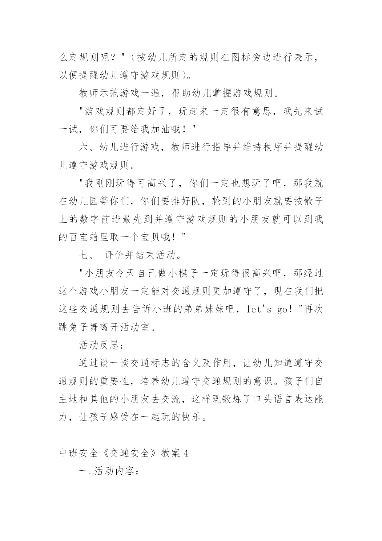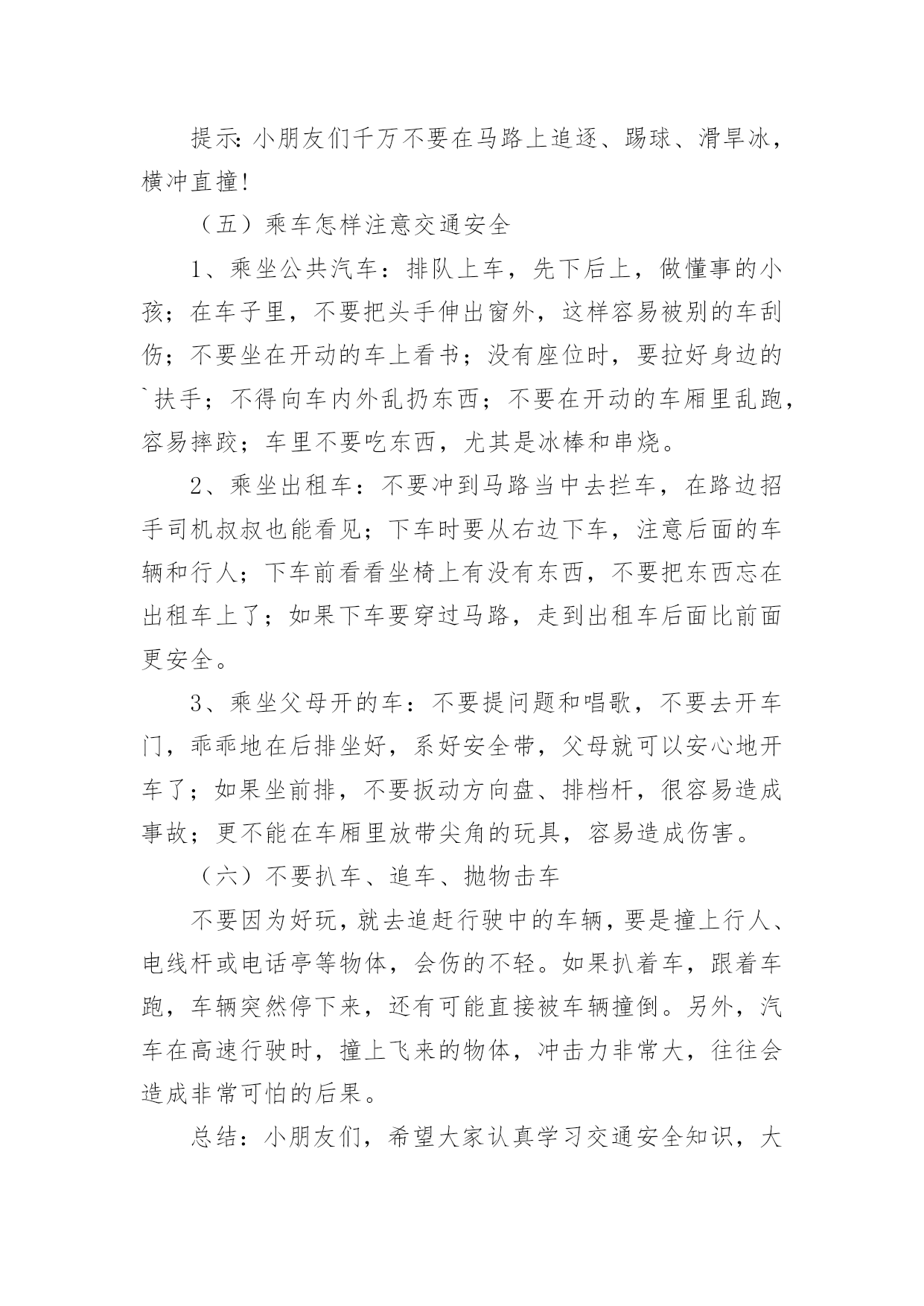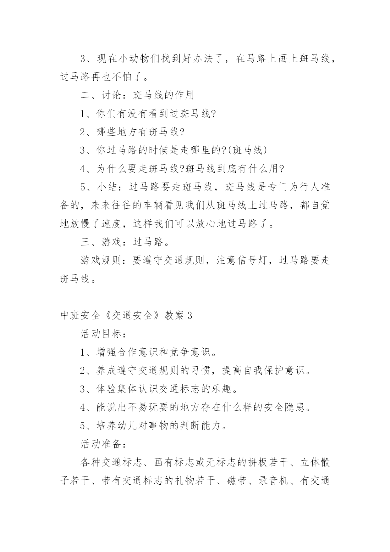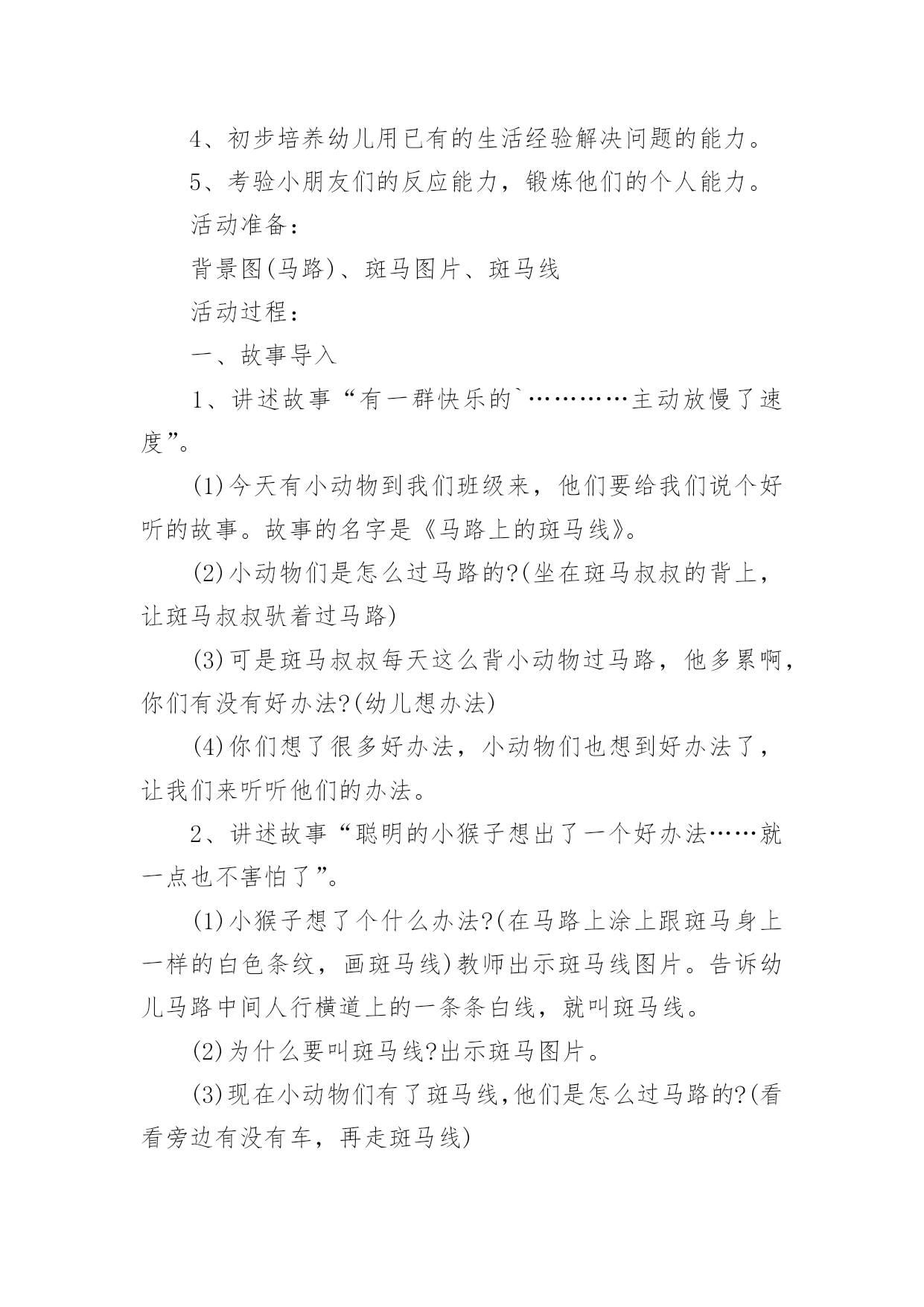 中班安全《交通安全》教案在教学工作者开展教学活动前,常常需要准备教案,借助教案可以恰当地选择和运用教学方法,调动学生学习的积极性。那么问题来了,教案应该怎么写?下面是小编为大家整理的中班安全《交通安全》教案,欢迎阅读与收藏。中班安全《交通安全》教案1一、设计意图:中班年龄阶段的幼儿,具有活泼好动、好奇、模仿力强等特点,是最容易引发交通事故的群体。虽然他们出去一般都有成人监护,但稍有不慎,就会严重影响幼儿的身心健康甚至酿成悲剧,独自穿越马路,独自活动的机会增多了。通过此次活动,让幼儿了解交通信号灯及安全标志与人们生活的密切关系。初步养成自觉遵守交通规则的意识,提高自我安全防护能力。二、活动目标:1、认识信号等标识了解基本的交通规则。2、在游戏活动中体验交通规则的重要性,养成自觉遵守交通规则的意识,提高自我安全防护能力。3、初步培养幼儿的安全意识,提高自我保护能力。4、考验小朋友们的反应能力,锻炼他们的个人能力。三、活动准备:PPT《交通安全伴我行》四、活动过程:(一)展开联想,揭示活动主题1、出示PPT:你会走路吗?走路,谁不会呢?其实,如果我们不注意交通安全随意的行走,走路就会闯祸哦。小朋友们在上幼儿园、回家的路上、节假日外出时走在人来车往的交通繁忙的道路上,要遵守交通规则,增强自我保护意识。让我们一起来看看有哪些交通安全小知识呢!(二)行走时要注意交通安全1、外出行走时,要在人行道内行走,如果没有人行道的,要靠边行走。2、马路上车辆密集,我们不能穿越、攀爬、倚坐道口护拦。(三)横穿马路应该注意什么横穿马路,可能遇到的危险因素会大大增加,应特别注意安全。1、穿越马路,要听从交通民警的指挥;要遵守交通规则,做到“绿灯行,红灯停”。2、穿越马路,要走人行横道线;在有过街天桥和过街地道的路段,应自觉走过街天桥和地下通道。(四)不要把马路当游乐场我们经常见到一些小朋友在马路上相互追赶着玩,这样做很危险!因为马路上来来往往的汽车速度很快,就算立即停车,由于惯性也会继续向前冲很远,很可能撞到马路上正在奔跑、玩耍的小朋友们。提示:小朋友们千万不要在马路上追逐、踢球、滑旱冰,横冲直撞!(五)乘车怎样注意交通安全1、乘坐公共汽车:排队上车,先下后上,做懂事的小孩;在车子里,不要把头手伸出窗外,这样容易被别的车刮伤;不要坐在开动的车上看书;没有座位时,要拉好身边的`扶手;不得向车内外乱扔东西;不要在开动的车厢里乱跑,容易摔跤;车里不要吃东西,尤其是冰棒和串烧。2、乘坐出租车:不要冲到马路当中去拦车,在路边招手司机叔叔也能看见;下车时要从右边下车,注意后面的车辆和行人;下车前看看坐椅上有没有东西,不要把东西忘在出租车上了;如果下车要穿过马路,走到出租车后面比前面更安全。3、乘坐父母开的车:不要提问题和唱歌,不要去开车门,乖乖地在后排坐好,系好安全带,父母就可以安心地开车了;如果坐前排,不要扳动方向盘、排档杆,很容易造成事故;更不能在车厢里放带尖角的玩具,容易造成伤害。(六)不要扒车、追车、抛物击车不要因为好玩,就去追赶行驶中的车辆,要是撞上行人、电线杆或电话亭等物体,会伤的不轻。如果扒着车,跟着车跑,车辆突然停下来,还有可能直接被车辆撞倒。另外,汽车在高速行驶时,撞上飞来的物体,冲击力非常大,往往会造成非常可怕的后果。总结:小朋友们,希望大家认真学习交通安全知识,大手拉小手安全全都有,交通安全从我做起,做一个小小的”交通文明人”!活动反思:活动中充分利用现有资源,使用多媒体课件展示,直观形象,孩子们易于接受。游戏的参与,孩子们有了亲身体会,真正了解了一些基本的交通规则,在快乐体验中,学到了交通安全知识。中班安全《交通安全》教案2活动目标:1、初步了解烫伤对身体的危害。2、了解简单的预防和自救的方法。3、加强幼儿的安全意识。4、初步培养幼儿用已有的生活经验解决问题的能力。5、培养幼儿敏锐的观察能力。活动准备:1、收集皮肤烫伤的各种图片。2、收集容易造成烫伤的高温设备图片。活动过程:1、出示皮肤烫伤的各种图片,了解烫伤对身体的危害。(1)这些图片上的人怎么啦?他们怎么会这样的?你被烫伤过吗?(2)教师小结:这些人都是因为自己或别人大意把自己烫伤了,烫伤后有时会留下很难看的疤痕,有时会对自己的生活也带来不利的影响。2、讨论生活中哪些东西会烫伤我们?(1)哪些东西会烫伤我们?(2)这些东西会怎么会把我们烫伤的?怎样做才能避免烫伤?(3)幼儿园哪些东西可能会烫伤我们?(4)这些东西会怎么会把我们烫伤的?怎样做才能避免烫伤?(5)还有哪些东西会烫伤我们?对这些东西我们要注意些什么?3、讨论一些轻度烫伤的处理方法。(1)讨论:如果我们不小心烫伤了,怎么办?怎样处理才是。(2)教师小结:烫伤了先用冷水冲一会儿,然后用干净的纱布或毛巾盖在上面不动,再找大人帮忙上