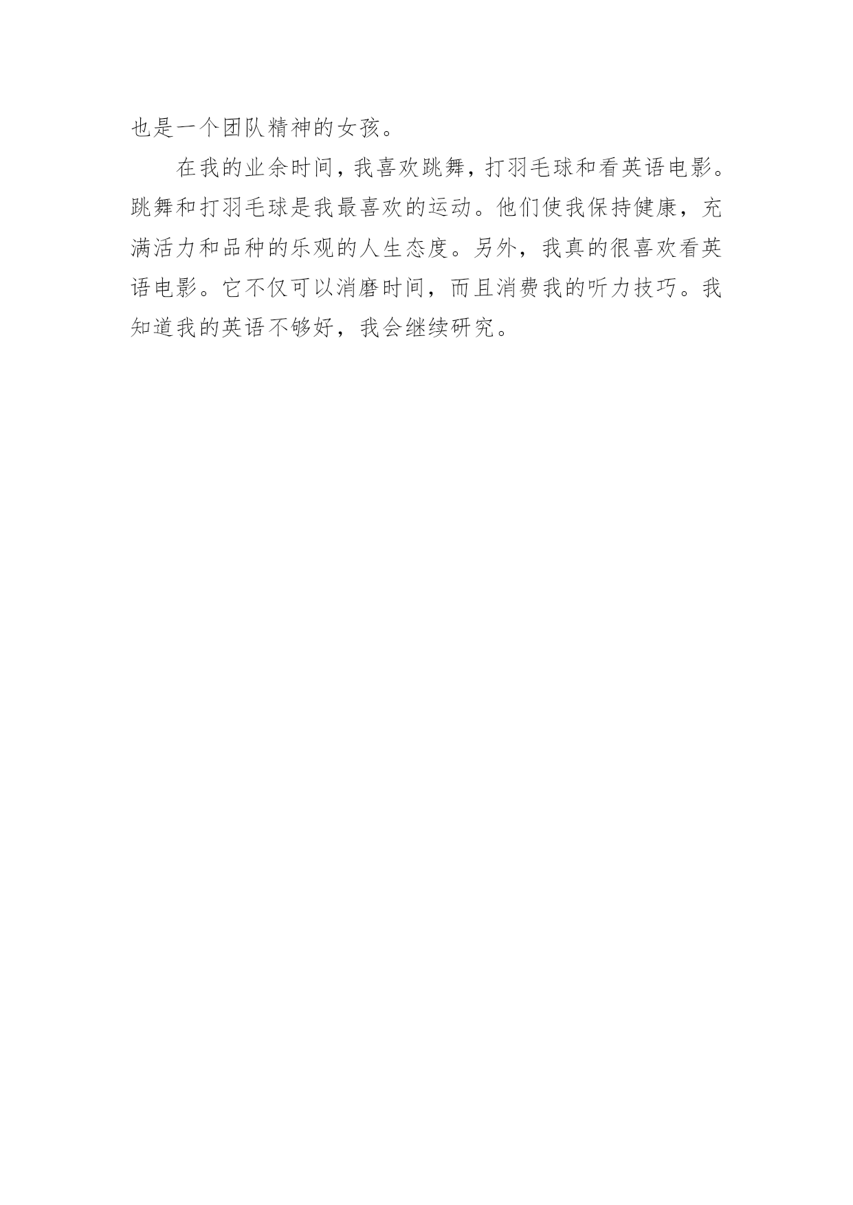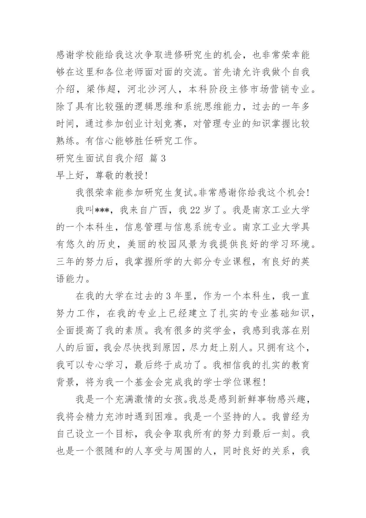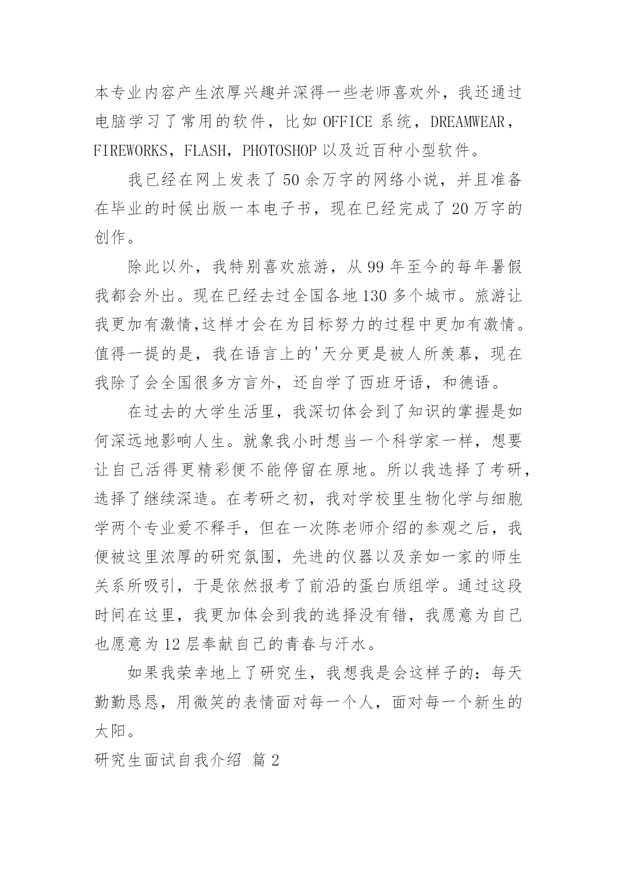 研究生面试自我介绍【精品】研究生面试自我介绍3篇当碰到陌生人时候,通常需要我们进行自我介绍,自我介绍是一种认识自我的手段。那么自我介绍要注意有什么内容呢?以下是小编精心整理的研究生面试自我介绍4篇,仅供参考,大家一起来看看吧。研究生面试自我介绍篇1早上好,各位尊敬的老师,我很荣幸今天有这样面试的机会。我可以介绍自己了吗?我叫xxx,今年22岁,是这所大学的xx,在今年考研的时候我报选了李铮老师的蛋白质组学。现在我在12层上完成本科毕业论文。论文内容关于建立双向电泳技术,恰好是蛋白质组学研究的基础工作。下面我来简单自我介绍下我自己。我从小就特别喜欢生物,并立志当一个生物学家。现在家里还有两阳台的花草鱼虫,书柜中更是摆满了生物类书籍。我还曾经在奥林匹克生物竞赛上获得全国第三名。我在这个城市中长大,在家庭的熏陶下涉猎群书,学习自己喜欢的东西。忘我的程度总是让我喜欢专注于一件事情,不达目的誓不摆休。如果日后荣幸和老师们一起共事,你们便可以从我以前的生活中略见一斑。我的性格十分随和,好交朋友。别人对我的评价是:和我在一起十分快乐。我的兴趣非常广泛,在大学期间除了对本专业内容产生浓厚兴趣并深得一些老师喜欢外,我还通过电脑学习了常用的软件,比如OFFICE系统,DREAMWEAR,FIREWORKS,FLASH,PHOTOSHOP以及近百种小型软件。我已经在网上发表了50余万字的网络小说,并且准备在毕业的时候出版一本电子书,现在已经完成了20万字的创作。除此以外,我特别喜欢旅游,从99年至今的每年暑假我都会外出。现在已经去过全国各地130多个城市。旅游让我更加有激情,这样才会在为目标努力的过程中更加有激情。值得一提的是,我在语言上的'天分更是被人所羡慕,现在我除了会全国很多方言外,还自学了西班牙语,和德语。在过去的大学生活里,我深切体会到了知识的掌握是如何深远地影响人生。就象我小时想当一个科学家一样,想要让自己活得更精彩便不能停留在原地。所以我选择了考研,选择了继续深造。在考研之初,我对学校里生物化学与细胞学两个专业爱不释手,但在一次陈老师介绍的参观之后,我便被这里浓厚的研究氛围,先进的仪器以及亲如一家的师生关系所吸引,于是依然报考了前沿的蛋白质组学。通过这段时间在这里,我更加体会到我的选择没有错,我愿意为自己也愿意为12层奉献自己的青春与汗水。如果我荣幸地上了研究生,我想我是会这样子的:每天勤勤恳恳,用微笑的表情面对每一个人,面对每一个新生的太阳。研究生面试自我介绍篇2感谢学校能给我这次争取进修研究生的机会,也非常荣幸能够在这里和各位老师面对面的交流。首先请允许我做个自我介绍,梁伟超,河北沙河人,本科阶段主修市场营销专业。除了具有比较强的逻辑思维和系统思维能力,过去的一年多时间,通过参加创业计划竞赛,对管理专业的知识掌握比较熟练。有信心能够胜任研究工作。研究生面试自我介绍篇3早上好,尊敬的教授!我很荣幸能参加研究生复试。非常感谢你给我这个机会!我叫***,我来自广西,我22岁了。我是南京工业大学的一个本科生,信息管理与信息系统专业。南京工业大学具有悠久的历史,美丽的校园风景为我提供良好的学习环境。三年的努力后,我掌握所学的大部分专业课程,有良好的英语能力。在我的大学在过去的3年里,作为一个本科生,我一直努力工作,在我的专业上已经建立了扎实的专业基础知识,全面提高了我的素质。我有很多的奖学金,我感到我落在别人的后面,我会尽快找到原因,尽力赶上别人。只拥有这个,我可以专心学习,最后终于成功了。我相信我的扎实的教育背景,将为我一个基金会完成我的学士学位课程!我是一个充满激情的女孩。我总是感到新鲜事物感兴趣,我将会精力充沛时遇到困难。我是一个坚持的人。我曾经为自己设立一个目标,我会争取我所有的努力到最后一刻。我也是一个很随和的人享受与周围的人,同时良好的关系,我也是一个团队精神的女孩。在我的业余时间,我喜欢跳舞,打羽毛球和看英语电影。跳舞和打羽毛球是我最喜欢的运动。他们使我保持健康,充满活力和品种的乐观的人生态度。另外,我真的很喜欢看英语电影。它不仅可以消磨时间,而且消费我的听力技巧。我知道我的英语不够好,我会继续研究。