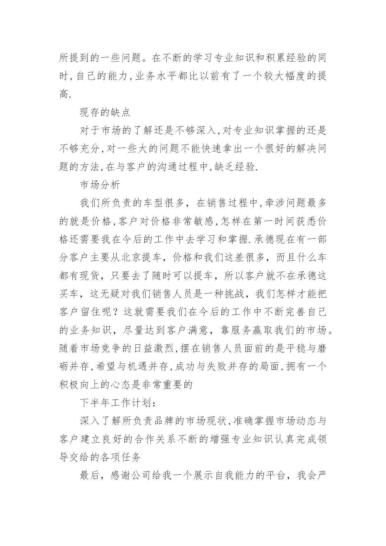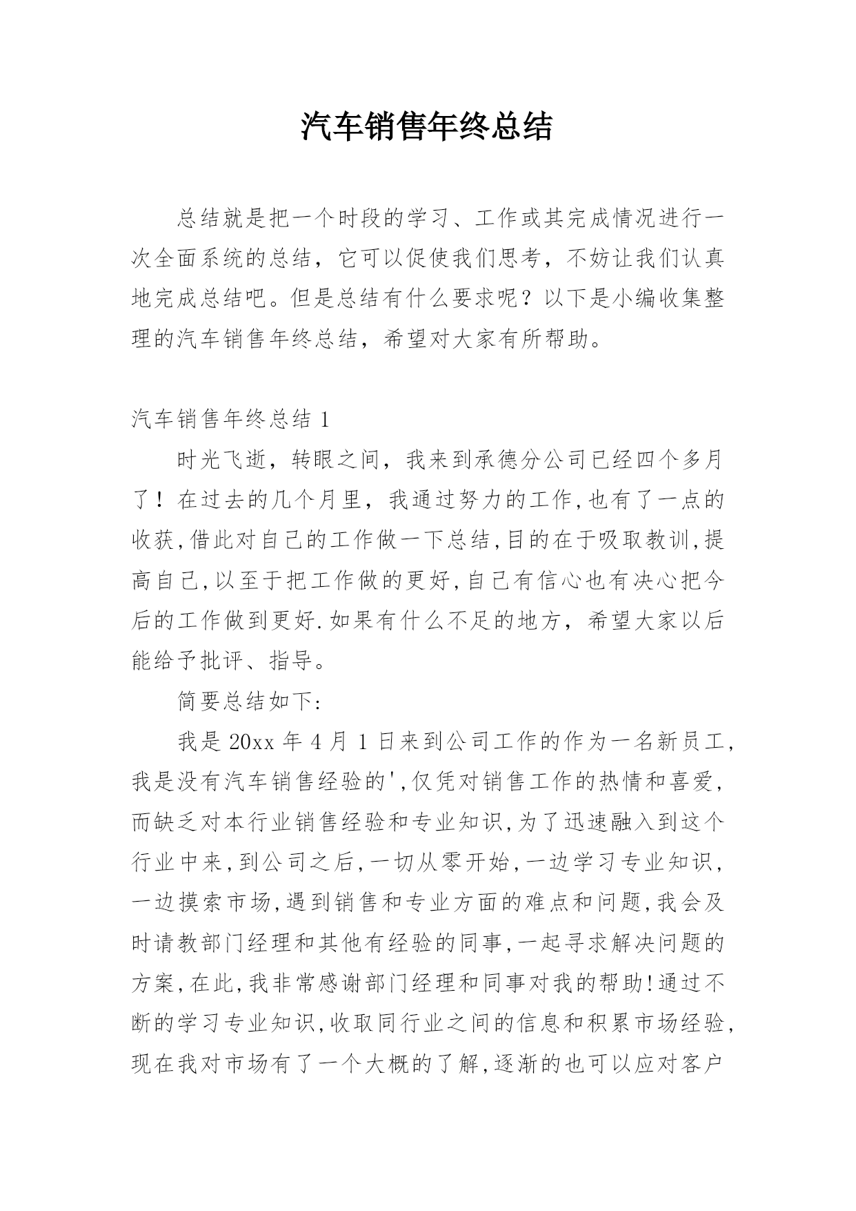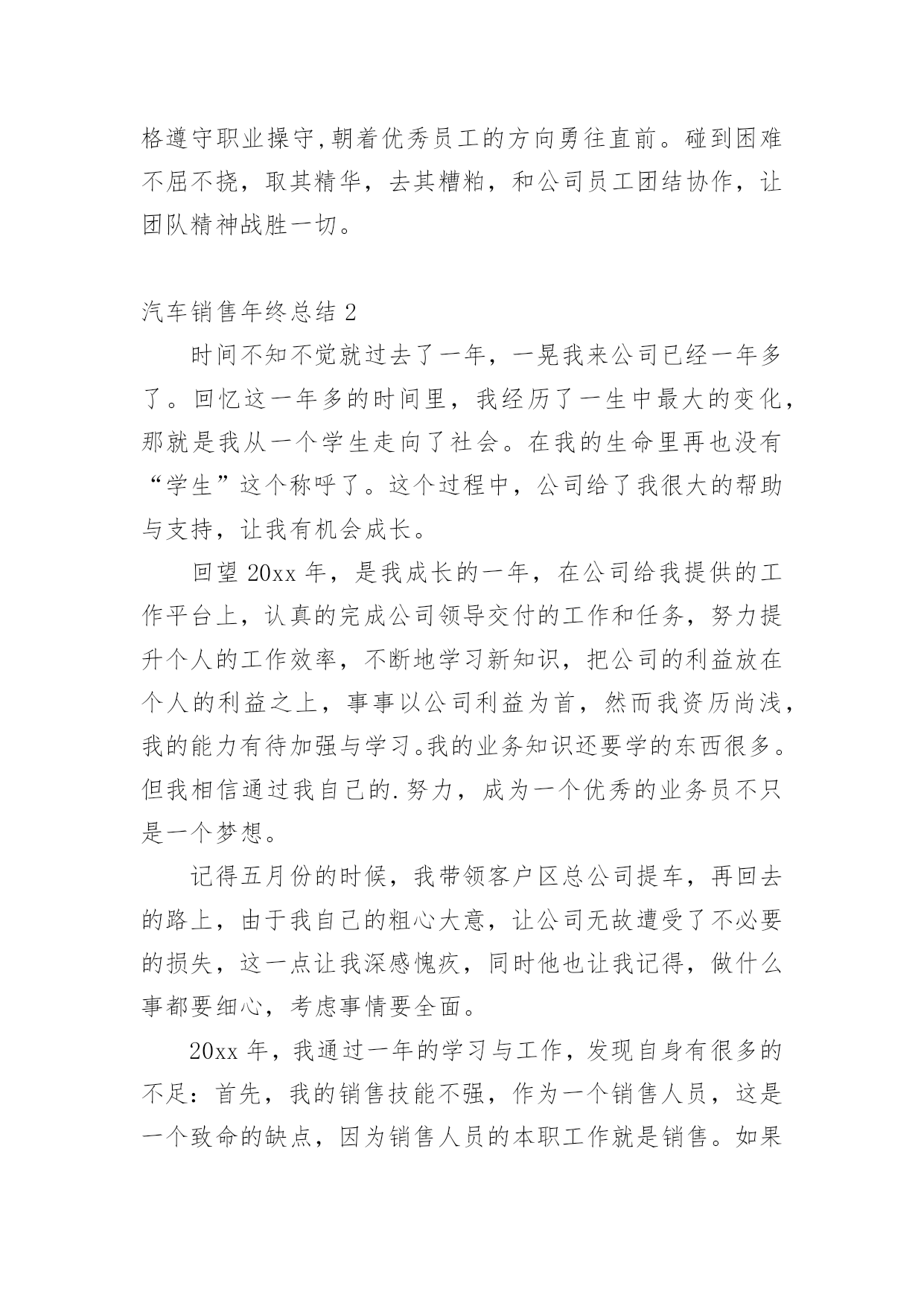 汽车销售年终总结总结就是把一个时段的学习、工作或其完成情况进行一次全面系统的总结,它可以促使我们思考,不妨让我们认真地完成总结吧。但是总结有什么要求呢?以下是小编收集整理的汽车销售年终总结,希望对大家有所帮助。汽车销售年终总结1时光飞逝,转眼之间,我来到承德分公司已经四个多月了!在过去的几个月里,我通过努力的工作,也有了一点的收获,借此对自己的工作做一下总结,目的在于吸取教训,提高自己,以至于把工作做的更好,自己有信心也有决心把今后的工作做到更好.如果有什么不足的地方,希望大家以后能给予批评、指导。简要总结如下:我是20xx年4月1日来到公司工作的作为一名新员工,我是没有汽车销售经验的',仅凭对销售工作的热情和喜爱,而缺乏对本行业销售经验和专业知识,为了迅速融入到这个行业中来,到公司之后,一切从零开始,一边学习专业知识,一边摸索市场,遇到销售和专业方面的难点和问题,我会及时请教部门经理和其他有经验的同事,一起寻求解决问题的方案,在此,我非常感谢部门经理和同事对我的帮助!通过不断的学习专业知识,收取同行业之间的信息和积累市场经验,现在我对市场有了一个大概的了解,逐渐的也可以应对客户所提到的一些问题。在不断的学习专业知识和积累经验的同时,自己的能力,业务水平都比以前有了一个较大幅度的提高.现存的缺点对于市场的了解还是不够深入,对专业知识掌握的还是不够充分,对一些大的问题不能快速拿出一个很好的解决问题的方法,在与客户的沟通过程中,缺乏经验.市场分析我们所负责的车型很多,在销售过程中,牵涉问题最多的就是价格,客户对价格非常敏感,怎样在第一时间获悉价格还需要我在今后的工作中去学习和掌握.承德现在有一部分客户主要从北京提车,价格和我们这差很多,而且什么车都有现货,只要去了随时可以提车,所以客户就不在承德这买车,这无疑对我们销售人员是一种挑战,我们怎样才能把客户留住呢?这就需要我们在今后的工作中不断完善自己的业务知识,尽量达到客户满意,靠服务赢取我们的市场。随着市场竞争的日益激烈,摆在销售人员面前的是平稳与磨砺并存,希望与机遇并存,成功与失败并存的局面,拥有一个积极向上的心态是非常重要的下半年工作计划:深入了解所负责品牌的市场现状,准确掌握市场动态与客户建立良好的合作关系不断的增强专业知识认真完成领导交给的各项任务最后,感谢公司给我一个展示自我能力的平台,我会严格遵守职业操守,朝着优秀员工的方向勇往直前。碰到困难不屈不挠,取其精华,去其糟粕,和公司员工团结协作,让团队精神战胜一切。汽车销售年终总结2时间不知不觉就过去了一年,一晃我来公司已经一年多了。回忆这一年多的时间里,我经历了一生中最大的变化,那就是我从一个学生走向了社会。在我的生命里再也没有“学生”这个称呼了。这个过程中,公司给了我很大的帮助与支持,让我有机会成长。回望20xx年,是我成长的一年,在公司给我提供的工作平台上,认真的完成公司领导交付的工作和任务,努力提升个人的工作效率,不断地学习新知识,把公司的利益放在个人的利益之上,事事以公司利益为首,然而我资历尚浅,我的能力有待加强与学习。我的业务知识还要学的东西很多。但我相信通过我自己的.努力,成为一个优秀的业务员不只是一个梦想。记得五月份的时候,我带领客户区总公司提车,再回去的路上,由于我自己的粗心大意,让公司无故遭受了不必要的损失,这一点让我深感愧疚,同时他也让我记得,做什么事都要细心,考虑事情要全面。20xx年,我通过一年的学习与工作,发现自身有很多的不足:首先,我的销售技能不强,作为一个销售人员,这是一个致命的缺点,因为销售人员的本职工作就是销售。如果这一点都做不好,那就不配作为一名销售人员。所以,20xx年最主要的任务就是要提高自己的销售技能,实现销售业绩一个质的飞跃,为公司创造更大的利润。20xx年还有一件比较重要的任务就是提高自己的自制能力。销售工作是一个有大量业余时间的职业,我要充分利用这些业余时间来提高自己的专业知识技能。从而来提高自己的销售技能。利用这些业余时间可以学习和充实自己。响应公司的号召,多学习业务知识的同时学习财务知识,把自己变成一个多功能型人才。这样的人才才是公司需要的人才。才能为公司创造更大的利润,为自己创造更大的发展空间。今年,我将一如既往的按照公司的要求,在去年的工作基础上更加努力全面开展20xx年度的工作,先制定工作计划如下:1、加强老客户的销售跟踪情况,持续跟进新客户与潜在客户。2、开拓视野,丰富知识。采取多样化形式的销售方式,不断加强业务方面的学习、多看书、上网查阅相关资料,与同行们交流,向他们学习更好的方式、方法。3、每月应该尽最大努力完成销售目标,从而在努力中学习与进步。4、一周一小结,每月一大结。总结工作上的失误并及时改正。5、多了解客户的需求,有针对性的做好准备工作,做到不流失