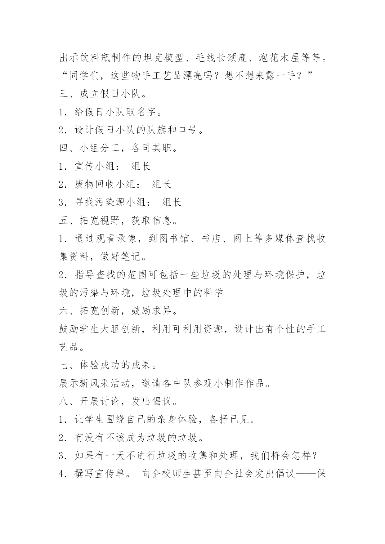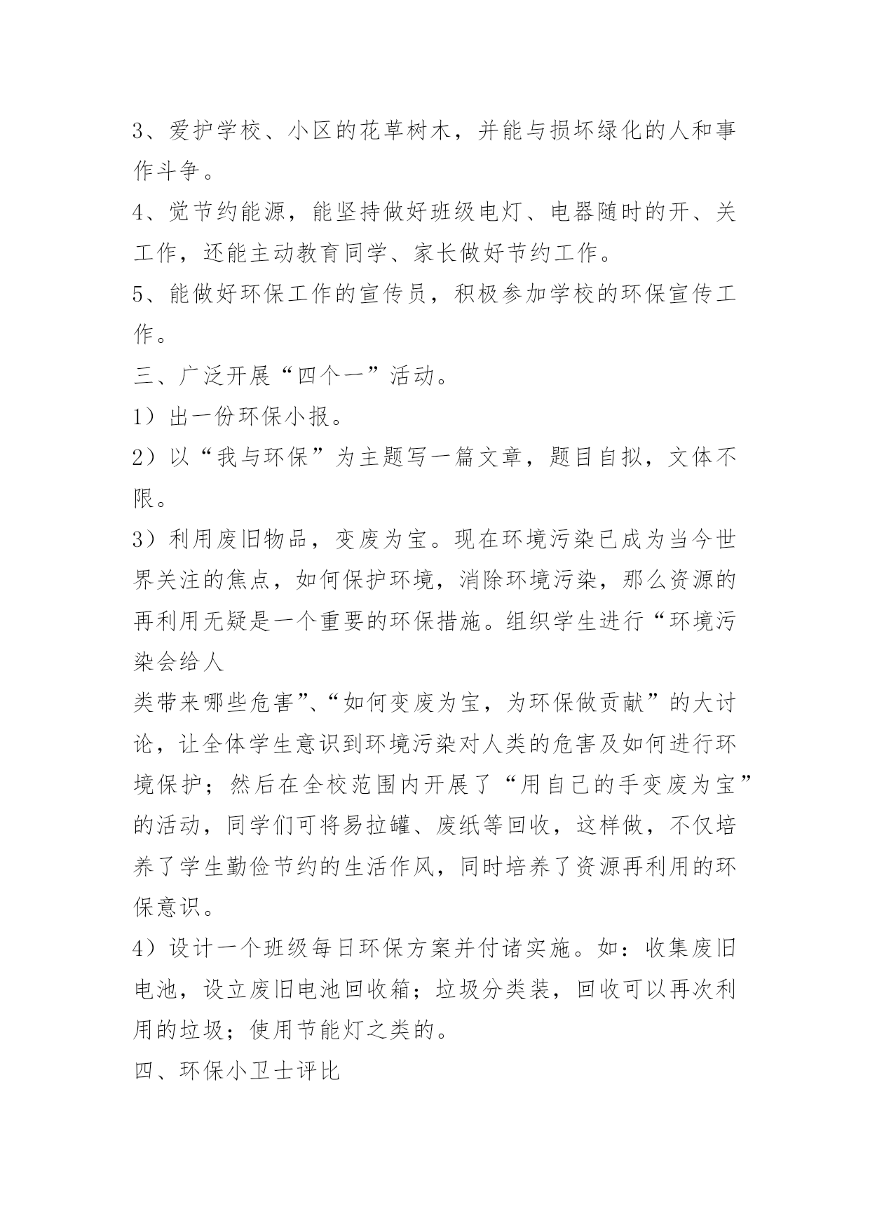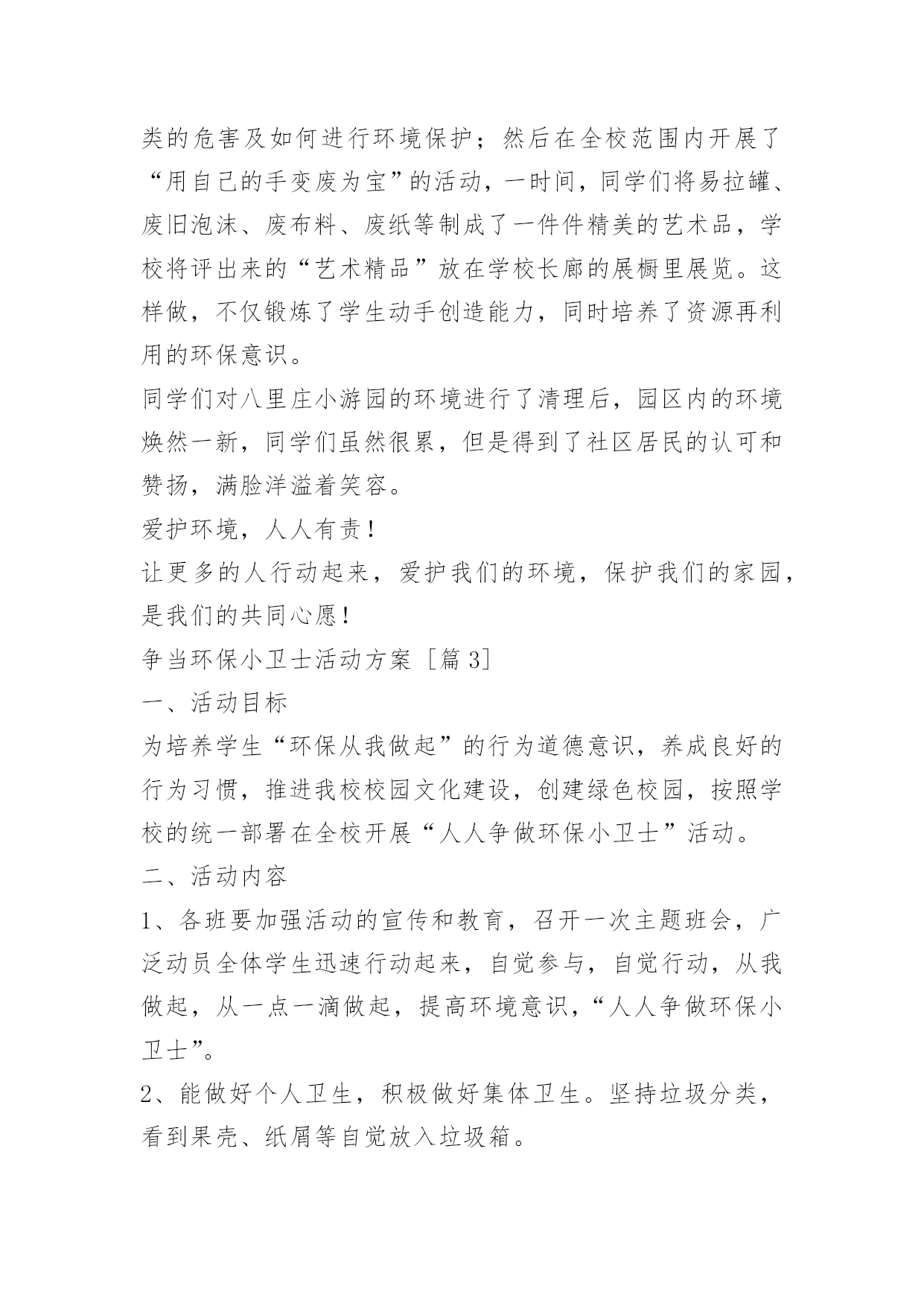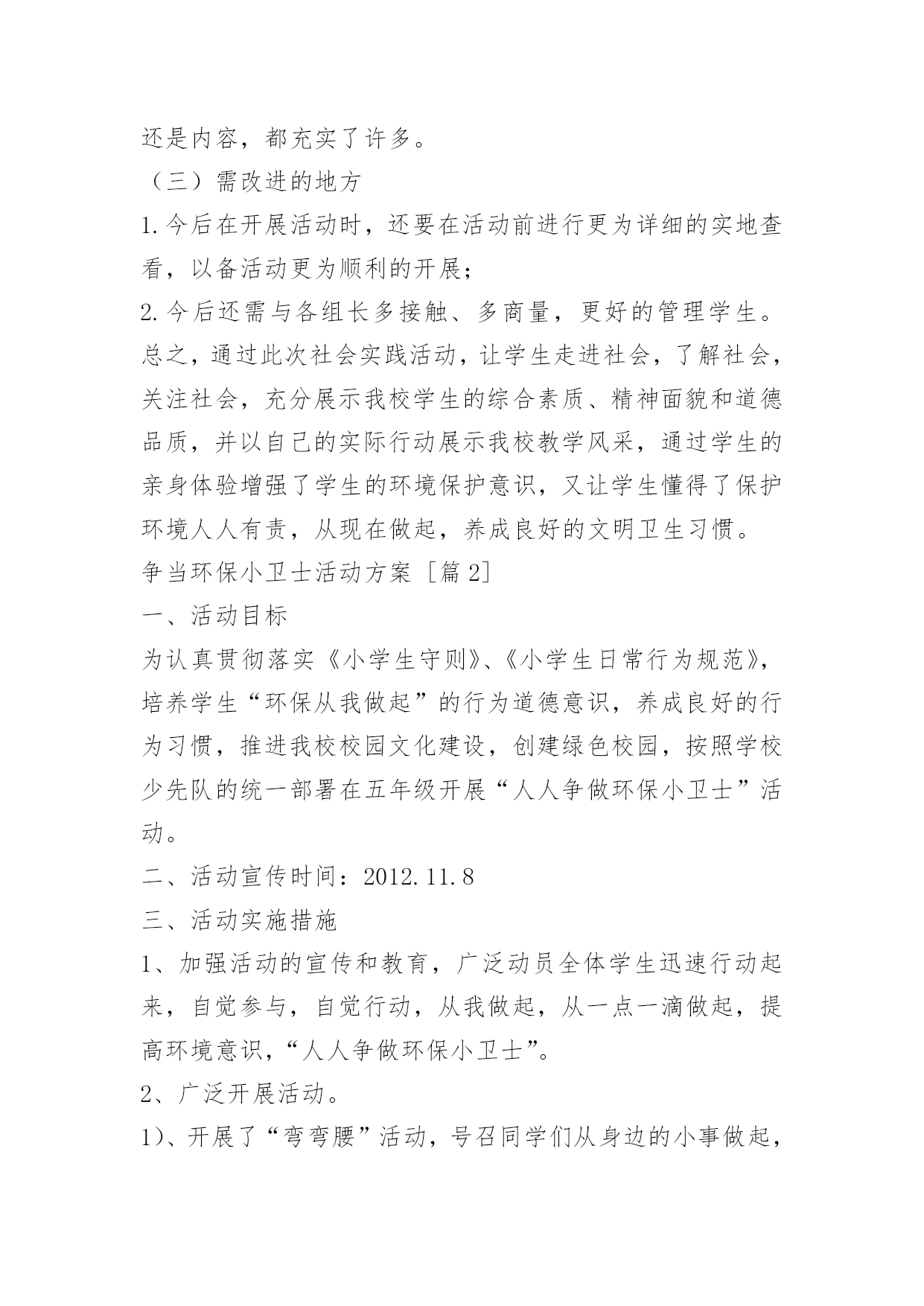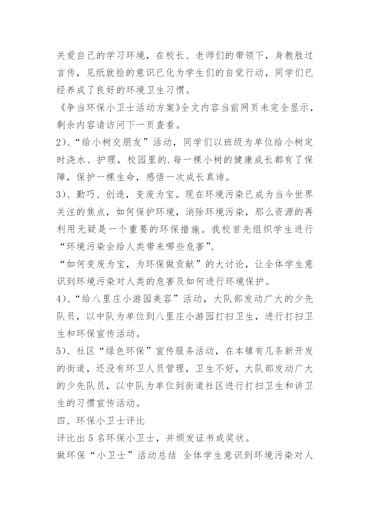 争当环保小卫士活动方案争当环保小卫士活动方案活动目的:1.让队员调查周围及附近一些污染存在问题,认识环保的重要性。2.利用假日带领队员走出校门,开展废物回收活动,对周围村民进行环保知识宣传。3.丰富科技制作活动,探索科技活动的兴趣,培养学生勤动手、勤动脑的习惯和能力。4.通过小制作活动,促进学生积极参与科技活动的兴趣,增强学生环保科技意识。活动形式:组建假日小队、撰写分发宣传单、废物回收、废物小制作、书写张贴倡议书、设计广告标语、写心得体会、设计手抄报等。活动过程:一、提出实践课题。(话题导入,如在生活中各种各样的垃圾废物带来的困扰,谈一谈对垃圾知道多少,如何处理这些废物的方法等等,以引起学生的兴趣。)1.根据学生身边的实际问题,引导学生自己点出主题。2.利用学生的生活体验,引导认识垃圾对人类的危害性。3.根据讲座的内容,因势利导。二、展示实物作品,激发探索兴趣。出示饮料瓶制作的坦克模型、毛线长颈鹿、泡花木屋等等。“同学们,这些物手工艺品漂亮吗?想不想来露一手?”三、成立假日小队。1.给假日小队取名字。2.设计假日小队的队旗和口号。四、小组分工,各司其职。1.宣传小组:组长2.废物回收小组:组长3.寻找污染源小组:组长五、拓宽视野,获取信息。1.通过观看录像,到图书馆、书店、网上等多媒体查找收集资料,做好笔记。2.指导查找的范围可包括一些垃圾的处理与环境保护,垃圾的污染与环境,垃圾处理中的科学六、拓宽创新,鼓励求异。鼓励学生大胆创新,利用可利用资源,设计出有个性的手工艺品。七、体验成功的成果。展示新风采活动,邀请各中队参观小制作作品。八、开展讨论,发出倡议。1.让学生围绕自己的亲身体验,各抒已见。2.有没有不该成为垃圾的垃圾。3.如果有一天不进行垃圾的收集和处理,我们将会怎样?4.撰写宣传单。向全校师生甚至向全社会发出倡议——保护环境,从身边小事做起!但是保护环境单靠我们还不行,应该呼吁全社会的人们共同关心环境工作,做一名环保之人。九、评选“小卫士、小能手”活动。1.交流心得体会。2.评选环保“小卫士”、“制作小能手”、“最佳设计奖”(手抄报)3.颁发奖章。4.本学期总结。争做环保小卫士活动总结三年三班本次社会实践和道德体验,增强了德育工作的实效,引领学生在实践中亲身体验,在实践中培养高尚的思想,良好的品德,并使其不断地内化为学生自身的素质。我校结合小学生年龄特点和认知规律,结合当地特点,发挥当地优势,开展了“我是环保小卫士”的社会实践活动达到了预期的目的。此次社会实践活动值得肯定的地方很多:(一)准备充分1.依据当地实际情况,结合学生实际制定出详细的活动方案;2.通过班队会对活动进行宣传,并强调相关要求;3.相关人员多次商讨,考虑细致,为活动做准备;(二)活动有效1.活动中,学生积极地参与,且情绪高昂;2.学生在实践活动中,认真打扫,每一个角落都不放过;3.活动后,学生写了心得体会、办了手抄报,不论是篇幅,还是内容,都充实了许多。(三)需改进的地方1.今后在开展活动时,还要在活动前进行更为详细的实地查看,以备活动更为顺利的开展;2.今后还需与各组长多接触、多商量,更好的管理学生。总之,通过此次社会实践活动,让学生走进社会,了解社会,关注社会,充分展示我校学生的综合素质、精神面貌和道德品质,并以自己的实际行动展示我校教学风采,通过学生的亲身体验增强了学生的环境保护意识,又让学生懂得了保护环境人人有责,从现在做起,养成良好的文明卫生习惯。争当环保小卫士活动方案[篇2]一、活动目标为认真贯彻落实《小学生守则》、《小学生日常行为规范》,培养学生“环保从我做起”的行为道德意识,养成良好的行为习惯,推进我校校园文化建设,创建绿色校园,按照学校少先队的统一部署在五年级开展“人人争做环保小卫士”活动。二、活动宣传时间:2012.11.8三、活动实施措施1、加强活动的宣传和教育,广泛动员全体学生迅速行动起来,自觉参与,自觉行动,从我做起,从一点一滴做起,提高环境意识,“人人争做环保小卫士”。2、广泛开展活动。1)、开展了“弯弯腰”活动,号召同学们从身边的小事做起,关爱自己的学习环境,在校长、老师们的带领下,身教胜过言传,见纸就捡的意识已化为学生们的自觉行动,同学们已经养成了良好的环境卫生习惯。《争当环保小卫士活动方案》全文内容当前网页未完全显示,剩余内容请访问下一页查看。2)、“给小树交朋友”活动,同学们以班级为单位给小树定时浇水、护理,校园里的.每一棵小树的健康成长都有了保障,保护一棵生命,感悟一次成长真谛。3)、勤巧、创造,变废为宝。现在环境污染已成为当今世界关注的焦点,如何保护环境,消除环境污染,那么资源的再利用无疑是一个重要的环保措施。我校首先组织学生进行“环境污染会给人类带来哪些危害”、“如何变废为宝,为环保做贡献”的大讨论,让