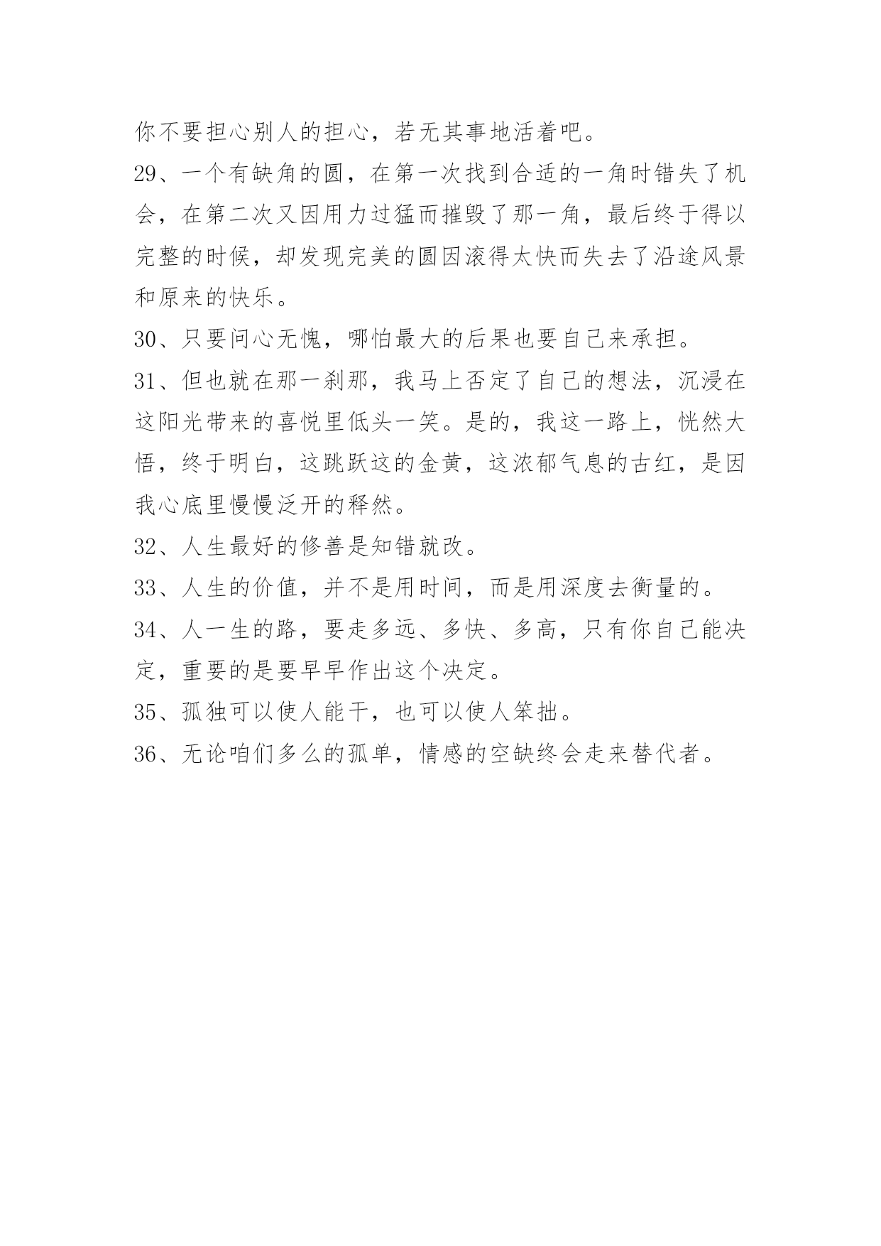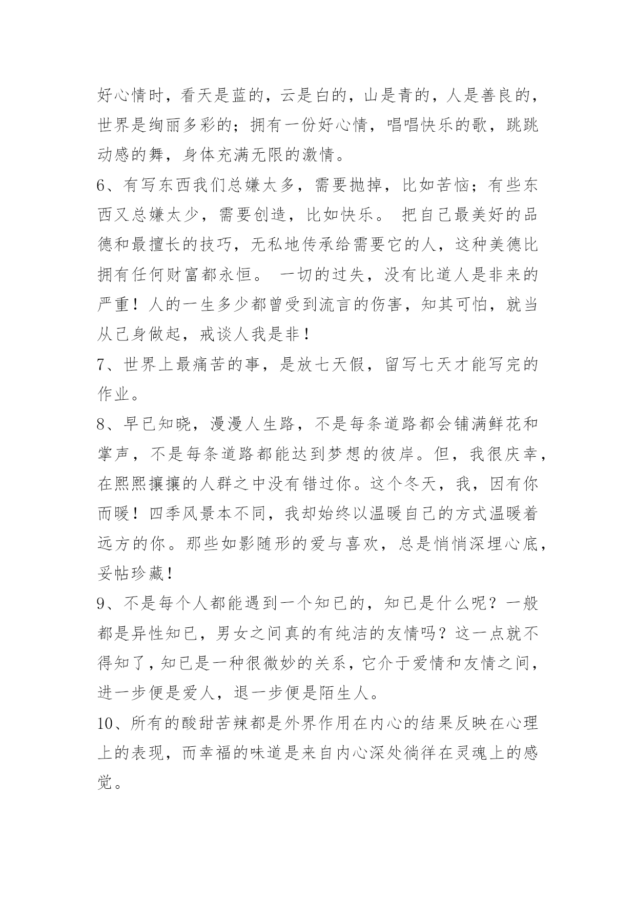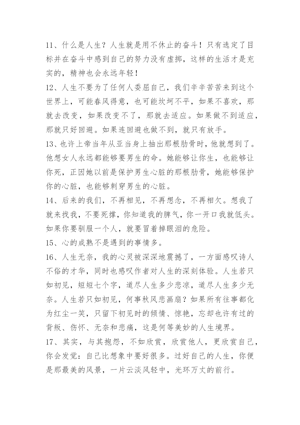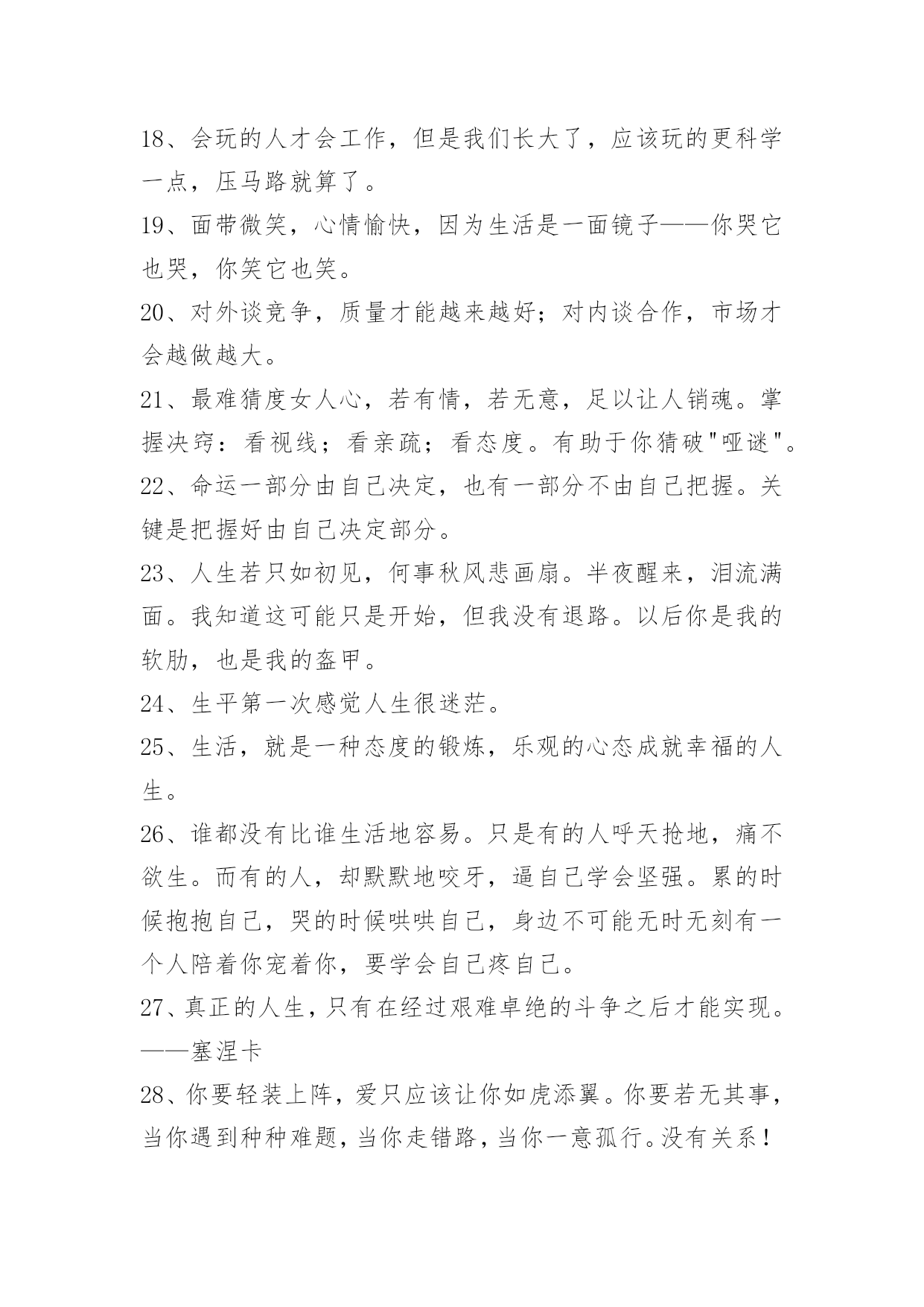 人生感悟的语句36条【精华】人生感悟的语句集合36条心里的苦谁能明白,心里的心酸谁能懂,在别人眼里我看着是潇洒洒脱,但我真的好累好累,每当想起自己的痛,但我还是很乐观的生活,还是自信,很坚强,因为我是男人,我要承受的了一切,希望有一天有人能读懂我!以下是小编帮大家整理的人生感悟的语句36条,欢迎阅读。1、人必须要有耐心,特别是要有信心。我们的生活都不容易,但是那有什么关系?我们必须有恒心,尤其要有自信心!我们必须相信,我们的天赋是用来做某些事情的,无论代价多大,这些事情必须做到。2、人生要有主要目标,命令不如与人合作,凡事思考是否当妥,多用大脑减少徒劳,挑战让人更上层楼,相信自己终有所获。3、夫佛法本平常,而世人以奇特求之,故往往不得佛心也。故日"平常心是道"。——《紫柏尊者全集》4、"心"字三个点,没有一个点不在往外蹦。你越想抓牢的,往往是离开你最快的。一切随缘,缘深多聚聚,缘浅随它去。人生,看轻看淡多少,痛苦就离开你多少。做粥要放三分米,七分水。处事要三分为己,七分为人。对朋友要三分认真,七分宽容。对家庭要三分爱,七分责任。看文章,三分在看,七分在品。喝酒要到三分醉,七分醒。5、原来,能伴随我们一生的是自己的心情!当你拥有一份好心情时,看天是蓝的,云是白的,山是青的,人是善良的,世界是绚丽多彩的;拥有一份好心情,唱唱快乐的歌,跳跳动感的舞,身体充满无限的激情。6、有写东西我们总嫌太多,需要抛掉,比如苦恼;有些东西又总嫌太少,需要创造,比如快乐。把自己最美好的品德和最擅长的技巧,无私地传承给需要它的人,这种美德比拥有任何财富都永恒。一切的过失,没有比道人是非来的严重!人的一生多少都曾受到流言的伤害,知其可怕,就当从己身做起,戒谈人我是非!7、世界上最痛苦的事,是放七天假,留写七天才能写完的作业。8、早已知晓,漫漫人生路,不是每条道路都会铺满鲜花和掌声,不是每条道路都能达到梦想的彼岸。但,我很庆幸,在熙熙攘攘的人群之中没有错过你。这个冬天,我,因有你而暖!四季风景本不同,我却始终以温暖自己的方式温暖着远方的你。那些如影随形的爱与喜欢,总是悄悄深埋心底,妥帖珍藏!9、不是每个人都能遇到一个知已的,知已是什么呢?一般都是异性知已,男女之间真的有纯洁的友情吗?这一点就不得知了,知已是一种很微妙的关系,它介于爱情和友情之间,进一步便是爱人,退一步便是陌生人。10、所有的酸甜苦辣都是外界作用在内心的结果反映在心理上的表现,而幸福的味道是来自内心深处徜徉在灵魂上的感觉。11、什么是人生?人生就是用不休止的奋斗!只有选定了目标并在奋斗中感到自己的努力没有虚掷,这样的生活才是充实的,精神也会永远年轻!12、人生不要为了任何人委屈自己,我们辛辛苦苦来到这个世界上,可能春风得意,也可能坎坷不平,如果不喜欢,那就去改变,如果改变不了,那就去适应。如果做不到适应,那就只好回避。如果连回避也做不到,就只有放手。13、也许上帝当年从亚当身上抽出那根肋骨时,他就想到了。他想女人永远都能够要男生的命。她能够让你生,也能够让你死,正因她以前是保护男生心脏的那根肋骨,她能够保护你的心脏,也能够刺穿男生的心脏。14、后来的我们,不再相见,不再想念,不再相欠。想我了就来找我,不要死撑,你知道我的脾气,你一开口我就低头。如果你要驯服一个人,就要冒着掉眼泪的危险。15、心的成熟不是遇到的事情多。16、人生无奈,我的心灵被深深地震撼了,一方面感叹诗人不俗的才华,同时也感叹作者对人生的深刻体验。人生若只如初见,短短七个字,道尽人生多少悲凉,道尽人生多少无奈。人生若只如初见,何事秋风悲画扇?如果所有往事都化为红尘一笑,只留下初见时的倾情、惊艳,忘却也许有过的背叛、伤怀、无奈和悲痛,这是何等美妙的人生境界。17、其实,与其抱怨,不如欣赏,欣赏他人,更欣赏自己,你会发觉:自己比想象中要好很多。过好自己的人生,你便是那最美的风景,一片云淡风轻中,光环万丈的前行。18、会玩的人才会工作,但是我们长大了,应该玩的更科学一点,压马路就算了。19、面带微笑,心情愉快,因为生活是一面镜子——你哭它也哭,你笑它也笑。20、对外谈竞争,质量才能越来越好;对内谈合作,市场才会越做越大。21、最难猜度女人心,若有情,若无意,足以让人销魂。掌握决窍:看视线;看亲疏;看态度。有助于你猜破"哑谜"。22、命运一部分由自己决定,也有一部分不由自己把握。关键是把握好由自己决定部分。23、人生若只如初见,何事秋风悲画扇。半夜醒来,泪流满面。我知道这可能只是开始,但我没有退路。以后你是我的软肋,也是我的盔甲。24、生平第一次感觉人生很迷茫。25、生活,就是一种态度的锻炼,乐观的心态成就幸福的人生。26、谁都没有比谁生活地容易。只是有的人呼天抢地,痛不欲生。而有的人,却默默地咬牙,逼自己学会坚强。累的时候抱抱自