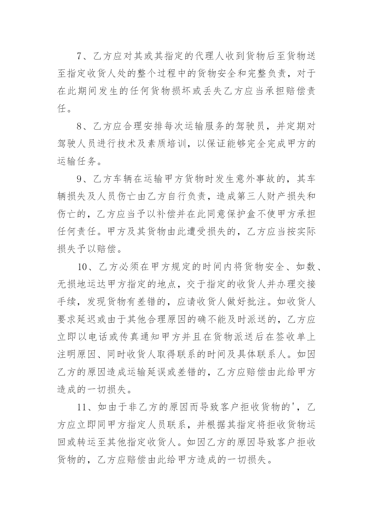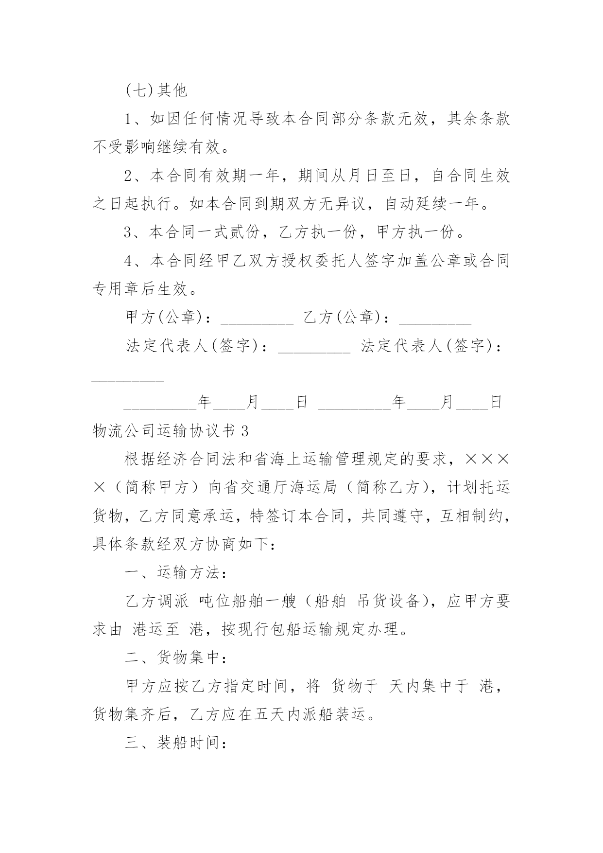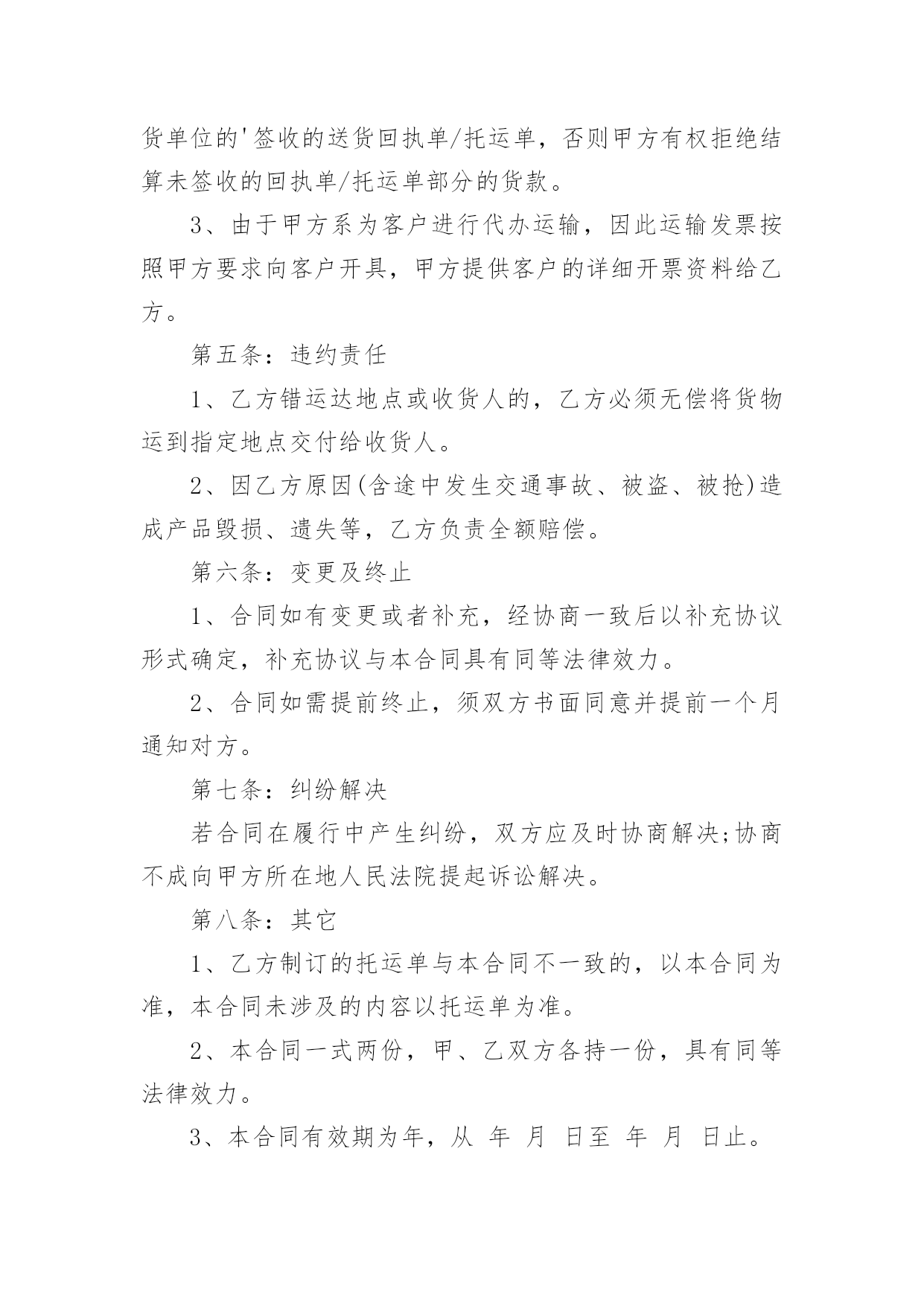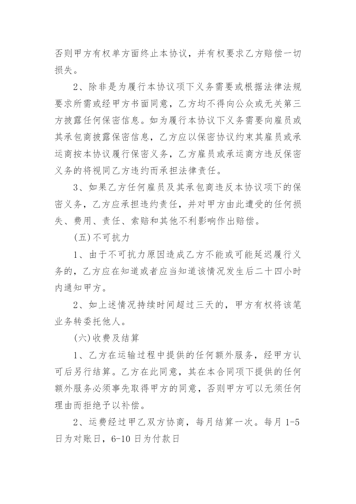 物流公司运输协议书物流公司运输协议书在不断进步的时代,协议的使用成为日常生活的常态,签订了协议就有了法律依靠。写协议需要注意哪些问题呢?下面是小编为大家收集的物流公司运输协议书,欢迎阅读与收藏。物流公司运输协议书1托运人(甲方):承运人(乙方):甲方委托乙方为产品提供物流服务,经双方友好协商,达成如下物流服务合同内容:第一条、承运货物及地址地点1、托运的主要货物为:2、货物的起运地点:甲方仓库3、到达地点:送达到甲方指定的地点。第二条:甲方权利、义务1、负责提供产品送达地点、电话、收货人和联系人等有关资料。2、负责按要求准备好待运产品,并提前书面通知乙方。3、产品发运后,甲方需要变更到货地点、收货人或取消托运时,有权向乙方发出变更运输指令,因此产生的额外费用由甲方支付给乙方。第三条:乙方权利、义务1、乙方必须具有真实,合法的货物营运资格;2、甲方通过传真下达计划给乙方,乙方必须派出车况良好,和各类证件齐全,防护材料齐全并符合装车要求的车辆,并在约定时间内到达指定地点装车。3、货物到达后若出现造成货物短少、被盗、被抢、雨淋、丢失乙方必须照价赔偿(如果外包装没有破损,视为货物完好,属于甲方产品自然属性或包装缺陷引起的除外)。途中发生交通事故造成货损的,由乙方全额赔偿。4、乙方应为托运的产品办理有关运输保险手续。5、乙方必须将承运的货物按时、完整、准确地送达到甲方指定的目的地,若发生未经甲方同意在指定地点以外的地方卸货,由此产生的运输费用由乙方负责。6、乙方将货物送达交付完毕后,甲方仓库负责人或收货人必需出示有效证件予以签收。7、乙方必须根据甲方要求报告在途车辆的情况,出现异常情况及时报告予以解决。8、由于自然灾害或交通堵塞等不可抗拒因素造成货物无法准时到达,乙方必须及时通知甲方,由双方共同协商解决。第四条:费用及结算方式1、运费标准:,运输费用已包含了运输保险等费用。2、结算方式:每月结算一次,结算时乙方必须出具收货单位的'签收的送货回执单/托运单,否则甲方有权拒绝结算未签收的回执单/托运单部分的货款。3、由于甲方系为客户进行代办运输,因此运输发票按照甲方要求向客户开具,甲方提供客户的详细开票资料给乙方。第五条:违约责任1、乙方错运达地点或收货人的,乙方必须无偿将货物运到指定地点交付给收货人。2、因乙方原因(含途中发生交通事故、被盗、被抢)造成产品毁损、遗失等,乙方负责全额赔偿。第六条:变更及终止1、合同如有变更或者补充,经协商一致后以补充协议形式确定,补充协议与本合同具有同等法律效力。2、合同如需提前终止,须双方书面同意并提前一个月通知对方。第七条:纠纷解决若合同在履行中产生纠纷,双方应及时协商解决;协商不成向甲方所在地人民法院提起诉讼解决。第八条:其它1、乙方制订的托运单与本合同不一致的,以本合同为准,本合同未涉及的内容以托运单为准。2、本合同一式两份,甲、乙双方各持一份,具有同等法律效力。3、本合同有效期为年,从年月日至年月日止。4、本合同自双方签订之日起生效。发运人(甲方):承运人(乙方):托运人名称(章):承运人名称(章):年月日物流公司运输协议书2甲方:乙方:经甲、乙双方协商一致,甲方愿意接受乙方提供的附件中约定的服务,同时乙方也愿意向甲方提供上述服务,双方达成合意如下。(一)经营资格1、乙方承诺其已取得有关执照和许可,具有签订并履行本合同的资格和能力。乙方应将其有效营业执照复印件、运输经营许可证复印件及其他甲方要求的证明乙方经营能力的文件交甲方备案。2、乙方应将可能用以向甲方提供服务的车辆的牌照,驾驶人员的有关证件报告甲方以供其备案。3、乙方应保证所提供的上述文件资料的真实性,如有任何变更,应及时通知甲方。(二)双方保证(甲方)1、甲方托运的货物必须是国家法律允许流通的物品,甲方应保证按国家法律的规定行事。2、每次货物运输甲方须提供货物的名称、数量、收货人的详细名称和地址给乙方。3、甲方如对货物运输有任何特别邀请应事先告知乙方。4、甲方如违反上述保证,乙方有权拒绝运输,直至甲方满足上述保证。(乙方)1、乙方应根据甲方的货物运输邀请及时提供符合条件和数量的运输车辆和驾驶员,在乙方的使用控制过程中,乙方对系统设备的完好承担损坏赔偿责任。2、乙方不得在为甲方提供的过程中拼装任何有可能对甲方货物造成污损或危险的其他货物。3、乙方提供的车辆不符合甲方的要求,甲方可以拒绝装货,如乙方在接到甲方运输通知后六小时(长途运输)或二小时(市内运输)内仍不能提供符合要求的车辆,甲方有权委托其他承运人运输,且乙方应赔偿由此可能给甲方造成的一起损失。4、乙方不得无理拒绝甲方的货物,否则甲方可以立即解除合同,并要求乙方赔偿由此造成的一起损失。5、乙方应按照甲方对货物运输的特别要求认真操作。6、乙方应及时提取和装运货物,并在货物交接单上签字。