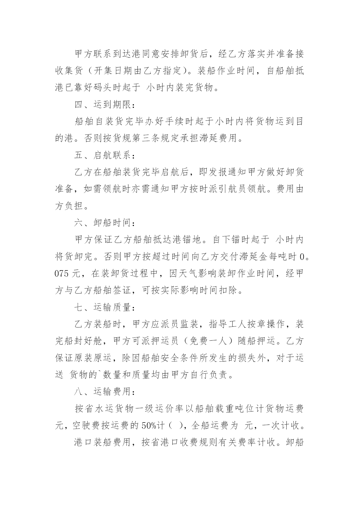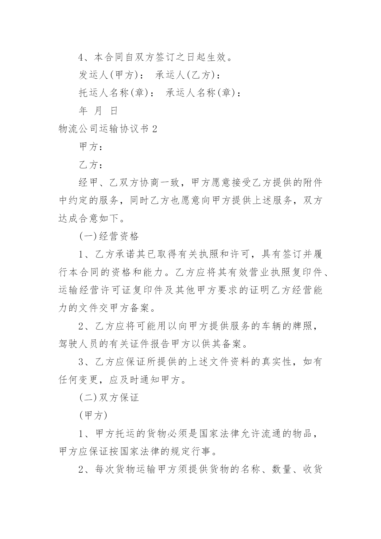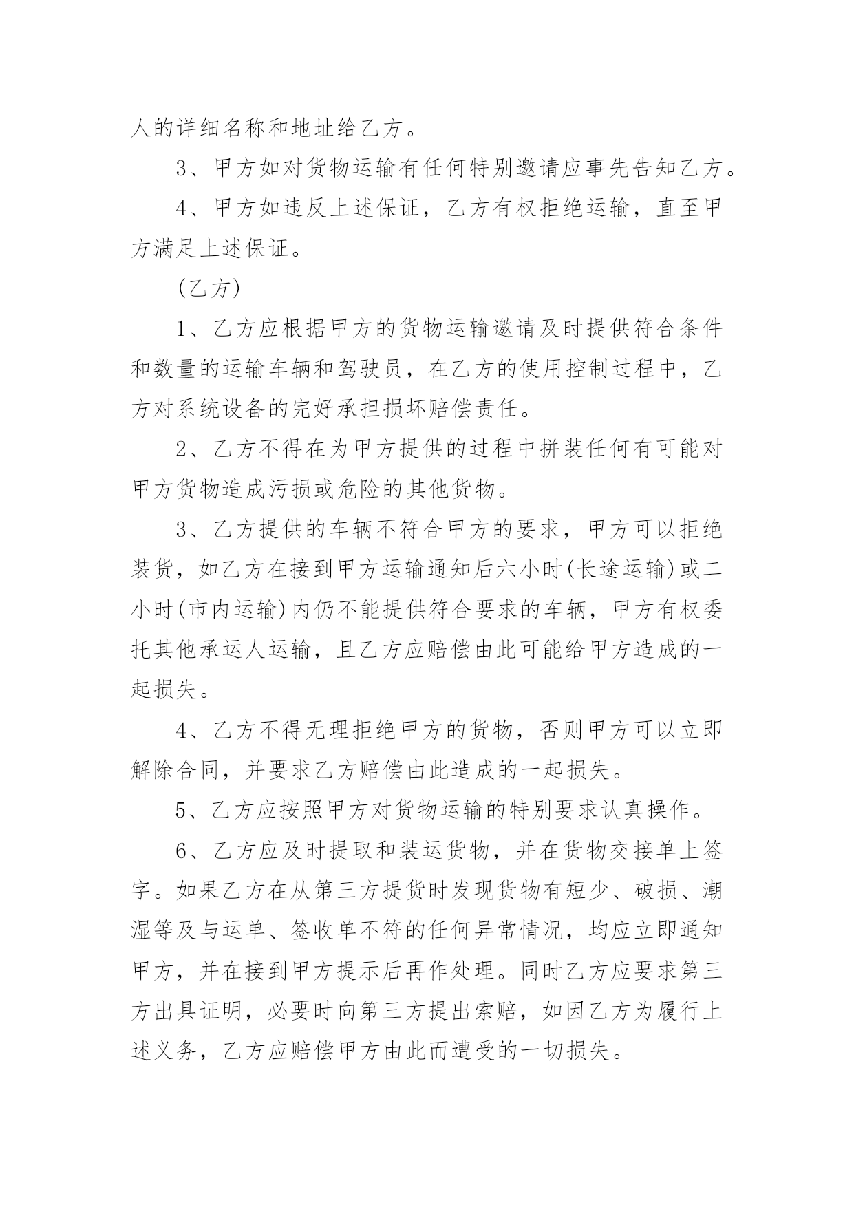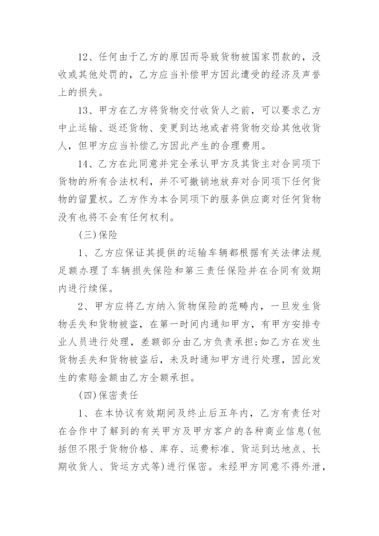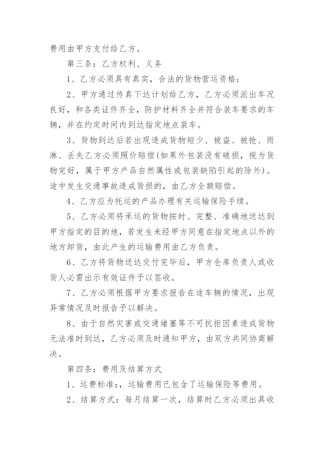 物流公司运输协议书物流公司运输协议书在不断进步的时代,协议的使用成为日常生活的常态,签订了协议就有了法律依靠。写协议需要注意哪些问题呢?下面是小编为大家收集的物流公司运输协议书,欢迎阅读与收藏。物流公司运输协议书1托运人(甲方):承运人(乙方):甲方委托乙方为产品提供物流服务,经双方友好协商,达成如下物流服务合同内容:第一条、承运货物及地址地点1、托运的主要货物为:2、货物的起运地点:甲方仓库3、到达地点:送达到甲方指定的地点。第二条:甲方权利、义务1、负责提供产品送达地点、电话、收货人和联系人等有关资料。2、负责按要求准备好待运产品,并提前书面通知乙方。3、产品发运后,甲方需要变更到货地点、收货人或取消托运时,有权向乙方发出变更运输指令,因此产生的额外费用由甲方支付给乙方。第三条:乙方权利、义务1、乙方必须具有真实,合法的货物营运资格;2、甲方通过传真下达计划给乙方,乙方必须派出车况良好,和各类证件齐全,防护材料齐全并符合装车要求的车辆,并在约定时间内到达指定地点装车。3、货物到达后若出现造成货物短少、被盗、被抢、雨淋、丢失乙方必须照价赔偿(如果外包装没有破损,视为货物完好,属于甲方产品自然属性或包装缺陷引起的除外)。途中发生交通事故造成货损的,由乙方全额赔偿。4、乙方应为托运的产品办理有关运输保险手续。5、乙方必须将承运的货物按时、完整、准确地送达到甲方指定的目的地,若发生未经甲方同意在指定地点以外的地方卸货,由此产生的运输费用由乙方负责。6、乙方将货物送达交付完毕后,甲方仓库负责人或收货人必需出示有效证件予以签收。7、乙方必须根据甲方要求报告在途车辆的情况,出现异常情况及时报告予以解决。8、由于自然灾害或交通堵塞等不可抗拒因素造成货物无法准时到达,乙方必须及时通知甲方,由双方共同协商解决。第四条:费用及结算方式1、运费标准:,运输费用已包含了运输保险等费用。2、结算方式:每月结算一次,结算时乙方必须出具收货单位的'签收的送货回执单/托运单,否则甲方有权拒绝结算未签收的回执单/托运单部分的货款。3、由于甲方系为客户进行代办运输,因此运输发票按照甲方要求向客户开具,甲方提供客户的详细开票资料给乙方。第五条:违约责任1、乙方错运达地点或收货人的,乙方必须无偿将货物运到指定地点交付给收货人。2、因乙方原因(含途中发生交通事故、被盗、被抢)造成产品毁损、遗失等,乙方负责全额赔偿。第六条:变更及终止1、合同如有变更或者补充,经协商一致后以补充协议形式确定,补充协议与本合同具有同等法律效力。2、合同如需提前终止,须双方书面同意并提前一个月通知对方。第七条:纠纷解决若合同在履行中产生纠纷,双方应及时协商解决;协商不成向甲方所在地人民法院提起诉讼解决。第八条:其它1、乙方制订的托运单与本合同不一致的,以本合同为准,本合同未涉及的内容以托运单为准。2、本合同一式两份,甲、乙双方各持一份,具有同等法律效力。3、本合同有效期为年,从年月日至年月日止。4、本合同自双方签订之日起生效。发运人(甲方):承运人(乙方):托运人名称(章):承运人名称(章):年月日物流公司运输协议书2甲方:乙方:经甲、乙双方协商一致,甲方愿意接受乙方提供的附件中约定的服务,同时乙方也愿意向甲方提供上述服务,双方达成合意如下。(一)经营资格1、乙方承诺其已取得有关执照和许可,具有签订并履行本合同的资格和能力。乙方应将其有效营业执照复印件、运输经营许可证复印件及其他甲方要求的证明乙方经营能力的文件交甲方备案。2、乙方应将可能用以向甲方提供服务的车辆的牌照,驾驶人员的有关证件报告甲方以供其备案。3、乙方应保证所提供的上述文件资料的真实性,如有任何变更,应及时通知甲方。(二)双方保证(甲方)1、甲方托运的货物必须是国家法律允许流通的物品,甲方应保证按国家法律的规定行事。2、每次货物运输甲方须提供货物的名称、数量、收货人的详细名称和地址给乙方。3、甲方如对货物运输有任何特别邀请应事先告知乙方。4、甲方如违反上述保证,乙方有权拒绝运输,直至甲方满足上述保证。(乙方)1、乙方应根据甲方的货物运输邀请及时提供符合条件和数量的运输车辆和驾驶员,在乙方的使用控制过程中,乙方对系统设备的完好承担损坏赔偿责任。2、乙方不得在为甲方提供的过程中拼装任何有可能对甲方货物造成污损或危险的其他货物。3、乙方提供的车辆不符合甲方的要求,甲方可以拒绝装货,如乙方在接到甲方运输通知后六小时(长途运输)或二小时(市内运输)内仍不能提供符合要求的车辆,甲方有权委托其他承运人运输,且乙方应赔偿由此可能给甲方造成的一起损失。4、乙方不得无理拒绝甲方的货物,否则甲方可以立即解除合同,并要求乙方赔偿由此造成的一起损失。5、乙方应按照甲方对货物运输的特别要求认真操作。6、乙方应及时提取和装运货物,并在货物交接单上签字。
