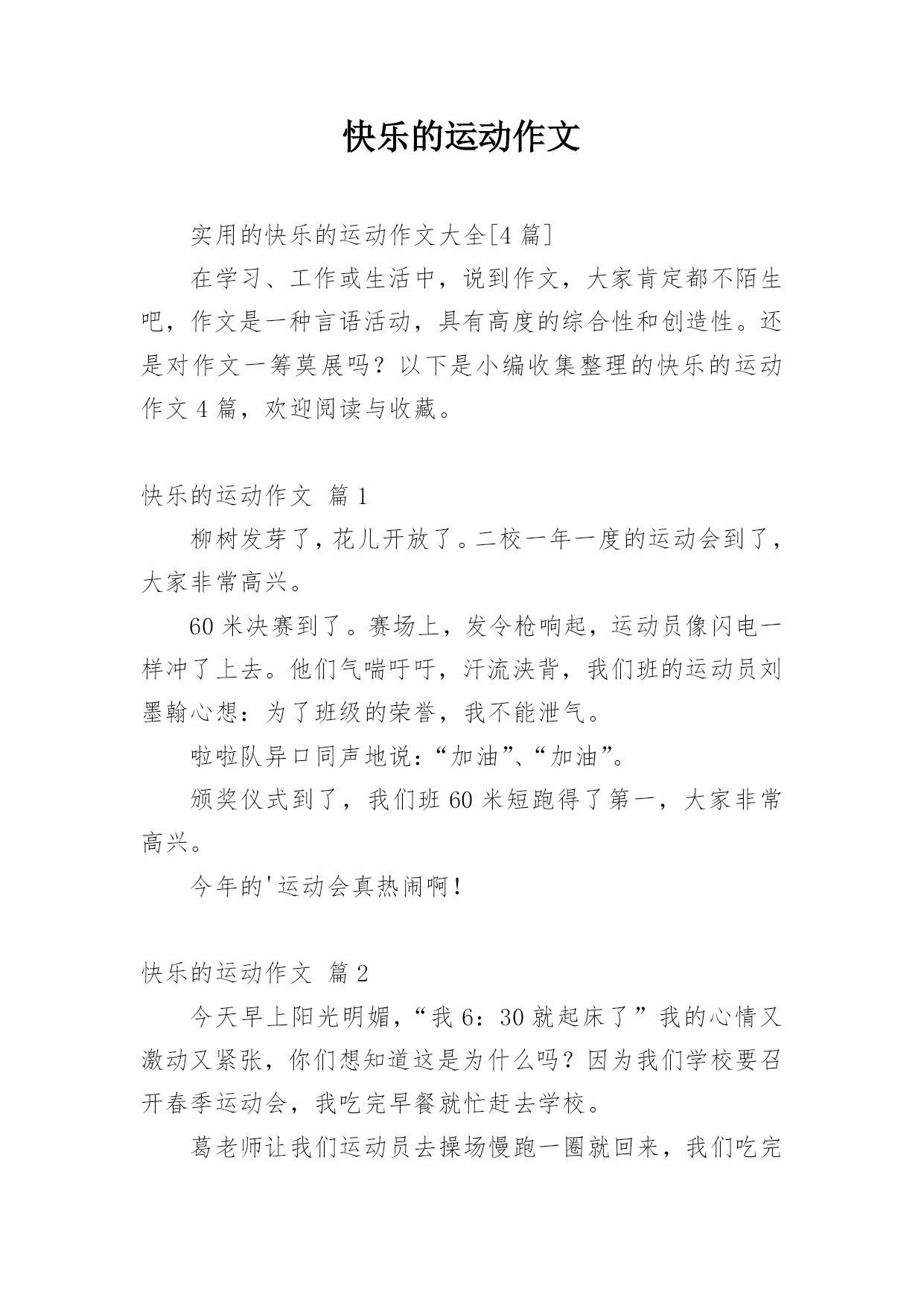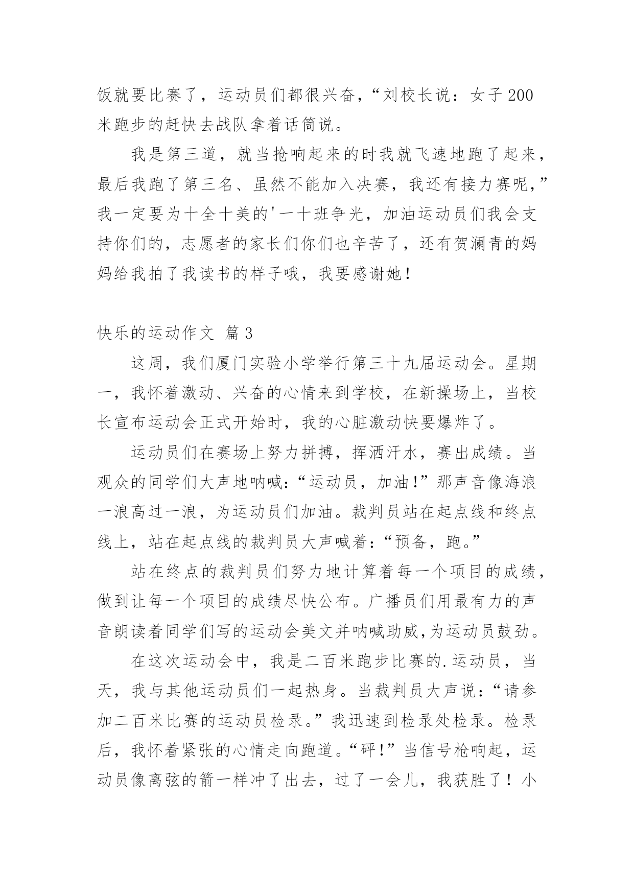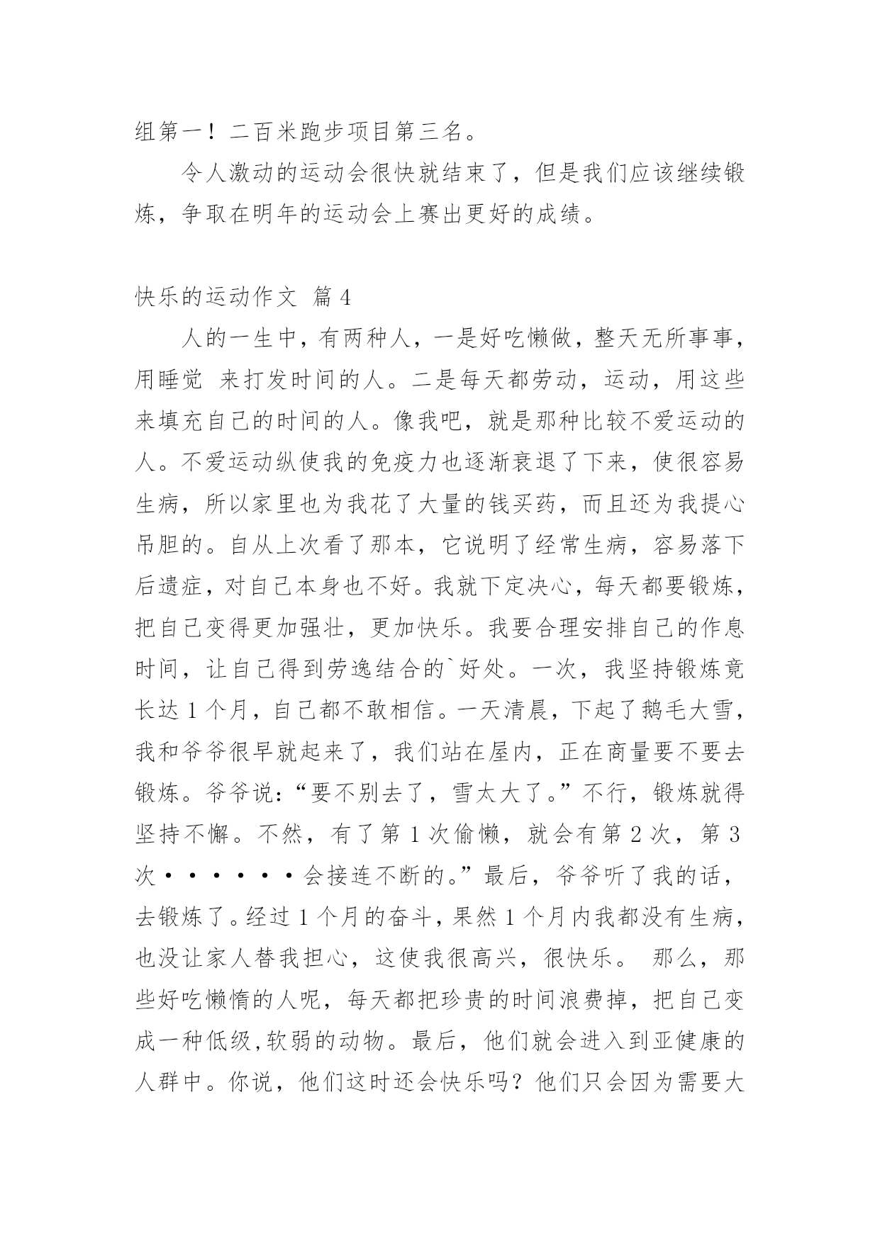 快乐的运动作文实用的快乐的运动作文大全[4篇]在学习、工作或生活中,说到作文,大家肯定都不陌生吧,作文是一种言语活动,具有高度的综合性和创造性。还是对作文一筹莫展吗?以下是小编收集整理的快乐的运动作文4篇,欢迎阅读与收藏。快乐的运动作文篇1柳树发芽了,花儿开放了。二校一年一度的运动会到了,大家非常高兴。60米决赛到了。赛场上,发令枪响起,运动员像闪电一样冲了上去。他们气喘吁吁,汗流浃背,我们班的运动员刘墨翰心想:为了班级的荣誉,我不能泄气。啦啦队异口同声地说:“加油”、“加油”。颁奖仪式到了,我们班60米短跑得了第一,大家非常高兴。今年的'运动会真热闹啊!快乐的运动作文篇2今天早上阳光明媚,“我6:30就起床了”我的心情又激动又紧张,你们想知道这是为什么吗?因为我们学校要召开春季运动会,我吃完早餐就忙赶去学校。葛老师让我们运动员去操场慢跑一圈就回来,我们吃完饭就要比赛了,运动员们都很兴奋,“刘校长说:女子200米跑步的赶快去战队拿着话筒说。我是第三道,就当抢响起来的时我就飞速地跑了起来,最后我跑了第三名、虽然不能加入决赛,我还有接力赛呢,”我一定要为十全十美的'一十班争光,加油运动员们我会支持你们的,志愿者的家长们你们也辛苦了,还有贺澜青的妈妈给我拍了我读书的样子哦,我要感谢她!快乐的运动作文篇3这周,我们厦门实验小学举行第三十九届运动会。星期一,我怀着激动、兴奋的心情来到学校,在新操场上,当校长宣布运动会正式开始时,我的心脏激动快要爆炸了。运动员们在赛场上努力拼搏,挥洒汗水,赛出成绩。当观众的同学们大声地呐喊:“运动员,加油!”那声音像海浪一浪高过一浪,为运动员们加油。裁判员站在起点线和终点线上,站在起点线的裁判员大声喊着:“预备,跑。”站在终点的裁判员们努力地计算着每一个项目的成绩,做到让每一个项目的成绩尽快公布。广播员们用最有力的声音朗读着同学们写的运动会美文并呐喊助威,为运动员鼓劲。在这次运动会中,我是二百米跑步比赛的.运动员,当天,我与其他运动员们一起热身。当裁判员大声说:“请参加二百米比赛的运动员检录。”我迅速到检录处检录。检录后,我怀着紧张的心情走向跑道。“砰!”当信号枪响起,运动员像离弦的箭一样冲了出去,过了一会儿,我获胜了!小组第一!二百米跑步项目第三名。令人激动的运动会很快就结束了,但是我们应该继续锻炼,争取在明年的运动会上赛出更好的成绩。快乐的运动作文篇4人的一生中,有两种人,一是好吃懒做,整天无所事事,用睡觉来打发时间的人。二是每天都劳动,运动,用这些来填充自己的时间的人。像我吧,就是那种比较不爱运动的人。不爱运动纵使我的免疫力也逐渐衰退了下来,使很容易生病,所以家里也为我花了大量的钱买药,而且还为我提心吊胆的。自从上次看了那本,它说明了经常生病,容易落下后遗症,对自己本身也不好。我就下定决心,每天都要锻炼,把自己变得更加强壮,更加快乐。我要合理安排自己的作息时间,让自己得到劳逸结合的`好处。一次,我坚持锻炼竟长达1个月,自己都不敢相信。一天清晨,下起了鹅毛大雪,我和爷爷很早就起来了,我们站在屋内,正在商量要不要去锻炼。爷爷说:“要不别去了,雪太大了。”不行,锻炼就得坚持不懈。不然,有了第1次偷懒,就会有第2次,第3次······会接连不断的。”最后,爷爷听了我的话,去锻炼了。经过1个月的奋斗,果然1个月内我都没有生病,也没让家人替我担心,这使我很高兴,很快乐。那么,那些好吃懒惰的人呢,每天都把珍贵的时间浪费掉,把自己变成一种低级,软弱的动物。最后,他们就会进入到亚健康的人群中。你说,他们这时还会快乐吗?他们只会因为需要大量的钱财去治病,反而治不了本而苦恼,只会日见衰弱。而每天坚持锻炼的人就不一样了,他们把自己变得更加强壮了,就不容易生病,也就自然快乐起来了。总之一句话:只要坚持不懈的运动,就会有健康,才会得到快乐。