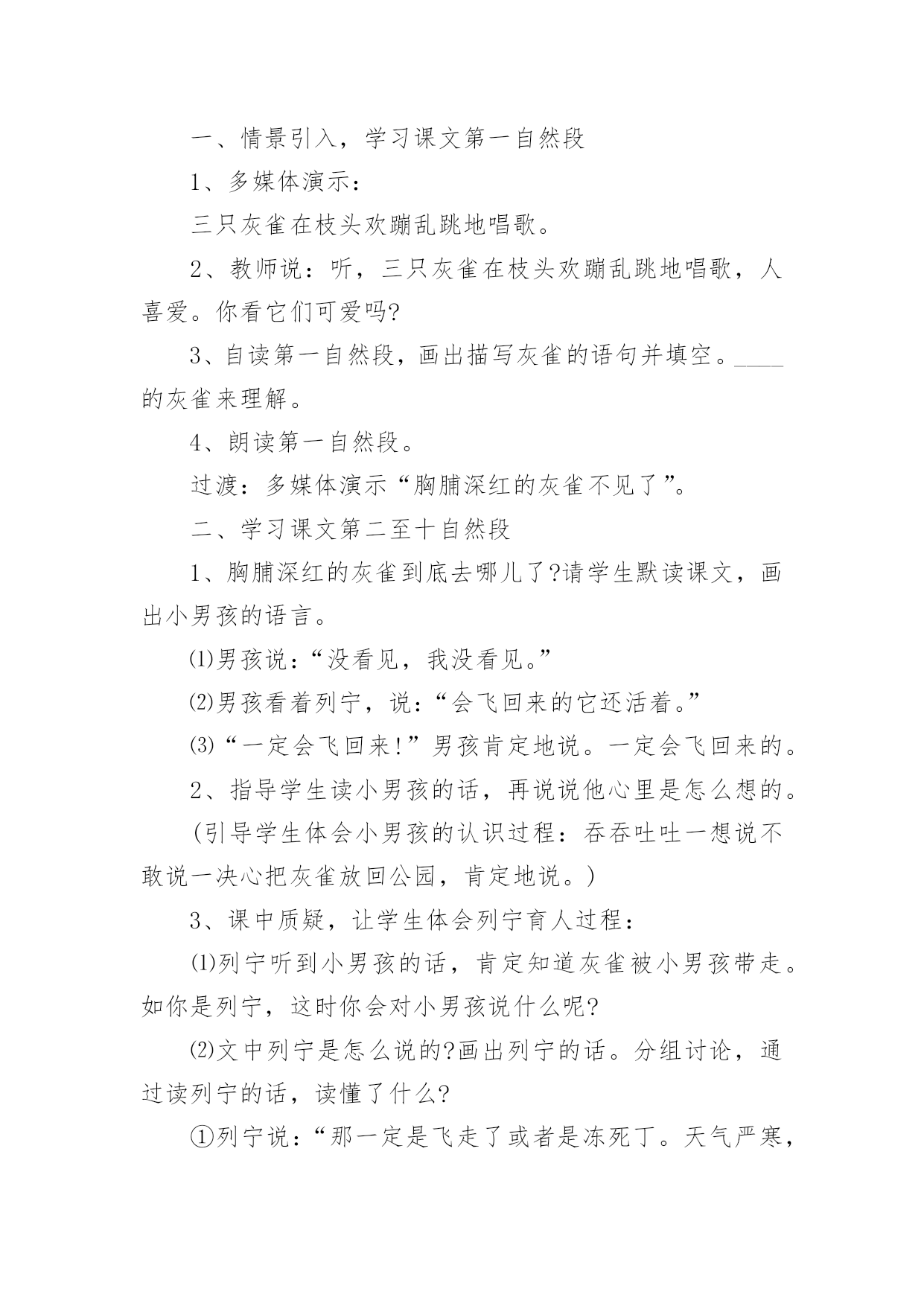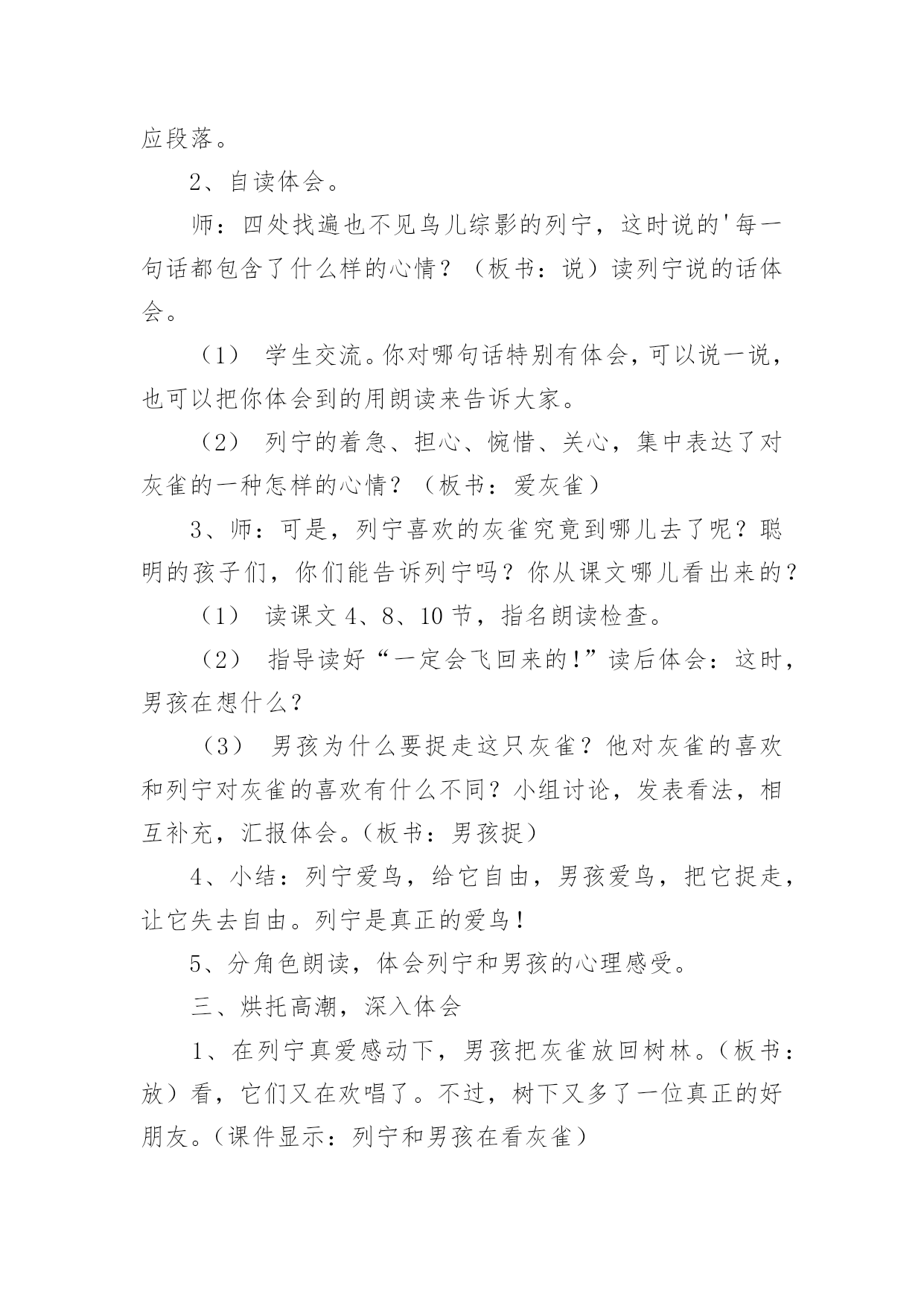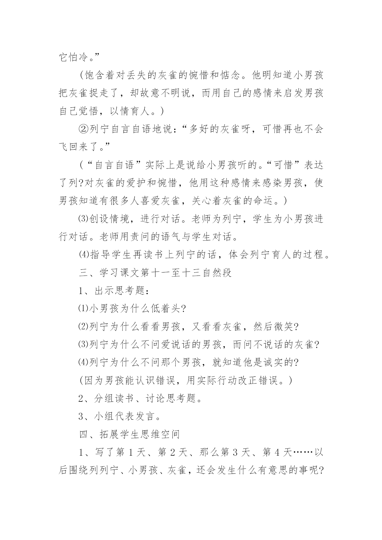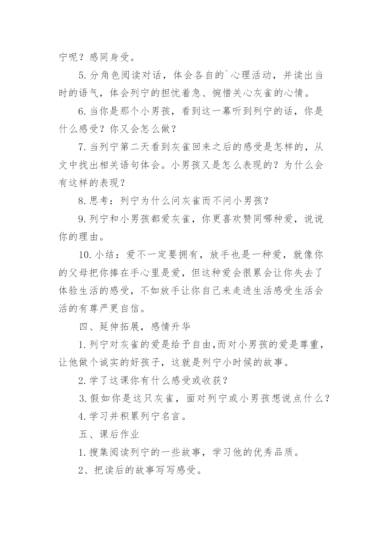 《灰雀》教学设计《灰雀》教学设计作为一名专为他人授业解惑的人民教师,通常需要用到教学设计来辅助教学,教学设计是一个系统设计并实现学习目标的过程,它遵循学习效果最优的原则吗,是课件开发质量高低的关键所在。那么教学设计应该怎么写才合适呢?以下是小编整理的《灰雀》教学设计,欢迎阅读与收藏。《灰雀》教学设计1一、情境引入激发兴趣(多媒体:三只灰雀在枝头欢蹦乱跳地唱歌。)看,三只灰雀在枝头欢蹦乱跳地唱歌,多惹人喜爱。列宁每天散步都来到这里,和他们打招呼。一天,列宁有来到白桦树下,发现那只胸脯深红色的灰雀,不见了!(随机点击课件:列宁在树下仰望灰雀。)二、精读课文,感悟真爱1、提出学习要求:列宁在周围的树林中找遍了,也没找到。(板书:列宁找)这时,列宁看见一个男孩。列宁和男孩说了什么?(1)要求:自由读课文3—10自然段,用------画出列宁此时的心情。(2)检查学生自读情况,教师相机点击课件,出示相应段落。2、自读体会。师:四处找遍也不见鸟儿综影的列宁,这时说的'每一句话都包含了什么样的心情?(板书:说)读列宁说的话体会。(1)学生交流。你对哪句话特别有体会,可以说一说,也可以把你体会到的用朗读来告诉大家。(2)列宁的着急、担心、惋惜、关心,集中表达了对灰雀的一种怎样的心情?(板书:爱灰雀)3、师:可是,列宁喜欢的灰雀究竟到哪儿去了呢?聪明的孩子们,你们能告诉列宁吗?你从课文哪儿看出来的?(1)读课文4、8、10节,指名朗读检查。(2)指导读好“一定会飞回来的!”读后体会:这时,男孩在想什么?(3)男孩为什么要捉走这只灰雀?他对灰雀的喜欢和列宁对灰雀的喜欢有什么不同?小组讨论,发表看法,相互补充,汇报体会。(板书:男孩捉)4、小结:列宁爱鸟,给它自由,男孩爱鸟,把它捉走,让它失去自由。列宁是真正的爱鸟!5、分角色朗读,体会列宁和男孩的心理感受。三、烘托高潮,深入体会1、在列宁真爱感动下,男孩把灰雀放回树林。(板书:放)看,它们又在欢唱了。不过,树下又多了一位真正的好朋友。(课件显示:列宁和男孩在看灰雀)2、学习课文11-13自然段,自由朗读体会。3、读了这几段,你有什么问题吗?学生交流,提出质疑。4、小组讨论,解答:男孩送回了灰雀,为什么还低头?鸟儿不会说话,为什么列宁要和它说话?引导学生深入体会:男孩知错就改,列宁尊重孩子,理解孩子,他可不愿上海孩子的新,这就是对孩子的爱!(板书:爱诚实)5、你们一定也和列宁一样,为鸟儿重归自然,为男孩改正错误而高兴吧!拿起书来,美美地读读课文最后三个自然段。6、小结(板书:可爱)总结课文。四、学习生字,指导书写五、收集故事,提高积累1、学了这篇课文,你发现了什么?2、回家收集列宁或其他名人的故事,准备开展讲故事比赛。《灰雀》教学设计2教学目标:1.认识本课的生字新词,理解词语意思,能正确读写“郊外、散步、胸脯”等词语。2.正确、流利有感情地朗读课文,联系上下文读懂文中的语句。(这是本课教学重点)3.了解列宁用爱鸟之情感染、启发孩子放鸟归园的故事,体会列宁爱鸟更爱孩子的情感,懂得知错就改是诚实的表现。(这是本课的教学难点)教学过程:一、讲故事,引出人物1.出示《蜜蜂引路》的故事,让学生阅读并找出主人公,说说他是个怎样的人?2.介绍人物:列宁简介(出示课件)3.讲述故事《诚实的孩子》认识小时候的列宁为本课内容做铺垫。今天,我们要学习有关列宁的另一个故事《灰雀》,从题目看好像看不出他们之间有什么关联,那我们就一起走进文本去了解内容吧。(板书课题)二、初读了解内容,感知情节1.自由读课文,用自己喜欢的方式学习生字新词,不懂得查字典或同桌交流学习。2.检查预习,认读生字新词(出示课件)指名让学生来读并帮助纠正字音。3.读懂课文讲了一件什么事?理清思路找出(时间、地点、人物、事件的起因、经过、结果)来概括文本内容。三、理解内容,体会感情1.从文中的哪些语句中可以看出列宁对灰雀的喜爱?列宁为什么喜欢灰雀?2.理解词语意思,体会列宁的用心用情。3.当你喜欢一件东西时你会怎么想怎么做?4.当有一天你喜欢的东西不见了,你会是什么感受?列宁呢?感同身受。5.分角色阅读对话,体会各自的`心理活动,并读出当时的语气,体会列宁的担忧着急、惋惜关心灰雀的心情。6.当你是那个小男孩,看到这一幕听到列宁的话,你是什么感受?你又会怎么做?7.当列宁第二天看到灰雀回来之后的感受是怎样的,从文中找出相关语句体会。小男孩又是怎么表现的?为什么会有这样的表现?8.思考:列宁为什么问灰雀而不问小男孩?9.列宁和小男孩都爱灰雀,你更喜欢赞同哪种爱,说说你的理由。10.小结:爱不一定要拥有,放手也是一种爱,就像你的父母把你捧在手心里是爱,但这种爱会很累会让你失去了体验生活的感受,不如放手让你自己来走进生活感受生活会活的有尊严更自信。四、延伸拓
