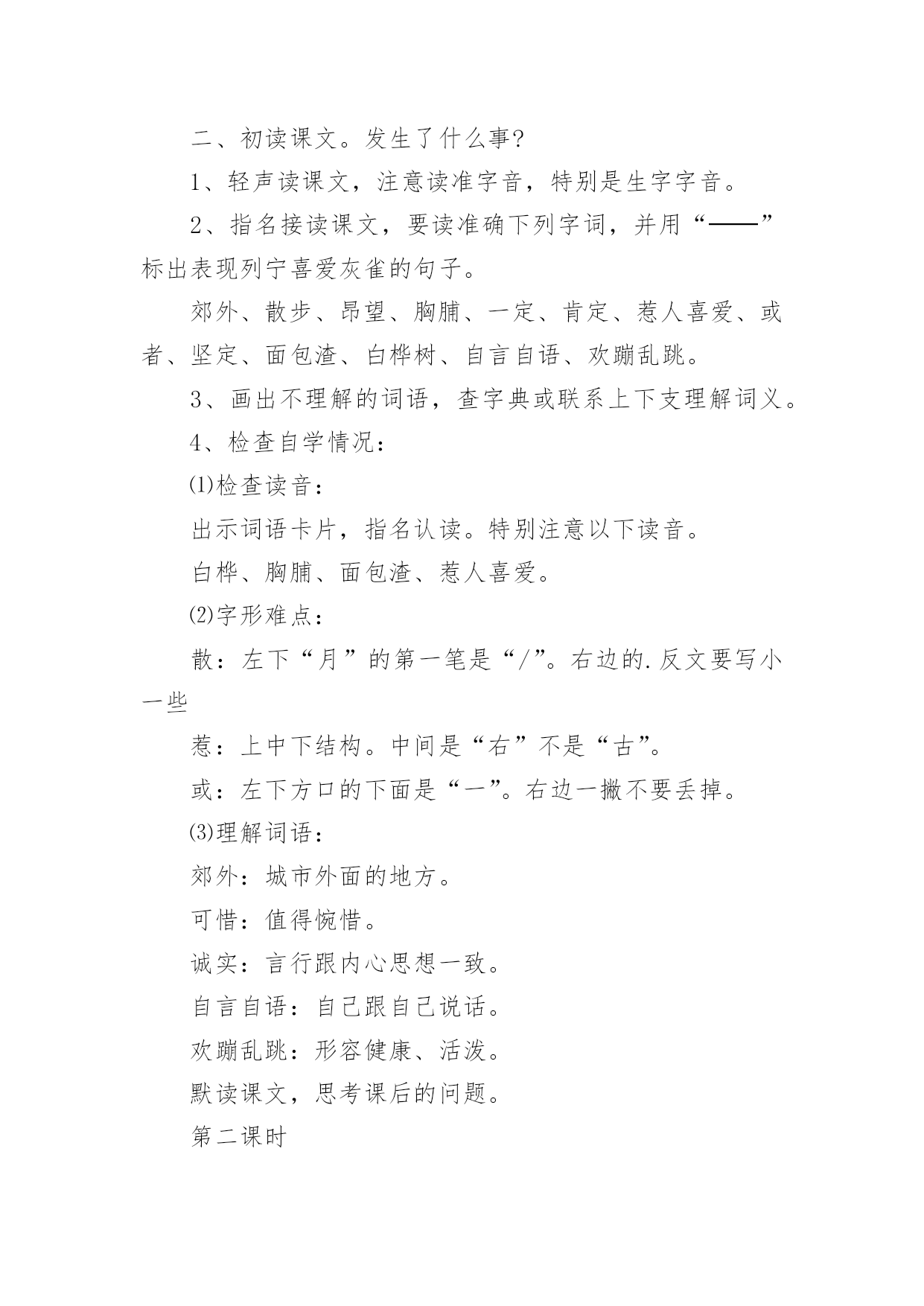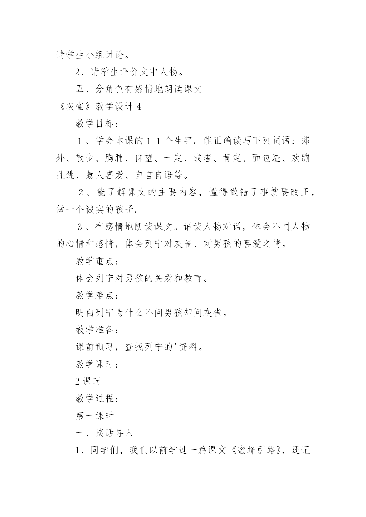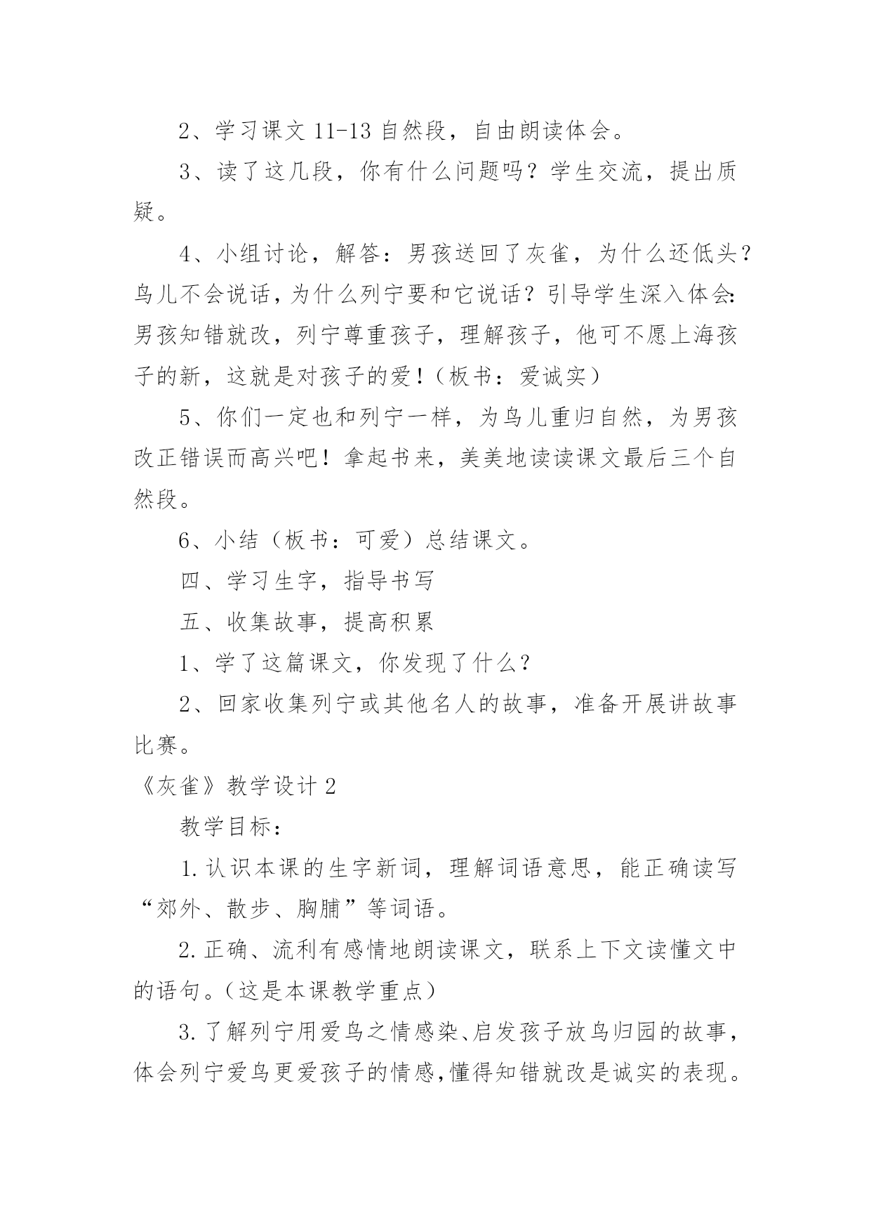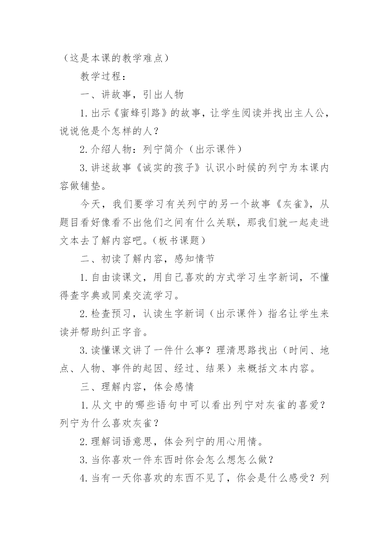 《灰雀》教学设计《灰雀》教学设计作为一名专为他人授业解惑的人民教师,通常需要用到教学设计来辅助教学,教学设计是一个系统设计并实现学习目标的过程,它遵循学习效果最优的原则吗,是课件开发质量高低的关键所在。那么教学设计应该怎么写才合适呢?以下是小编整理的《灰雀》教学设计,欢迎阅读与收藏。《灰雀》教学设计1一、情境引入激发兴趣(多媒体:三只灰雀在枝头欢蹦乱跳地唱歌。)看,三只灰雀在枝头欢蹦乱跳地唱歌,多惹人喜爱。列宁每天散步都来到这里,和他们打招呼。一天,列宁有来到白桦树下,发现那只胸脯深红色的灰雀,不见了!(随机点击课件:列宁在树下仰望灰雀。)二、精读课文,感悟真爱1、提出学习要求:列宁在周围的树林中找遍了,也没找到。(板书:列宁找)这时,列宁看见一个男孩。列宁和男孩说了什么?(1)要求:自由读课文3—10自然段,用------画出列宁此时的心情。(2)检查学生自读情况,教师相机点击课件,出示相应段落。2、自读体会。师:四处找遍也不见鸟儿综影的列宁,这时说的'每一句话都包含了什么样的心情?(板书:说)读列宁说的话体会。(1)学生交流。你对哪句话特别有体会,可以说一说,也可以把你体会到的用朗读来告诉大家。(2)列宁的着急、担心、惋惜、关心,集中表达了对灰雀的一种怎样的心情?(板书:爱灰雀)3、师:可是,列宁喜欢的灰雀究竟到哪儿去了呢?聪明的孩子们,你们能告诉列宁吗?你从课文哪儿看出来的?(1)读课文4、8、10节,指名朗读检查。(2)指导读好“一定会飞回来的!”读后体会:这时,男孩在想什么?(3)男孩为什么要捉走这只灰雀?他对灰雀的喜欢和列宁对灰雀的喜欢有什么不同?小组讨论,发表看法,相互补充,汇报体会。(板书:男孩捉)4、小结:列宁爱鸟,给它自由,男孩爱鸟,把它捉走,让它失去自由。列宁是真正的爱鸟!5、分角色朗读,体会列宁和男孩的心理感受。三、烘托高潮,深入体会1、在列宁真爱感动下,男孩把灰雀放回树林。(板书:放)看,它们又在欢唱了。不过,树下又多了一位真正的好朋友。(课件显示:列宁和男孩在看灰雀)2、学习课文11-13自然段,自由朗读体会。3、读了这几段,你有什么问题吗?学生交流,提出质疑。4、小组讨论,解答:男孩送回了灰雀,为什么还低头?鸟儿不会说话,为什么列宁要和它说话?引导学生深入体会:男孩知错就改,列宁尊重孩子,理解孩子,他可不愿上海孩子的新,这就是对孩子的爱!(板书:爱诚实)5、你们一定也和列宁一样,为鸟儿重归自然,为男孩改正错误而高兴吧!拿起书来,美美地读读课文最后三个自然段。6、小结(板书:可爱)总结课文。四、学习生字,指导书写五、收集故事,提高积累1、学了这篇课文,你发现了什么?2、回家收集列宁或其他名人的故事,准备开展讲故事比赛。《灰雀》教学设计2教学目标:1.认识本课的生字新词,理解词语意思,能正确读写“郊外、散步、胸脯”等词语。2.正确、流利有感情地朗读课文,联系上下文读懂文中的语句。(这是本课教学重点)3.了解列宁用爱鸟之情感染、启发孩子放鸟归园的故事,体会列宁爱鸟更爱孩子的情感,懂得知错就改是诚实的表现。(这是本课的教学难点)教学过程:一、讲故事,引出人物1.出示《蜜蜂引路》的故事,让学生阅读并找出主人公,说说他是个怎样的人?2.介绍人物:列宁简介(出示课件)3.讲述故事《诚实的孩子》认识小时候的列宁为本课内容做铺垫。今天,我们要学习有关列宁的另一个故事《灰雀》,从题目看好像看不出他们之间有什么关联,那我们就一起走进文本去了解内容吧。(板书课题)二、初读了解内容,感知情节1.自由读课文,用自己喜欢的方式学习生字新词,不懂得查字典或同桌交流学习。2.检查预习,认读生字新词(出示课件)指名让学生来读并帮助纠正字音。3.读懂课文讲了一件什么事?理清思路找出(时间、地点、人物、事件的起因、经过、结果)来概括文本内容。三、理解内容,体会感情1.从文中的哪些语句中可以看出列宁对灰雀的喜爱?列宁为什么喜欢灰雀?2.理解词语意思,体会列宁的用心用情。3.当你喜欢一件东西时你会怎么想怎么做?4.当有一天你喜欢的东西不见了,你会是什么感受?列宁呢?感同身受。5.分角色阅读对话,体会各自的`心理活动,并读出当时的语气,体会列宁的担忧着急、惋惜关心灰雀的心情。6.当你是那个小男孩,看到这一幕听到列宁的话,你是什么感受?你又会怎么做?7.当列宁第二天看到灰雀回来之后的感受是怎样的,从文中找出相关语句体会。小男孩又是怎么表现的?为什么会有这样的表现?8.思考:列宁为什么问灰雀而不问小男孩?9.列宁和小男孩都爱灰雀,你更喜欢赞同哪种爱,说说你的理由。10.小结:爱不一定要拥有,放手也是一种爱,就像你的父母把你捧在手心里是爱,但这种爱会很累会让你失去了体验生活的感受,不如放手让你自己来走进生活感受生活会活的有尊严更自信。四、延伸拓