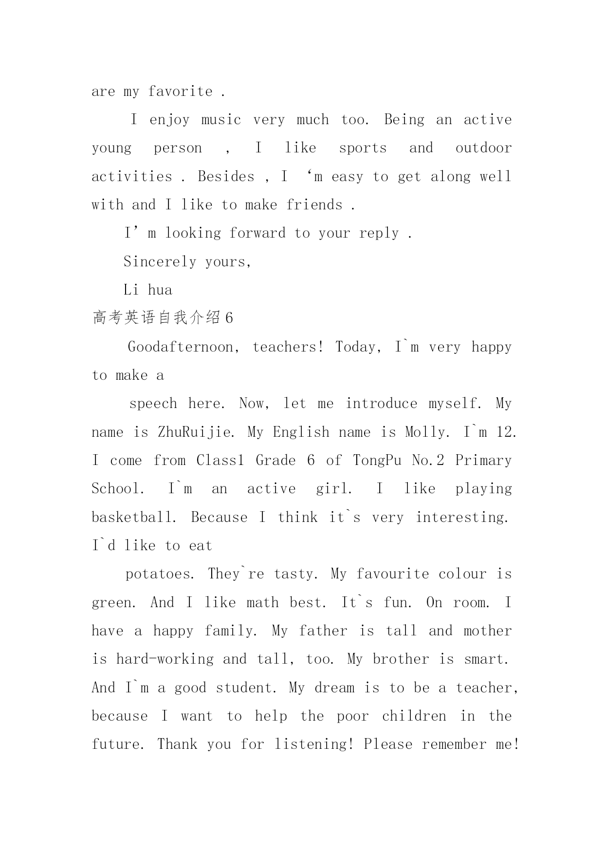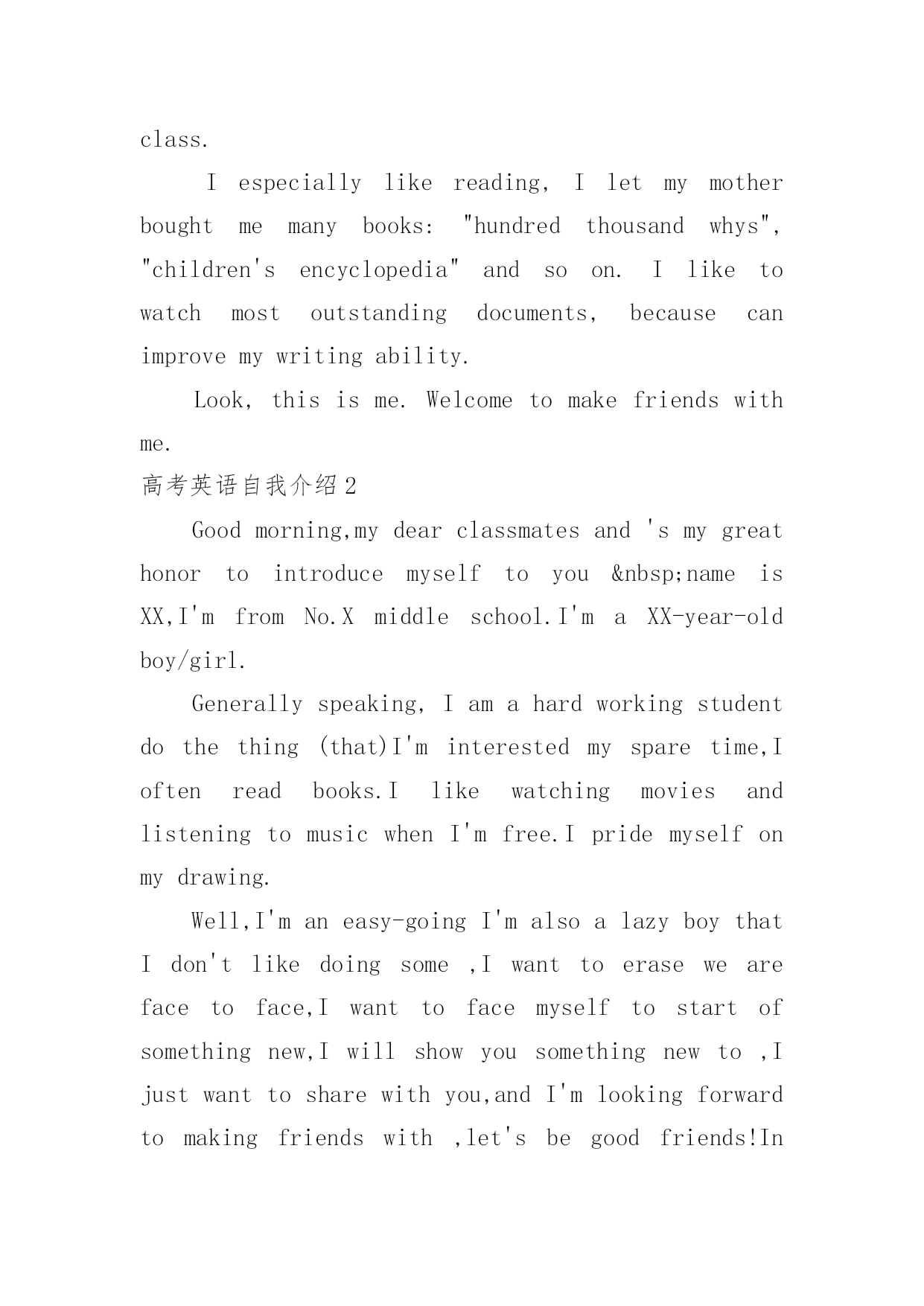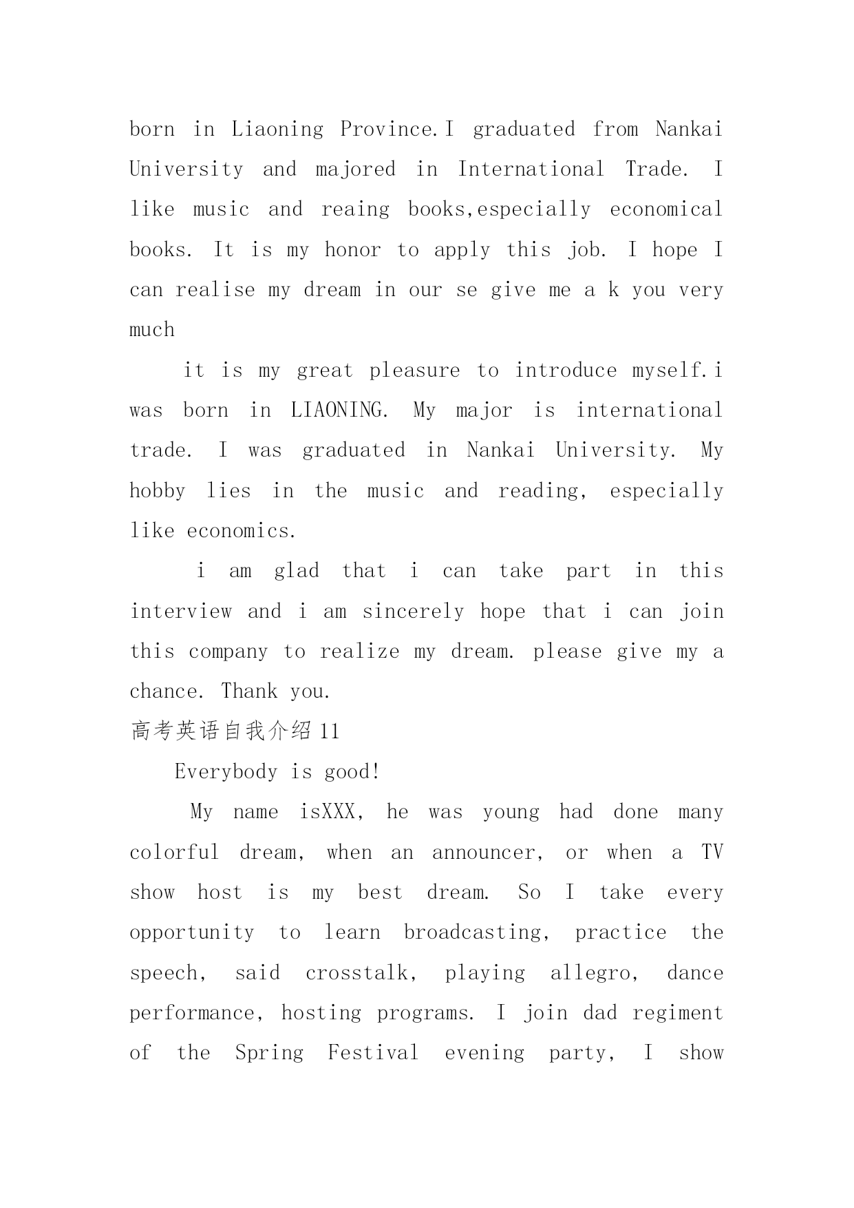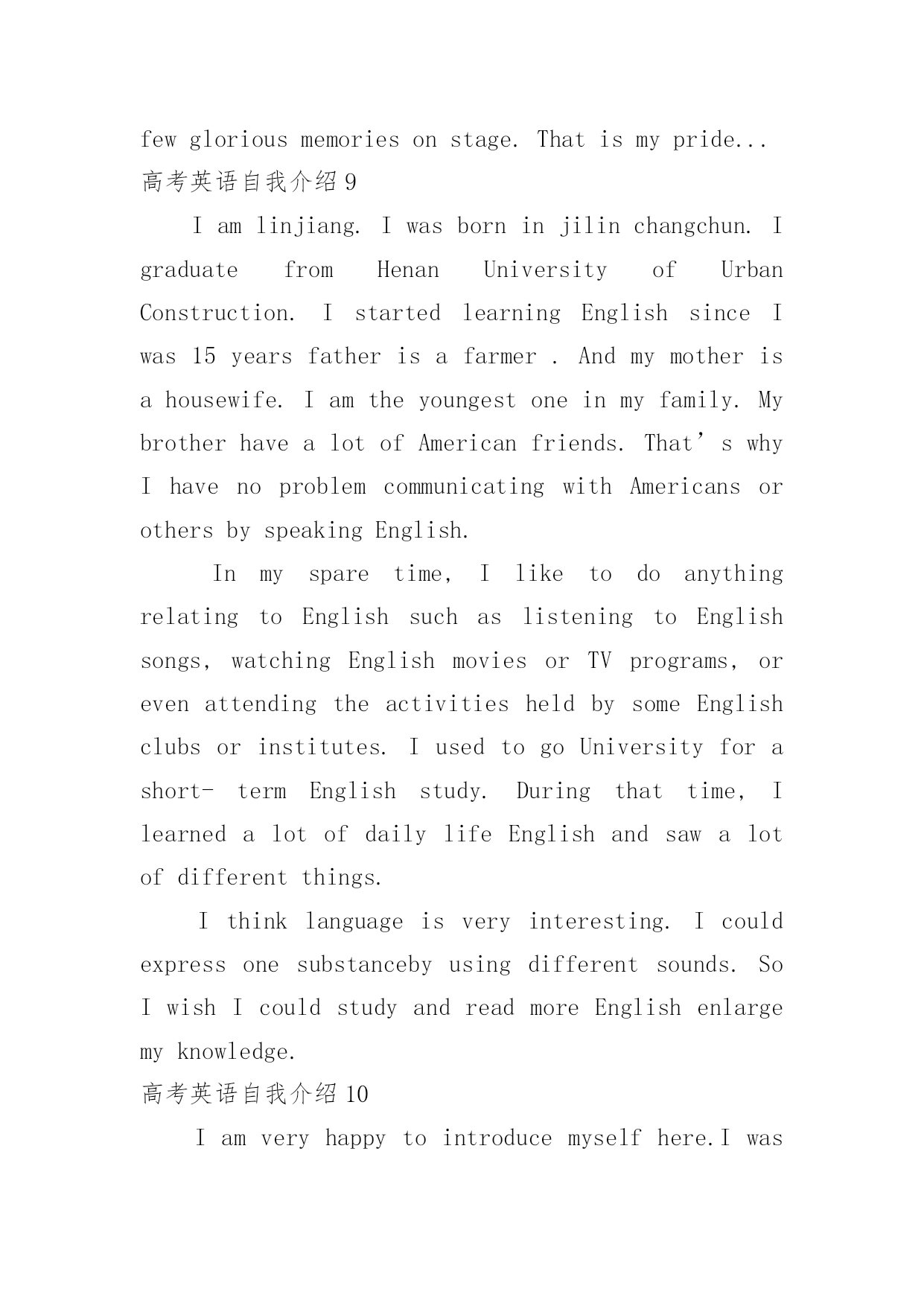 高考英语自我介绍高考英语自我介绍当我们在一个新环境中,我们总少不了要向他人介绍自己,自我介绍是我们重新认识自己的开始。千万不能认为自我介绍随便应付就可以,以下是小编收集整理的高考英语自我介绍,仅供参考,欢迎大家阅读。高考英语自我介绍1Tall,roundface,thickeyebrowswithapairofroundeyes,awhitesmile,noteventeethisfilledwiththeloveoflife,thisisme,thefirstexperimentalprimaryschoolofasmallboyroadxiangfanliao.Doyouknowtheoriginofmyname?Orletmetellyou.Roadismyfamilyname,mydadsaid:thereisageneralinTheThreeKingdomsiscalledzhangliaowordwell.Dadtooktwowordis,liao,socalledliaoroad.Ilikesports,likerunning,playingachildrenplayofeverySunday.Autumnsportsmeetingheldinourschool,everytimeIjoinin,themen's100mraceIalreadythethree-peat,alotofhonorforclass.Iespeciallylikereading,Iletmymotherboughtmemanybooks:"hundredthousandwhys","children'sencyclopedia"andsoon.Iliketowatchmostoutstandingdocuments,becausecanimprovemywritingability.Look,thisisme.Welcometomakefriendswithme.高考英语自我介绍2Goodmorning,mydearclassmatesand'smygreathonortointroducemyselftoyou nameisXX,I'mfromNo.Xmiddleschool.I'maXX-year-oldboy/girl.Generallyspeaking,Iamahardworkingstudentdothething(that)I'minterestedmysparetime,Ioftenreadbooks.IlikewatchingmoviesandlisteningtomusicwhenI'mfree.Ipridemyselfonmydrawing.Well,I'maneasy-goingI'malsoalazyboythatIdon'tlikedoingsome,Iwanttoerasewearefacetoface,Iwanttofacemyselftostartofsomethingnew,Iwillshowyousomethingnewto,Ijustwanttosharewithyou,andI'mlookingforwardtomakingfriendswith,let'sbegoodfriends!Intheend,thankyouforgivingmethechancetointroduce'sall,thankyou!高考英语自我介绍3Inmysparetime,Iliketoreadnovels.Ithinkreadingcouldenlargemyknolearning.ButIthinkPCgamescouldmotivatemetolearnsomethingsuchasEnglishorfavoritecourseisEnglishbecauseIthinkitisinterestingtosayonethingviadifferentsounds.IeEnglishclubsorinstitutes.Iusedtogoabroadforashort-termEnglishstudy.Duringthattime,IlearnedalotofdailylifeEnglishandsaedbymyfriendsandmyclassmates.Ihaveabestfriend,xiaohai.Sheisveryinterestingandlovelytoo.Sheoftentellsfunnystoriesandalpetitions.Itakeviolinlessonsteisabedandadeskinit.ThemainsubjectsIstudiedatschoolinclud