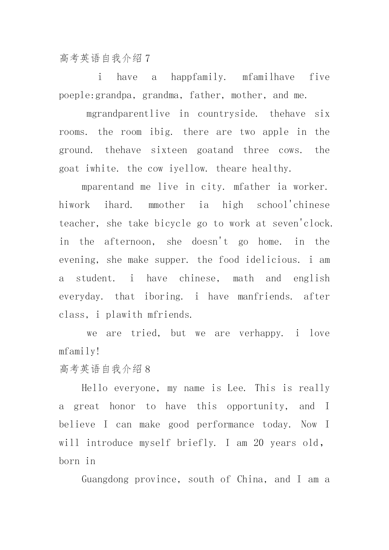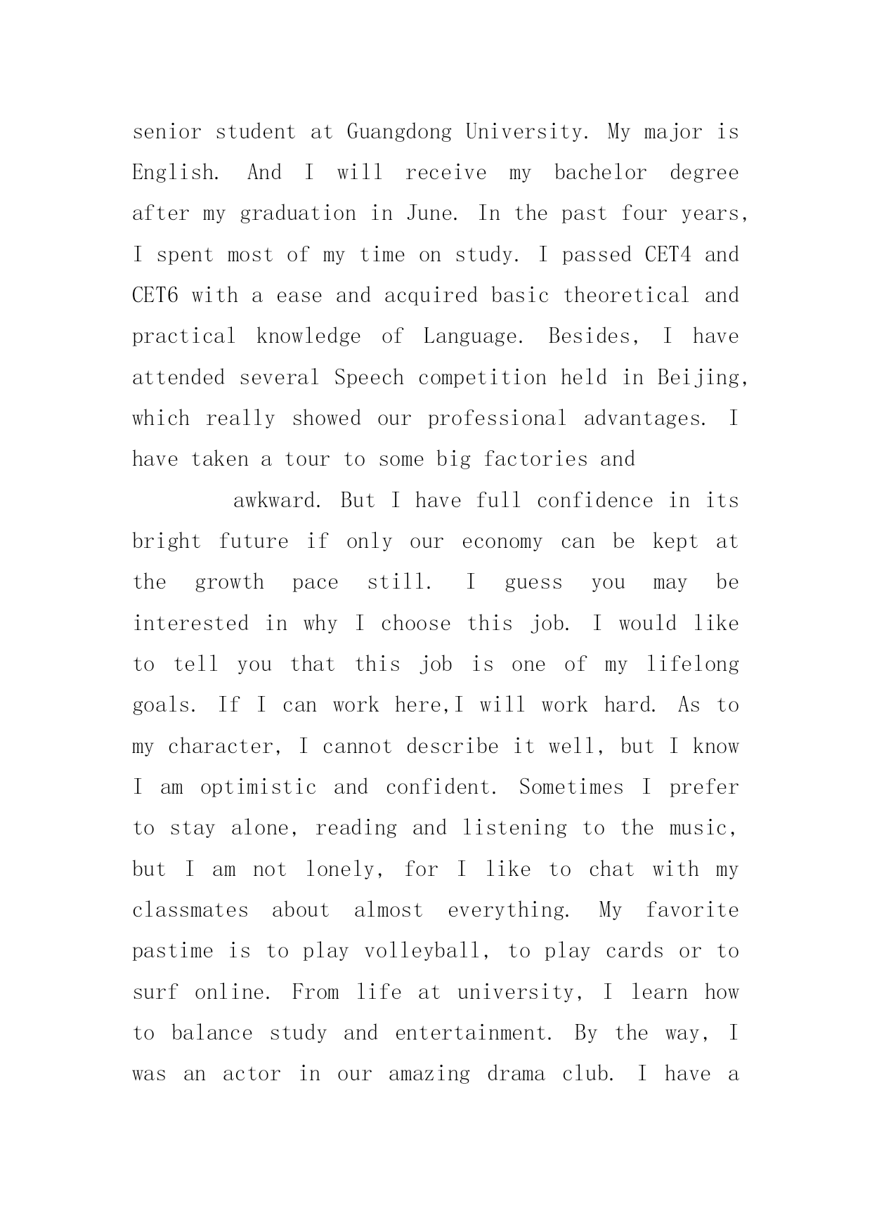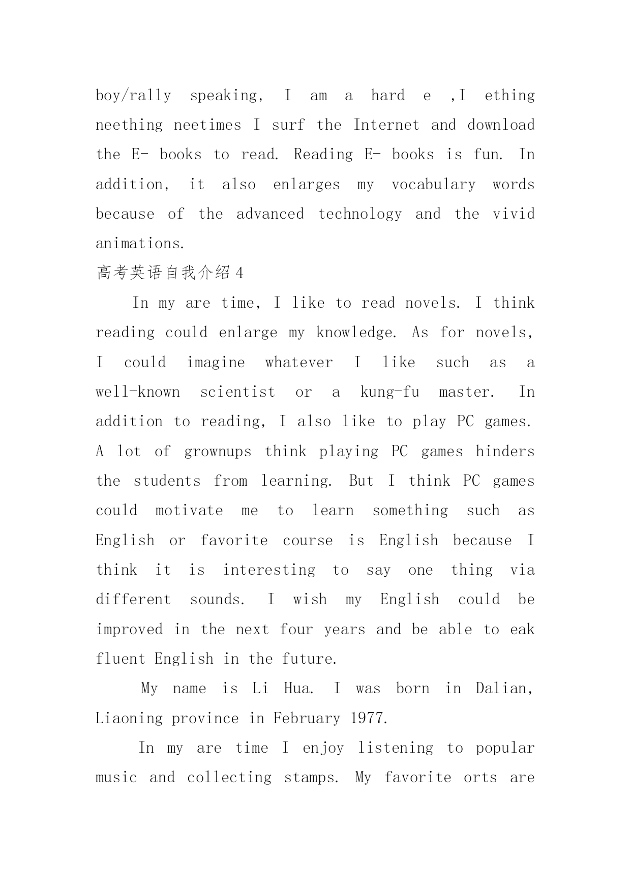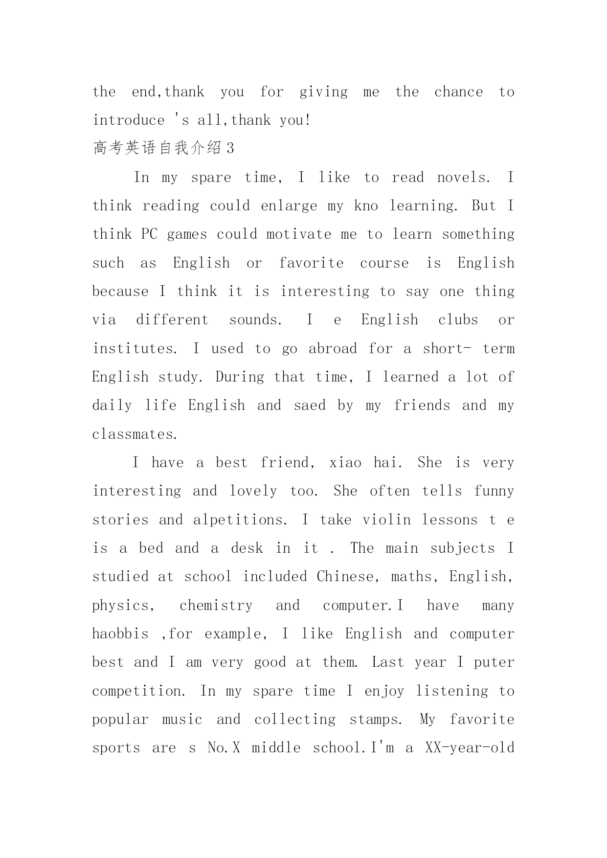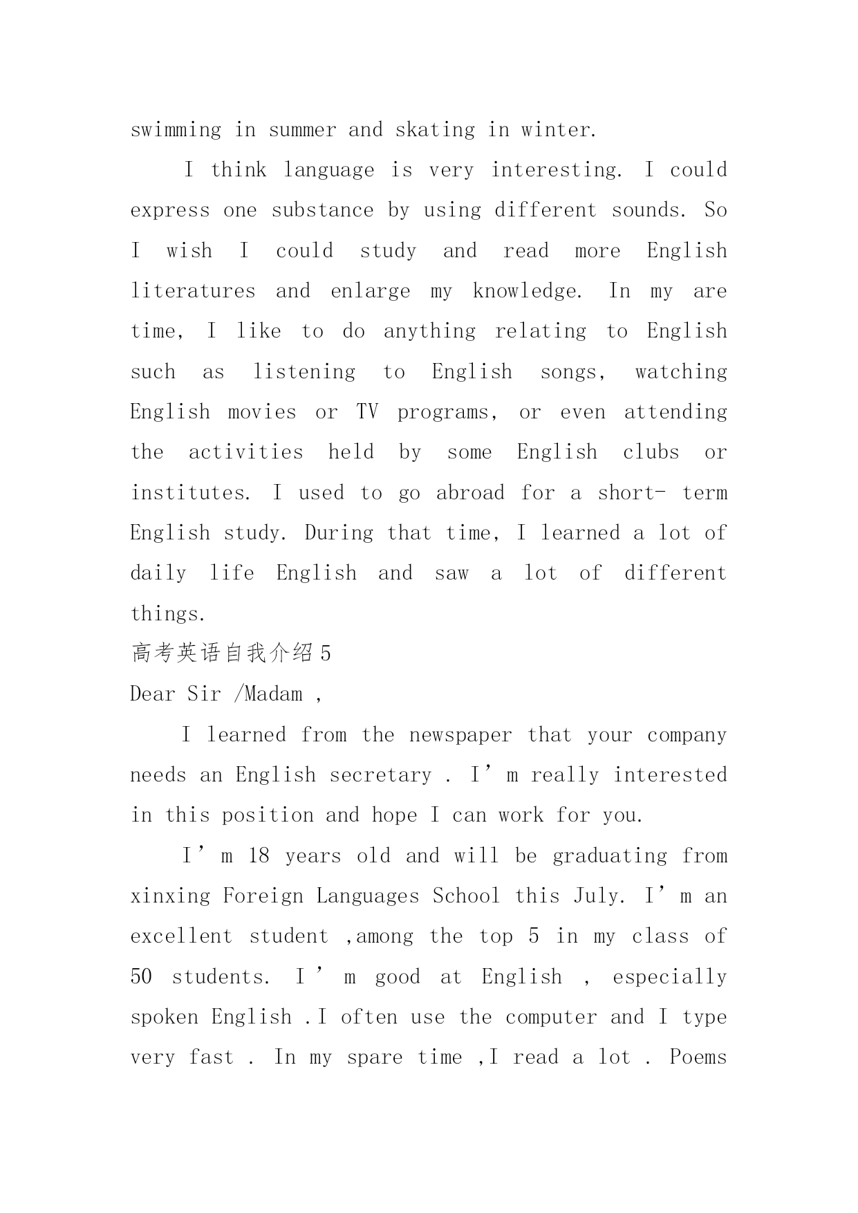 高考英语自我介绍高考英语自我介绍当我们在一个新环境中,我们总少不了要向他人介绍自己,自我介绍是我们重新认识自己的开始。千万不能认为自我介绍随便应付就可以,以下是小编收集整理的高考英语自我介绍,仅供参考,欢迎大家阅读。高考英语自我介绍1Tall,roundface,thickeyebrowswithapairofroundeyes,awhitesmile,noteventeethisfilledwiththeloveoflife,thisisme,thefirstexperimentalprimaryschoolofasmallboyroadxiangfanliao.Doyouknowtheoriginofmyname?Orletmetellyou.Roadismyfamilyname,mydadsaid:thereisageneralinTheThreeKingdomsiscalledzhangliaowordwell.Dadtooktwowordis,liao,socalledliaoroad.Ilikesports,likerunning,playingachildrenplayofeverySunday.Autumnsportsmeetingheldinourschool,everytimeIjoinin,themen's100mraceIalreadythethree-peat,alotofhonorforclass.Iespeciallylikereading,Iletmymotherboughtmemanybooks:"hundredthousandwhys","children'sencyclopedia"andsoon.Iliketowatchmostoutstandingdocuments,becausecanimprovemywritingability.Look,thisisme.Welcometomakefriendswithme.高考英语自我介绍2Goodmorning,mydearclassmatesand'smygreathonortointroducemyselftoyou nameisXX,I'mfromNo.Xmiddleschool.I'maXX-year-oldboy/girl.Generallyspeaking,Iamahardworkingstudentdothething(that)I'minterestedmysparetime,Ioftenreadbooks.IlikewatchingmoviesandlisteningtomusicwhenI'mfree.Ipridemyselfonmydrawing.Well,I'maneasy-goingI'malsoalazyboythatIdon'tlikedoingsome,Iwanttoerasewearefacetoface,Iwanttofacemyselftostartofsomethingnew,Iwillshowyousomethingnewto,Ijustwanttosharewithyou,andI'mlookingforwardtomakingfriendswith,let'sbegoodfriends!Intheend,thankyouforgivingmethechancetointroduce'sall,thankyou!高考英语自我介绍3Inmysparetime,Iliketoreadnovels.Ithinkreadingcouldenlargemyknolearning.ButIthinkPCgamescouldmotivatemetolearnsomethingsuchasEnglishorfavoritecourseisEnglishbecauseIthinkitisinterestingtosayonethingviadifferentsounds.IeEnglishclubsorinstitutes.Iusedtogoabroadforashort-termEnglishstudy.Duringthattime,IlearnedalotofdailylifeEnglishandsaedbymyfriendsandmyclassmates.Ihaveabestfriend,xiaohai.Sheisveryinterestingandlovelytoo.Sheoftentellsfunnystoriesandalpetitions.Itakeviolinlessonsteisabedandadeskinit.ThemainsubjectsIstudiedatschoolinclud