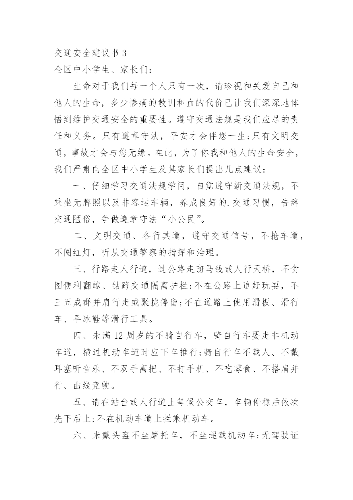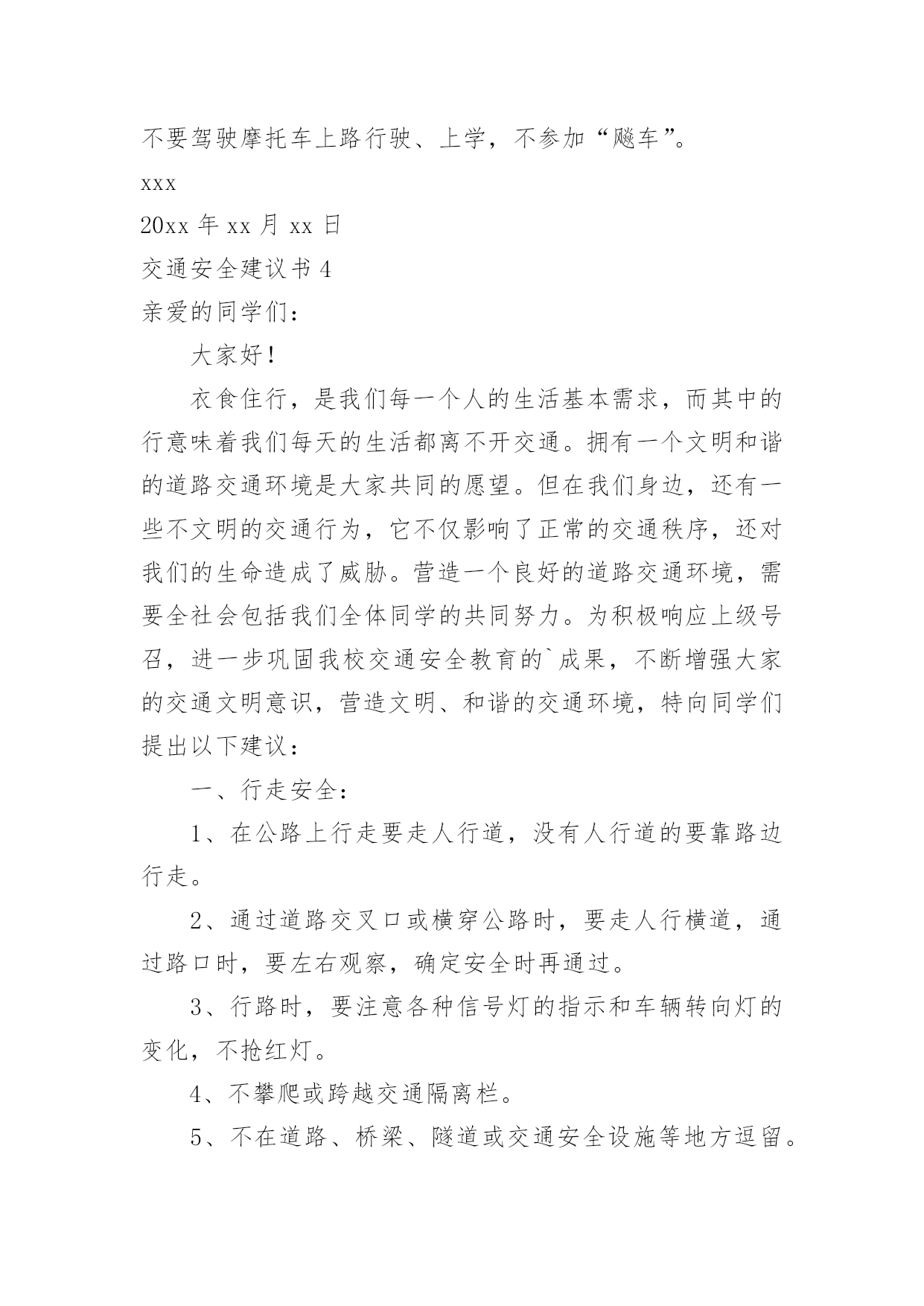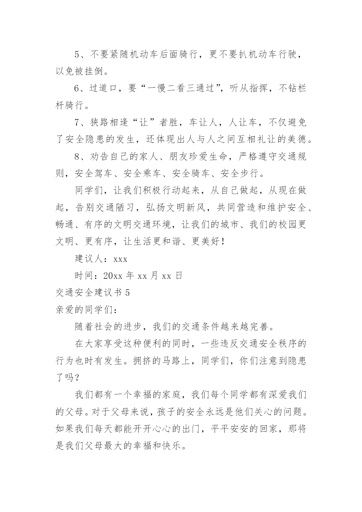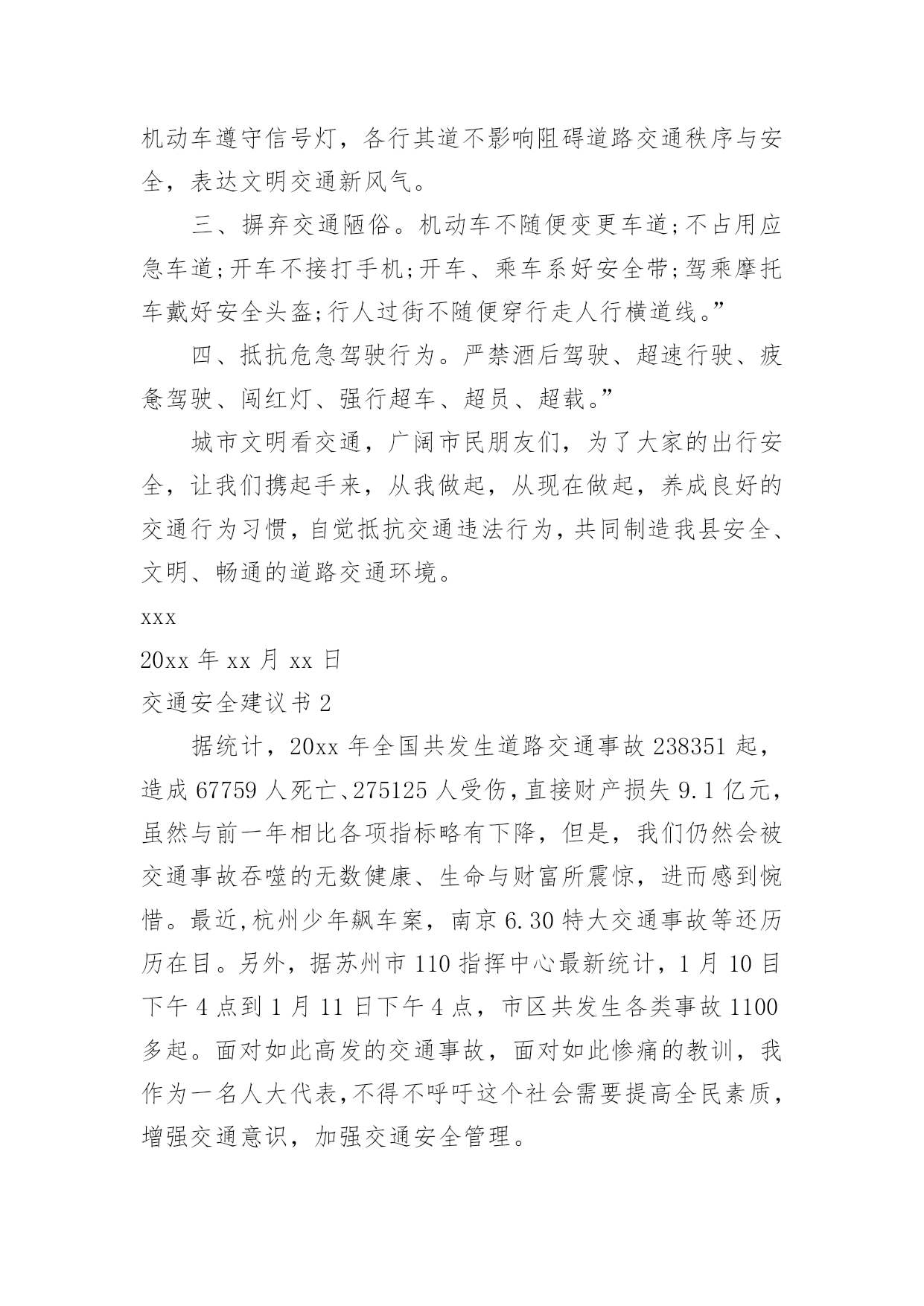 交通安全建议书交通安全建议书15篇在不断进步的时代,我们需要用到建议书的情形越来越多,建议书不是最终的定文形式,它可以被修改,被增删,甚至弃之不用,它具有较强的可塑性。怎么写建议书才能避免踩雷呢?下面是小编为大家收集的交通安全建议书,供大家参考借鉴,希望可以帮助到有需要的朋友。交通安全建议书1为维护良好的城市交通秩序,提升城市文明程度和品尝,营造安全、畅通、和谐、文明的交通环境,我们每个人都应当自觉成为文明交通的宣传者、推动者、践行者。自觉遵守道路交通安全法律法规,努力提倡文明交通新风是每个公民应尽的责任和义务。为此,我们发出“文明交通、我们行动”建议:一、从标准停车做起。机动车在道路两侧停车时,应当在施划的.道路停车泊位内顺向停放。临时停车时,均不得阻碍其他车辆和行人正常通行。严禁在道路穿插口、应急通道口等法律明令制止的地点乱停乱放。非机动车也应在指定区域或不阻碍通行的地点统一摆放整齐。二、提倡文明交通行为。机动车礼让斑马线;机动车按序排队通行;机动车有序停放;文明正确使用车灯;行人、非机动车遵守信号灯,各行其道不影响阻碍道路交通秩序与安全,表达文明交通新风气。三、摒弃交通陋俗。机动车不随便变更车道;不占用应急车道;开车不接打手机;开车、乘车系好安全带;驾乘摩托车戴好安全头盔;行人过街不随便穿行走人行横道线。”四、抵抗危急驾驶行为。严禁酒后驾驶、超速行驶、疲惫驾驶、闯红灯、强行超车、超员、超载。”城市文明看交通,广阔市民朋友们,为了大家的出行安全,让我们携起手来,从我做起,从现在做起,养成良好的交通行为习惯,自觉抵抗交通违法行为,共同制造我县安全、文明、畅通的道路交通环境。xxx20xx年xx月xx日交通安全建议书2据统计,20xx年全国共发生道路交通事故238351起,造成67759人死亡、275125人受伤,直接财产损失9.1亿元,虽然与前一年相比各项指标略有下降,但是,我们仍然会被交通事故吞噬的无数健康、生命与财富所震惊,进而感到惋惜。最近,杭州少年飙车案,南京6.30特大交通事故等还历历在目。另外,据苏州市110指挥中心最新统计,1月10目下午4点到1月11日下午4点,市区共发生各类事故1100多起。面对如此高发的交通事故,面对如此惨痛的教训,我作为一名人大代表,不得不呼吁这个社会需要提高全民素质,增强交通意识,加强交通安全管理。一要培养文明意识。道路交通事故不断发生,交通秩序不良,原因是多方面的,不可仅仅归咎于道路设施与车辆技术状况。统计数据表明,交通事故的发生90%以上责任在驾驶员与行人,交通不畅主要原因是由于乱停乱放、抢超强会与交通参与者随心所欲的交通行为的形成。减轻灾难,缓解混乱的交通秩序,公众的文明交通意识的养成就显得格外重要。由于陋习根深蒂固,文明交通风气的形成不是朝夕所能,要长期不懈的坚持,要把培养广大群众文明交通的意识,提高现代交通的水平,作为社会主义精神文明建设的一项内容,采取多种教育方式,逐步养成自觉文明的`交通习惯,使交通参与者遵章守法由被动转为主动,由不自觉变为自觉,才能从根本上改善交通状况。第一、加强学习。无论是驾驶员还是行人,都应该学习、遵守、自觉贯彻交通安全知识。驾驶员更应该本着对社会负责的态度,通过不断学习熟练掌握驾驶技术与各种应急处理方法,提高个人的驾驶技术,杜绝“马路杀手”上路现象。第二、加强培训。对新出台的关于交通的法律法规,政府部门要牵头组织普及与培训,让那些已经取得驾驶证的,正在考取驾驶证的,甚至行人了解关于交法的最新规定,从而更好的知法守法。二要强化监督管理。当今社会,机动车驾驶员已成为现代化社会人们必备的生活技能之一,越来越多的人口袋里装有不同类型的驾驶证。然而一本驾驶证并不代表就是一位合格的驾驶员。有的驾校培养出来的驾驶员有的不懂交规,有的不会识别交通标志、标线,有的驾驶不熟练,情急之下分不清油门与离合,有的甚至肇事后逃逸。因此,作为政府部门,我们要强化监督管理职能,对他们给予更多的关心。第一、加强交管执行力。我们要立足当前,着眼长远,制定与实施有利于交通专项整治的政策措施,着力提高交通安全。要抓住重点,集中力量,整治酒后驾车、超载、超速等交通安全隐患。提高对于恶性超载、超速等现象的处罚力度,同时,可以对他们采取教育式处罚,进交通安全教育学习班培训半天。特别对于酒后驾车现象,要有明确的法律处罚标准。符合犯罪构成要件的要移交司法机关。各公安部门,交通管理部门,司法部门要严格按照法律严惩,要做到法律面前人人平等。第二、逐级落实社会责任。把交通专项整治的工作分到各部门,建立领导负责制与问责制。将交通事故的减少率纳入政府部门干部综合考核评价工作中。第三、严把资格审核关。目前,严格规范与管理驾驶员资格考试已成当务之急。有关部门要敢于动真碰硬,严肃驾驶员理论与实际操作考试纪律,