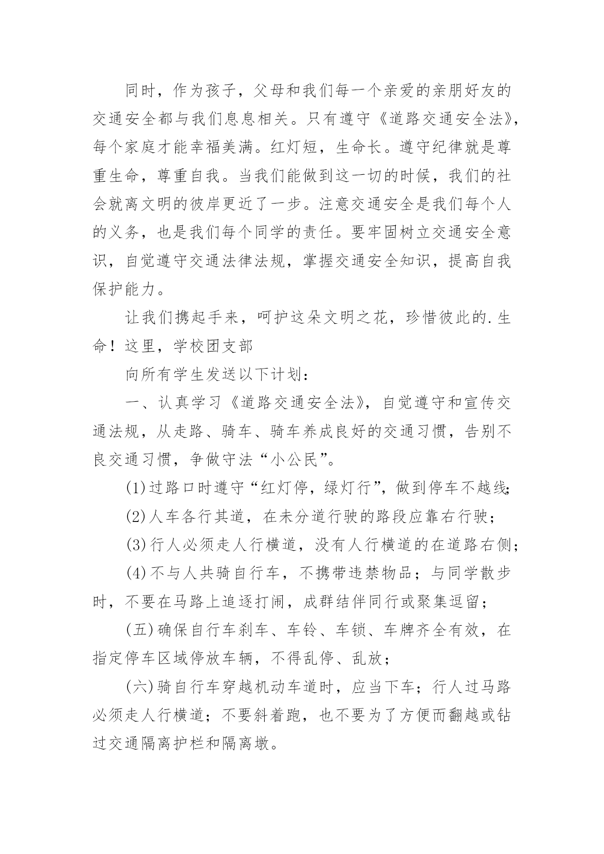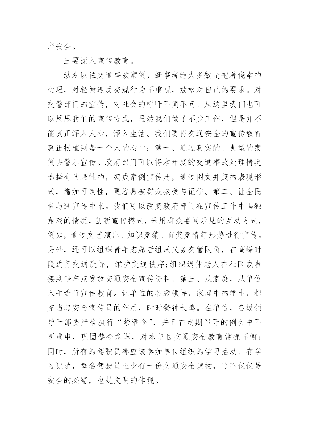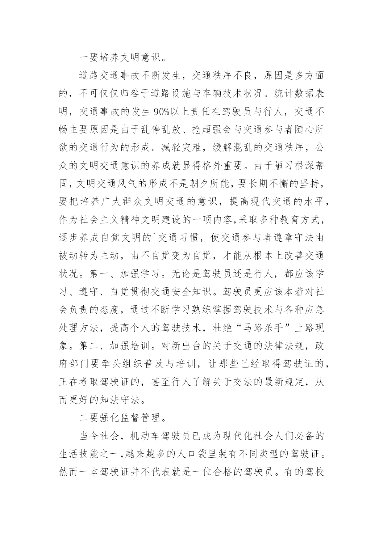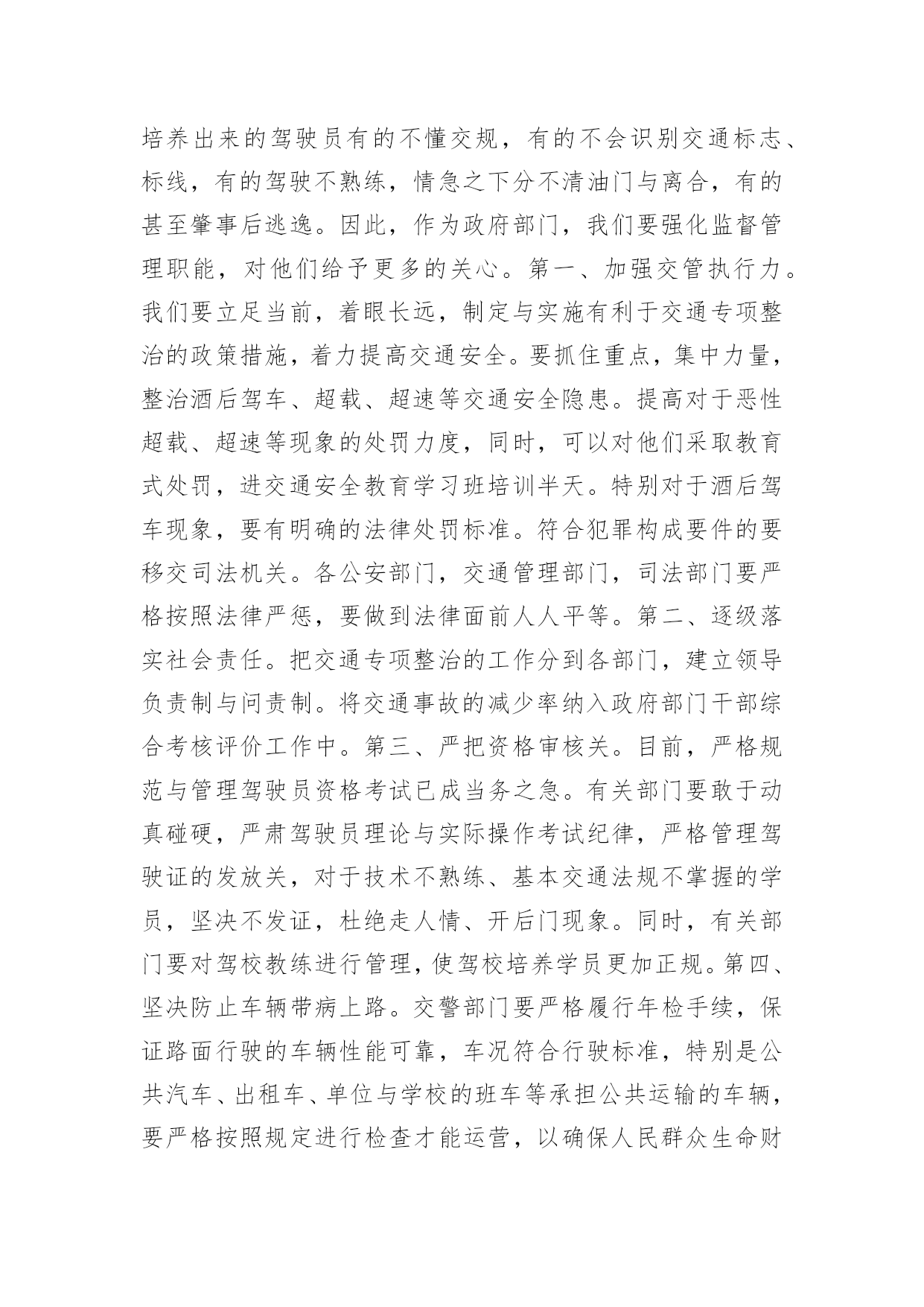 交通安全建议书交通安全建议书15篇在不断进步的时代,我们需要用到建议书的情形越来越多,建议书不是最终的定文形式,它可以被修改,被增删,甚至弃之不用,它具有较强的可塑性。怎么写建议书才能避免踩雷呢?下面是小编为大家收集的交通安全建议书,供大家参考借鉴,希望可以帮助到有需要的朋友。交通安全建议书1为维护良好的城市交通秩序,提升城市文明程度和品尝,营造安全、畅通、和谐、文明的交通环境,我们每个人都应当自觉成为文明交通的宣传者、推动者、践行者。自觉遵守道路交通安全法律法规,努力提倡文明交通新风是每个公民应尽的责任和义务。为此,我们发出“文明交通、我们行动”建议:一、从标准停车做起。机动车在道路两侧停车时,应当在施划的.道路停车泊位内顺向停放。临时停车时,均不得阻碍其他车辆和行人正常通行。严禁在道路穿插口、应急通道口等法律明令制止的地点乱停乱放。非机动车也应在指定区域或不阻碍通行的地点统一摆放整齐。二、提倡文明交通行为。机动车礼让斑马线;机动车按序排队通行;机动车有序停放;文明正确使用车灯;行人、非机动车遵守信号灯,各行其道不影响阻碍道路交通秩序与安全,表达文明交通新风气。三、摒弃交通陋俗。机动车不随便变更车道;不占用应急车道;开车不接打手机;开车、乘车系好安全带;驾乘摩托车戴好安全头盔;行人过街不随便穿行走人行横道线。”四、抵抗危急驾驶行为。严禁酒后驾驶、超速行驶、疲惫驾驶、闯红灯、强行超车、超员、超载。”城市文明看交通,广阔市民朋友们,为了大家的出行安全,让我们携起手来,从我做起,从现在做起,养成良好的交通行为习惯,自觉抵抗交通违法行为,共同制造我县安全、文明、畅通的道路交通环境。xxx20xx年xx月xx日交通安全建议书2据统计,20xx年全国共发生道路交通事故238351起,造成67759人死亡、275125人受伤,直接财产损失9.1亿元,虽然与前一年相比各项指标略有下降,但是,我们仍然会被交通事故吞噬的无数健康、生命与财富所震惊,进而感到惋惜。最近,杭州少年飙车案,南京6.30特大交通事故等还历历在目。另外,据苏州市110指挥中心最新统计,1月10目下午4点到1月11日下午4点,市区共发生各类事故1100多起。面对如此高发的交通事故,面对如此惨痛的教训,我作为一名人大代表,不得不呼吁这个社会需要提高全民素质,增强交通意识,加强交通安全管理。一要培养文明意识。道路交通事故不断发生,交通秩序不良,原因是多方面的,不可仅仅归咎于道路设施与车辆技术状况。统计数据表明,交通事故的发生90%以上责任在驾驶员与行人,交通不畅主要原因是由于乱停乱放、抢超强会与交通参与者随心所欲的交通行为的形成。减轻灾难,缓解混乱的交通秩序,公众的文明交通意识的养成就显得格外重要。由于陋习根深蒂固,文明交通风气的形成不是朝夕所能,要长期不懈的坚持,要把培养广大群众文明交通的意识,提高现代交通的水平,作为社会主义精神文明建设的一项内容,采取多种教育方式,逐步养成自觉文明的`交通习惯,使交通参与者遵章守法由被动转为主动,由不自觉变为自觉,才能从根本上改善交通状况。第一、加强学习。无论是驾驶员还是行人,都应该学习、遵守、自觉贯彻交通安全知识。驾驶员更应该本着对社会负责的态度,通过不断学习熟练掌握驾驶技术与各种应急处理方法,提高个人的驾驶技术,杜绝“马路杀手”上路现象。第二、加强培训。对新出台的关于交通的法律法规,政府部门要牵头组织普及与培训,让那些已经取得驾驶证的,正在考取驾驶证的,甚至行人了解关于交法的最新规定,从而更好的知法守法。二要强化监督管理。当今社会,机动车驾驶员已成为现代化社会人们必备的生活技能之一,越来越多的人口袋里装有不同类型的驾驶证。然而一本驾驶证并不代表就是一位合格的驾驶员。有的驾校培养出来的驾驶员有的不懂交规,有的不会识别交通标志、标线,有的驾驶不熟练,情急之下分不清油门与离合,有的甚至肇事后逃逸。因此,作为政府部门,我们要强化监督管理职能,对他们给予更多的关心。第一、加强交管执行力。我们要立足当前,着眼长远,制定与实施有利于交通专项整治的政策措施,着力提高交通安全。要抓住重点,集中力量,整治酒后驾车、超载、超速等交通安全隐患。提高对于恶性超载、超速等现象的处罚力度,同时,可以对他们采取教育式处罚,进交通安全教育学习班培训半天。特别对于酒后驾车现象,要有明确的法律处罚标准。符合犯罪构成要件的要移交司法机关。各公安部门,交通管理部门,司法部门要严格按照法律严惩,要做到法律面前人人平等。第二、逐级落实社会责任。把交通专项整治的工作分到各部门,建立领导负责制与问责制。将交通事故的减少率纳入政府部门干部综合考核评价工作中。第三、严把资格审核关。目前,严格规范与管理驾驶员资格考试已成当务之急。有关部门要敢于动真碰硬,严肃驾驶员理论与实际操作考试纪律,