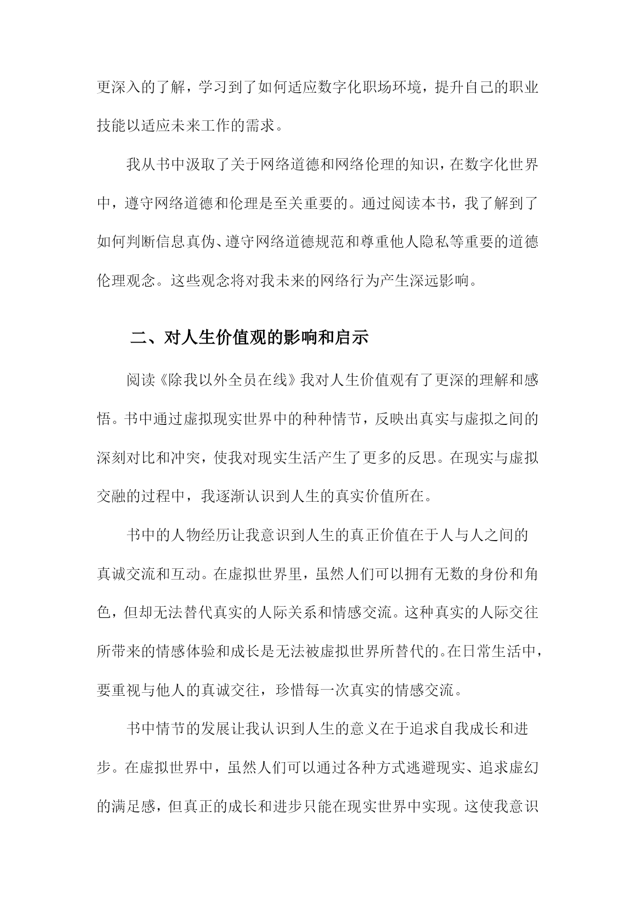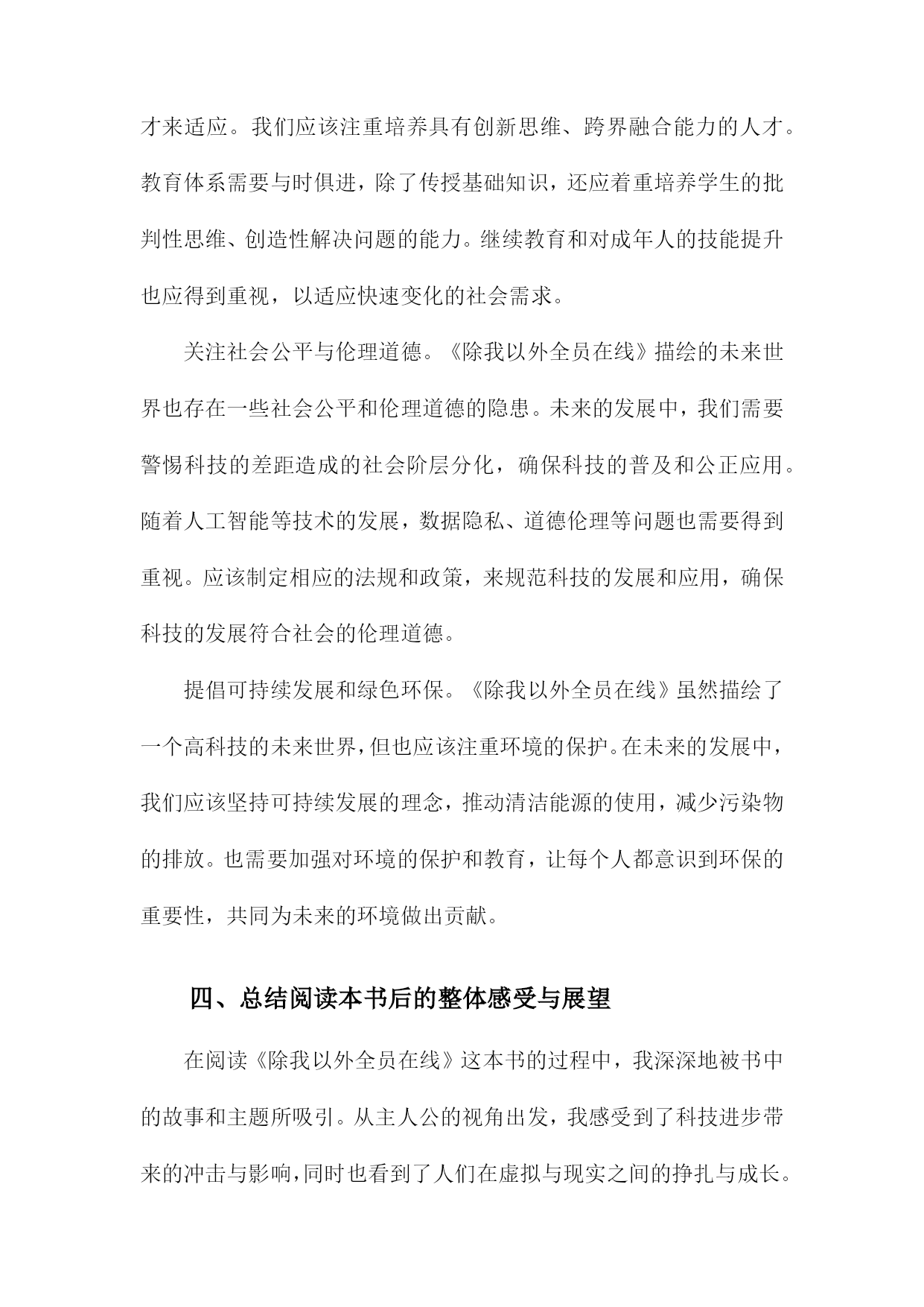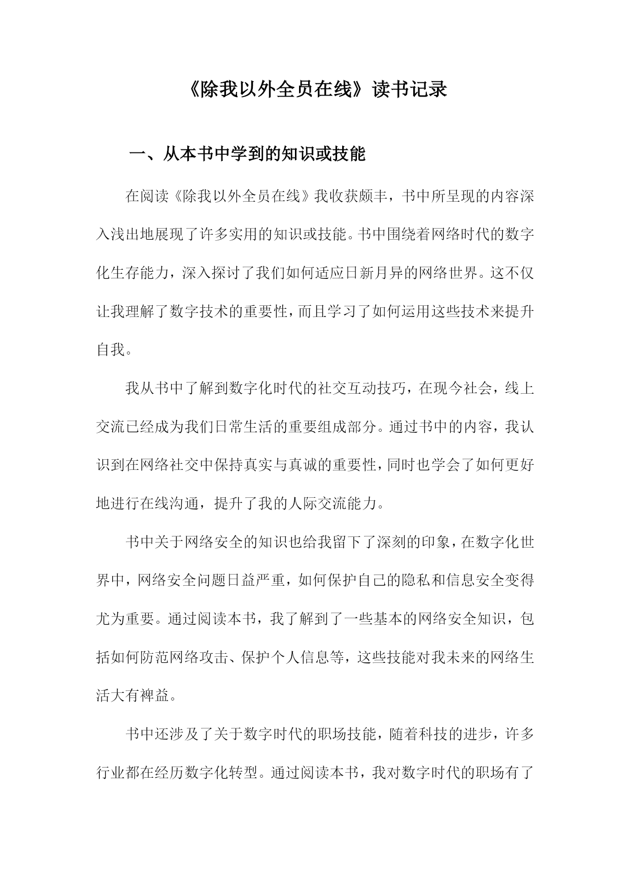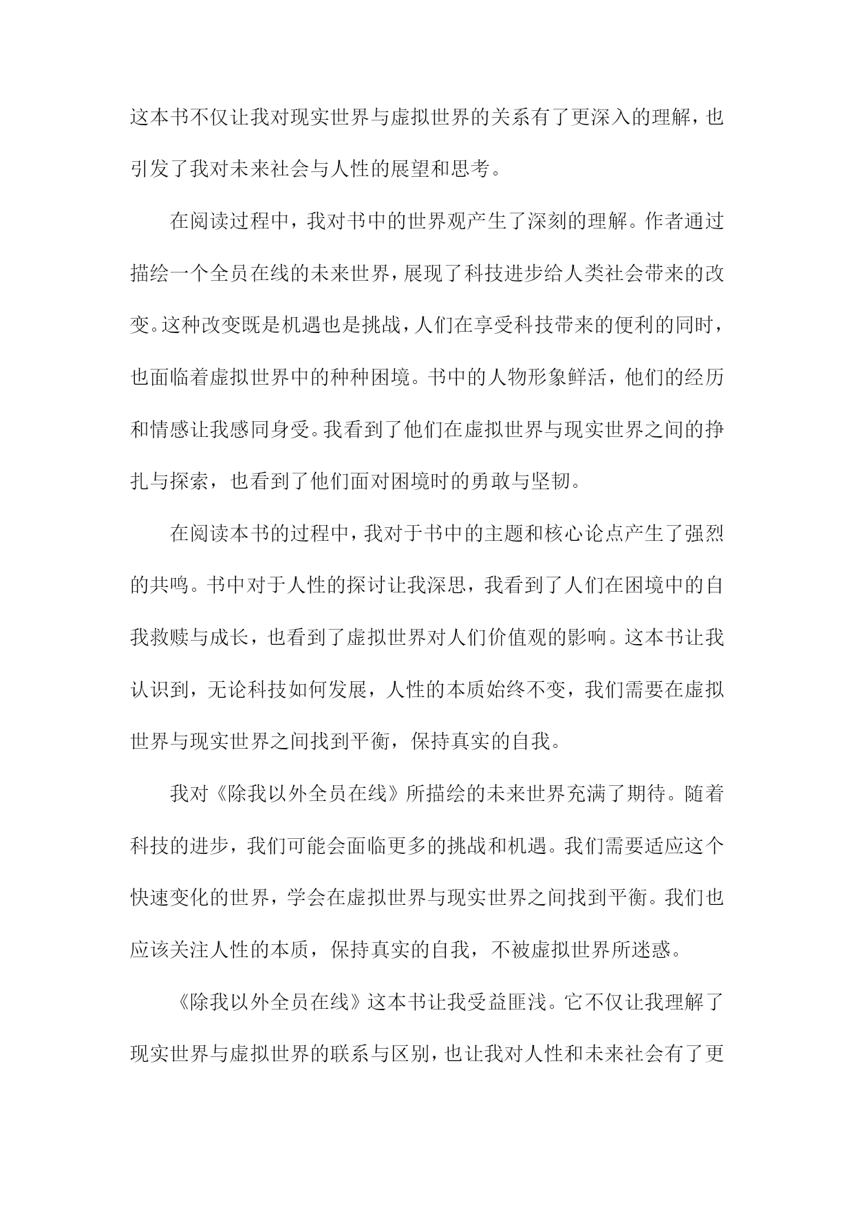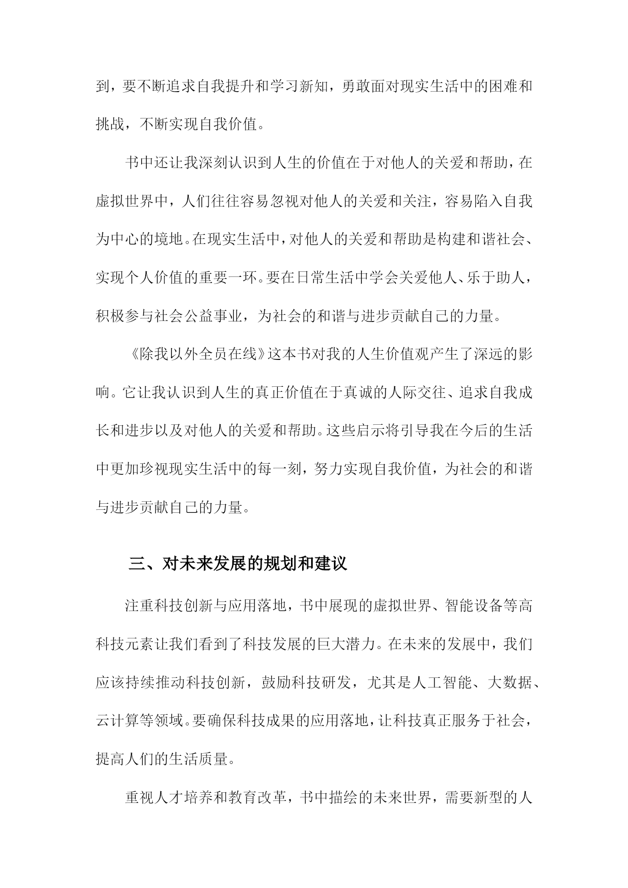《除我以外全员在线》读书记录一、从本书中学到的知识或技能在阅读《除我以外全员在线》我收获颇丰,书中所呈现的内容深入浅出地展现了许多实用的知识或技能。书中围绕着网络时代的数字化生存能力,深入探讨了我们如何适应日新月异的网络世界。这不仅让我理解了数字技术的重要性,而且学习了如何运用这些技术来提升自我。我从书中了解到数字化时代的社交互动技巧,在现今社会,线上交流已经成为我们日常生活的重要组成部分。通过书中的内容,我认识到在网络社交中保持真实与真诚的重要性,同时也学会了如何更好地进行在线沟通,提升了我的人际交流能力。书中关于网络安全的知识也给我留下了深刻的印象,在数字化世界中,网络安全问题日益严重,如何保护自己的隐私和信息安全变得尤为重要。通过阅读本书,我了解到了一些基本的网络安全知识,包括如何防范网络攻击、保护个人信息等,这些技能对我未来的网络生活大有裨益。书中还涉及了关于数字时代的职场技能,随着科技的进步,许多行业都在经历数字化转型。通过阅读本书,我对数字时代的职场有了更深入的了解,学习到了如何适应数字化职场环境,提升自己的职业技能以适应未来工作的需求。我从书中汲取了关于网络道德和网络伦理的知识,在数字化世界中,遵守网络道德和伦理是至关重要的。通过阅读本书,我了解到了如何判断信息真伪、遵守网络道德规范和尊重他人隐私等重要的道德伦理观念。这些观念将对我未来的网络行为产生深远影响。二、对人生价值观的影响和启示阅读《除我以外全员在线》我对人生价值观有了更深的理解和感悟。书中通过虚拟现实世界中的种种情节,反映出真实与虚拟之间的深刻对比和冲突,使我对现实生活产生了更多的反思。在现实与虚拟交融的过程中,我逐渐认识到人生的真实价值所在。书中的人物经历让我意识到人生的真正价值在于人与人之间的真诚交流和互动。在虚拟世界里,虽然人们可以拥有无数的身份和角色,但却无法替代真实的人际关系和情感交流。这种真实的人际交往所带来的情感体验和成长是无法被虚拟世界所替代的。在日常生活中,要重视与他人的真诚交往,珍惜每一次真实的情感交流。书中情节的发展让我认识到人生的意义在于追求自我成长和进步。在虚拟世界中,虽然人们可以通过各种方式逃避现实、追求虚幻的满足感,但真正的成长和进步只能在现实世界中实现。这使我意识到,要不断追求自我提升和学习新知,勇敢面对现实生活中的困难和挑战,不断实现自我价值。书中还让我深刻认识到人生的价值在于对他人的关爱和帮助,在虚拟世界中,人们往往容易忽视对他人的关爱和关注,容易陷入自我为中心的境地。在现实生活中,对他人的关爱和帮助是构建和谐社会、实现个人价值的重要一环。要在日常生活中学会关爱他人、乐于助人,积极参与社会公益事业,为社会的和谐与进步贡献自己的力量。《除我以外全员在线》这本书对我的人生价值观产生了深远的影响。它让我认识到人生的真正价值在于真诚的人际交往、追求自我成长和进步以及对他人的关爱和帮助。这些启示将引导我在今后的生活中更加珍视现实生活中的每一刻,努力实现自我价值,为社会的和谐与进步贡献自己的力量。三、对未来发展的规划和建议注重科技创新与应用落地,书中展现的虚拟世界、智能设备等高科技元素让我们看到了科技发展的巨大潜力。在未来的发展中,我们应该持续推动科技创新,鼓励科技研发,尤其是人工智能、大数据、云计算等领域。要确保科技成果的应用落地,让科技真正服务于社会,提高人们的生活质量。重视人才培养和教育改革,书中描绘的未来世界,需要新型的人才来适应。我们应该注重培养具有创新思维、跨界融合能力的人才。教育体系需要与时俱进,除了传授基础知识,还应着重培养学生的批判性思维、创造性解决问题的能力。继续教育和对成年人的技能提升也应得到重视,以适应快速变化的社会需求。关注社会公平与伦理道德。《除我以外全员在线》描绘的未来世界也存在一些社会公平和伦理道德的隐患。未来的发展中,我们需要警惕科技的差距造成的社会阶层分化,确保科技的普及和公正应用。随着人工智能等技术的发展,数据隐私、道德伦理等问题也需要得到重视。应该制定相应的法规和政策,来规范科技的发展和应用,确保科技的发展符合社会的伦理道德。提倡可持续发展和绿色环保。《除我以外全员在线》虽然描绘了一个高科技的未来世界,但也应该注重环境的保护。在未来的发展中,我们应该坚持可持续发展的理念,推动清洁能源的使用,减少污染物的排放。也需要加强对环境的保护和教育,让每个人都意识到环保的重要性,共同为未来的环境做出贡献。四、总结阅读本书后的整体感受与展望在阅读《除我以外全员在线》这本书的过程中,我深深地被书中的故事和主题所吸引。从主人公的视角出发,我感受到了科技进步带来的冲击与影响,同时也看到了人们在虚拟与现实之间的挣扎与成长。这本书不仅让我对现实世界与虚拟世界的关系有了更深入的