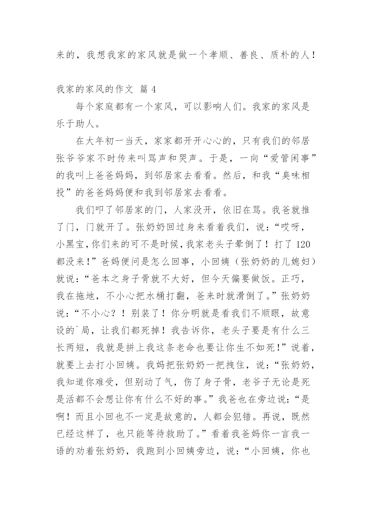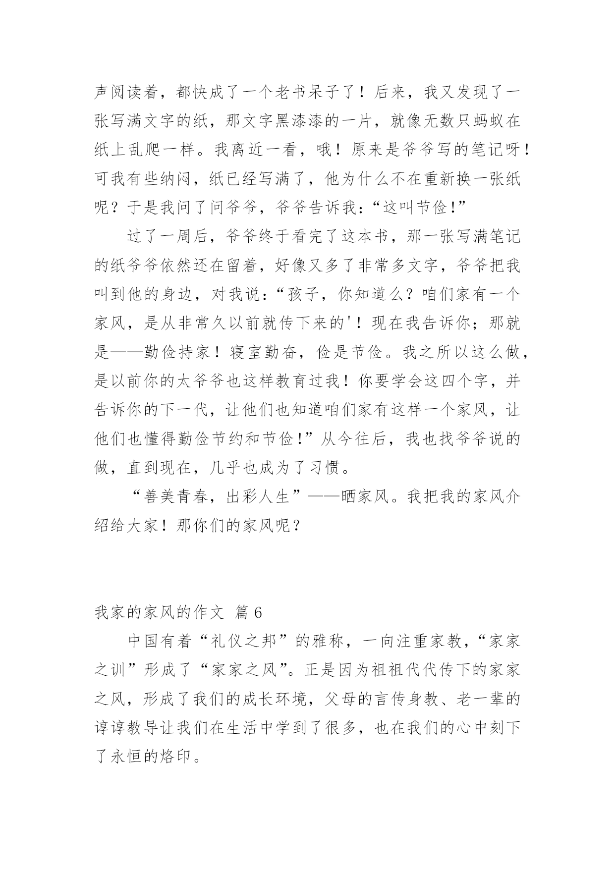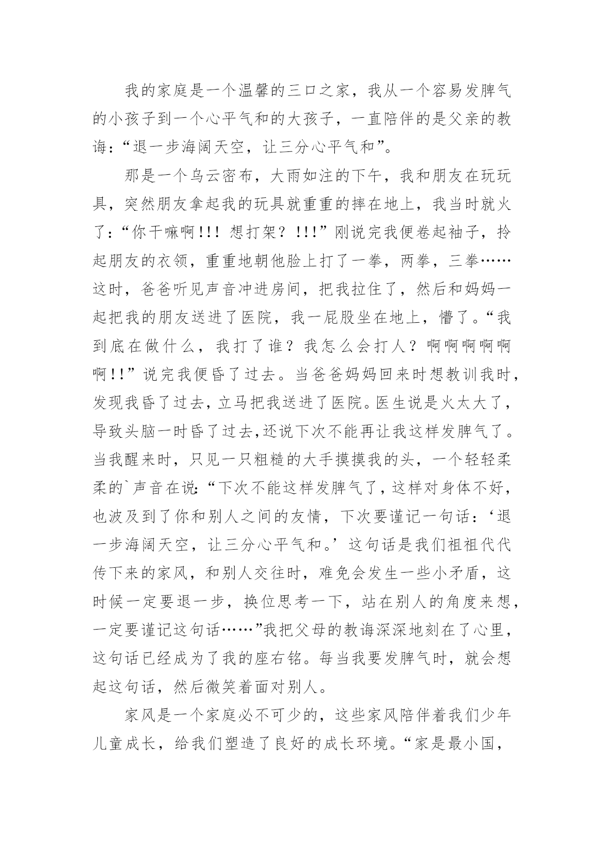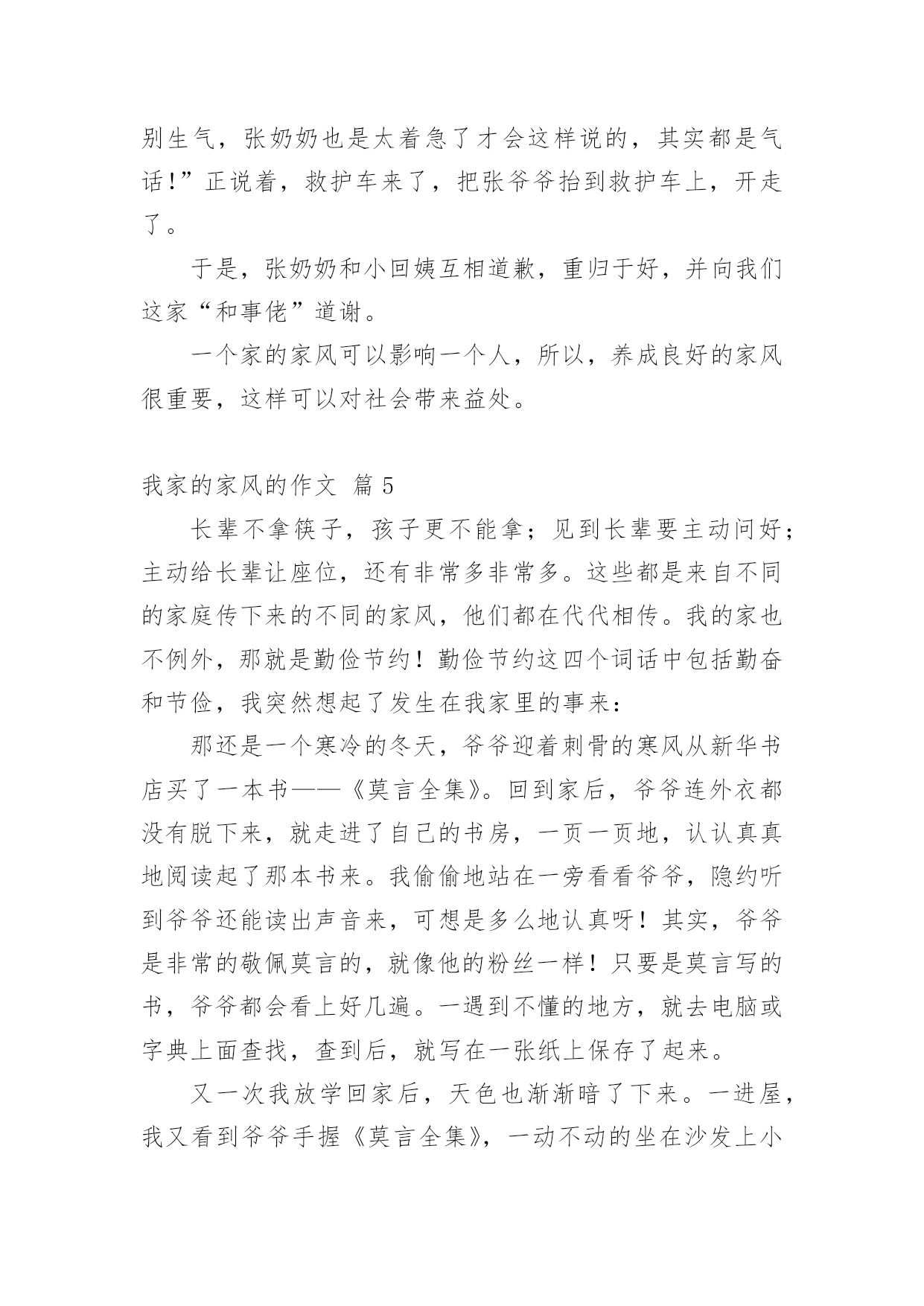 我家的家风的作文我家的家风的作文集合[6篇]在日复一日的学习、工作或生活中,说到作文,大家肯定都不陌生吧,作文是一种言语活动,具有高度的综合性和创造性。为了让您在写作文时更加简单方便,以下是小编收集整理的我家的家风的作文6篇,希望能够帮助到大家。我家的家风的作文篇1若社会风气好,受之于“国风”;而国家风气良好,则应当归功于“家风”。一家之风,总会教会“祖国的花朵”一些做人的道理和品格,陶冶他们的情操,升华他们的灵魂。好“家风”会使他们学会做人处世,在未来踏入社会,那些汲取“家风”中的营养和道理,会使他们如虎添翼,更好的贡献社会。一个家庭的家风就是这个家庭经过一代代人的积累、传承下来的行为准则和道德规范,对于所有家庭成员的言行都具有约束和指导作用。不同的家庭,家风的内容和呈现形式也不尽相同,有的是成型的为人处世格言,有的则隐含于每个家庭成员的日常行为中。我来谈谈我家的家风。汲取书的营养父母虽未曾提过笔,读过书,但十分乐意我们向书汲取营养和智慧。父母虽然不曾欣赏过“书中自有颜如玉”等名句,却深信“读书能改变人生,读书的益处大如山”。“想买零食,我没钱;想买书,我砸锅卖铁也支持你”成了他们的口头禅。家中虽然没有“书本堆积如山”的规模阵列,但也是“书日日似新”。我想“家风”中应该有一列是读书的吧。不知是否读书渐渐多了,自己的文采稍稍有长进,不再是写那些枯燥厌烦的文字了。诚实似财富若读书是人生的一道美景,那么诚实亦让人驻足。诚实是人生的一大笔财富。“人在仍合场合说话,都一定要诚实讲信用,这是最重要的人格基础。一个人若要得到他人信任,首先就要诚实;欺骗他人,会给别人带来不好的印象,而且,无法在社会中立足”父母时常教育我们。而当自己做错事情,父母并不是一味责罚我,而是让我学会认识错误,让我学会改正错误。父母常说“诚实似财富”。我想是的。不歧视他人父母从来不会因为种族,国家,才学高低,相貌美丑而歧视、羞辱他人。家是开小卖部的。偶尔会遇见几个异国风格的人来购买果汁饮品。父母未曾因为他们的肤色和国家不同,而将饮料价钱刻意提高。相反,父母会友好推荐一些味道较好、价格适中的饮品。父母认为“人类就像同在屋檐下的一家人,彼此应该相亲相爱,和睦相处”。父母的`言行,传授了我很多学校里学不到的做人处事的道理。环境塑造人,影响人。一个人的性格、气质的培养,品德、世界观的形成与他生长的家庭密不可分。家庭的和谐是城市文明的一部分,家庭是小社会,城市是大社会。文明家庭是文明城市建设的基础。我相信,家风是一道道德标准,约束着我们,让我们和这个家的精神融合,蔚然成风。我家的家风的作文篇2岳母为儿刺字“精忠报国”,“忠”为岳家之家风;林则徐勤俭持家,生活简朴,他认为“贤而多财,则损其志;愚而多财,则增其过。”崇尚“俭”为林家之家风;曾国藩以为“勤”为人生第一要义,崇尚“勤”为曾家之家风也······古代大家族里几乎都有自己的家风家规,而到当代我们的家庭中很少有什么家风家规了,这次学校组织大家进行“晒家风”征文比赛可难坏了我,我们家的家风是什么呢?“多读书才会有知识,有了知识才会有眼界!”这是姥爷常常用来教育妈妈她们姐妹几个的话。姥爷是一位小学教师,所以他十分重视学习。妈妈她们小时候住在一个很偏远的小山沟里,当地的人根本不重视读书,和妈妈同级的孩子里小学毕业时就只剩下三个人,因为读中学要住宿的原因最后上中学就只有妈妈一个人了。每个星期一姥爷要起大早走一个多小时的山路把妈妈送到汽车站,周六的时候还要到汽车站去接妈妈回家。妈妈常说她之所以能够坚持读书都是因为姥爷的支持,不然的话她也一定和儿时的伙伴们一样在山沟里种地呢!知识改变命运,在妈妈的身上得到了体现。在姥爷的正确引导下,妈妈意识到了知识的重要性并且养成了勤学好读的好习惯。在我的记忆里,妈妈总是不停地学习参加各种考试,没有事儿的时候她总是书不离手,后来不知不觉中她的这种习惯也影响了我。在我还是个小孩子的时候,爸爸妈妈就给我买了很多的故事书,每晚睡觉之前,他们就开始给我讲故事,讲的次数多了,我几乎可以把一本故事书从头背到尾。家里一来客人我就会自己拿着故事书给他们讲故事,其实我的'书拿的都是倒着的,闹了很多的笑话。慢慢的我长大了,开始自己认字了。于是我就学着妈妈的样子有事没事的总是拿着一本书在看。刚开始的时候我读得都是有拼音的小故事,随着我识字量的增加,我可以自己读很多书了,不认识的字可以查字典。经常吸引我的是故事中各种人物的命运遭遇,他们的悲欢离合常常让我牵肠挂肚,夜不能寐。“读书破万卷,下笔如有神”这是唐代大诗人杜甫的名句。读书对我的帮助也很大,虽然我没有下笔如有神,但是每次作文课,平时从书里积累的词句就会像酵母一样为我的作文增光添彩。为此我没少得到老师的夸奖。“学而不思则罔,思而不学则殆”这是来自《论语》中的名言警句,