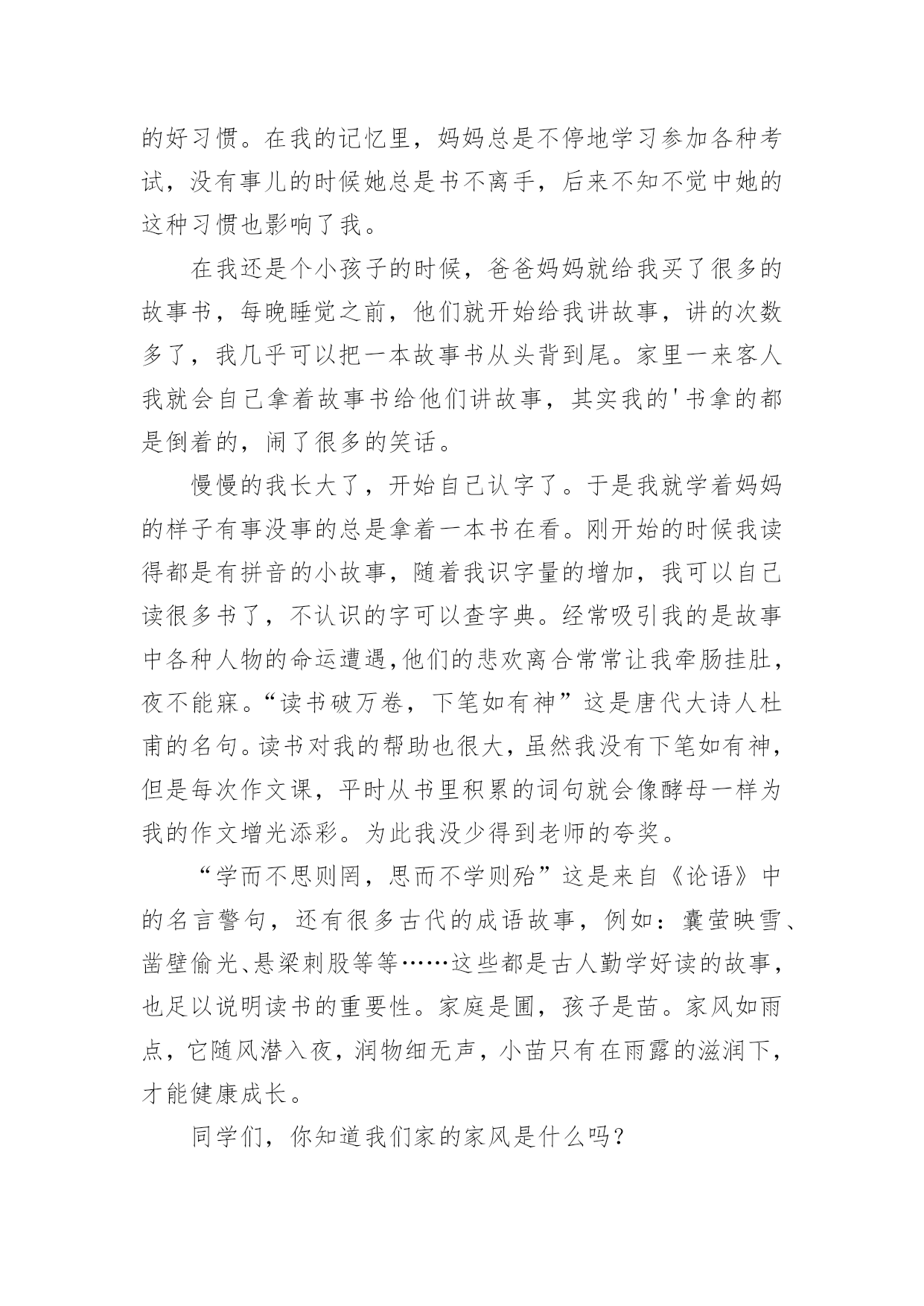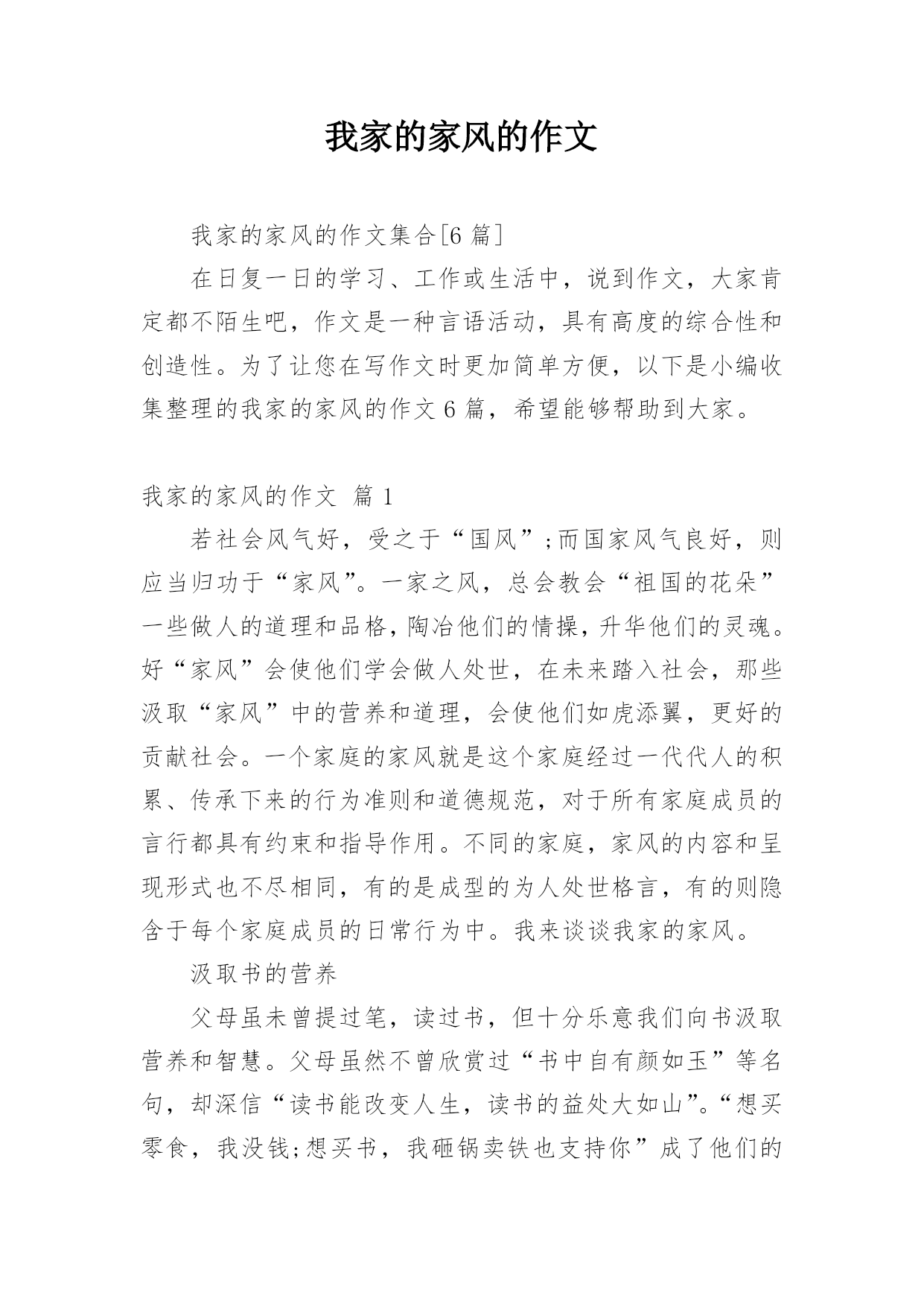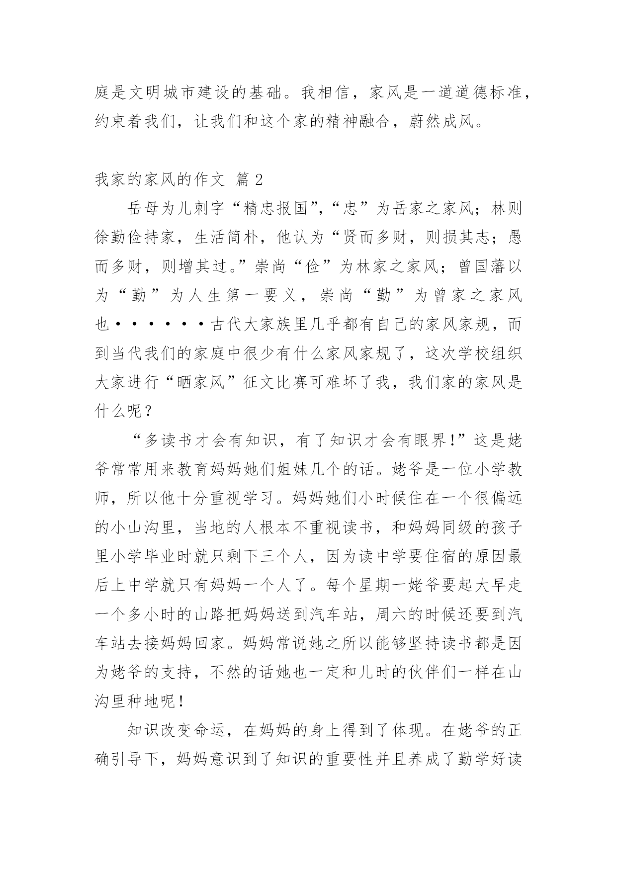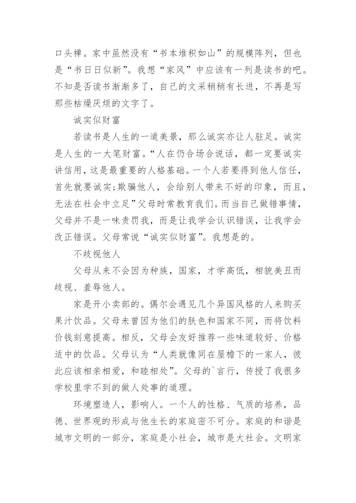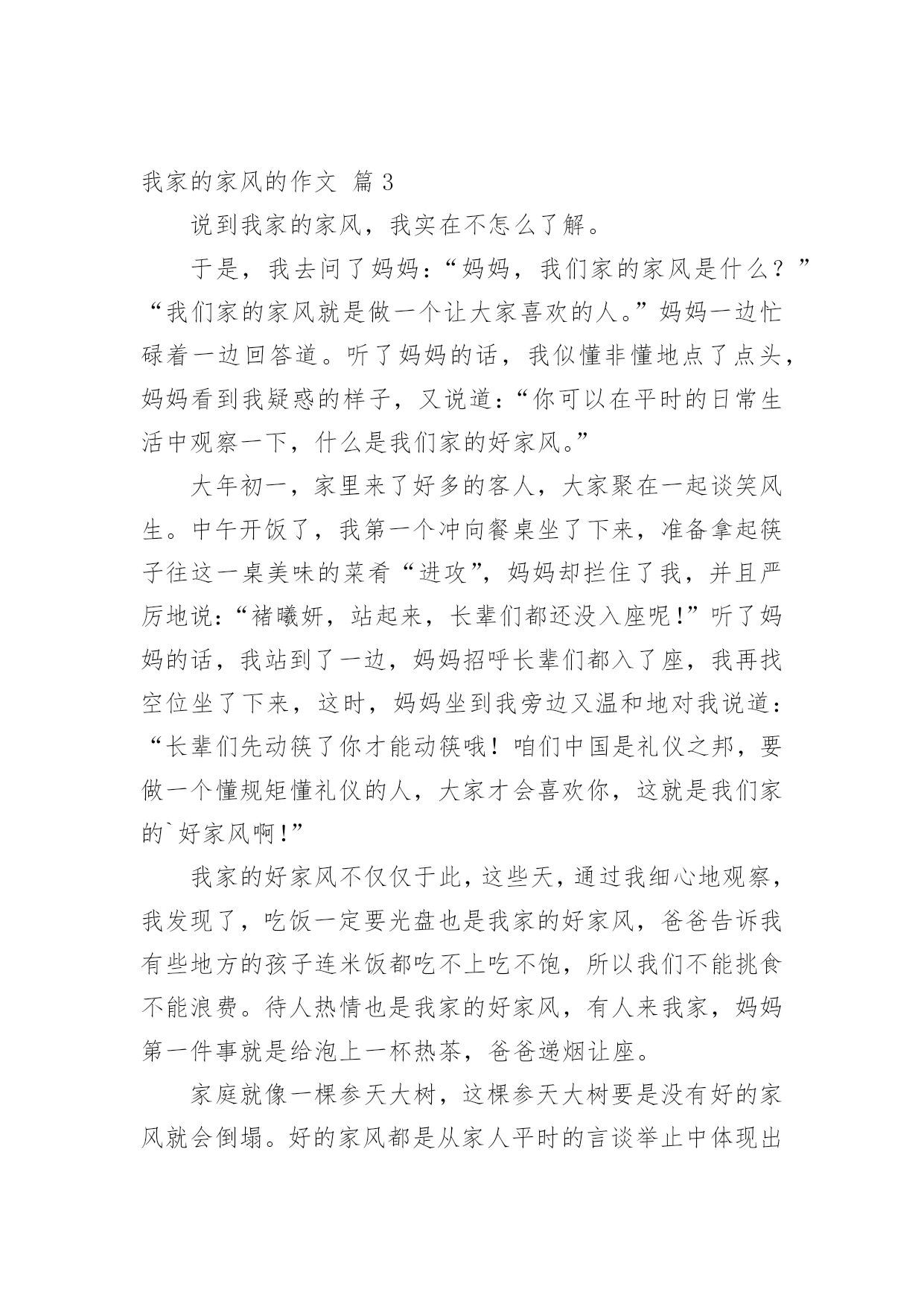 我家的家风的作文我家的家风的作文集合[6篇]在日复一日的学习、工作或生活中,说到作文,大家肯定都不陌生吧,作文是一种言语活动,具有高度的综合性和创造性。为了让您在写作文时更加简单方便,以下是小编收集整理的我家的家风的作文6篇,希望能够帮助到大家。我家的家风的作文篇1若社会风气好,受之于“国风”;而国家风气良好,则应当归功于“家风”。一家之风,总会教会“祖国的花朵”一些做人的道理和品格,陶冶他们的情操,升华他们的灵魂。好“家风”会使他们学会做人处世,在未来踏入社会,那些汲取“家风”中的营养和道理,会使他们如虎添翼,更好的贡献社会。一个家庭的家风就是这个家庭经过一代代人的积累、传承下来的行为准则和道德规范,对于所有家庭成员的言行都具有约束和指导作用。不同的家庭,家风的内容和呈现形式也不尽相同,有的是成型的为人处世格言,有的则隐含于每个家庭成员的日常行为中。我来谈谈我家的家风。汲取书的营养父母虽未曾提过笔,读过书,但十分乐意我们向书汲取营养和智慧。父母虽然不曾欣赏过“书中自有颜如玉”等名句,却深信“读书能改变人生,读书的益处大如山”。“想买零食,我没钱;想买书,我砸锅卖铁也支持你”成了他们的口头禅。家中虽然没有“书本堆积如山”的规模阵列,但也是“书日日似新”。我想“家风”中应该有一列是读书的吧。不知是否读书渐渐多了,自己的文采稍稍有长进,不再是写那些枯燥厌烦的文字了。诚实似财富若读书是人生的一道美景,那么诚实亦让人驻足。诚实是人生的一大笔财富。“人在仍合场合说话,都一定要诚实讲信用,这是最重要的人格基础。一个人若要得到他人信任,首先就要诚实;欺骗他人,会给别人带来不好的印象,而且,无法在社会中立足”父母时常教育我们。而当自己做错事情,父母并不是一味责罚我,而是让我学会认识错误,让我学会改正错误。父母常说“诚实似财富”。我想是的。不歧视他人父母从来不会因为种族,国家,才学高低,相貌美丑而歧视、羞辱他人。家是开小卖部的。偶尔会遇见几个异国风格的人来购买果汁饮品。父母未曾因为他们的肤色和国家不同,而将饮料价钱刻意提高。相反,父母会友好推荐一些味道较好、价格适中的饮品。父母认为“人类就像同在屋檐下的一家人,彼此应该相亲相爱,和睦相处”。父母的`言行,传授了我很多学校里学不到的做人处事的道理。环境塑造人,影响人。一个人的性格、气质的培养,品德、世界观的形成与他生长的家庭密不可分。家庭的和谐是城市文明的一部分,家庭是小社会,城市是大社会。文明家庭是文明城市建设的基础。我相信,家风是一道道德标准,约束着我们,让我们和这个家的精神融合,蔚然成风。我家的家风的作文篇2岳母为儿刺字“精忠报国”,“忠”为岳家之家风;林则徐勤俭持家,生活简朴,他认为“贤而多财,则损其志;愚而多财,则增其过。”崇尚“俭”为林家之家风;曾国藩以为“勤”为人生第一要义,崇尚“勤”为曾家之家风也······古代大家族里几乎都有自己的家风家规,而到当代我们的家庭中很少有什么家风家规了,这次学校组织大家进行“晒家风”征文比赛可难坏了我,我们家的家风是什么呢?“多读书才会有知识,有了知识才会有眼界!”这是姥爷常常用来教育妈妈她们姐妹几个的话。姥爷是一位小学教师,所以他十分重视学习。妈妈她们小时候住在一个很偏远的小山沟里,当地的人根本不重视读书,和妈妈同级的孩子里小学毕业时就只剩下三个人,因为读中学要住宿的原因最后上中学就只有妈妈一个人了。每个星期一姥爷要起大早走一个多小时的山路把妈妈送到汽车站,周六的时候还要到汽车站去接妈妈回家。妈妈常说她之所以能够坚持读书都是因为姥爷的支持,不然的话她也一定和儿时的伙伴们一样在山沟里种地呢!知识改变命运,在妈妈的身上得到了体现。在姥爷的正确引导下,妈妈意识到了知识的重要性并且养成了勤学好读的好习惯。在我的记忆里,妈妈总是不停地学习参加各种考试,没有事儿的时候她总是书不离手,后来不知不觉中她的这种习惯也影响了我。在我还是个小孩子的时候,爸爸妈妈就给我买了很多的故事书,每晚睡觉之前,他们就开始给我讲故事,讲的次数多了,我几乎可以把一本故事书从头背到尾。家里一来客人我就会自己拿着故事书给他们讲故事,其实我的'书拿的都是倒着的,闹了很多的笑话。慢慢的我长大了,开始自己认字了。于是我就学着妈妈的样子有事没事的总是拿着一本书在看。刚开始的时候我读得都是有拼音的小故事,随着我识字量的增加,我可以自己读很多书了,不认识的字可以查字典。经常吸引我的是故事中各种人物的命运遭遇,他们的悲欢离合常常让我牵肠挂肚,夜不能寐。“读书破万卷,下笔如有神”这是唐代大诗人杜甫的名句。读书对我的帮助也很大,虽然我没有下笔如有神,但是每次作文课,平时从书里积累的词句就会像酵母一样为我的作文增光添彩。为此我没少得到老师的夸奖。“学而不思则罔,思而不学则殆”这是来自《论语》中的名言警句,