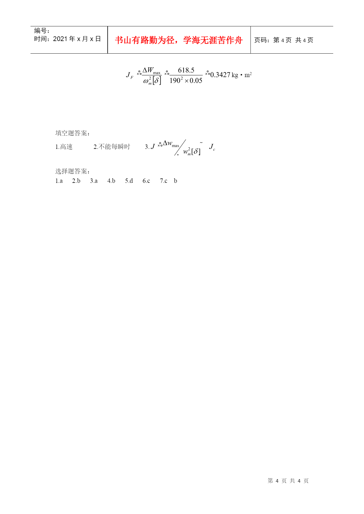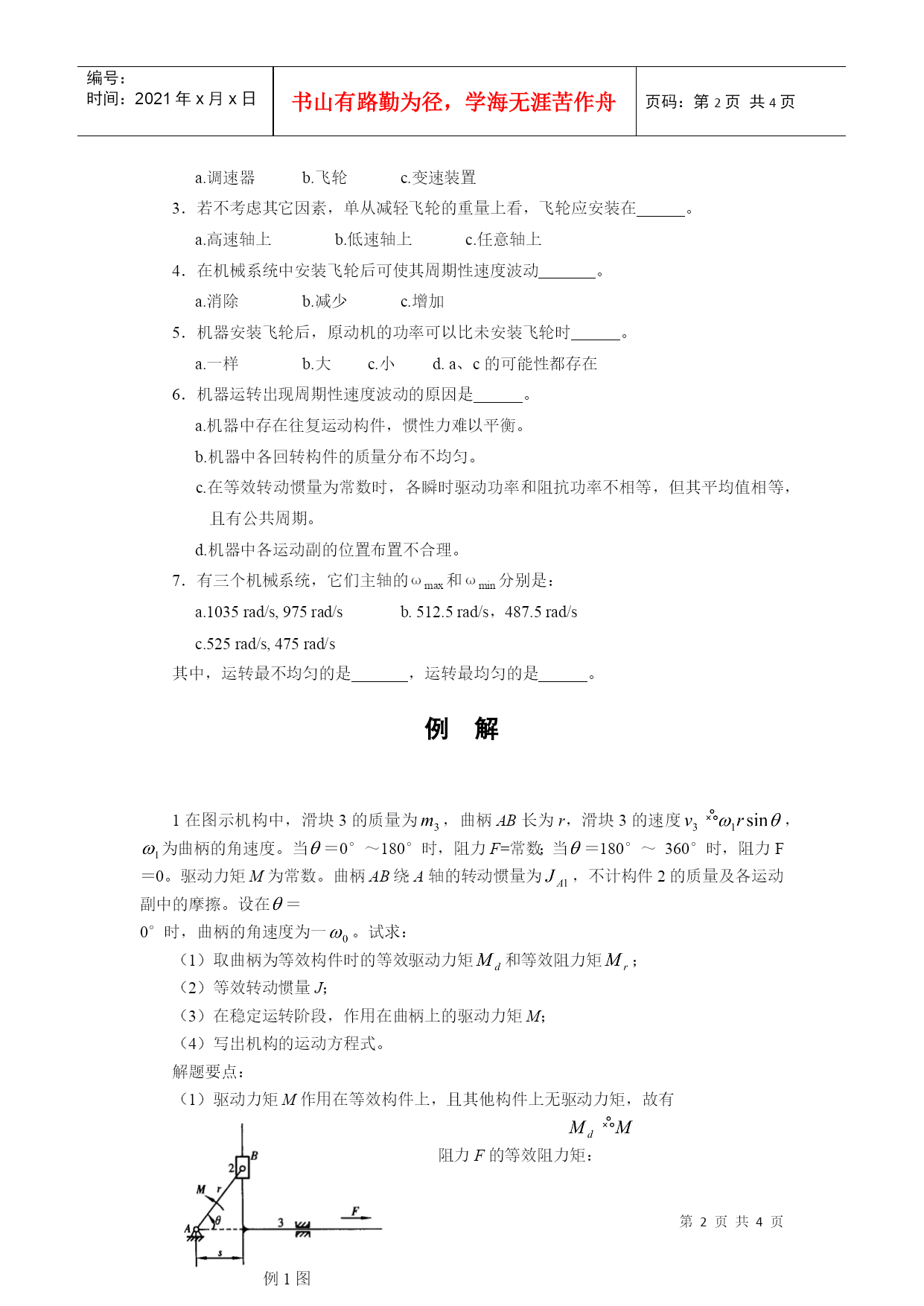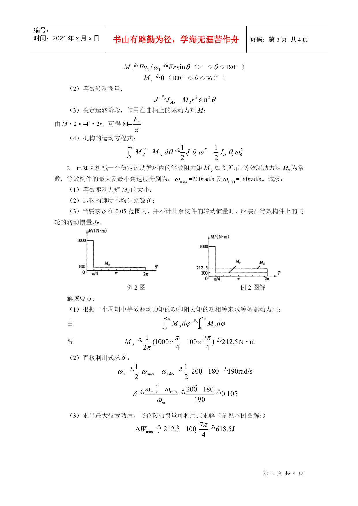编号:时间:2021年x月x日书山有路勤为径,学海无涯苦作舟页码:第PAGE4页共NUMPAGES4页第PAGE\*MERGEFORMAT4页共NUMPAGES\*MERGEFORMAT4页机械速度波动的调节一、复习思考题1.机械的运转为什么会有速度波动?为什么要调节机器的速度波动?请列举几种因速度波动而产生不良影响的实例。2.何谓周期性速度波动和非周期性速度波动?请各举出两个实例。这两种速度波动各用什么方法加以调节?3.试观察牛头创床的飞轮、冲床的飞轮、手抉拖拉机的飞轮、缝纫机的飞轮、录音机的飞轮各在何处?它们在机器中各起着什么的作用?4.何谓平均速度和不均匀系数?不均匀系数是否选得越小越好?安装飞轮后是否可能实现绝对匀速转动?5.欲减小速度波动,转动惯量相同的飞轮应装在高速轴上还是低速轴上。6.飞轮的调速原理是什么?为什么说飞轮在调速的同时还能起到节约能源的作用?7.飞轮设计的基本原则是什么?为什么飞轮应尽量装在机械系统的高速轴上?8.什么是最大盈亏功?如何确定其值?9.如何确定机械系统一个运动周期最大角速度ωmax与最小角速度ωmiu所在位置?10.离心调速器的工作原理是什么?二、填空题1.若不考虑其他因素,单从减轻飞轮的重量上看,飞轮应安装在轴上。2.大多数机器的原动件都存在运动速度的波动,其原因是驱动力所作的功与阻力所作的功保持相等。3.若已知机械系统的盈亏功为(Δω)max,等效构件的平均角速度为ωm,系统许用速度不均匀系数为[δ],未加飞轮时,系统的等效转动惯量的常量部分为Jc,则飞轮的转动惯量J。三、选择题1.在机械系统速度波动的一个周期中的某一时间间隔内,当系统出现时,系统的运动速度,此时飞轮将能量。a.亏功,减小,释放;b.亏功,加快,释放;c.盈功,减小,储存;d.盈功,加快,释放。2.为了减小机械运转中周期性速度波动的程度,应在机械中安装。a.调速器b.飞轮c.变速装置3.若不考虑其它因素,单从减轻飞轮的重量上看,飞轮应安装在。a.高速轴上b.低速轴上c.任意轴上4.在机械系统中安装飞轮后可使其周期性速度波动。a.消除b.减少c.增加5.机器安装飞轮后,原动机的功率可以比未安装飞轮时。a.一样b.大c.小d.a、c的可能性都存在6.机器运转出现周期性速度波动的原因是。a.机器中存在往复运动构件,惯性力难以平衡。b.机器中各回转构件的质量分布不均匀。c.在等效转动惯量为常数时,各瞬时驱动功率和阻抗功率不相等,但其平均值相等,且有公共周期。d.机器中各运动副的位置布置不合理。7.有三个机械系统,它们主轴的ωmax和ωmin分别是:a.1035rad/s,975rad/sb.512.5rad/s,487.5rad/sc.525rad/s,475rad/s其中,运转最不均匀的是,运转最均匀的是。例解1在图示机构中,滑块3的质量为,曲柄AB长为r,滑块3的速度,为曲柄的角速度。当=0°~180°时,阻力F=常数;当=180°~360°时,阻力F=0。驱动力矩M为常数。曲柄AB绕A轴的转动惯量为,不计构件2的质量及各运动副中的摩擦。设在=0°时,曲柄的角速度为一。试求:(1)取曲柄为等效构件时的等效驱动力矩和等效阻力矩;(2)等效转动惯量J;(3)在稳定运转阶段,作用在曲柄上的驱动力矩M;(4)写出机构的运动方程式。解题要点:(1)驱动力矩M作用在等效构件上,且其他构件上无驱动力矩,故有例1图阻力F的等效阻力矩:(0°≤≤180°)(180°≤≤360°)(2)等效转动惯量:(3)稳定运转阶段,作用在曲柄上的驱动力矩M:由M·2π=F·2r,可得M=(4)机构的运动方程式:2已知某机械一个稳定运动循环内的等效阻力矩如图所示,等效驱动力矩Md为常数,等效构件的最大及最小角速度分别为:=200rad/s及=180rad/s。试求:(1)等效驱动力矩Md的大小;(2)运转的速度不均匀系数;(3)当要求在0.05范围内,并不计其余构件的转动惯量时,应装在等效构件上的飞轮的转动惯量JF。例2图例2图解解题要点:(1)根据一个周期中等效驱动力矩的功和阻力矩的功相等来求等效驱动力矩:由得N·m(2)直接利用式求:(3)求出最大盈亏功后,飞轮转动惯量可利用式求解(参见本例图解:)kg·m2填空题答案:1.高速2.不能每瞬时3.选择题答案:1.a2.b3.a4.b5.d6.c7.cb