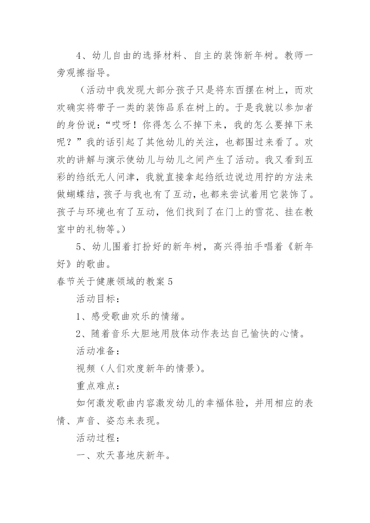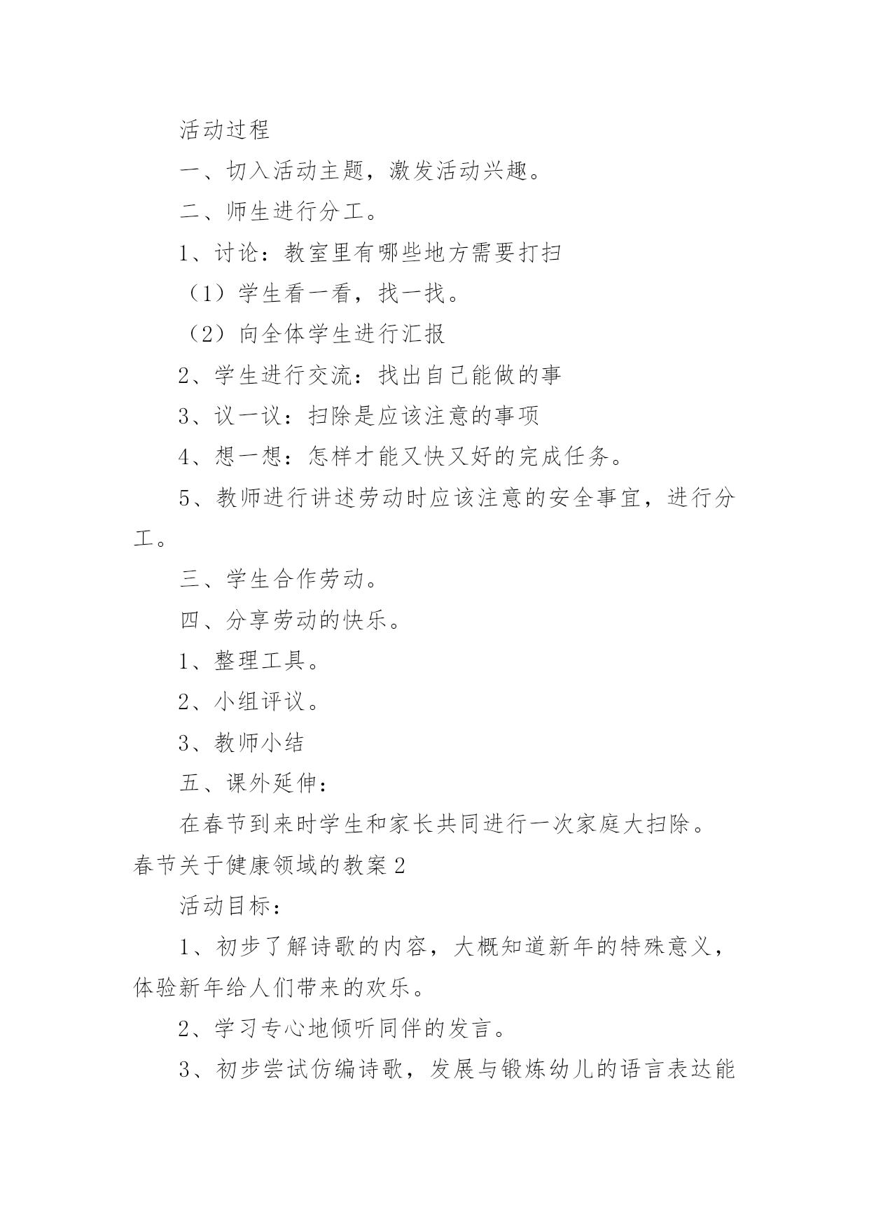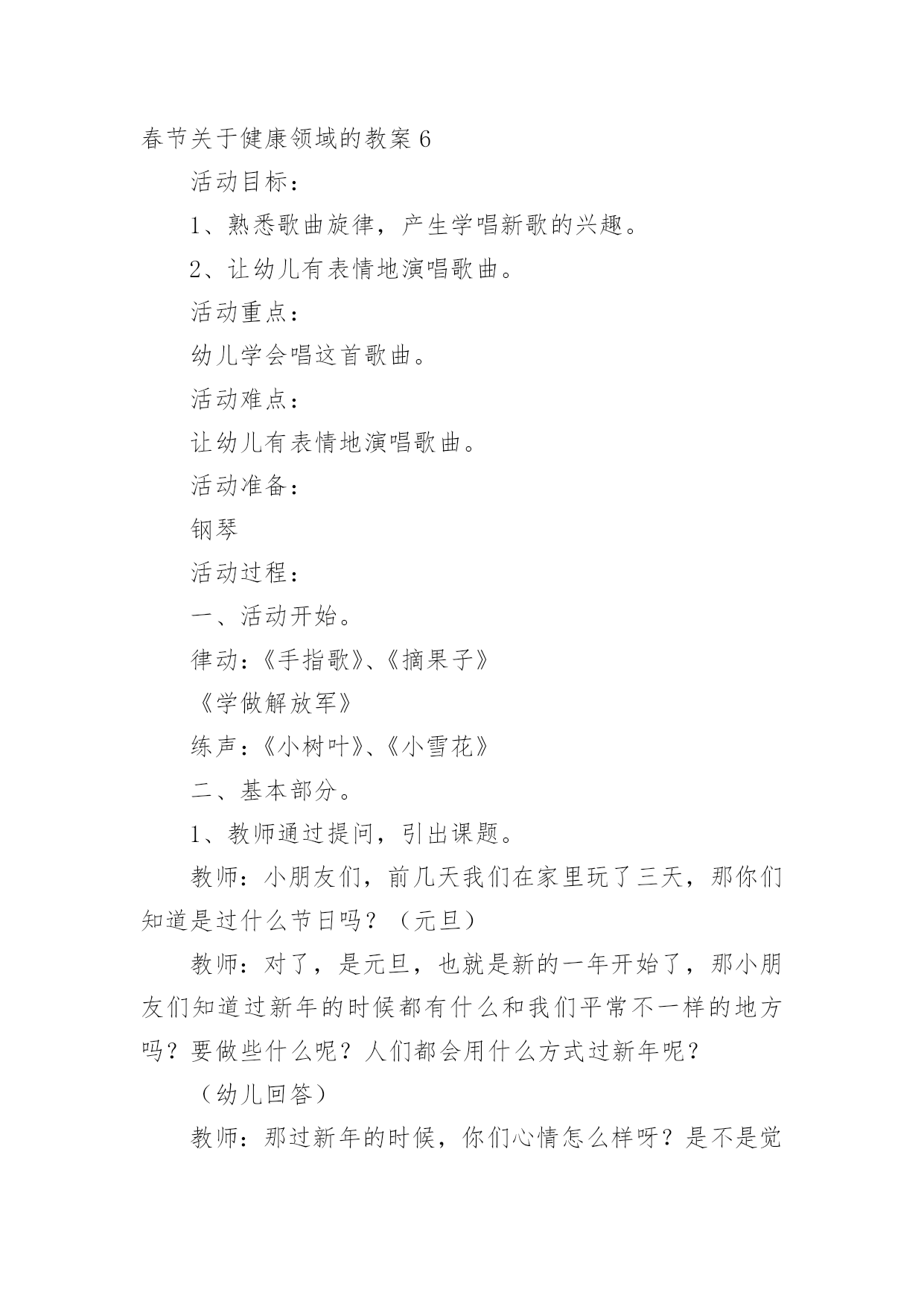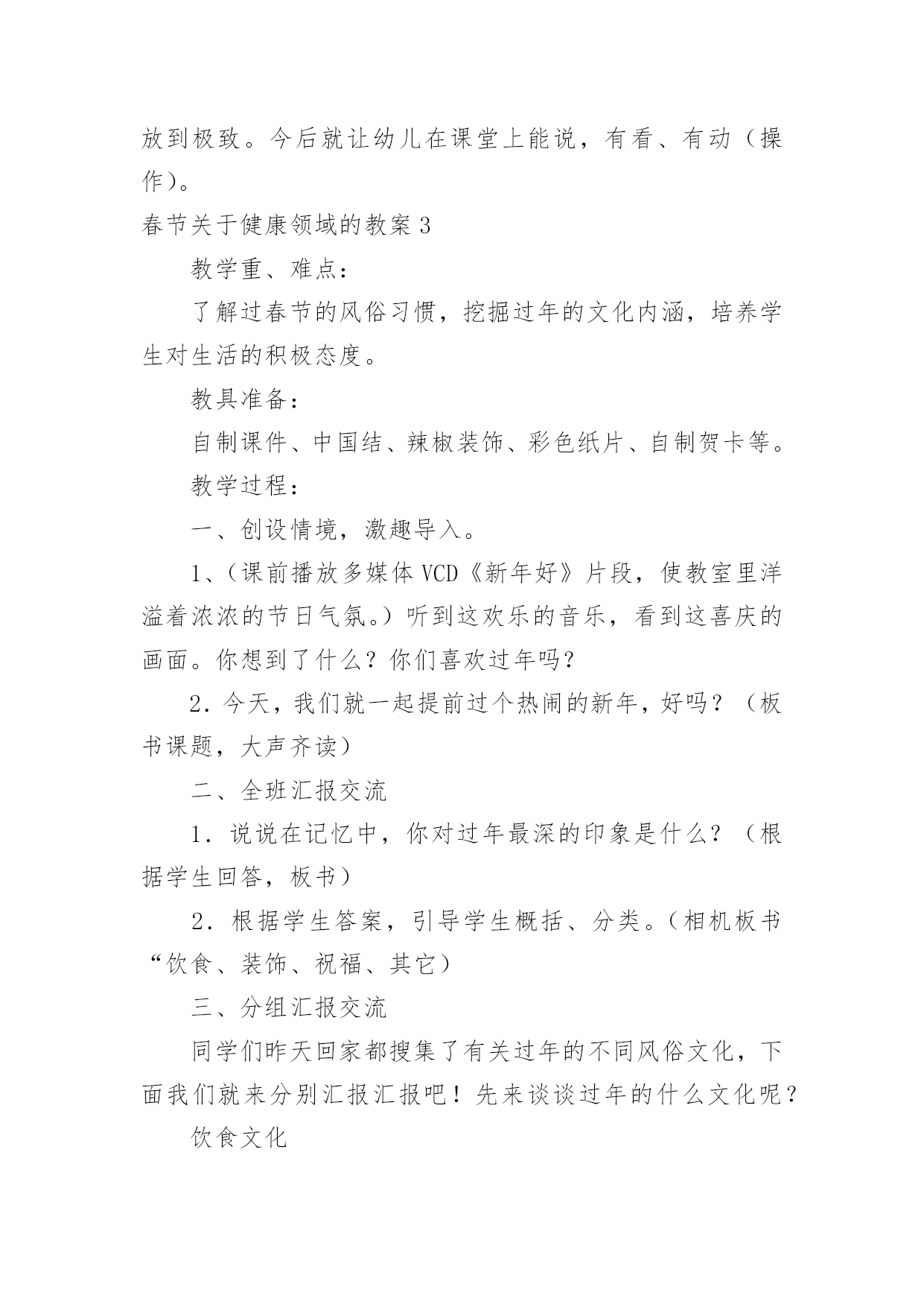 春节健康领域的教案春节关于健康领域的教案作为一名教职工,常常要根据教学需要编写教案,教案有助于学生理解并掌握系统的知识。快来参考教案是怎么写的吧!下面是小编精心整理的春节关于健康领域的教案,供大家参考借鉴,希望可以帮助到有需要的朋友。春节关于健康领域的教案1活动目标1、感受并体验新年到来时的快乐气氛,为迎接新年做些力所能及的劳动。2、参加庆新年大扫除活动,并愿意在活动中承担任务,付出努力。3、培养学生与人合作的能力,并与他人分享快乐。4、发展幼儿的动手能力。5、积极参与活动,能用简单的语言表达自己的感受。教学重点、难点教学重点:发展幼儿想象力、表现力及口语表达能力。教学难点:进一步提高幼儿的操作能力,以及培养幼儿创造美、表现美的能力。活动准备材料准备:扫帚、抹布、撮子、盆等各种劳动工具。经验准备:学生已有的擦桌子、扫地等劳动经验。活动过程一、切入活动主题,激发活动兴趣。二、师生进行分工。1、讨论:教室里有哪些地方需要打扫(1)学生看一看,找一找。(2)向全体学生进行汇报2、学生进行交流:找出自己能做的事3、议一议:扫除是应该注意的事项4、想一想:怎样才能又快又好的完成任务。5、教师进行讲述劳动时应该注意的安全事宜,进行分工。三、学生合作劳动。四、分享劳动的快乐。1、整理工具。2、小组评议。3、教师小结五、课外延伸:在春节到来时学生和家长共同进行一次家庭大扫除。春节关于健康领域的教案2活动目标:1、初步了解诗歌的内容,大概知道新年的特殊意义,体验新年给人们带来的欢乐。2、学习专心地倾听同伴的发言。3、初步尝试仿编诗歌,发展与锻炼幼儿的语言表达能力。4、理解故事内容,能认真倾听,有良好的倾听习惯。5、愿意分角色表演简单的故事情节。活动准备:1、配套磁带。2、一幅关于太空的画面,包括太阳、月亮、星星和坐着飞船的小朋友的单个形象。3、学习新词:遨游。活动过程:一、引导幼儿围绕"什么是新年"展开讨论。提问:你觉得什么是新年?你为什么喜欢新年?二、组织幼儿欣赏诗歌。1、第一遍欣赏诗歌后,让幼儿知道诗歌的名称,了解诗歌的主要内容。2、第二遍欣赏诗歌时。教师边朗诵边出示图片,边请幼儿说说星星、月亮、太阳是怎么回答的,并学一学他们说话的口吻(如细声、大声、高声)。3、带领幼儿完整的欣赏诗歌,引导幼儿以自己的理解说说新年到底是什么。教师以"XX小朋友说……"的方式进行归纳。三、师幼共同仿编诗歌《新年》并朗诵。教学反思:这节课结束,孩子们都还沉浸在欢乐的氛围中,大家了解了"过新年"的风俗,在延伸环节更是让幼儿的激情得以释放到极致。今后就让幼儿在课堂上能说,有看、有动(操作)。春节关于健康领域的教案3教学重、难点:了解过春节的风俗习惯,挖掘过年的文化内涵,培养学生对生活的积极态度。教具准备:自制课件、中国结、辣椒装饰、彩色纸片、自制贺卡等。教学过程:一、创设情境,激趣导入。1、(课前播放多媒体VCD《新年好》片段,使教室里洋溢着浓浓的节日气氛。)听到这欢乐的音乐,看到这喜庆的画面。你想到了什么?你们喜欢过年吗?2.今天,我们就一起提前过个热闹的新年,好吗?(板书课题,大声齐读)二、全班汇报交流1.说说在记忆中,你对过年最深的印象是什么?(根据学生回答,板书)2.根据学生答案,引导学生概括、分类。(相机板书“饮食、装饰、祝福、其它)三、分组汇报交流同学们昨天回家都搜集了有关过年的不同风俗文化,下面我们就来分别汇报汇报吧!先来谈谈过年的什么文化呢?饮食文化1.先请学生说说,过年时有哪些特意要吃的东西。当学生提到饺子时,教师补充:吃饺子是中国北方的习俗。每到年夜饭的时候,人们还会在很多的饺子里藏一个钱币,谁要是吃到了这个藏着硬币的饺子,就得到了新年的好运呢!2.大家搜集得还真不少!其实啊,过年我们特意吃的每样东西,都有特殊的意义呢!下面,我们就让饮食组的同学和大家一起做个“找朋友”的游戏好吗?“找朋友”的游戏:教师事先在学生的抽屉里藏好食物名称卡片和写有食物意义的长纸条。请持有纸片的同学上台,分两边站好。请学生们为食物名称和食物意义配好对。装饰文化1.过年时,有许多漂亮喜庆的装饰物,装扮着新年,营造了浓浓的节日气氛。让每一个人似乎都沉浸在幸福欢乐的海洋。你知道,过年时都有哪些有趣的装饰品吗?根据学生的回答,老师相机出示图片或实物(例如中国结、辣椒等)。2.中国结:老师也带来了一个中国结,大家看!其实,中国结还有铜钱结、吉祥结很多种类。代表着不同的祝愿。如今,我们又赋予了它新的意义,不论你是哪个民族,不论你身在何地,希望所有中华民族的灵魂都能紧紧地凝结成一颗中国心。辣椒:许多人家里还喜欢悬挂辣椒呢!看,你知道挂着辣椒又代表什么吗?祝福文化当每个人都沉浸在新年的幸福祥和中时,可不能忘记给朋友、亲人送去祝福。其实,祝福的方式有很多种。你知道哪一些呢?老师根据