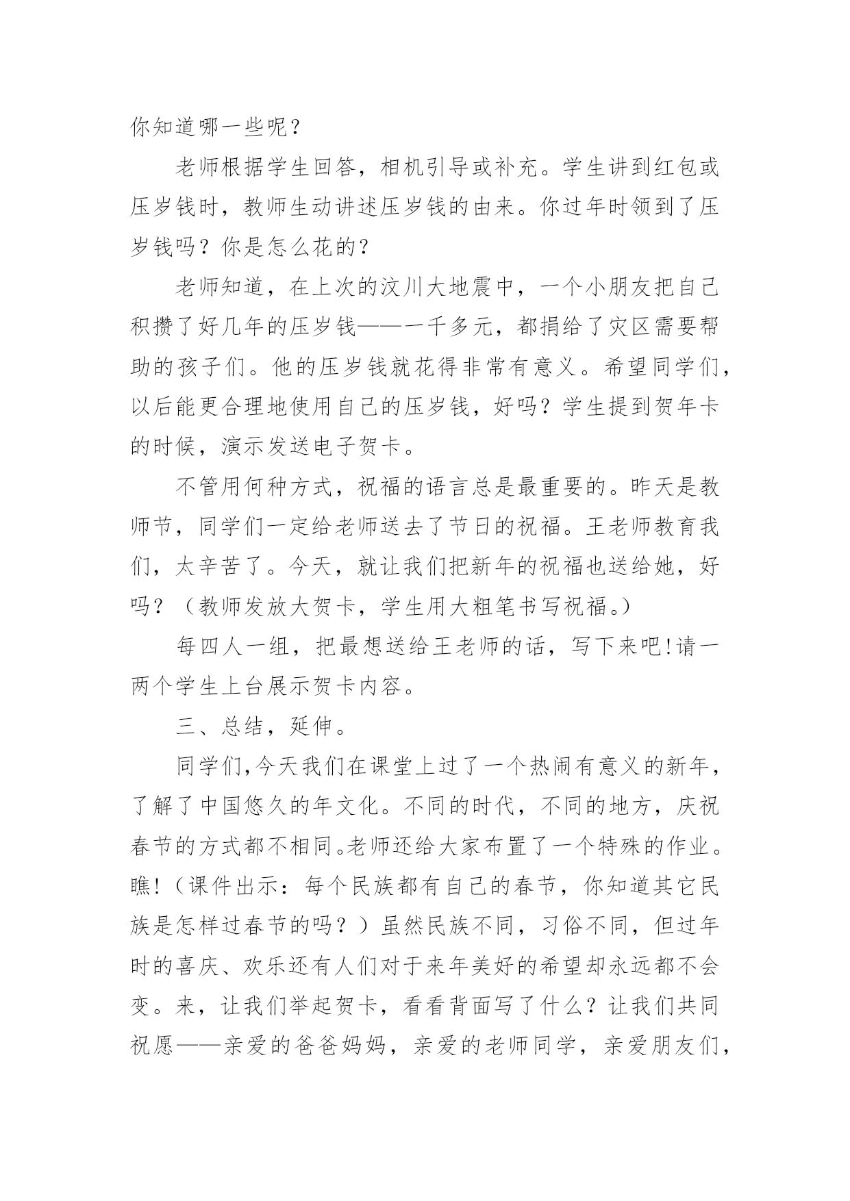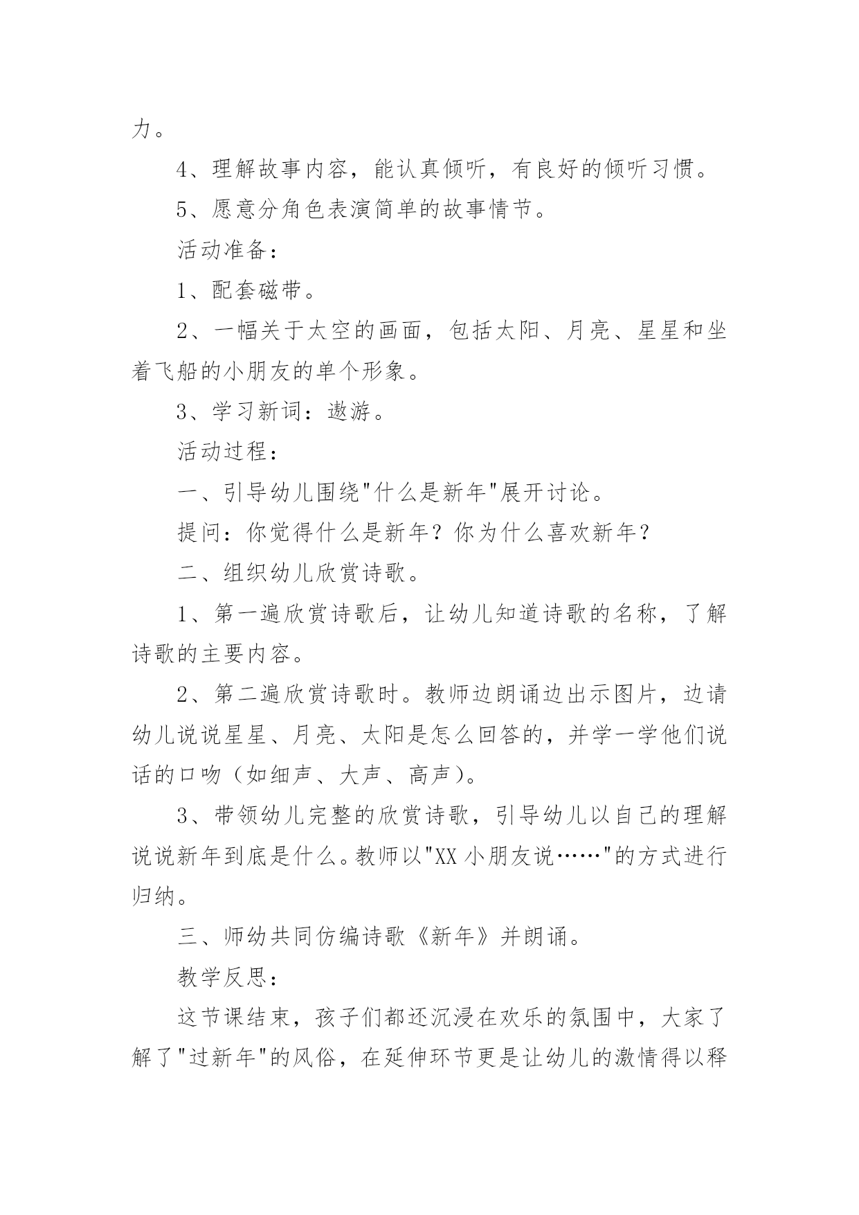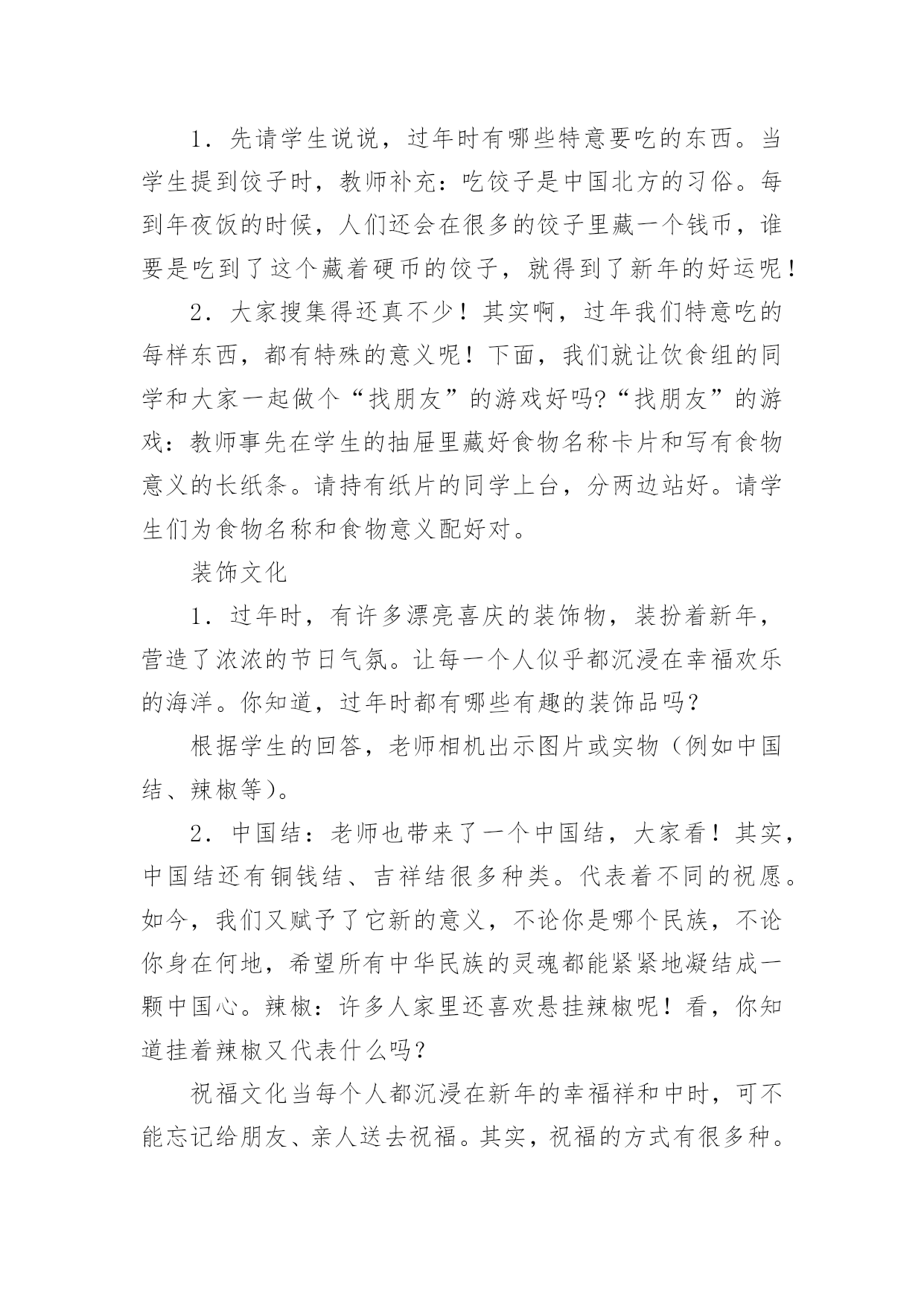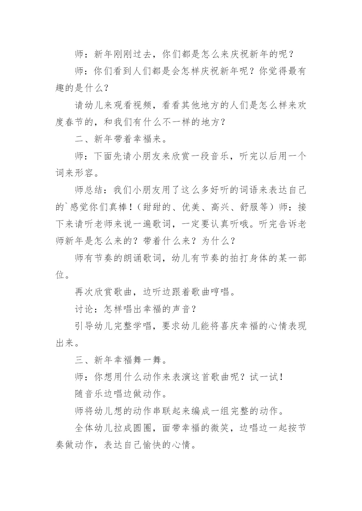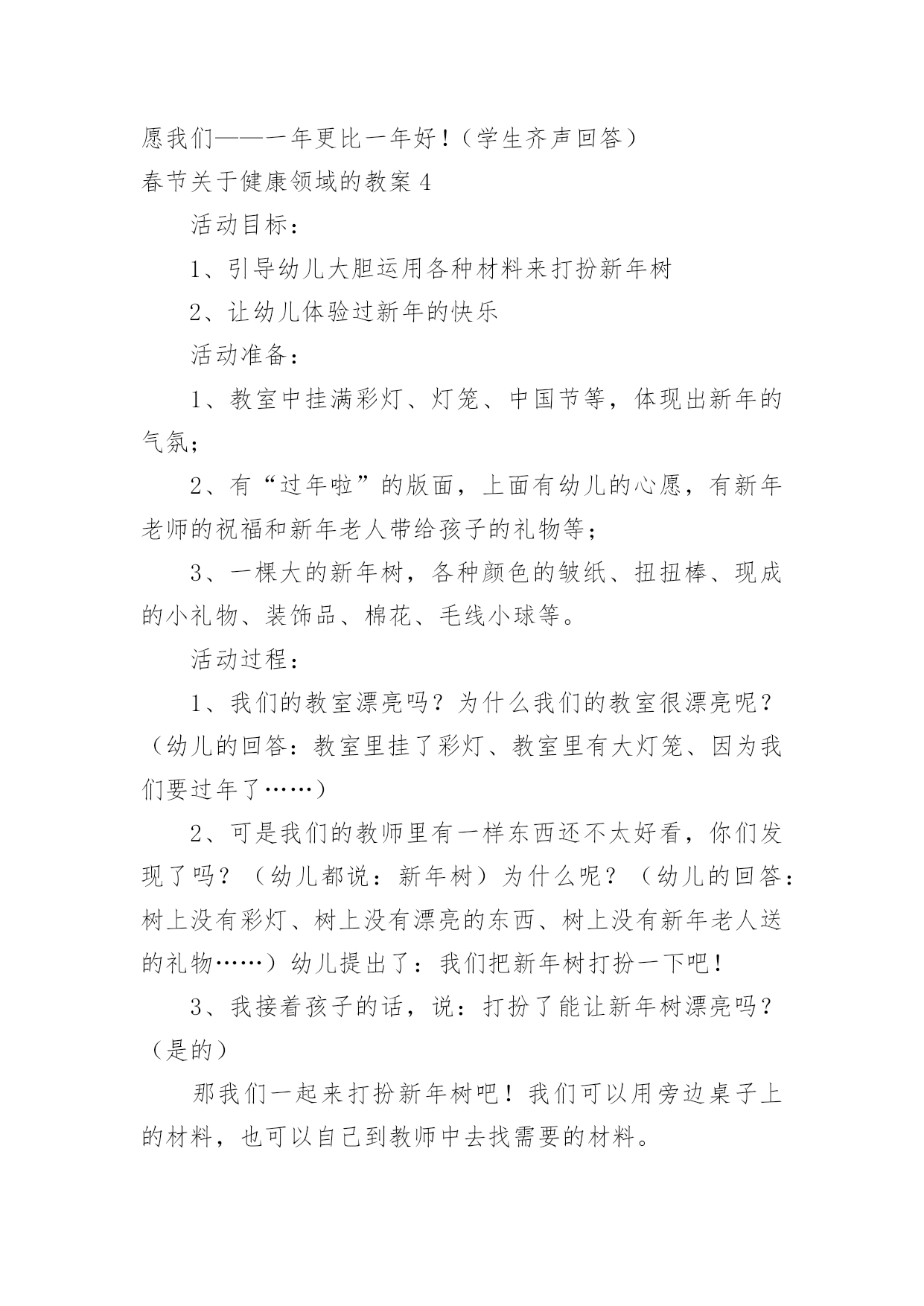 春节健康领域的教案春节关于健康领域的教案作为一名教职工,常常要根据教学需要编写教案,教案有助于学生理解并掌握系统的知识。快来参考教案是怎么写的吧!下面是小编精心整理的春节关于健康领域的教案,供大家参考借鉴,希望可以帮助到有需要的朋友。春节关于健康领域的教案1活动目标1、感受并体验新年到来时的快乐气氛,为迎接新年做些力所能及的劳动。2、参加庆新年大扫除活动,并愿意在活动中承担任务,付出努力。3、培养学生与人合作的能力,并与他人分享快乐。4、发展幼儿的动手能力。5、积极参与活动,能用简单的语言表达自己的感受。教学重点、难点教学重点:发展幼儿想象力、表现力及口语表达能力。教学难点:进一步提高幼儿的操作能力,以及培养幼儿创造美、表现美的能力。活动准备材料准备:扫帚、抹布、撮子、盆等各种劳动工具。经验准备:学生已有的擦桌子、扫地等劳动经验。活动过程一、切入活动主题,激发活动兴趣。二、师生进行分工。1、讨论:教室里有哪些地方需要打扫(1)学生看一看,找一找。(2)向全体学生进行汇报2、学生进行交流:找出自己能做的事3、议一议:扫除是应该注意的事项4、想一想:怎样才能又快又好的完成任务。5、教师进行讲述劳动时应该注意的安全事宜,进行分工。三、学生合作劳动。四、分享劳动的快乐。1、整理工具。2、小组评议。3、教师小结五、课外延伸:在春节到来时学生和家长共同进行一次家庭大扫除。春节关于健康领域的教案2活动目标:1、初步了解诗歌的内容,大概知道新年的特殊意义,体验新年给人们带来的欢乐。2、学习专心地倾听同伴的发言。3、初步尝试仿编诗歌,发展与锻炼幼儿的语言表达能力。4、理解故事内容,能认真倾听,有良好的倾听习惯。5、愿意分角色表演简单的故事情节。活动准备:1、配套磁带。2、一幅关于太空的画面,包括太阳、月亮、星星和坐着飞船的小朋友的单个形象。3、学习新词:遨游。活动过程:一、引导幼儿围绕"什么是新年"展开讨论。提问:你觉得什么是新年?你为什么喜欢新年?二、组织幼儿欣赏诗歌。1、第一遍欣赏诗歌后,让幼儿知道诗歌的名称,了解诗歌的主要内容。2、第二遍欣赏诗歌时。教师边朗诵边出示图片,边请幼儿说说星星、月亮、太阳是怎么回答的,并学一学他们说话的口吻(如细声、大声、高声)。3、带领幼儿完整的欣赏诗歌,引导幼儿以自己的理解说说新年到底是什么。教师以"XX小朋友说……"的方式进行归纳。三、师幼共同仿编诗歌《新年》并朗诵。教学反思:这节课结束,孩子们都还沉浸在欢乐的氛围中,大家了解了"过新年"的风俗,在延伸环节更是让幼儿的激情得以释放到极致。今后就让幼儿在课堂上能说,有看、有动(操作)。春节关于健康领域的教案3教学重、难点:了解过春节的风俗习惯,挖掘过年的文化内涵,培养学生对生活的积极态度。教具准备:自制课件、中国结、辣椒装饰、彩色纸片、自制贺卡等。教学过程:一、创设情境,激趣导入。1、(课前播放多媒体VCD《新年好》片段,使教室里洋溢着浓浓的节日气氛。)听到这欢乐的音乐,看到这喜庆的画面。你想到了什么?你们喜欢过年吗?2.今天,我们就一起提前过个热闹的新年,好吗?(板书课题,大声齐读)二、全班汇报交流1.说说在记忆中,你对过年最深的印象是什么?(根据学生回答,板书)2.根据学生答案,引导学生概括、分类。(相机板书“饮食、装饰、祝福、其它)三、分组汇报交流同学们昨天回家都搜集了有关过年的不同风俗文化,下面我们就来分别汇报汇报吧!先来谈谈过年的什么文化呢?饮食文化1.先请学生说说,过年时有哪些特意要吃的东西。当学生提到饺子时,教师补充:吃饺子是中国北方的习俗。每到年夜饭的时候,人们还会在很多的饺子里藏一个钱币,谁要是吃到了这个藏着硬币的饺子,就得到了新年的好运呢!2.大家搜集得还真不少!其实啊,过年我们特意吃的每样东西,都有特殊的意义呢!下面,我们就让饮食组的同学和大家一起做个“找朋友”的游戏好吗?“找朋友”的游戏:教师事先在学生的抽屉里藏好食物名称卡片和写有食物意义的长纸条。请持有纸片的同学上台,分两边站好。请学生们为食物名称和食物意义配好对。装饰文化1.过年时,有许多漂亮喜庆的装饰物,装扮着新年,营造了浓浓的节日气氛。让每一个人似乎都沉浸在幸福欢乐的海洋。你知道,过年时都有哪些有趣的装饰品吗?根据学生的回答,老师相机出示图片或实物(例如中国结、辣椒等)。2.中国结:老师也带来了一个中国结,大家看!其实,中国结还有铜钱结、吉祥结很多种类。代表着不同的祝愿。如今,我们又赋予了它新的意义,不论你是哪个民族,不论你身在何地,希望所有中华民族的灵魂都能紧紧地凝结成一颗中国心。辣椒:许多人家里还喜欢悬挂辣椒呢!看,你知道挂着辣椒又代表什么吗?祝福文化当每个人都沉浸在新年的幸福祥和中时,可不能忘记给朋友、亲人送去祝福。其实,祝福的方式有很多种。你知道哪一些呢?老师根据