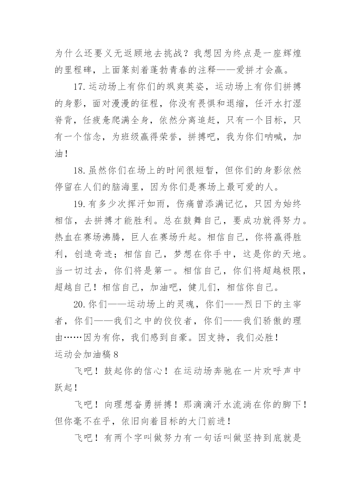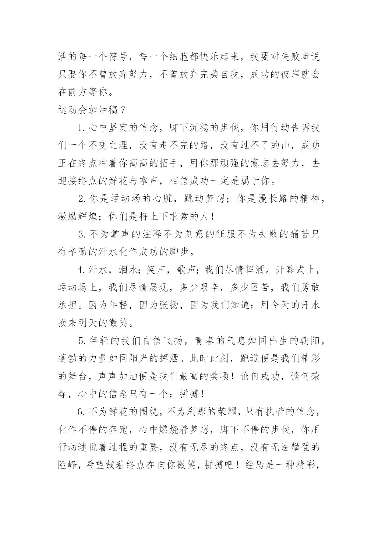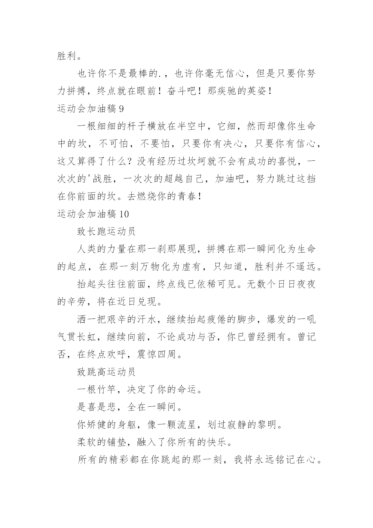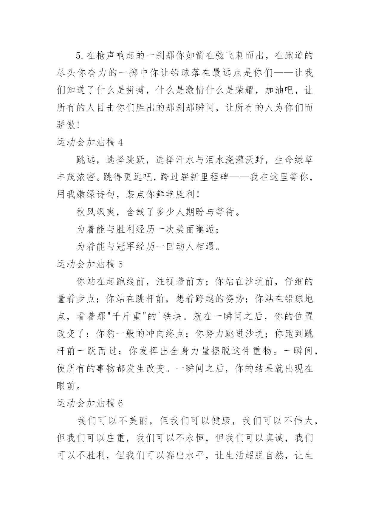 运动会加油稿【优】运动会加油稿15篇在日常生活和工作中,我们都跟加油稿有着直接或间接的联系,借助加油稿往往可以提升对方的气势。相信很多朋友都对写加油稿感到非常苦恼吧,以下是小编为大家整理的运动会加油稿,仅供参考,大家一起来看看吧。运动会加油稿1你的毅力令我们全班折服,你的努力,令我们全班佩服,你是我们班的`焦点,你是全班的中心,不屈不挠,坚持不懈,你让我们真正体会到奥运精神,我们为你而骄傲,为你而喝彩。或许,有意无意之间,你已陷入一场惊心动魄的争夺之中,即使天崩地裂,日月无光,你毫无怨言,永往直前。既然心中已锁定目标,就抛却一切,以智慧体魄为羽翼,以坚韧刚强为动力,扶摇直上,挣脱束缚,跨越障碍,在终点处先拔头筹,在磨砺中超越自我。运动会加油稿2没有虎一样的强壮,却有夸父追日般的执着;没有豹一样的速度,却有愚公移山般的坚定;没有鹰一样的迅捷,却有泰山崩于前的沉着。怀有必胜的信念,一次又一次向自我发出挑战。胜不骄,败不馁,直面一切困难与挫折。年轻的岁月,我们追求卓越;年轻的'我们,拥抱成功;年轻的赛场,洒下泪与汗……为你喝彩,心中的英雄。运动会加油稿31.也许流星并不少见,但它燃烧的刹那,留给人间最美丽的回忆!也许笑脸并不少见,但胜利的喜悦,总会留给世界精彩的一瞬!是的,那些曾经美妙的东西只有短短的一瞬间,但那却把最辉煌的一刻留给了人间。胜利,是每个人所追求的,胜利的`喜悦,是胜利与重新开始的转折,胜利是新的开始!2.你是运动场的心脏,跳动梦想;你是漫长路的精神,激励辉煌;你们是将上下求索的人!风为你加油,云为你助兴,坚定,执着,耐力与希望,在延伸的白色跑道中点点凝聚!力量,信念,拼搏与奋斗,在遥远的终点线上渐渐明亮!时代的强音正在你的脚下踏响。3.此时此刻,你们就像海浪中海鸥,唯有激流勇进,不畏艰险,奋斗拼搏,方能中流击水,翱翔海上。不管狂风_雨,不理闪电雷暴,心中始终只有一个目标:飞,飞,飞。最后在金色的阳光中,接受掌声的沐浴。4.运动员,是体育场上游走的火焰,是来去不息的脚步,是风中飞舞的树叶折射的金色光芒,藉此,可以诠释运动员兴奋的脸庞。那轻盈的步伐似飞鸟的翅膀,那清脆的枪声响彻天际,它粲然升起那跃动的渴望,起跑加速超越冲刺,一步一步延向胜利的曙光。那是力的比拼,素质的较量,是石榴树上,跃动的心脏。5.在枪声响起的一刹那你如箭在弦飞刺而出,在跑道的尽头你奋力的一掷中你让铅球落在最远点是你们——让我们知道了什么是拼搏,什么是激情什么是荣耀,加油吧,让所有的人目击你们胜出的那刹那瞬间,让所有的人为你们而骄傲!运动会加油稿4跳远,选择跳跃,选择汗水与泪水浇灌沃野,生命绿草丰茂浓密。跳得更远吧,跨过崭新里程碑——我在这里等你,用我嫩绿诗句,装点你鲜艳胜利!秋风飒爽,含载了多少人期盼与等待。为着能与胜利经历一次美丽邂逅;为着能与冠军经历一回动人相遇。运动会加油稿5你站在起跑线前,注视着前方;你站在沙坑前,仔细的量着步点;你站在跳杆前,想着跨越的姿势;你站在铅球地点,看着那"千斤重"的`铁块。就在一瞬间之后,你的位置改变了:你豹一般的冲向终点;你努力跳进沙坑;你跑到跳杆前一跃而过;你发挥出全身力量摆脱这件重物。一瞬间,使所有的事物都发生改变。一瞬间之后,你的结果就出现在眼前。运动会加油稿6我们可以不美丽,但我们可以健康,我们可以不伟大,但我们可以庄重,我们可以不永恒,但我们可以真诚,我们可以不胜利,但我们可以赛出水平,让生活超脱自然,让生活的每一个符号,每一个细胞都快乐起来,我要对失败者说只要你不曾放弃努力,不曾放弃完美自我,成功的彼岸就会在前方等你。运动会加油稿71.心中坚定的信念,脚下沉稳的步伐,你用行动告诉我们一个不变之理,没有走不完的路,没有过不了的山,成功正在终点冲着你高高的招手,用你那顽强的意志去努力,去迎接终点的鲜花与掌声,相信成功一定是属于你。2.你是运动场的心脏,跳动梦想;你是漫长路的精神,激励辉煌;你们是将上下求索的人!3.不为掌声的注释不为刻意的征服不为失败的痛苦只有辛勤的汗水化作成功的脚步。4.汗水,泪水;笑声,歌声;我们尽情挥洒。开幕式上,运动场上,我们尽情展现,多少艰辛,多少困苦,我们勇敢承担。因为年轻,因为张扬,因为我们知道:用今天的汗水换来明天的微笑。5.年轻的我们自信飞扬,青春的气息如同出生的朝阳,蓬勃的力量如同阳光的挥洒。此时此刻,跑道便是我们精彩的舞台,声声加油便是我们最高的奖项!论何成功,谈何荣辱,心中的信念只有一个:拼搏!6.不为鲜花的围绕,不为刹那的荣耀,只有执着的信念,化作不停的奔跑,心中燃烧着梦想,脚下不停的步伐,你用行动述说着过程的重要,没有无尽的终点,没有无法攀登的险峰,希望载着终点在向你微笑,拼搏吧!经历是一种精彩,迸发你全部的能量,成功是你汗水的写照。7.温暖的阳光洒在赛场上