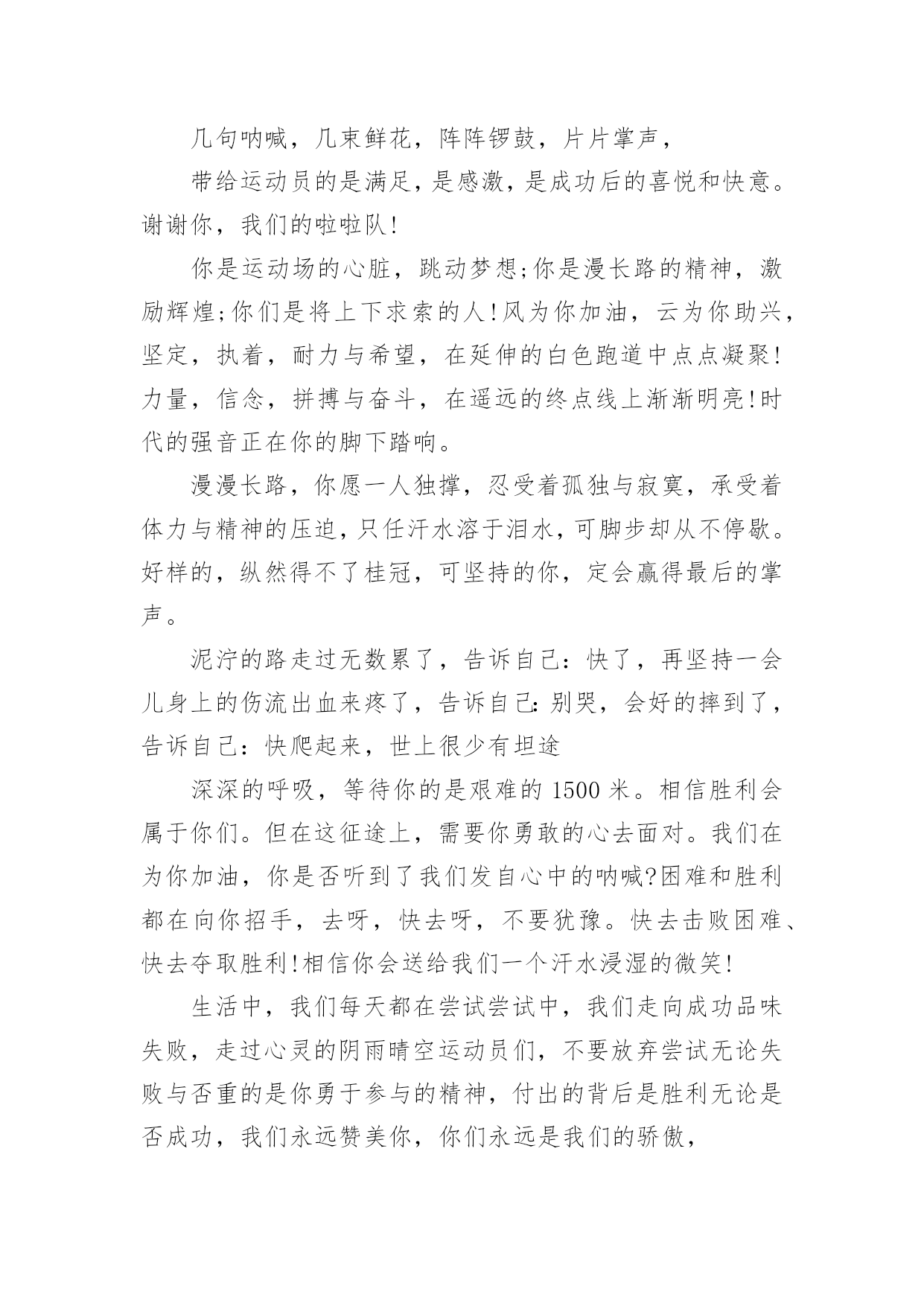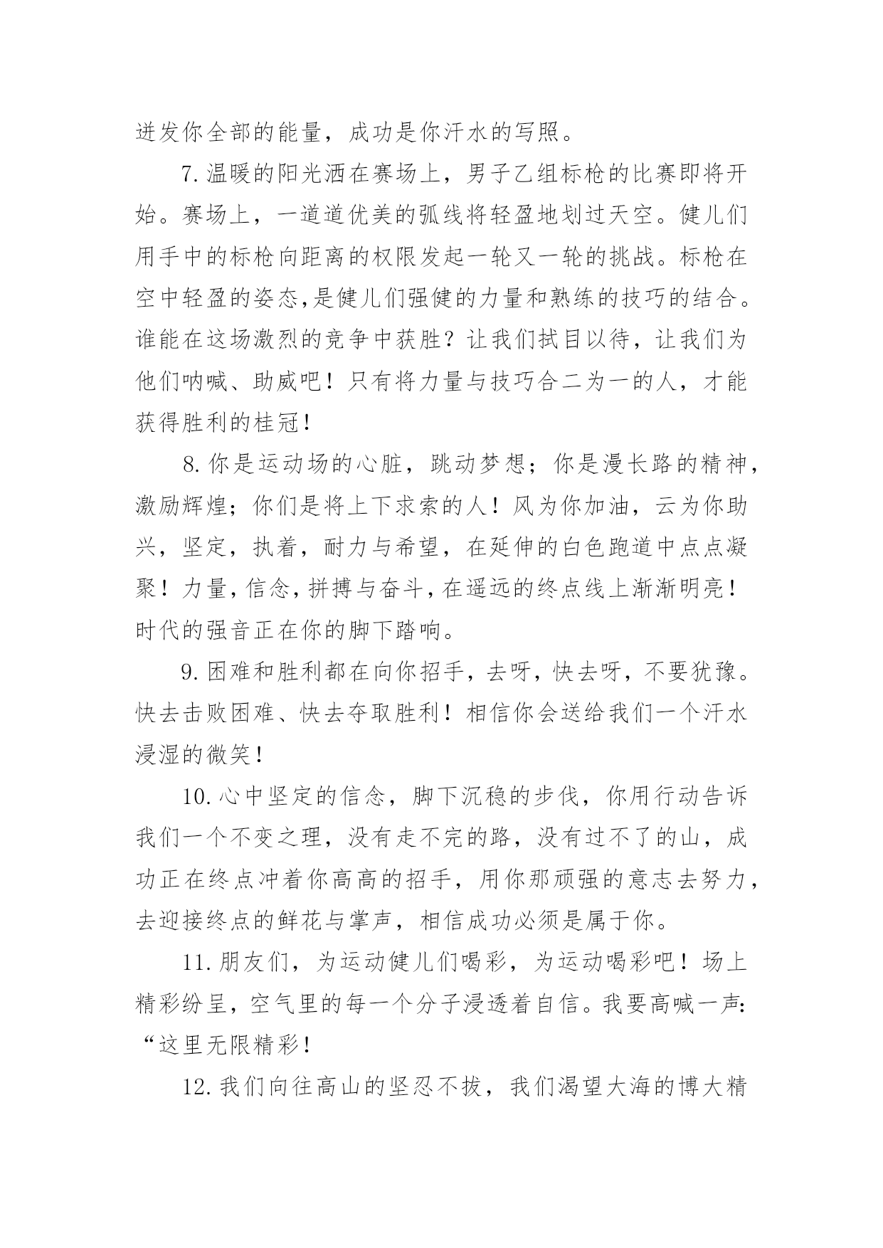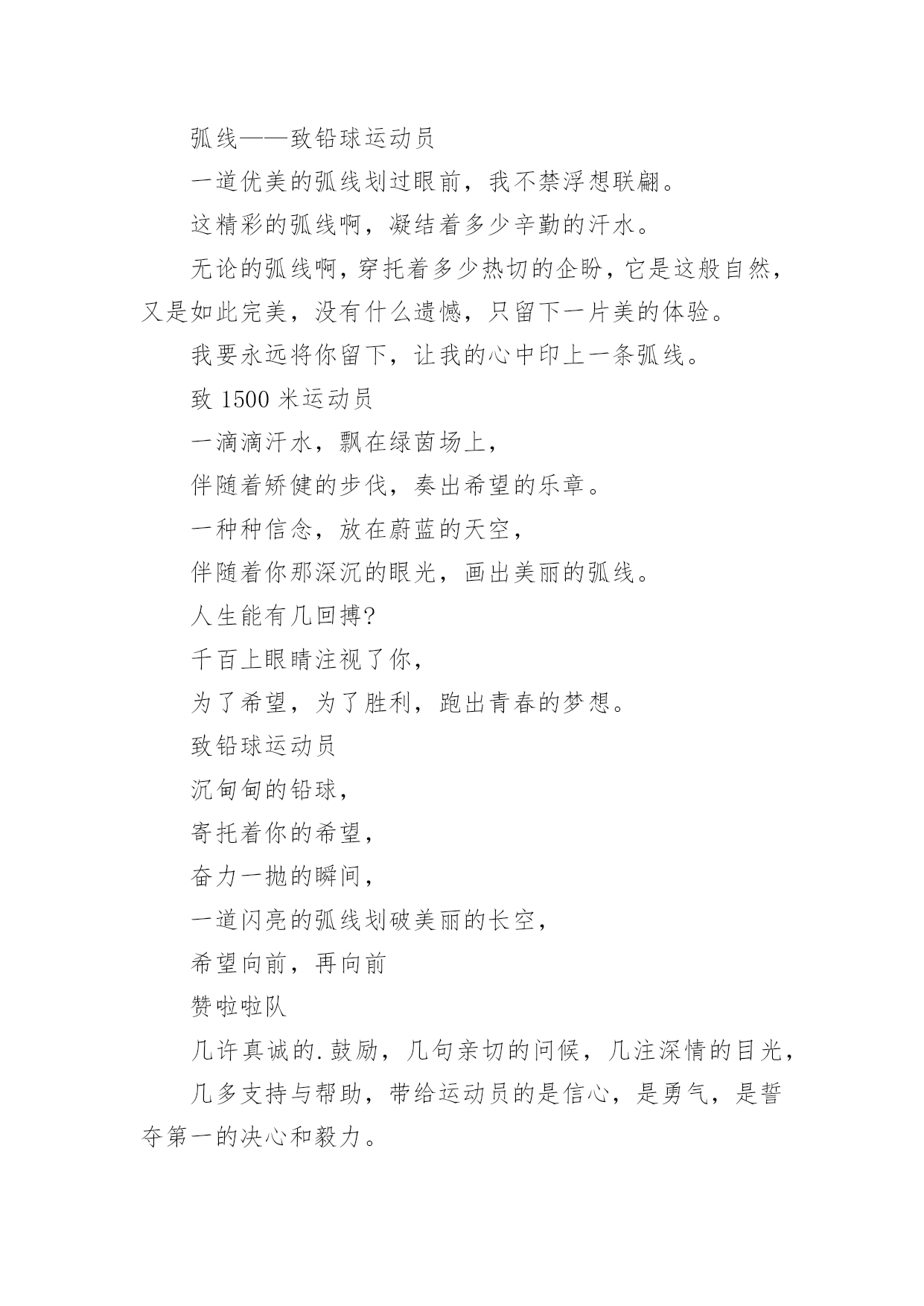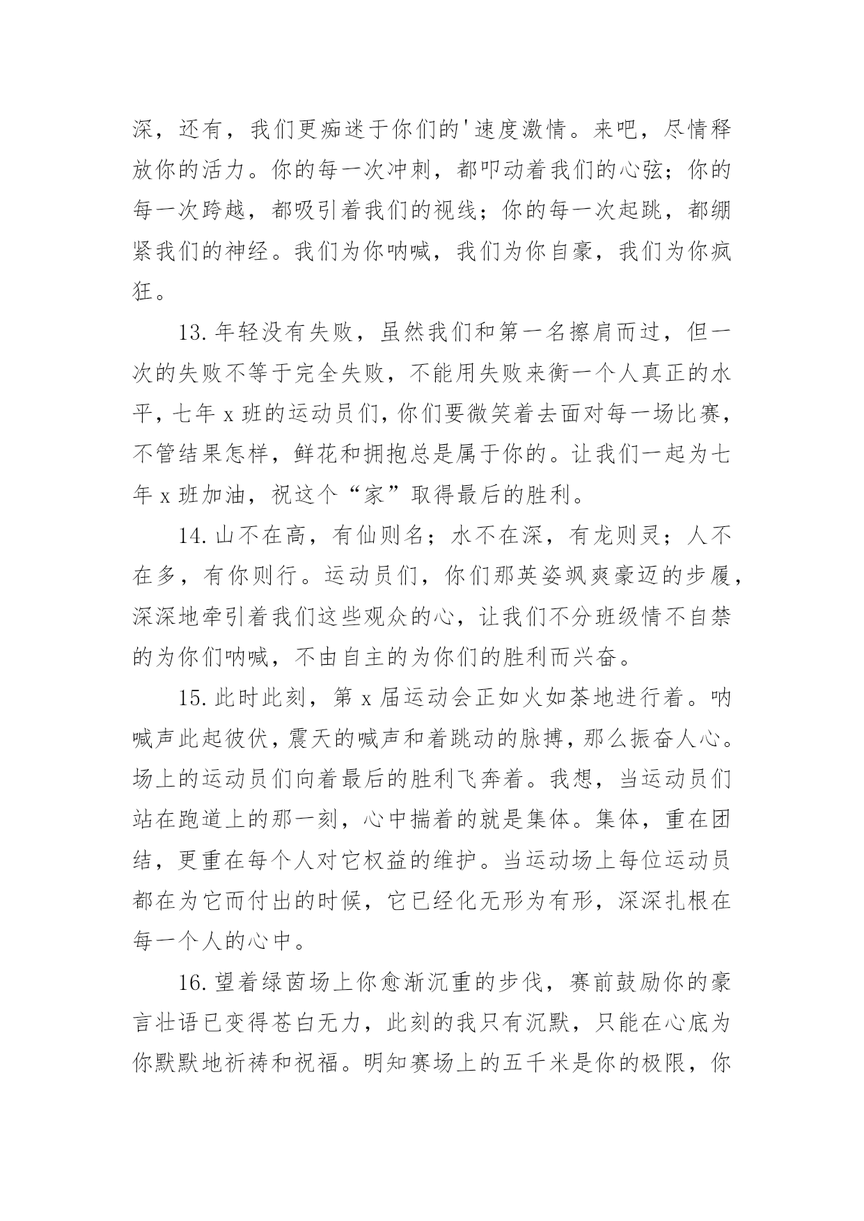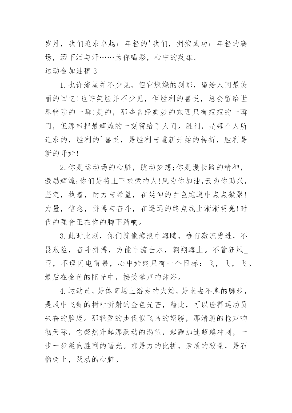 运动会加油稿【优】运动会加油稿15篇在日常生活和工作中,我们都跟加油稿有着直接或间接的联系,借助加油稿往往可以提升对方的气势。相信很多朋友都对写加油稿感到非常苦恼吧,以下是小编为大家整理的运动会加油稿,仅供参考,大家一起来看看吧。运动会加油稿1你的毅力令我们全班折服,你的努力,令我们全班佩服,你是我们班的`焦点,你是全班的中心,不屈不挠,坚持不懈,你让我们真正体会到奥运精神,我们为你而骄傲,为你而喝彩。或许,有意无意之间,你已陷入一场惊心动魄的争夺之中,即使天崩地裂,日月无光,你毫无怨言,永往直前。既然心中已锁定目标,就抛却一切,以智慧体魄为羽翼,以坚韧刚强为动力,扶摇直上,挣脱束缚,跨越障碍,在终点处先拔头筹,在磨砺中超越自我。运动会加油稿2没有虎一样的强壮,却有夸父追日般的执着;没有豹一样的速度,却有愚公移山般的坚定;没有鹰一样的迅捷,却有泰山崩于前的沉着。怀有必胜的信念,一次又一次向自我发出挑战。胜不骄,败不馁,直面一切困难与挫折。年轻的岁月,我们追求卓越;年轻的'我们,拥抱成功;年轻的赛场,洒下泪与汗……为你喝彩,心中的英雄。运动会加油稿31.也许流星并不少见,但它燃烧的刹那,留给人间最美丽的回忆!也许笑脸并不少见,但胜利的喜悦,总会留给世界精彩的一瞬!是的,那些曾经美妙的东西只有短短的一瞬间,但那却把最辉煌的一刻留给了人间。胜利,是每个人所追求的,胜利的`喜悦,是胜利与重新开始的转折,胜利是新的开始!2.你是运动场的心脏,跳动梦想;你是漫长路的精神,激励辉煌;你们是将上下求索的人!风为你加油,云为你助兴,坚定,执着,耐力与希望,在延伸的白色跑道中点点凝聚!力量,信念,拼搏与奋斗,在遥远的终点线上渐渐明亮!时代的强音正在你的脚下踏响。3.此时此刻,你们就像海浪中海鸥,唯有激流勇进,不畏艰险,奋斗拼搏,方能中流击水,翱翔海上。不管狂风_雨,不理闪电雷暴,心中始终只有一个目标:飞,飞,飞。最后在金色的阳光中,接受掌声的沐浴。4.运动员,是体育场上游走的火焰,是来去不息的脚步,是风中飞舞的树叶折射的金色光芒,藉此,可以诠释运动员兴奋的脸庞。那轻盈的步伐似飞鸟的翅膀,那清脆的枪声响彻天际,它粲然升起那跃动的渴望,起跑加速超越冲刺,一步一步延向胜利的曙光。那是力的比拼,素质的较量,是石榴树上,跃动的心脏。5.在枪声响起的一刹那你如箭在弦飞刺而出,在跑道的尽头你奋力的一掷中你让铅球落在最远点是你们——让我们知道了什么是拼搏,什么是激情什么是荣耀,加油吧,让所有的人目击你们胜出的那刹那瞬间,让所有的人为你们而骄傲!运动会加油稿4跳远,选择跳跃,选择汗水与泪水浇灌沃野,生命绿草丰茂浓密。跳得更远吧,跨过崭新里程碑——我在这里等你,用我嫩绿诗句,装点你鲜艳胜利!秋风飒爽,含载了多少人期盼与等待。为着能与胜利经历一次美丽邂逅;为着能与冠军经历一回动人相遇。运动会加油稿5你站在起跑线前,注视着前方;你站在沙坑前,仔细的量着步点;你站在跳杆前,想着跨越的姿势;你站在铅球地点,看着那"千斤重"的`铁块。就在一瞬间之后,你的位置改变了:你豹一般的冲向终点;你努力跳进沙坑;你跑到跳杆前一跃而过;你发挥出全身力量摆脱这件重物。一瞬间,使所有的事物都发生改变。一瞬间之后,你的结果就出现在眼前。运动会加油稿6我们可以不美丽,但我们可以健康,我们可以不伟大,但我们可以庄重,我们可以不永恒,但我们可以真诚,我们可以不胜利,但我们可以赛出水平,让生活超脱自然,让生活的每一个符号,每一个细胞都快乐起来,我要对失败者说只要你不曾放弃努力,不曾放弃完美自我,成功的彼岸就会在前方等你。运动会加油稿71.心中坚定的信念,脚下沉稳的步伐,你用行动告诉我们一个不变之理,没有走不完的路,没有过不了的山,成功正在终点冲着你高高的招手,用你那顽强的意志去努力,去迎接终点的鲜花与掌声,相信成功一定是属于你。2.你是运动场的心脏,跳动梦想;你是漫长路的精神,激励辉煌;你们是将上下求索的人!3.不为掌声的注释不为刻意的征服不为失败的痛苦只有辛勤的汗水化作成功的脚步。4.汗水,泪水;笑声,歌声;我们尽情挥洒。开幕式上,运动场上,我们尽情展现,多少艰辛,多少困苦,我们勇敢承担。因为年轻,因为张扬,因为我们知道:用今天的汗水换来明天的微笑。5.年轻的我们自信飞扬,青春的气息如同出生的朝阳,蓬勃的力量如同阳光的挥洒。此时此刻,跑道便是我们精彩的舞台,声声加油便是我们最高的奖项!论何成功,谈何荣辱,心中的信念只有一个:拼搏!6.不为鲜花的围绕,不为刹那的荣耀,只有执着的信念,化作不停的奔跑,心中燃烧着梦想,脚下不停的步伐,你用行动述说着过程的重要,没有无尽的终点,没有无法攀登的险峰,希望载着终点在向你微笑,拼搏吧!经历是一种精彩,迸发你全部的能量,成功是你汗水的写照。7.温暖的阳光洒在赛场上