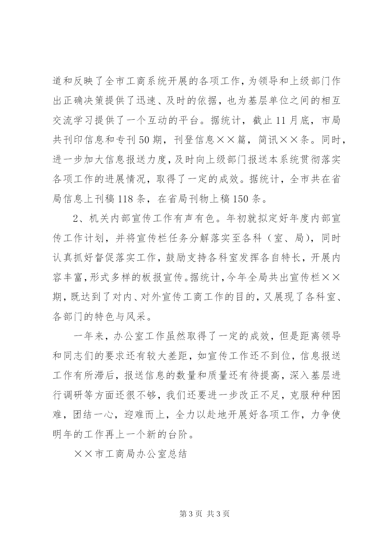 第PAGE\*Arabic\*MERGEFORMAT3页共NUMPAGES\*MERGEFORMAT3页××市工商局办公室总结2、热情地做好了来客接待工作。一是本着热情、节约的原则,继续做好局机关接待制度的改革工作,有效控制了接待费用;二是认真细致地做好了外事接待工作。今年5月份,我局友好局***中层干部一行**余人来我市考察学习。对此次接待任务,办公室高度重视,抽调精干人员组成工作组,明确分工,强化责任,并全程陪同客人参观学习考察。经过周密细致的准备和优质热情地服务,使学习考察圆满顺利结束,得到了领导和客人的高度肯定。据不完全统计,今年共接待**局长以及其他重要来客考察、访问、学习10余批次,完满地完成了各项接待任务。4、狠抓机关各项综合治理工作。一是做好了机关院内的安全稳定和值班工作。认真做好了元旦、春节、五一、十一以及两会期间机关值班安排;二是以“平安建设”为内容,狠抓院内的安全防盗、防火工作。一年来,未发生重特大刑事和安全责任事故;三是抓好机关院内的卫生清洁工作。多次组织全体人员开展了定期的卫生整治活动,积极清除各类垃圾,清扫各卫生死角,做到了机关院内干净卫生。同时积极支持市委、市政府组织的“创建文明卫生城”活动,多次组织机关全体干部职工,发扬不怕苦、不怕累的精神,到卫生包干小区进行义务劳动,得到了居委会和小区居民的高度赞扬。5、积极配合相关科室开展各项工作。如积极配合开展行风评议活动、各类专题会议的召开,确保有关工作得到及时贯彻和落实。三、围绕社会热点焦点,积极加大对内对外宣传报道力度。1、宣传力度进一步加大。今年以来,办公室宣传工作紧紧围绕当前社会和人民群众关心的热点、焦点和难点问题,如食品安全监管、农资商品质量检查、种子市场规范管理、广告市场整治等,进一步加大了在各种媒体上的宣传报道力度,特别是省局开展政务环境评议评价活动以及省、市局先后推出服务全民创业的多项优惠措施以来,市局切实加大宣传力度,先后在《**日报》、《**晚报》等新闻媒体上,连续刊登了我市工商系统深入整顿和规范市场经济秩序、倾情服务助推全民创业的各项有力举措和产生的积极成效,引起了相当的社会反响,进一步提升了工商部门的社会形象,积极策应了全省工商系统政务双评活动的顺利开展。据不完全统计,今年以来,全市系统共在市级以上新闻媒体上刊登各类新闻报道1393条,其中在××日报、××××报等国家级新闻媒体中上稿73条,省、市级新闻媒体上稿1239条,较去年有了明显提高。2、系统内信息工作紧扣“实”字。一年来,信息工作紧扣一个“实”字,紧紧围绕全市系统开展各类专项整治所采取的“实招”、取得的“实效”,服务群众和社会时办理的各项“实事”,向各级领导和上级做出实实在在地反映,客观、及时、动态地报道和反映了全市工商系统开展的各项工作,为领导和上级部门作出正确决策提供了迅速、及时的依据,也为基层单位之间的相互交流学习提供了一个互动的平台。据统计,截止11月底,市局共刊印信息和专刊50期,刊登信息××篇,简讯××条。同时,进一步加大信息报送力度,及时向上级部门报送本系统贯彻落实各项工作的进展情况,取得了一定的成效。据统计,全市共在省局信息上刊稿118条,在省局刊物上稿150条。2、机关内部宣传工作有声有色。年初就拟定好年度内部宣传工作计划,并将宣传栏任务分解落实至各科(室、局),同时认真抓好督促落实工作,鼓励支持各科室发挥各自特长,开展内容丰富,形式多样的板报宣传。据统计,今年全局共出宣传栏××期,既达到了对内、对外宣传工商工作的目的,又展现了各科室、各部门的特色与风采。一年来,办公室工作虽然取得了一定的成效,但是距离领导和同志们的要求还有较大差距,如宣传工作还不到位,信息报送工作有所滞后,报送信息的数量和质量还有待提高,深入基层进行调研等方面还很不够,我们还要进一步改正不足,克服种种困难,团结一心,迎难而上,全力以赴地开展好各项工作,力争使明年的工作再上一个新的台阶。××市工商局办公室总结