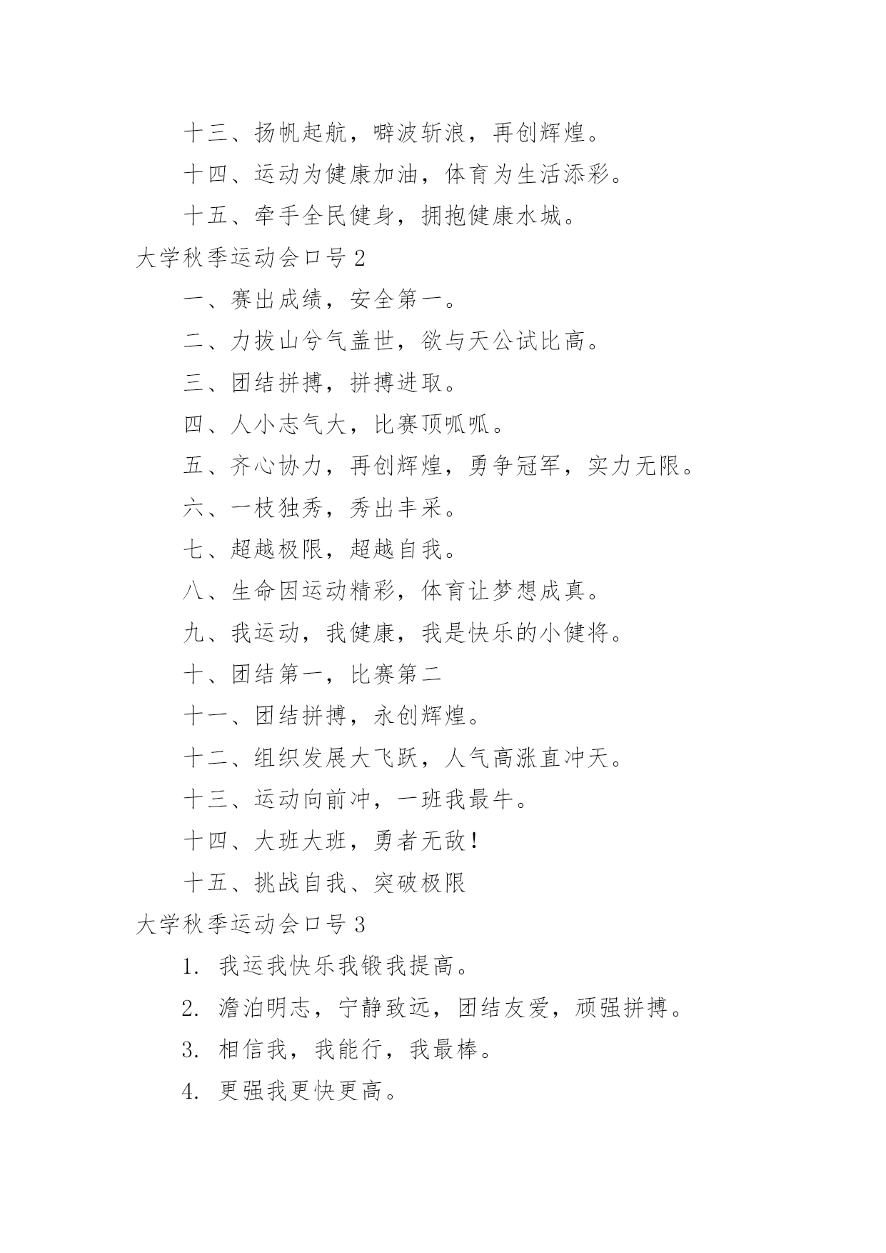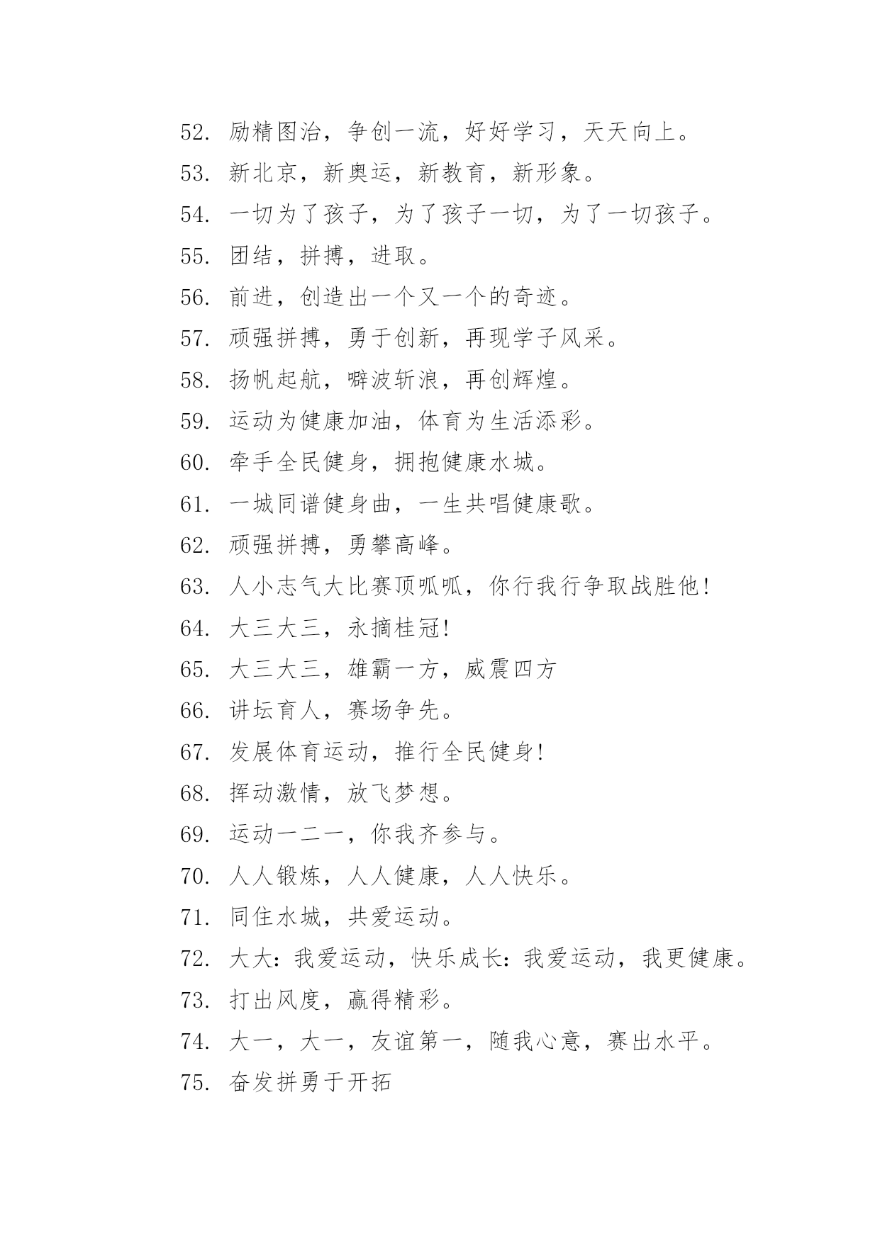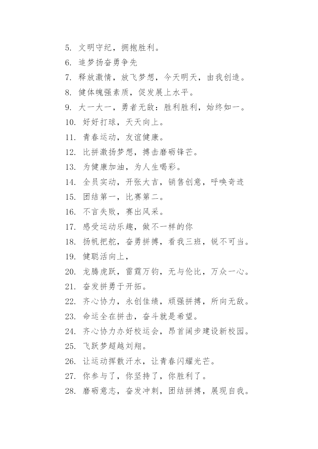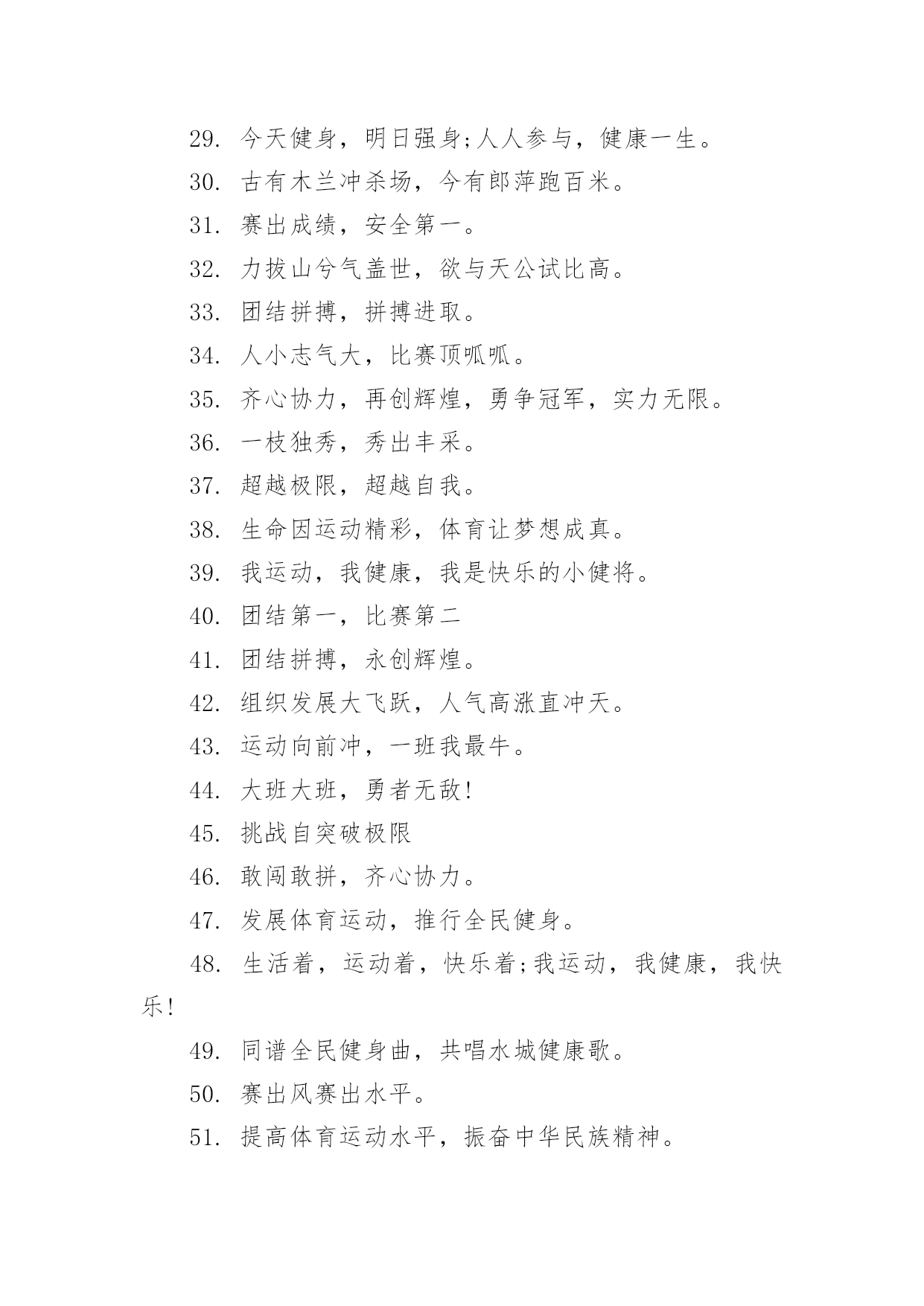 大学秋季运动会口号大学秋季运动会口号在日常学习、工作或生活中,大家都对那些朗朗上口的口号很是熟悉吧,口号是供口头呼喊的有纲领性和鼓动作用的简短句子。口号的类型多样,你所见过的口号是什么样的呢?以下是小编收集整理的大学秋季运动会口号,仅供参考,大家一起来看看吧。大学秋季运动会口号1一、敢闯敢拼,齐心协力。二、发展体育运动,推行全民健身。三、生活着,运动着,快乐着;我运动,我健康,我快乐!四、同谱全民健身曲,共唱水城健康歌。五、赛出风格、赛出水平。六、提高体育运动水平,振奋中华民族精神。七、励精图治,争创一流,好好学习,天天向上。八、新北京,新奥运,新教育,新形象。九、一切为了孩子,为了孩子一切,为了一切孩子。十、团结,拼搏,进取。十一、前进,创造出一个又一个的奇迹。十二、顽强拼搏,勇于创新,再现学子风采。十三、扬帆起航,噼波斩浪,再创辉煌。十四、运动为健康加油,体育为生活添彩。十五、牵手全民健身,拥抱健康水城。大学秋季运动会口号2一、赛出成绩,安全第一。二、力拔山兮气盖世,欲与天公试比高。三、团结拼搏,拼搏进取。四、人小志气大,比赛顶呱呱。五、齐心协力,再创辉煌,勇争冠军,实力无限。六、一枝独秀,秀出丰采。七、超越极限,超越自我。八、生命因运动精彩,体育让梦想成真。九、我运动,我健康,我是快乐的小健将。十、团结第一,比赛第二十一、团结拼搏,永创辉煌。十二、组织发展大飞跃,人气高涨直冲天。十三、运动向前冲,一班我最牛。十四、大班大班,勇者无敌!十五、挑战自我、突破极限大学秋季运动会口号31.我运我快乐我锻我提高。2.澹泊明志,宁静致远,团结友爱,顽强拼搏。3.相信我,我能行,我最棒。4.更强我更快更高。5.文明守纪,拥抱胜利。6.追梦扬奋勇争先7.释放激情,放飞梦想,今天明天,由我创造。8.健体魄强素质,促发展上水平。9.大一大一,勇者无敌:胜利胜利,始终如一。10.好好打球,天天向上。11.青春运动,友谊健康。12.比拼激扬梦想,搏击磨砺锋芒。13.为健康加油,为人生喝彩。14.全员实动,开张大吉,销售创意,呼唤奇迹15.团结第一,比赛第二。16.不言失败,赛出风采。17.感受运动乐趣,做不一样的你18.扬帆把舵,奋勇拼搏,看我三班,锐不可当。19.健聪活向上,20.龙腾虎跃,雷霆万钧,无与伦比,万众一心。21.奋发拼勇于开拓。22.齐心协力,永创佳绩,顽强拼搏,所向无敌。23.命运全在拼击,奋斗就是希望。24.齐心协力办好校运会,昂首阔步建设新校园。25.飞跃梦超越刘翔。26.让运动挥散汗水,让青春闪耀光芒。27.你参与了,你坚持了,你胜利了。28.磨砺意志,奋发冲刺,团结拼搏,展现自我。29.今天健身,明日强身;人人参与,健康一生。30.古有木兰冲杀场,今有郎萍跑百米。31.赛出成绩,安全第一。32.力拔山兮气盖世,欲与天公试比高。33.团结拼搏,拼搏进取。34.人小志气大,比赛顶呱呱。35.齐心协力,再创辉煌,勇争冠军,实力无限。36.一枝独秀,秀出丰采。37.超越极限,超越自我。38.生命因运动精彩,体育让梦想成真。39.我运动,我健康,我是快乐的小健将。40.团结第一,比赛第二41.团结拼搏,永创辉煌。42.组织发展大飞跃,人气高涨直冲天。43.运动向前冲,一班我最牛。44.大班大班,勇者无敌!45.挑战自突破极限46.敢闯敢拼,齐心协力。47.发展体育运动,推行全民健身。48.生活着,运动着,快乐着;我运动,我健康,我快乐!49.同谱全民健身曲,共唱水城健康歌。50.赛出风赛出水平。51.提高体育运动水平,振奋中华民族精神。52.励精图治,争创一流,好好学习,天天向上。53.新北京,新奥运,新教育,新形象。54.一切为了孩子,为了孩子一切,为了一切孩子。55.团结,拼搏,进取。56.前进,创造出一个又一个的奇迹。57.顽强拼搏,勇于创新,再现学子风采。58.扬帆起航,噼波斩浪,再创辉煌。59.运动为健康加油,体育为生活添彩。60.牵手全民健身,拥抱健康水城。61.一城同谱健身曲,一生共唱健康歌。62.顽强拼搏,勇攀高峰。63.人小志气大比赛顶呱呱,你行我行争取战胜他!64.大三大三,永摘桂冠!65.大三大三,雄霸一方,威震四方66.讲坛育人,赛场争先。67.发展体育运动,推行全民健身!68.挥动激情,放飞梦想。69.运动一二一,你我齐参与。70.人人锻炼,人人健康,人人快乐。71.同住水城,共爱运动。72.大大:我爱运动,快乐成长:我爱运动,我更健康。73.打出风度,赢得精彩。74.大一,大一,友谊第一,随我心意,赛出水平。75.奋发拼勇于开拓大学秋季运动会口号4一、一城同谱健身曲,一生共唱健康歌。二、顽强拼搏,勇攀高峰。三、人小志气大比赛顶呱呱,你行我行争取战胜他!四、大三大三,永摘桂冠!五、大三大三,雄霸一方