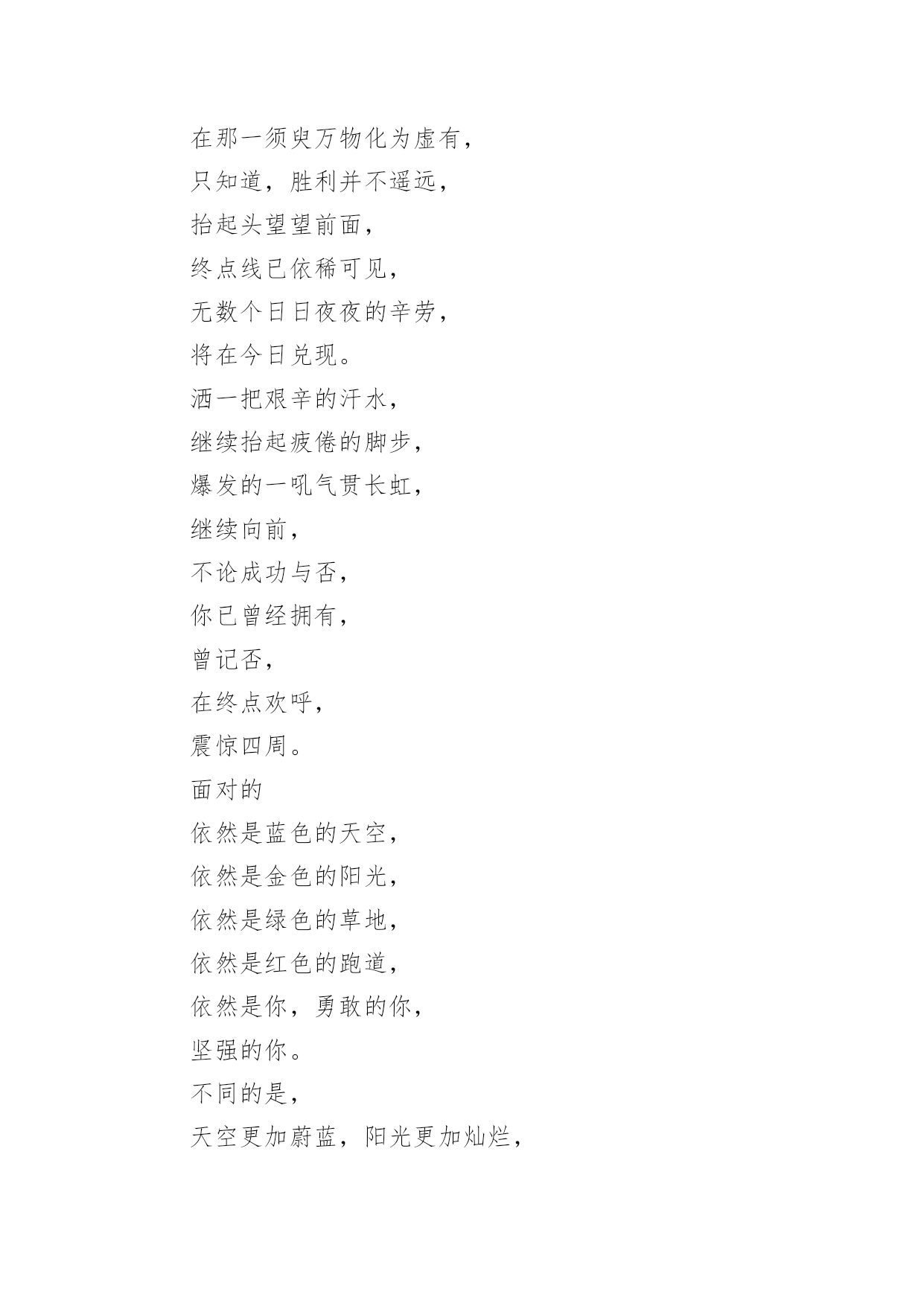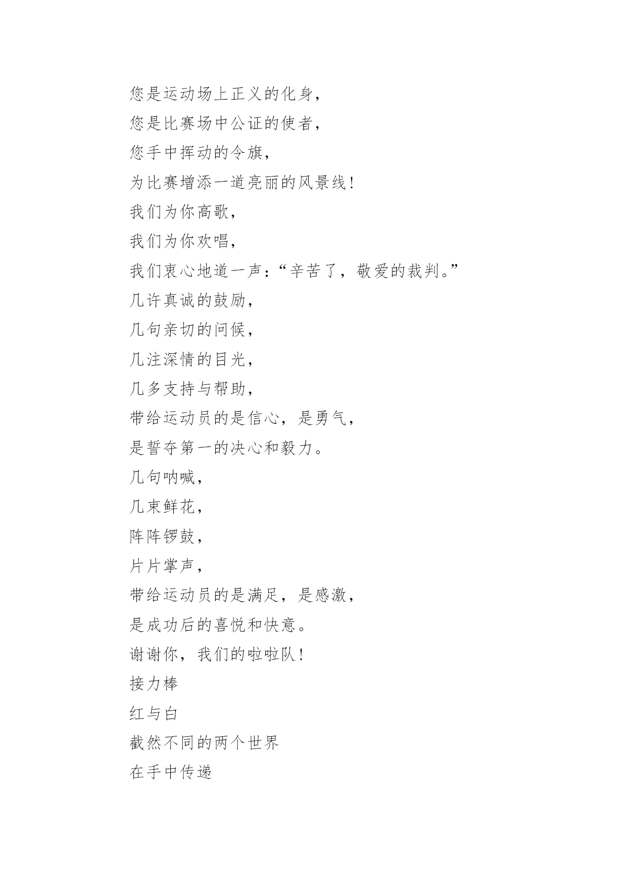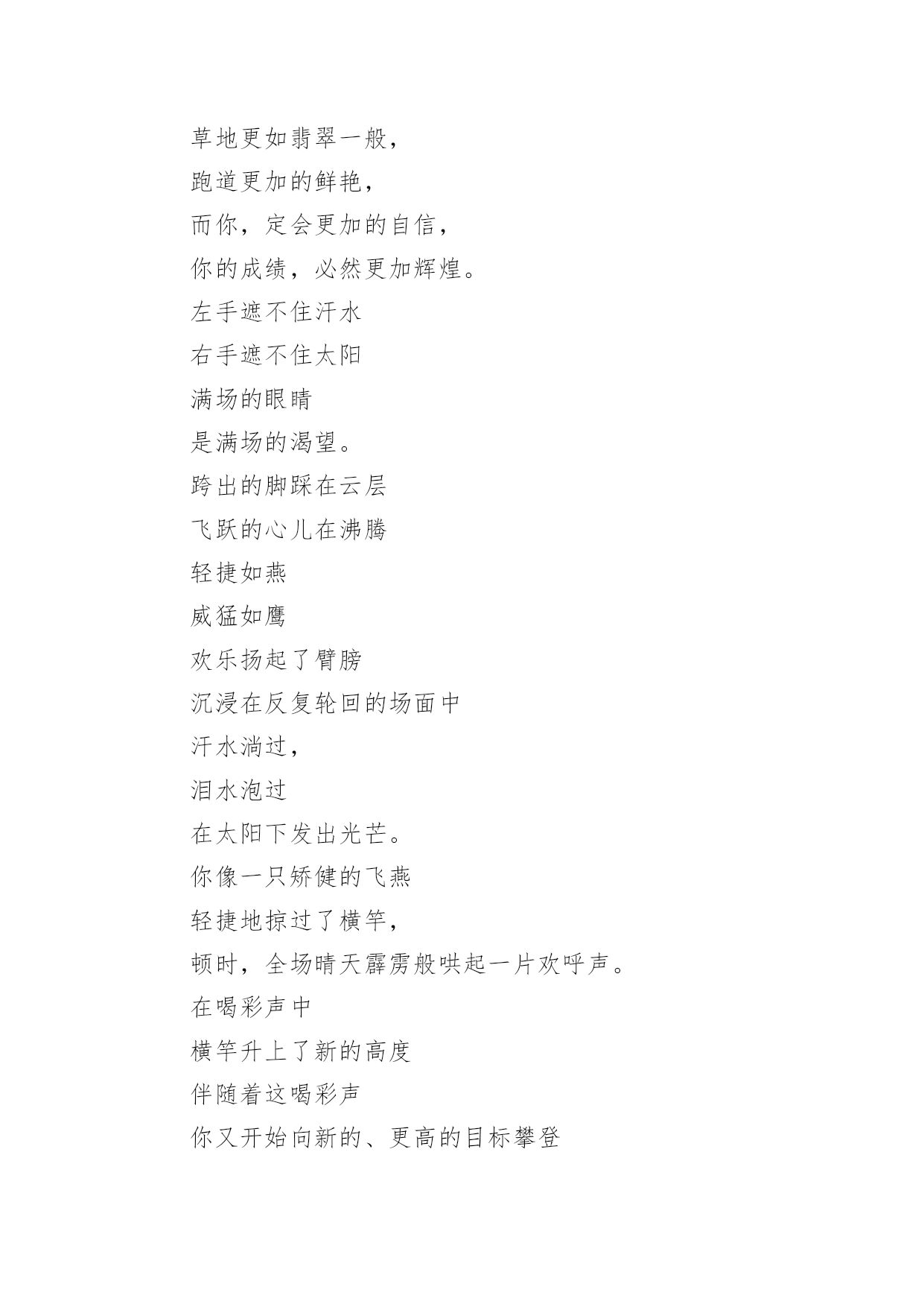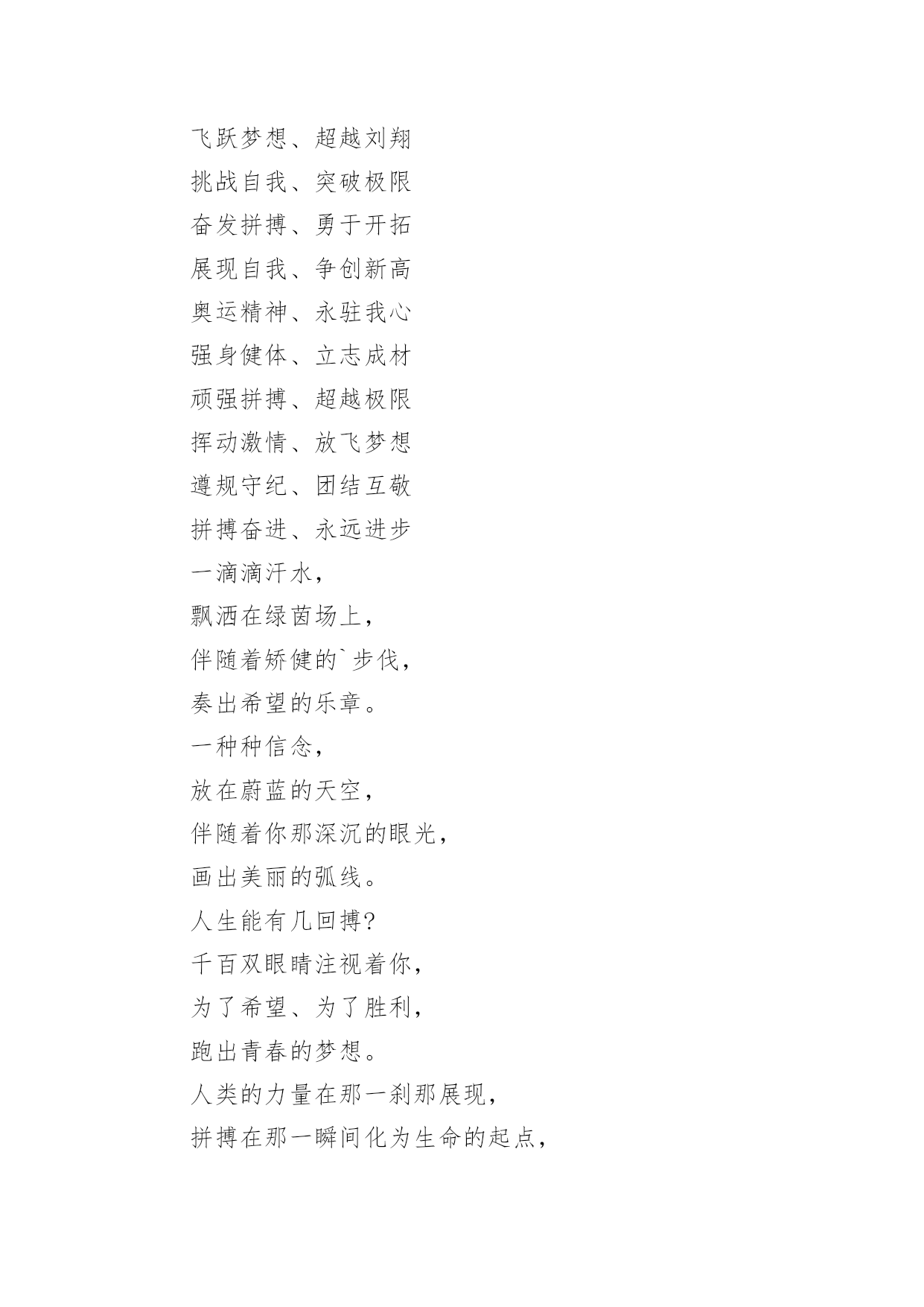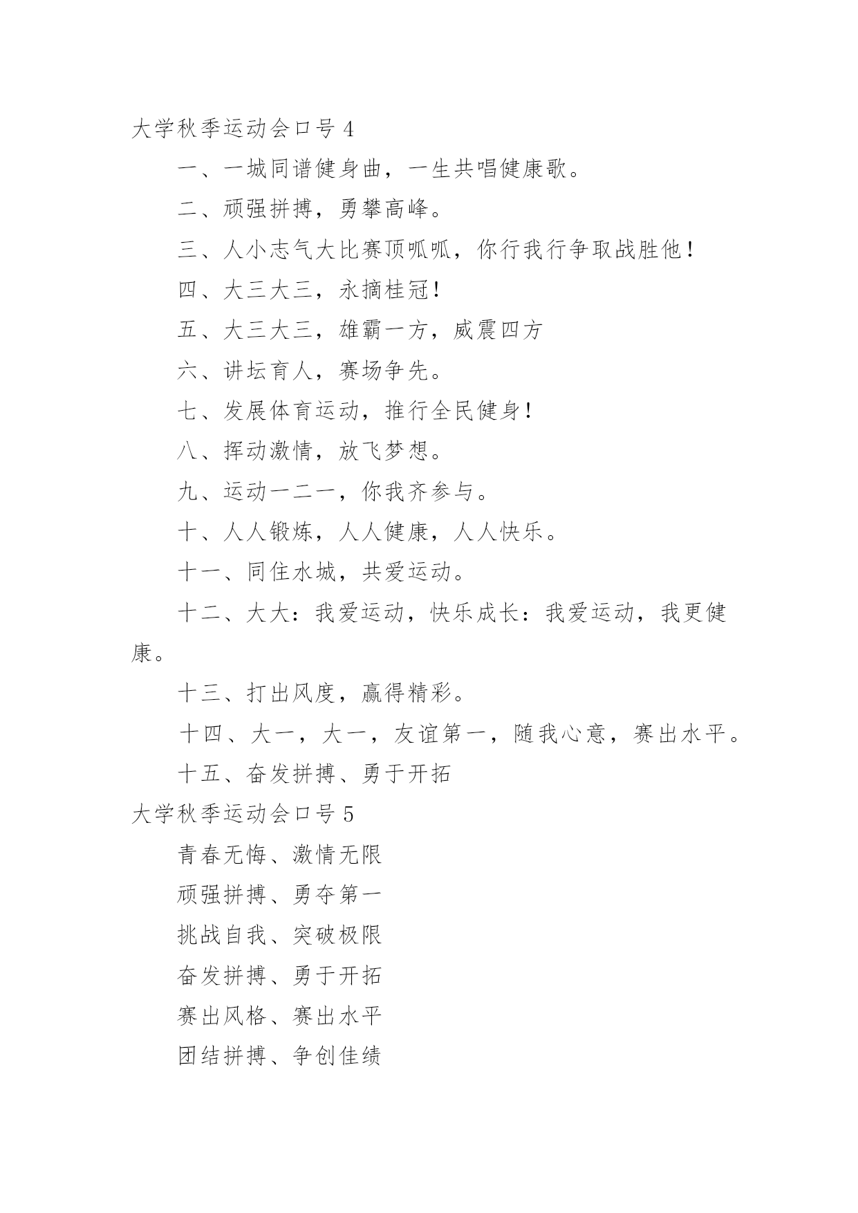 大学秋季运动会口号大学秋季运动会口号在日常学习、工作或生活中,大家都对那些朗朗上口的口号很是熟悉吧,口号是供口头呼喊的有纲领性和鼓动作用的简短句子。口号的类型多样,你所见过的口号是什么样的呢?以下是小编收集整理的大学秋季运动会口号,仅供参考,大家一起来看看吧。大学秋季运动会口号1一、敢闯敢拼,齐心协力。二、发展体育运动,推行全民健身。三、生活着,运动着,快乐着;我运动,我健康,我快乐!四、同谱全民健身曲,共唱水城健康歌。五、赛出风格、赛出水平。六、提高体育运动水平,振奋中华民族精神。七、励精图治,争创一流,好好学习,天天向上。八、新北京,新奥运,新教育,新形象。九、一切为了孩子,为了孩子一切,为了一切孩子。十、团结,拼搏,进取。十一、前进,创造出一个又一个的奇迹。十二、顽强拼搏,勇于创新,再现学子风采。十三、扬帆起航,噼波斩浪,再创辉煌。十四、运动为健康加油,体育为生活添彩。十五、牵手全民健身,拥抱健康水城。大学秋季运动会口号2一、赛出成绩,安全第一。二、力拔山兮气盖世,欲与天公试比高。三、团结拼搏,拼搏进取。四、人小志气大,比赛顶呱呱。五、齐心协力,再创辉煌,勇争冠军,实力无限。六、一枝独秀,秀出丰采。七、超越极限,超越自我。八、生命因运动精彩,体育让梦想成真。九、我运动,我健康,我是快乐的小健将。十、团结第一,比赛第二十一、团结拼搏,永创辉煌。十二、组织发展大飞跃,人气高涨直冲天。十三、运动向前冲,一班我最牛。十四、大班大班,勇者无敌!十五、挑战自我、突破极限大学秋季运动会口号31.我运我快乐我锻我提高。2.澹泊明志,宁静致远,团结友爱,顽强拼搏。3.相信我,我能行,我最棒。4.更强我更快更高。5.文明守纪,拥抱胜利。6.追梦扬奋勇争先7.释放激情,放飞梦想,今天明天,由我创造。8.健体魄强素质,促发展上水平。9.大一大一,勇者无敌:胜利胜利,始终如一。10.好好打球,天天向上。11.青春运动,友谊健康。12.比拼激扬梦想,搏击磨砺锋芒。13.为健康加油,为人生喝彩。14.全员实动,开张大吉,销售创意,呼唤奇迹15.团结第一,比赛第二。16.不言失败,赛出风采。17.感受运动乐趣,做不一样的你18.扬帆把舵,奋勇拼搏,看我三班,锐不可当。19.健聪活向上,20.龙腾虎跃,雷霆万钧,无与伦比,万众一心。21.奋发拼勇于开拓。22.齐心协力,永创佳绩,顽强拼搏,所向无敌。23.命运全在拼击,奋斗就是希望。24.齐心协力办好校运会,昂首阔步建设新校园。25.飞跃梦超越刘翔。26.让运动挥散汗水,让青春闪耀光芒。27.你参与了,你坚持了,你胜利了。28.磨砺意志,奋发冲刺,团结拼搏,展现自我。29.今天健身,明日强身;人人参与,健康一生。30.古有木兰冲杀场,今有郎萍跑百米。31.赛出成绩,安全第一。32.力拔山兮气盖世,欲与天公试比高。33.团结拼搏,拼搏进取。34.人小志气大,比赛顶呱呱。35.齐心协力,再创辉煌,勇争冠军,实力无限。36.一枝独秀,秀出丰采。37.超越极限,超越自我。38.生命因运动精彩,体育让梦想成真。39.我运动,我健康,我是快乐的小健将。40.团结第一,比赛第二41.团结拼搏,永创辉煌。42.组织发展大飞跃,人气高涨直冲天。43.运动向前冲,一班我最牛。44.大班大班,勇者无敌!45.挑战自突破极限46.敢闯敢拼,齐心协力。47.发展体育运动,推行全民健身。48.生活着,运动着,快乐着;我运动,我健康,我快乐!49.同谱全民健身曲,共唱水城健康歌。50.赛出风赛出水平。51.提高体育运动水平,振奋中华民族精神。52.励精图治,争创一流,好好学习,天天向上。53.新北京,新奥运,新教育,新形象。54.一切为了孩子,为了孩子一切,为了一切孩子。55.团结,拼搏,进取。56.前进,创造出一个又一个的奇迹。57.顽强拼搏,勇于创新,再现学子风采。58.扬帆起航,噼波斩浪,再创辉煌。59.运动为健康加油,体育为生活添彩。60.牵手全民健身,拥抱健康水城。61.一城同谱健身曲,一生共唱健康歌。62.顽强拼搏,勇攀高峰。63.人小志气大比赛顶呱呱,你行我行争取战胜他!64.大三大三,永摘桂冠!65.大三大三,雄霸一方,威震四方66.讲坛育人,赛场争先。67.发展体育运动,推行全民健身!68.挥动激情,放飞梦想。69.运动一二一,你我齐参与。70.人人锻炼,人人健康,人人快乐。71.同住水城,共爱运动。72.大大:我爱运动,快乐成长:我爱运动,我更健康。73.打出风度,赢得精彩。74.大一,大一,友谊第一,随我心意,赛出水平。75.奋发拼勇于开拓大学秋季运动会口号4一、一城同谱健身曲,一生共唱健康歌。二、顽强拼搏,勇攀高峰。三、人小志气大比赛顶呱呱,你行我行争取战胜他!四、大三大三,永摘桂冠!五、大三大三,雄霸一方