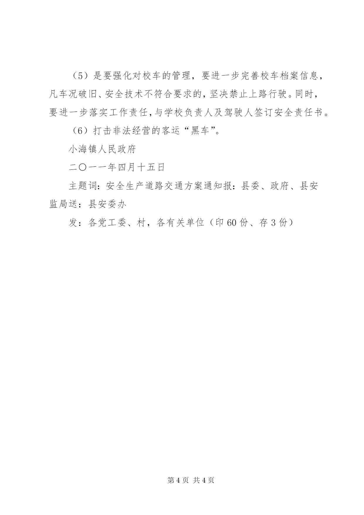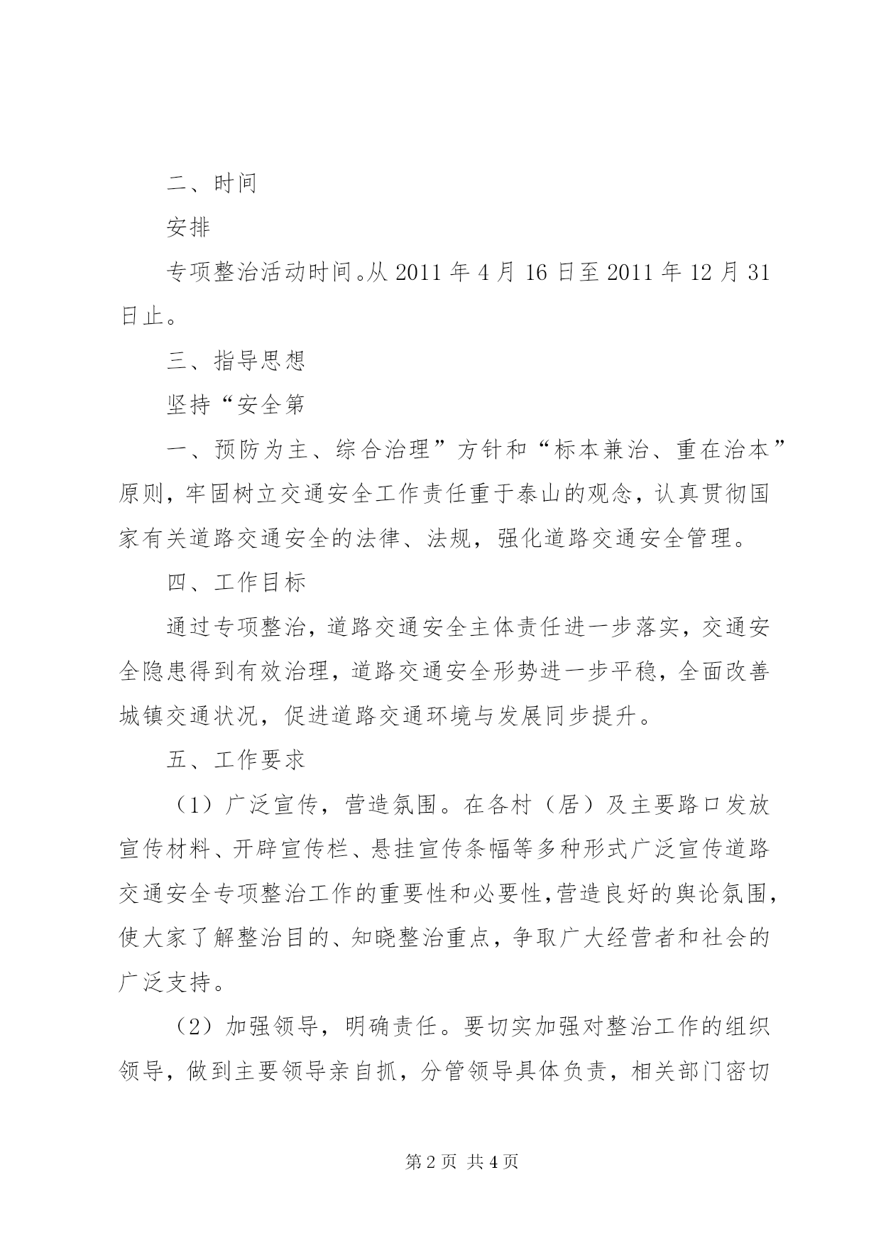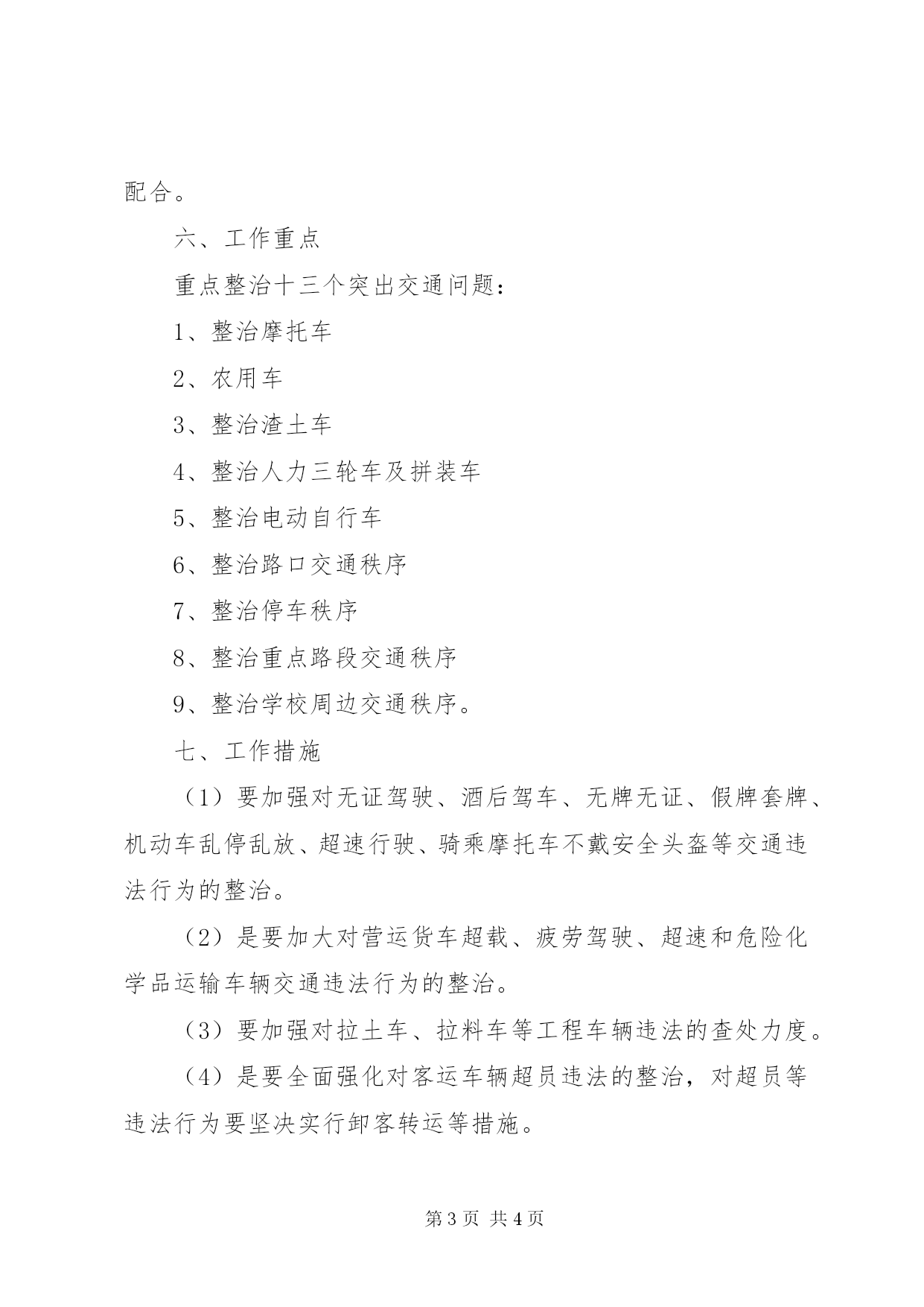 第PAGE\*Arabic\*MERGEFORMAT4页共NUMPAGES\*MERGEFORMAT4页道路交通整治方案(改)小府发〔2011〕109号小海镇2011年道路交通安全专项整治实施方案为认真贯彻落实县委、县政府关于XX县区交通管理综合治理工作会议精神,营造更加有序、畅通、和谐的交通环境,进一步巩固2010年道路交通安全专项整治成果,消除安全隐患,维护道路交通安全秩序,确保我镇道路交通安全形势安定稳定。根据县政府的要求,特制定我镇道路交通安全专项整治活动实施方案,如下:一、组织机构组长:孟广宁(镇党委副书记、镇长)副组长:柯贤奎(副镇长)陈祖尧(派出所所长)成员:赵庆林(镇司法所所长)冷圣(扶贫工作站主任)张泽良(镇财政所所长)杜德斌(党政办负责人)姬昌(镇安监站站长)卯仕美(镇妇联主席)兰洪平(镇城管中队队长)二、时间安排专项整治活动时间。从2011年4月16日至2011年12月31日止。三、指导思想坚持“安全第一、预防为主、综合治理”方针和“标本兼治、重在治本”原则,牢固树立交通安全工作责任重于泰山的观念,认真贯彻国家有关道路交通安全的法律、法规,强化道路交通安全管理。四、工作目标通过专项整治,道路交通安全主体责任进一步落实,交通安全隐患得到有效治理,道路交通安全形势进一步平稳,全面改善城镇交通状况,促进道路交通环境与发展同步提升。五、工作要求(1)广泛宣传,营造氛围。在各村(居)及主要路口发放宣传材料、开辟宣传栏、悬挂宣传条幅等多种形式广泛宣传道路交通安全专项整治工作的重要性和必要性,营造良好的舆论氛围,使大家了解整治目的、知晓整治重点,争取广大经营者和社会的广泛支持。(2)加强领导,明确责任。要切实加强对整治工作的组织领导,做到主要领导亲自抓,分管领导具体负责,相关部门密切配合。六、工作重点重点整治十三个突出交通问题:1、整治摩托车2、农用车3、整治渣土车4、整治人力三轮车及拼装车5、整治电动自行车6、整治路口交通秩序7、整治停车秩序8、整治重点路段交通秩序9、整治学校周边交通秩序。七、工作措施(1)要加强对无证驾驶、酒后驾车、无牌无证、假牌套牌、机动车乱停乱放、超速行驶、骑乘摩托车不戴安全头盔等交通违法行为的整治。(2)是要加大对营运货车超载、疲劳驾驶、超速和危险化学品运输车辆交通违法行为的整治。(3)要加强对拉土车、拉料车等工程车辆违法的查处力度。(4)是要全面强化对客运车辆超员违法的整治,对超员等违法行为要坚决实行卸客转运等措施。(5)是要强化对校车的管理,要进一步完善校车档案信息,凡车况破旧、安全技术不符合要求的,坚决禁止上路行驶。同时,要进一步落实工作责任,与学校负责人及驾驶人签订安全责任书。(6)打击非法经营的客运“黑车”。小海镇人民政府二○一一年四月十五日主题词:安全生产道路交通方案通知报:县委、政府、县安监局送:县安委办发:各党工委、村,各有关单位(印60份、存3份)