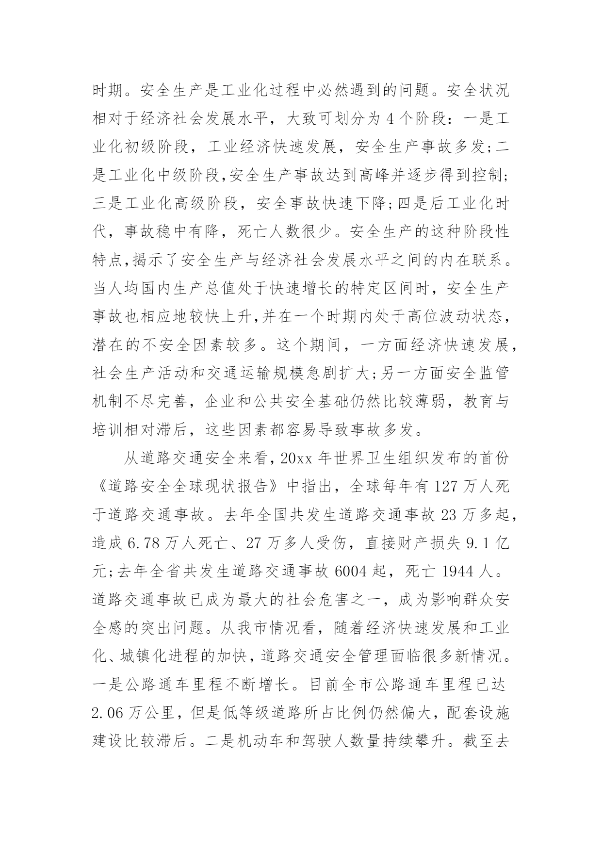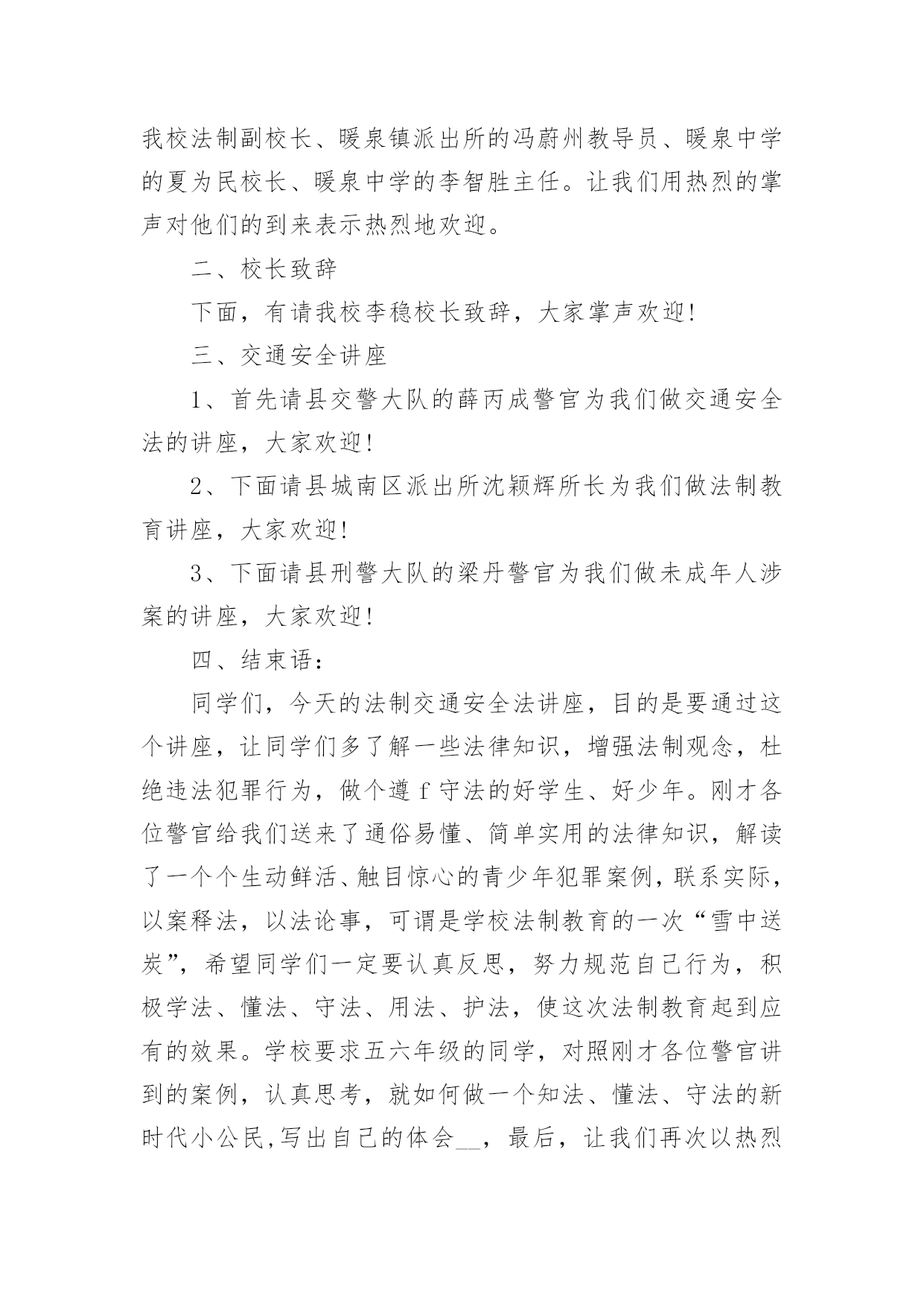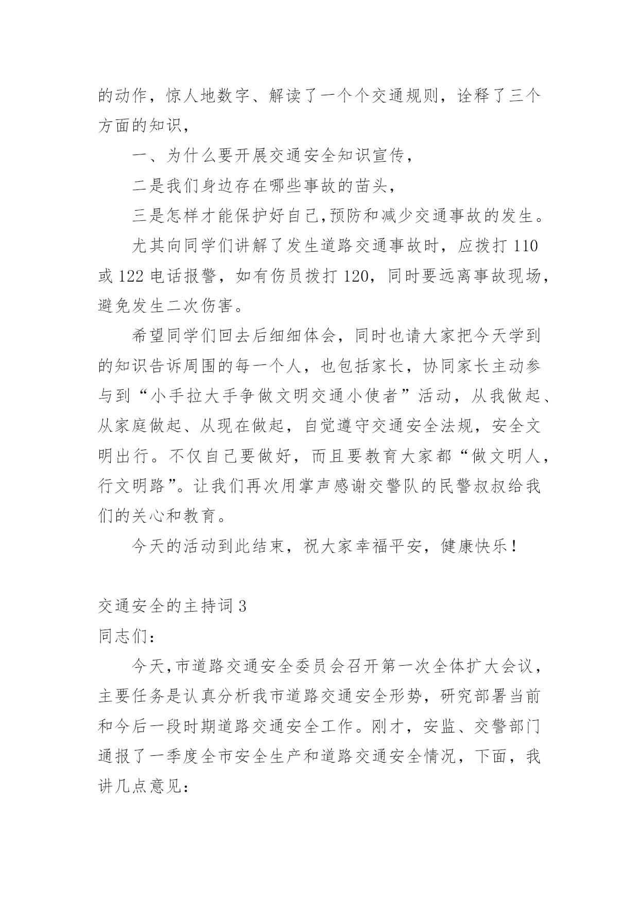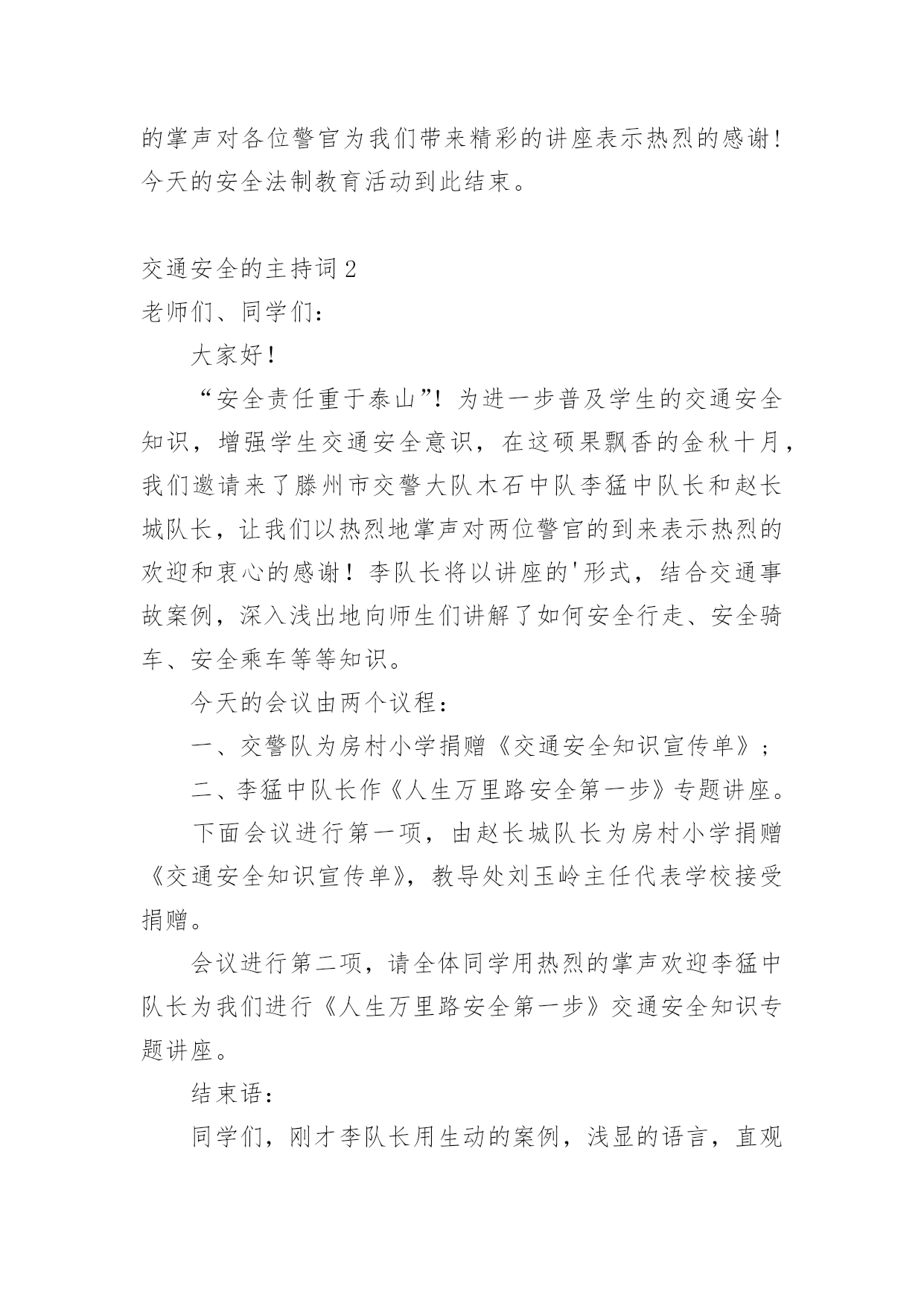 交通安全的主持词主持词要注意活动对象,针对活动对象写相应的主持词。在现在的社会生活中,主持词是活动、集会等的必需品,主持词怎么写才合适呢?下面是小编帮大家整理的交通安全的主持词,欢迎阅读与收藏。交通安全的主持词1尊敬的各位领导、来宾、老师们、亲爱的同学们:大家下午好!为了进一步贯彻落实法制教育进学校的指示精神,增强全体师生的法制观念和法律意识,加强学生的法制教育、f律教育和安全教育,促进广大师生学法、知法、懂法、守法、用法,做一个守法的小学生,依靠和拿起法律这把双刃利剑来保护自己,让学生在平安、健康中茁壮成长。今天,我们有幸还请到了县交警大队、县刑警大队、县城南区派出所的警官为我们做法制安全讲座。今天的法制教育意义特别深远,希望同学们一定要自觉遵守f律,认真听取和领会警官老师们的报告。一、介绍嘉宾:首先,给大家介绍一下今天来参加讲座的各位领导,他们是蔚县交警大队的马万勇队长、县交警大队办公室的c德峰主任、县交警大队宣教中队的'马玉广队长、交警大队的薛丙成警官、县交警大队南留庄中队的齐明队长、蔚州镇南区派出所的沈颖辉所长、刑警大队南留庄中队的梁丹警官、我校法制副校长、暖泉镇派出所的冯蔚州教导员、暖泉中学的夏为民校长、暖泉中学的李智胜主任。让我们用热烈的掌声对他们的到来表示热烈地欢迎。二、校长致辞下面,有请我校李稳校长致辞,大家掌声欢迎!三、交通安全讲座1、首先请县交警大队的薛丙成警官为我们做交通安全法的讲座,大家欢迎!2、下面请县城南区派出所沈颖辉所长为我们做法制教育讲座,大家欢迎!3、下面请县刑警大队的梁丹警官为我们做未成年人涉案的讲座,大家欢迎!四、结束语:同学们,今天的法制交通安全法讲座,目的是要通过这个讲座,让同学们多了解一些法律知识,增强法制观念,杜绝违法犯罪行为,做个遵f守法的好学生、好少年。刚才各位警官给我们送来了通俗易懂、简单实用的法律知识,解读了一个个生动鲜活、触目惊心的青少年犯罪案例,联系实际,以案释法,以法论事,可谓是学校法制教育的一次“雪中送炭”,希望同学们一定要认真反思,努力规范自己行为,积极学法、懂法、守法、用法、护法,使这次法制教育起到应有的效果。学校要求五六年级的同学,对照刚才各位警官讲到的案例,认真思考,就如何做一个知法、懂法、守法的新时代小公民,写出自己的体会__,最后,让我们再次以热烈的掌声对各位警官为我们带来精彩的讲座表示热烈的感谢!今天的安全法制教育活动到此结束。交通安全的主持词2老师们、同学们:大家好!“安全责任重于泰山”!为进一步普及学生的交通安全知识,增强学生交通安全意识,在这硕果飘香的金秋十月,我们邀请来了滕州市交警大队木石中队李猛中队长和赵长城队长,让我们以热烈地掌声对两位警官的到来表示热烈的欢迎和衷心的感谢!李队长将以讲座的'形式,结合交通事故案例,深入浅出地向师生们讲解了如何安全行走、安全骑车、安全乘车等等知识。今天的会议由两个议程:一、交警队为房村小学捐赠《交通安全知识宣传单》;二、李猛中队长作《人生万里路安全第一步》专题讲座。下面会议进行第一项,由赵长城队长为房村小学捐赠《交通安全知识宣传单》,教导处刘玉岭主任代表学校接受捐赠。会议进行第二项,请全体同学用热烈的掌声欢迎李猛中队长为我们进行《人生万里路安全第一步》交通安全知识专题讲座。结束语:同学们,刚才李队长用生动的案例,浅显的语言,直观的动作,惊人地数字、解读了一个个交通规则,诠释了三个方面的知识,一、为什么要开展交通安全知识宣传,二是我们身边存在哪些事故的苗头,三是怎样才能保护好自己,预防和减少交通事故的发生。尤其向同学们讲解了发生道路交通事故时,应拨打110或122电话报警,如有伤员拨打120,同时要远离事故现场,避免发生二次伤害。希望同学们回去后细细体会,同时也请大家把今天学到的知识告诉周围的每一个人,也包括家长,协同家长主动参与到“小手拉大手争做文明交通小使者”活动,从我做起、从家庭做起、从现在做起,自觉遵守交通安全法规,安全文明出行。不仅自己要做好,而且要教育大家都“做文明人,行文明路”。让我们再次用掌声感谢交警队的民警叔叔给我们的关心和教育。今天的活动到此结束,祝大家幸福平安,健康快乐!交通安全的主持词3同志们:今天,市道路交通安全委员会召开第一次全体扩大会议,主要任务是认真分析我市道路交通安全形势,研究部署当前和今后一段时期道路交通安全工作。刚才,安监、交警部门通报了一季度全市安全生产和道路交通安全情况,下面,我讲几点意见:近年来,全市各县区、各相关部门在市委、市政府的领导下,以“降事故、保平安、保畅通”为核心,以创建“平安畅通县区”为载体,狠抓“五整顿”、“三加强”各项措施的落实,加强事故预防工作,全市连续9年未发生一次死亡10人以上的特大道路交通事故,去年全市共发生道路交通事故390起,死亡10