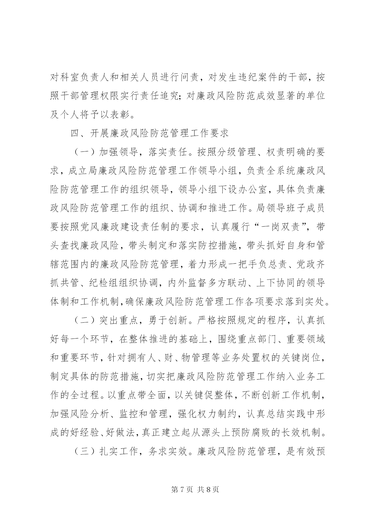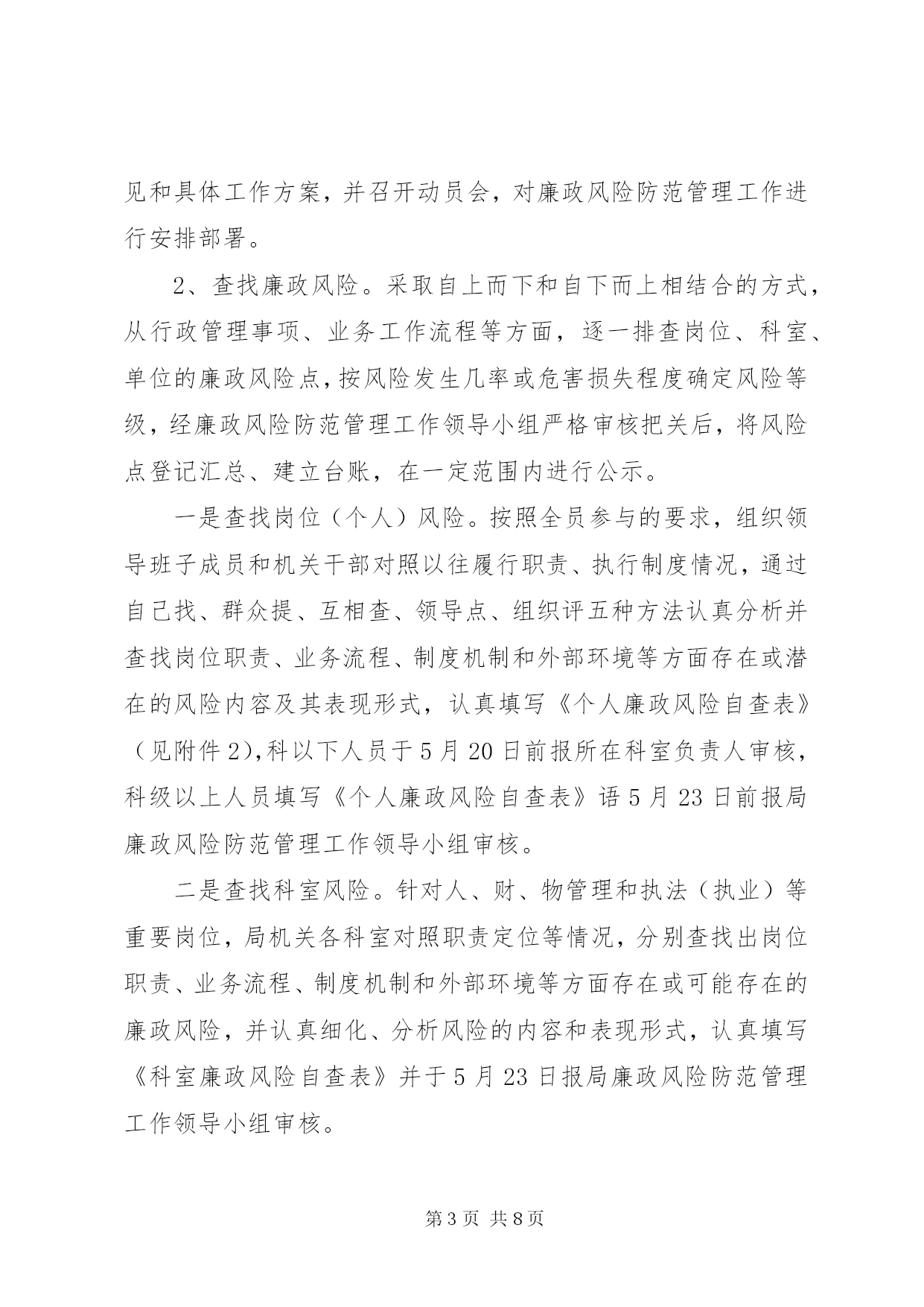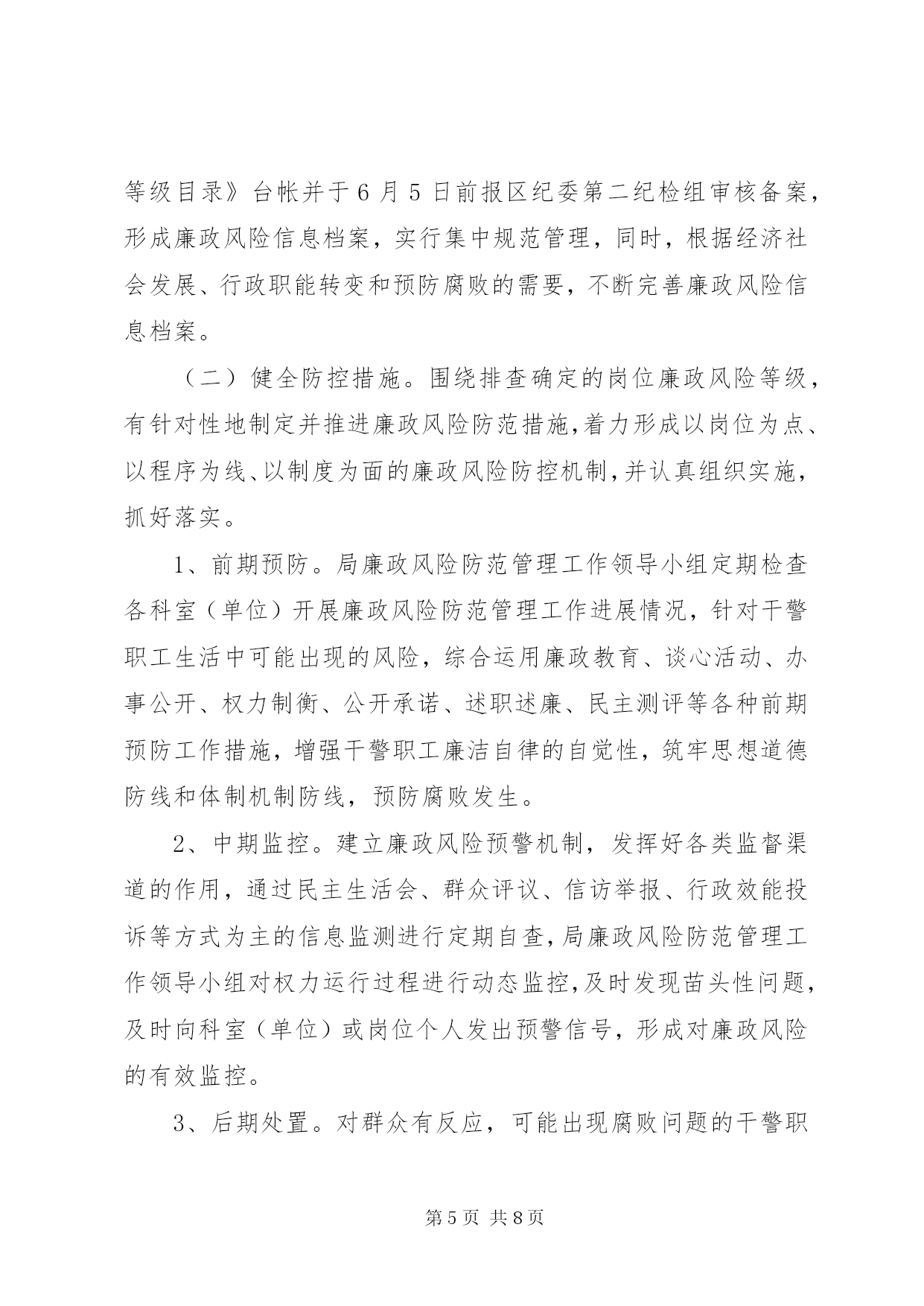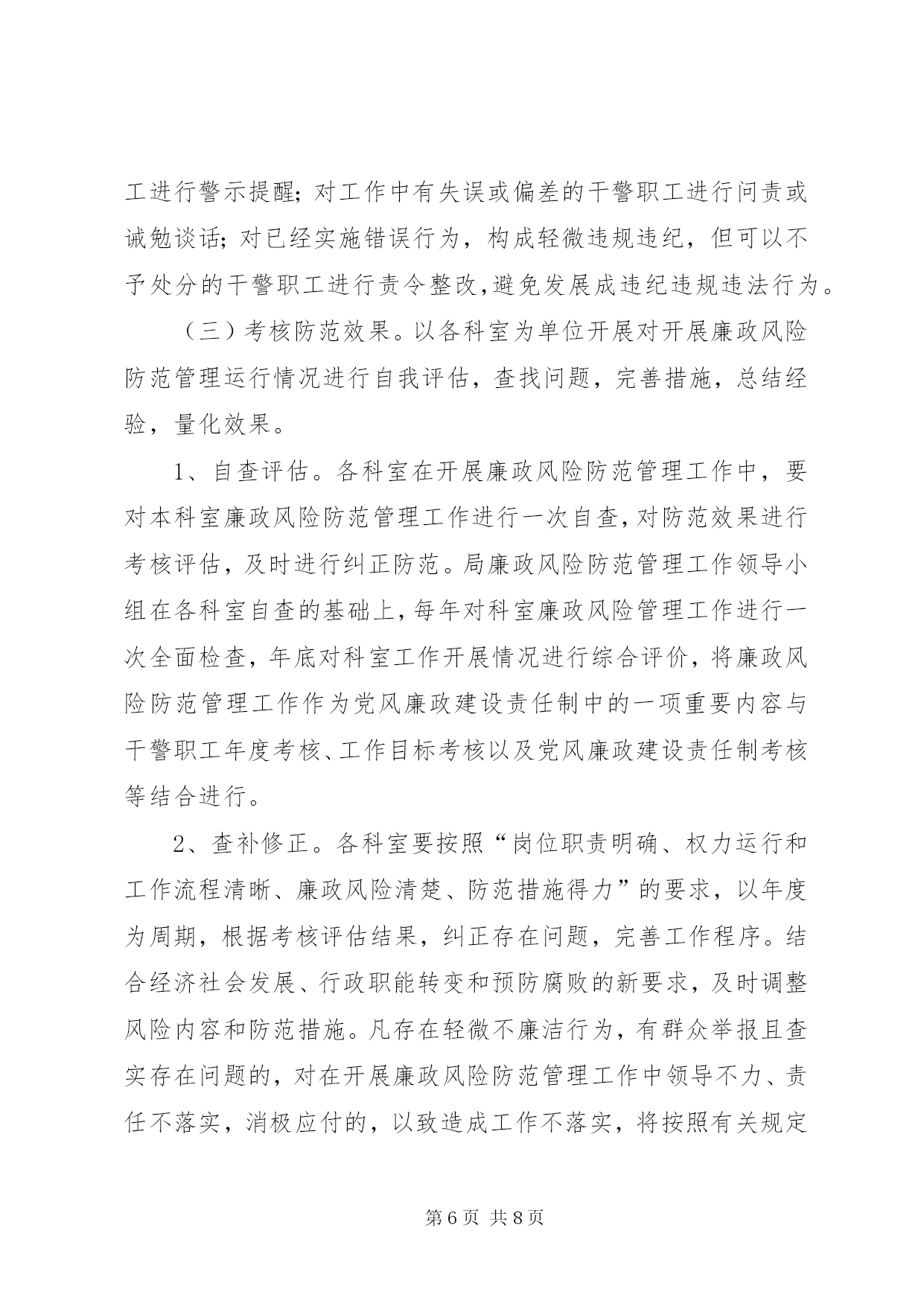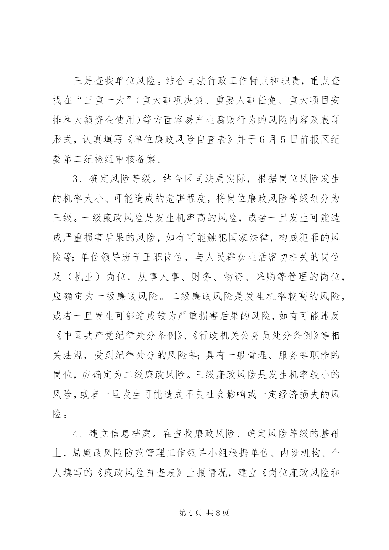 第PAGE\*Arabic\*MERGEFORMAT8页共NUMPAGES\*MERGEFORMAT8页司法机关廉政管理指导方案为进一步加强全区司法行政系统惩治和预防腐败体系建设,从源头和机制上预防治理腐败,构建有效制约监督权力运行的监控防范体系,按照济天办发[2011]5号文件要求,决定在全区司法行政系统开展廉政风险防范管理工作,现制定如下实施方案:一、指导思想坚持以邓小平理论和“三个代表”重要思想为指导,深入贯彻党的十七大精神,全面落实科学发展观,在坚决惩治腐败的同时,更加注重治本,更加注重预防,更加注重制度建设,把反腐倡廉建设的各项工作贯彻与司法行政系统的各个环节,突出抓好容易导致腐败的重点领域、关键环节和重要部位的防范工作,有效堵塞隐患和漏洞,构建符合司法行政系统实际的惩治和预防腐败体系,最大限度地降低腐败风险,提高预防腐败的能力,保障司法行政工作顺利进行。二、主要内容紧密结合司法行政实际,围绕监督制约和规范权力运行及影响工作成效的问题,从单位、科室、具体岗位“三个层次”认真查找在岗位职责、业务流程、制度机制和外部环境等方面可能发生的不廉洁行为和不作为、乱作为,以及可能导致各类事故发生的廉政风险,采取前期预防、中期监控、后期处置等防控措施,把消极腐败消除在萌芽状态,把风险隐患化解在初始阶段,形成“以岗位为点、以程序为线、以制度为面”的覆盖全局所有科室及岗位的廉政风险防范机制提高预防腐败工作的科学化,系统化水平。三、目标要求按照“全面开展、突出重点、扎实推进、务求实效”的总体要求,全区司法行政系统从2011年3月开始启动廉政风险防范管理工作,2011年6月全面开展,到2010年底,初步形成覆盖局机关所有科室及所有岗位的廉政风险防范管理工作网络,初步建成相关工作配套制度体系。到2012年底,形成比较完善的廉政风险防范管理长效机制,推动全系统反腐倡廉建设取得新的明显成效。四、方法步骤推进廉政风险防范管理工作分为三个阶段,即。排查廉政风险、健全防控措施、考核防范效果。(一)排查廉政风险阶段。结合单位、科室和岗位实际,认真查找廉政风险,做到查全、查准、查深,为制定廉政风险防控措施奠定基础1、学习动员。召开全体工作人员会议,对全系统廉政风险防范管理工作进行安排部署。组织局领导班子成员和机关干部认真学习区委区政府关于推进廉政风险防范管理工作的文件精神,统一思想,提高认识,研究制定廉政风险防范管理工作的实施意见和具体工作方案,并召开动员会,对廉政风险防范管理工作进行安排部署。2、查找廉政风险。采取自上而下和自下而上相结合的方式,从行政管理事项、业务工作流程等方面,逐一排查岗位、科室、单位的廉政风险点,按风险发生几率或危害损失程度确定风险等级,经廉政风险防范管理工作领导小组严格审核把关后,将风险点登记汇总、建立台账,在一定范围内进行公示。一是查找岗位(个人)风险。按照全员参与的要求,组织领导班子成员和机关干部对照以往履行职责、执行制度情况,通过自己找、群众提、互相查、领导点、组织评五种方法认真分析并查找岗位职责、业务流程、制度机制和外部环境等方面存在或潜在的风险内容及其表现形式,认真填写《个人廉政风险自查表》(见附件2),科以下人员于5月20日前报所在科室负责人审核,科级以上人员填写《个人廉政风险自查表》语5月23日前报局廉政风险防范管理工作领导小组审核。二是查找科室风险。针对人、财、物管理和执法(执业)等重要岗位,局机关各科室对照职责定位等情况,分别查找出岗位职责、业务流程、制度机制和外部环境等方面存在或可能存在的廉政风险,并认真细化、分析风险的内容和表现形式,认真填写《科室廉政风险自查表》并于5月23日报局廉政风险防范管理工作领导小组审核。三是查找单位风险。结合司法行政工作特点和职责,重点查找在“三重一大”(重大事项决策、重要人事任免、重大项目安排和大额资金使用)等方面容易产生腐败行为的风险内容及表现形式,认真填写《单位廉政风险自查表》并于6月5日前报区纪委第二纪检组审核备案。3、确定风险等级。结合区司法局实际,根据岗位风险发生的机率大小、可能造成的危害程度,将岗位廉政风险等级划分为三级。一级廉政风险是发生机率高的风险,或者一旦发生可能造成严重损害后果的风险,如有可能触犯国家法律,构成犯罪的风险等;单位领导班子正职岗位,与人民群众生活密切相关的岗位及(执业)岗位,从事人事、财务、物资、采购等管理的岗位,应确定为一级廉政风险。二级廉政风险是发生机率较高的风险,或者一旦发生可能造成较为严重损害后果的风险,如有可能违反《中国共产党纪律处分条例》、《行政机关公务员处分条例》等相关法规,受到纪律处分的风险等;具有一般管理、服务等职能的岗位,应确定为二级廉政风险。三级廉政风险是发生机率较小的风险,或者一旦发生可能造成不