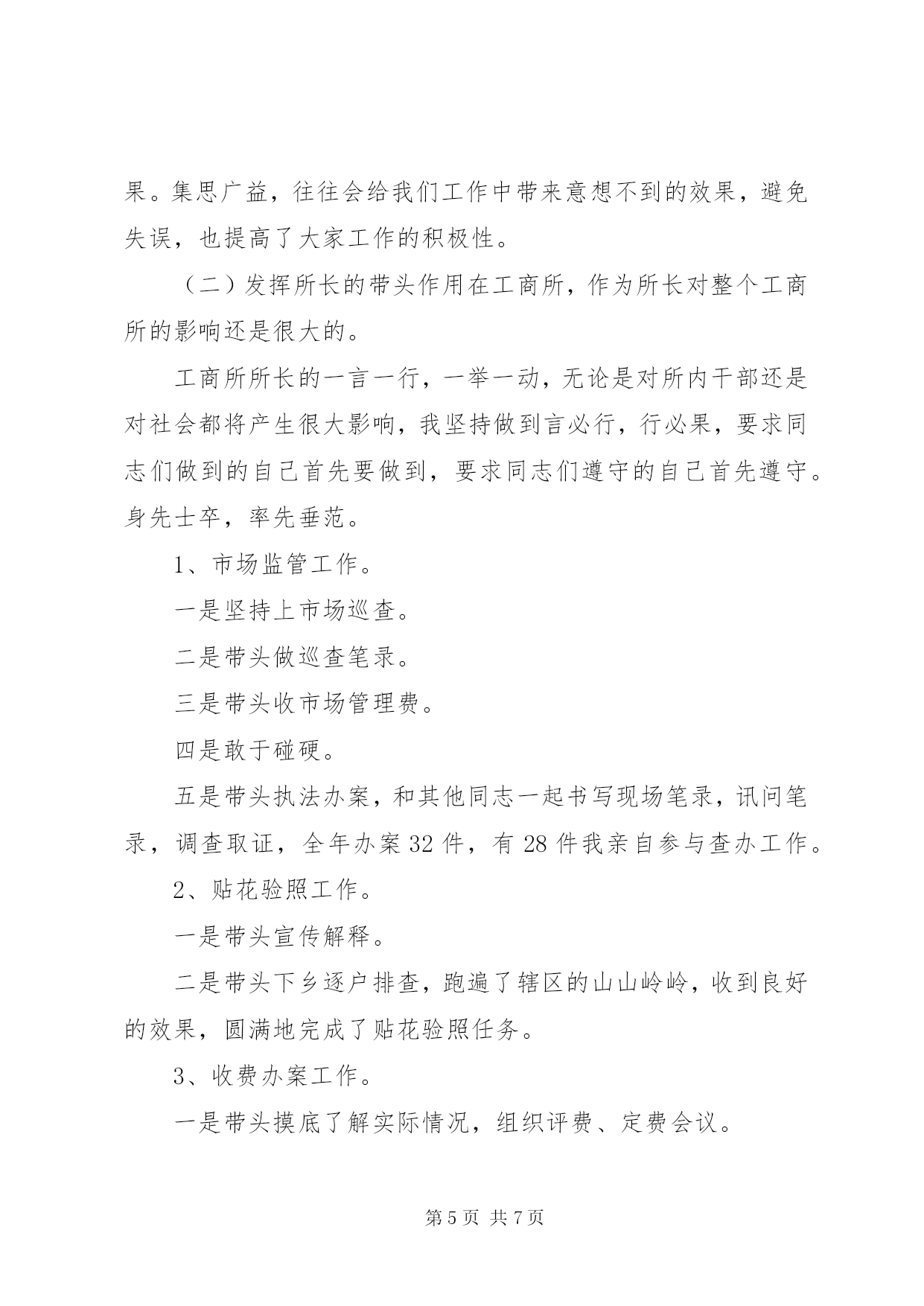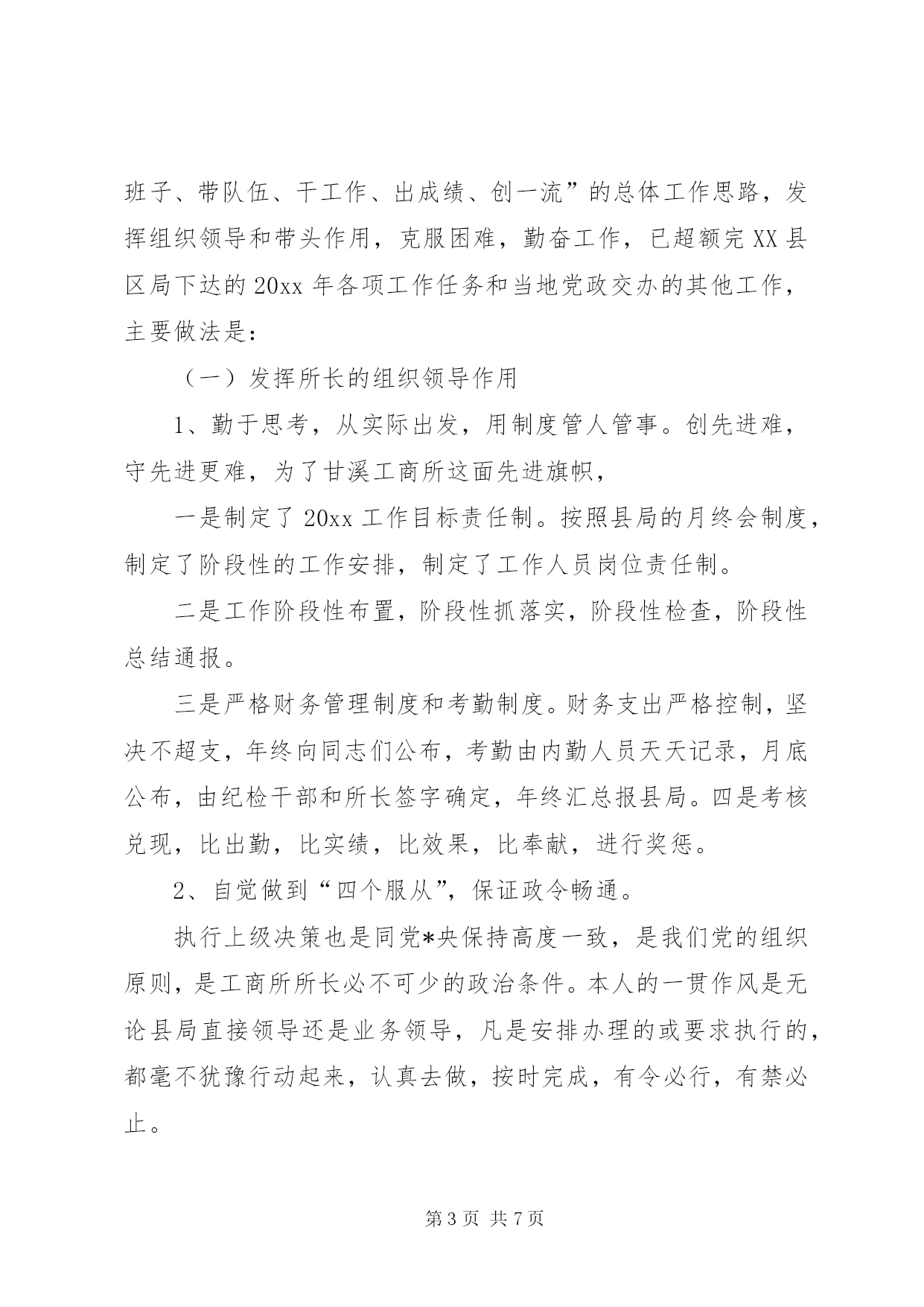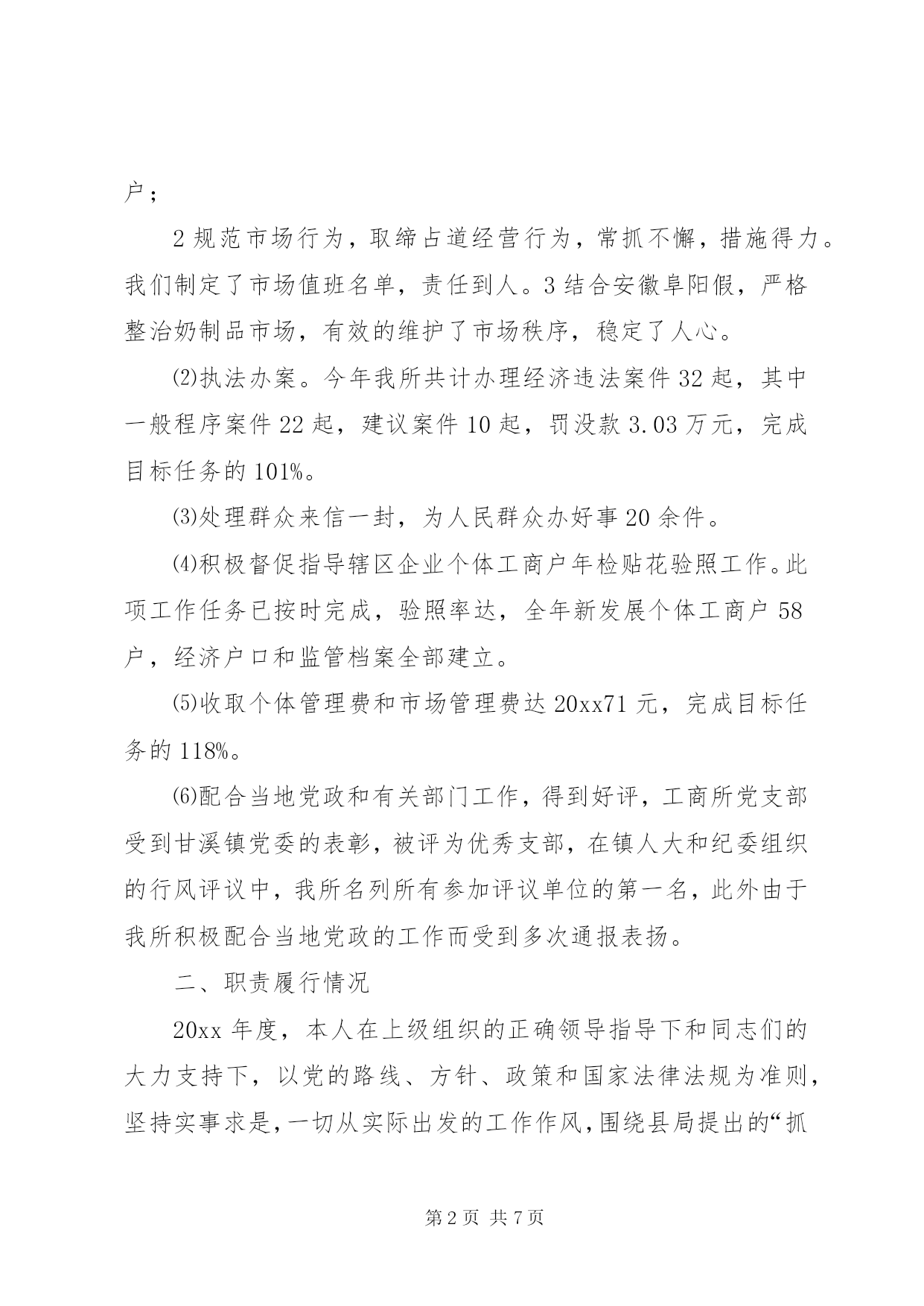 第PAGE\*Arabic\*MERGEFORMAT7页共NUMPAGES\*MERGEFORMAT7页工商所长年度述职报告述职人,***,男,42岁,汉族,现任**县工商行政管理局**工商所所长。现将本人20xx年度履行职责情况给领导和同志们作以简要汇报,敬请批评指正。一、工作职责及工作目标任务完成情况作为工商所所长,《工商行政管理所条例》第五条明确规定:“工商所实行所长负责制。”即总负责,主持全面工作,领导和带领全所工作人员贯彻执行党的路线方针政策,以及国家的法律、法规,保证完成《工商行政管理所条例》第三条规定的基本任务和上级局年初下达的各项工作目标任务以及各个阶段的具体工作任务,还有当地党政安排的其他的工作任务。20xx年度的主要工作目标任务是领导和带领全所干部加强市场监管,依法行政,保证正常的市场经济秩序,促进地方经济健康发展,做好企业年检和个体工商户验照工作,保护合法经营,打击非法经济活动,维护消费者合法权益,同时收取规费17.5万元,罚没收入3万元,做好当地党政委托的其他工作。经过全所干部苦战一年现已超额完成各项目标任务。⑴市场监管。1坚持不懈的打击制售假冒伪劣商品的违法行为,保护广大消费者的合法权益。今年共计进行市场专项检查20余次,销毁过期食品20多个品种,价值5000余元,受到处罚的经营户达32户;2规范市场行为,取缔占道经营行为,常抓不懈,措施得力。我们制定了市场值班名单,责任到人。3结合安徽阜阳假,严格整治奶制品市场,有效的维护了市场秩序,稳定了人心。⑵执法办案。今年我所共计办理经济违法案件32起,其中一般程序案件22起,建议案件10起,罚没款3.03万元,完成目标任务的101%。⑶处理群众来信一封,为人民群众办好事20余件。⑷积极督促指导辖区企业个体工商户年检贴花验照工作。此项工作任务已按时完成,验照率达,全年新发展个体工商户58户,经济户口和监管档案全部建立。⑸收取个体管理费和市场管理费达20xx71元,完成目标任务的118%。⑹配合当地党政和有关部门工作,得到好评,工商所党支部受到甘溪镇党委的表彰,被评为优秀支部,在镇人大和纪委组织的行风评议中,我所名列所有参加评议单位的第一名,此外由于我所积极配合当地党政的工作而受到多次通报表扬。二、职责履行情况20xx年度,本人在上级组织的正确领导指导下和同志们的大力支持下,以党的路线、方针、政策和国家法律法规为准则,坚持实事求是,一切从实际出发的工作作风,围绕县局提出的“抓班子、带队伍、干工作、出成绩、创一流”的总体工作思路,发挥组织领导和带头作用,克服困难,勤奋工作,已超额完XX县区局下达的20xx年各项工作任务和当地党政交办的其他工作,主要做法是:(一)发挥所长的组织领导作用1、勤于思考,从实际出发,用制度管人管事。创先进难,守先进更难,为了甘溪工商所这面先进旗帜,一是制定了20xx工作目标责任制。按照县局的月终会制度,制定了阶段性的工作安排,制定了工作人员岗位责任制。二是工作阶段性布置,阶段性抓落实,阶段性检查,阶段性总结通报。三是严格财务管理制度和考勤制度。财务支出严格控制,坚决不超支,年终向同志们公布,考勤由内勤人员天天记录,月底公布,由纪检干部和所长签字确定,年终汇总报县局。四是考核兑现,比出勤,比实绩,比效果,比奉献,进行奖惩。2、自觉做到“四个服从”,保证政令畅通。执行上级决策也是同党*央保持高度一致,是我们党的组织原则,是工商所所长必不可少的政治条件。本人的一贯作风是无论县局直接领导还是业务领导,凡是安排办理的或要求执行的,都毫不犹豫行动起来,认真去做,按时完成,有令必行,有禁必止。3、大局意识强,工作能驾驭全局,稳中求进。一是加强自身学习,不断提高政治理论水平和法律,法规知识,时常注意国家大政方针,观察形势,了解和分析局势发展,把握工商行政管理机关在不同时期的工作切入点。二是教育所内干部自觉做到“四个服从”工商所是工商局的派出机构,工商局的荣辱是工商所的荣辱,绝对服从县局指挥,任何时候都不含糊。三是想问题、干工作不是单纯的工商行政管理业务,而要结合国家改革、发展、稳定的大局,因为工商行政管理本身就是政府工作的一部分,其目的就是为了通过维护健康市场经济秩序来促进经济的发展。因此,当“禽流感”出现时,我们能全力配合政府抗击“禽流感”疫情;当姜农卖掉黄姜只换来白条时,我们挺身而出,为维护广大姜农的合法利益,代姜农向黄姜收购户“讨账”,维护诚信公平的市场交易秩序。总之,我们始终将工商行政管理工作融入政府的整个工作,收到较好效果,工作稳步推进。四是当内外因素发生变化时,能及时调整工作思路,争取工作上的主动和成功。4、博采众长,利用集体智慧,指导所上工作。在今年征收管理费上曾出现一户个体户拒绝缴纳管理费的情况,所上召集大家集思
