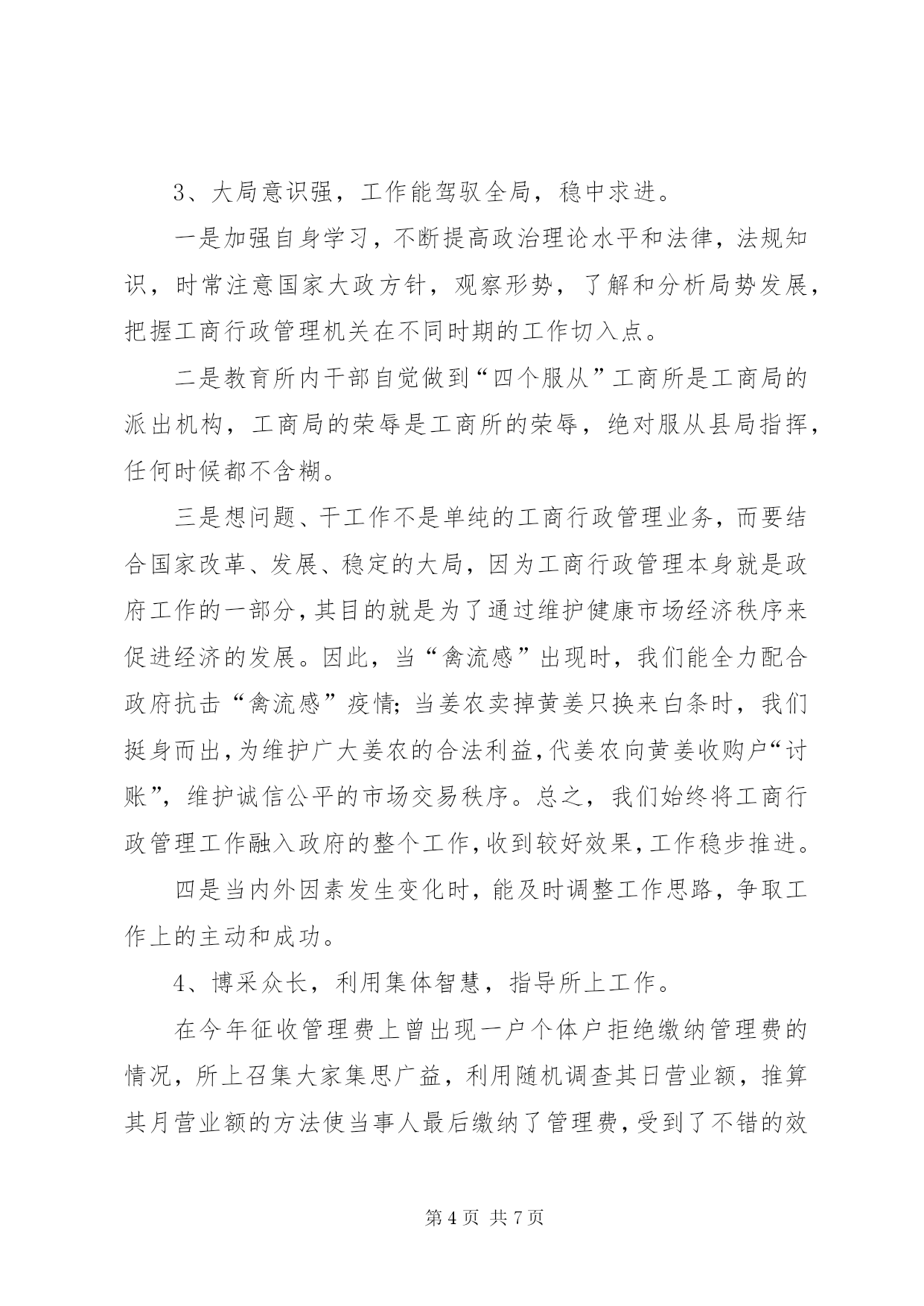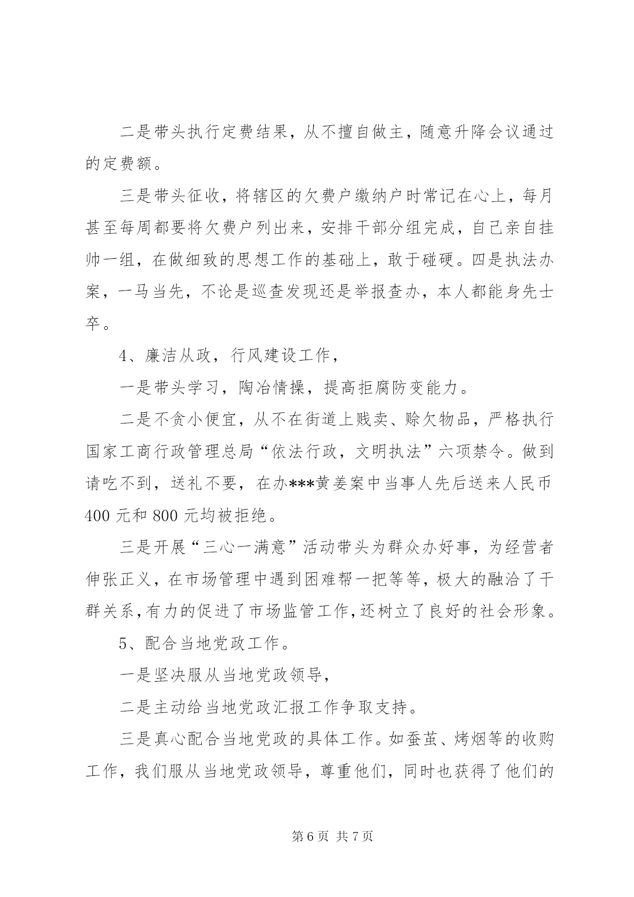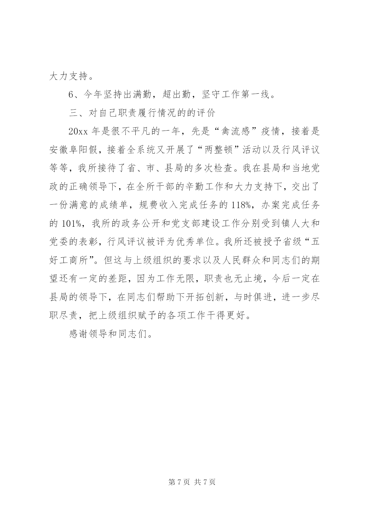第PAGE\*Arabic\*MERGEFORMAT7页共NUMPAGES\*MERGEFORMAT7页工商所长年度述职报告述职人,***,男,42岁,汉族,现任**县工商行政管理局**工商所所长。现将本人20xx年度履行职责情况给领导和同志们作以简要汇报,敬请批评指正。一、工作职责及工作目标任务完成情况作为工商所所长,《工商行政管理所条例》第五条明确规定:“工商所实行所长负责制。”即总负责,主持全面工作,领导和带领全所工作人员贯彻执行党的路线方针政策,以及国家的法律、法规,保证完成《工商行政管理所条例》第三条规定的基本任务和上级局年初下达的各项工作目标任务以及各个阶段的具体工作任务,还有当地党政安排的其他的工作任务。20xx年度的主要工作目标任务是领导和带领全所干部加强市场监管,依法行政,保证正常的市场经济秩序,促进地方经济健康发展,做好企业年检和个体工商户验照工作,保护合法经营,打击非法经济活动,维护消费者合法权益,同时收取规费17.5万元,罚没收入3万元,做好当地党政委托的其他工作。经过全所干部苦战一年现已超额完成各项目标任务。⑴市场监管。1坚持不懈的打击制售假冒伪劣商品的违法行为,保护广大消费者的合法权益。今年共计进行市场专项检查20余次,销毁过期食品20多个品种,价值5000余元,受到处罚的经营户达32户;2规范市场行为,取缔占道经营行为,常抓不懈,措施得力。我们制定了市场值班名单,责任到人。3结合安徽阜阳假,严格整治奶制品市场,有效的维护了市场秩序,稳定了人心。⑵执法办案。今年我所共计办理经济违法案件32起,其中一般程序案件22起,建议案件10起,罚没款3.03万元,完成目标任务的101%。⑶处理群众来信一封,为人民群众办好事20余件。⑷积极督促指导辖区企业个体工商户年检贴花验照工作。此项工作任务已按时完成,验照率达,全年新发展个体工商户58户,经济户口和监管档案全部建立。⑸收取个体管理费和市场管理费达20xx71元,完成目标任务的118%。⑹配合当地党政和有关部门工作,得到好评,工商所党支部受到甘溪镇党委的表彰,被评为优秀支部,在镇人大和纪委组织的行风评议中,我所名列所有参加评议单位的第一名,此外由于我所积极配合当地党政的工作而受到多次通报表扬。二、职责履行情况20xx年度,本人在上级组织的正确领导指导下和同志们的大力支持下,以党的路线、方针、政策和国家法律法规为准则,坚持实事求是,一切从实际出发的工作作风,围绕县局提出的“抓班子、带队伍、干工作、出成绩、创一流”的总体工作思路,发挥组织领导和带头作用,克服困难,勤奋工作,已超额完XX县区局下达的20xx年各项工作任务和当地党政交办的其他工作,主要做法是:(一)发挥所长的组织领导作用1、勤于思考,从实际出发,用制度管人管事。创先进难,守先进更难,为了甘溪工商所这面先进旗帜,一是制定了20xx工作目标责任制。按照县局的月终会制度,制定了阶段性的工作安排,制定了工作人员岗位责任制。二是工作阶段性布置,阶段性抓落实,阶段性检查,阶段性总结通报。三是严格财务管理制度和考勤制度。财务支出严格控制,坚决不超支,年终向同志们公布,考勤由内勤人员天天记录,月底公布,由纪检干部和所长签字确定,年终汇总报县局。四是考核兑现,比出勤,比实绩,比效果,比奉献,进行奖惩。2、自觉做到“四个服从”,保证政令畅通。执行上级决策也是同党*央保持高度一致,是我们党的组织原则,是工商所所长必不可少的政治条件。本人的一贯作风是无论县局直接领导还是业务领导,凡是安排办理的或要求执行的,都毫不犹豫行动起来,认真去做,按时完成,有令必行,有禁必止。3、大局意识强,工作能驾驭全局,稳中求进。一是加强自身学习,不断提高政治理论水平和法律,法规知识,时常注意国家大政方针,观察形势,了解和分析局势发展,把握工商行政管理机关在不同时期的工作切入点。二是教育所内干部自觉做到“四个服从”工商所是工商局的派出机构,工商局的荣辱是工商所的荣辱,绝对服从县局指挥,任何时候都不含糊。三是想问题、干工作不是单纯的工商行政管理业务,而要结合国家改革、发展、稳定的大局,因为工商行政管理本身就是政府工作的一部分,其目的就是为了通过维护健康市场经济秩序来促进经济的发展。因此,当“禽流感”出现时,我们能全力配合政府抗击“禽流感”疫情;当姜农卖掉黄姜只换来白条时,我们挺身而出,为维护广大姜农的合法利益,代姜农向黄姜收购户“讨账”,维护诚信公平的市场交易秩序。总之,我们始终将工商行政管理工作融入政府的整个工作,收到较好效果,工作稳步推进。四是当内外因素发生变化时,能及时调整工作思路,争取工作上的主动和成功。4、博采众长,利用集体智慧,指导所上工作。在今年征收管理费上曾出现一户个体户拒绝缴纳管理费的情况,所上召集大家集思