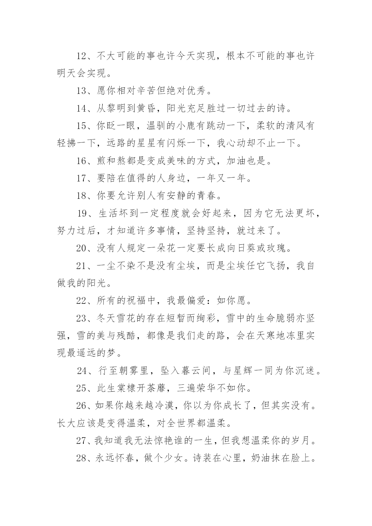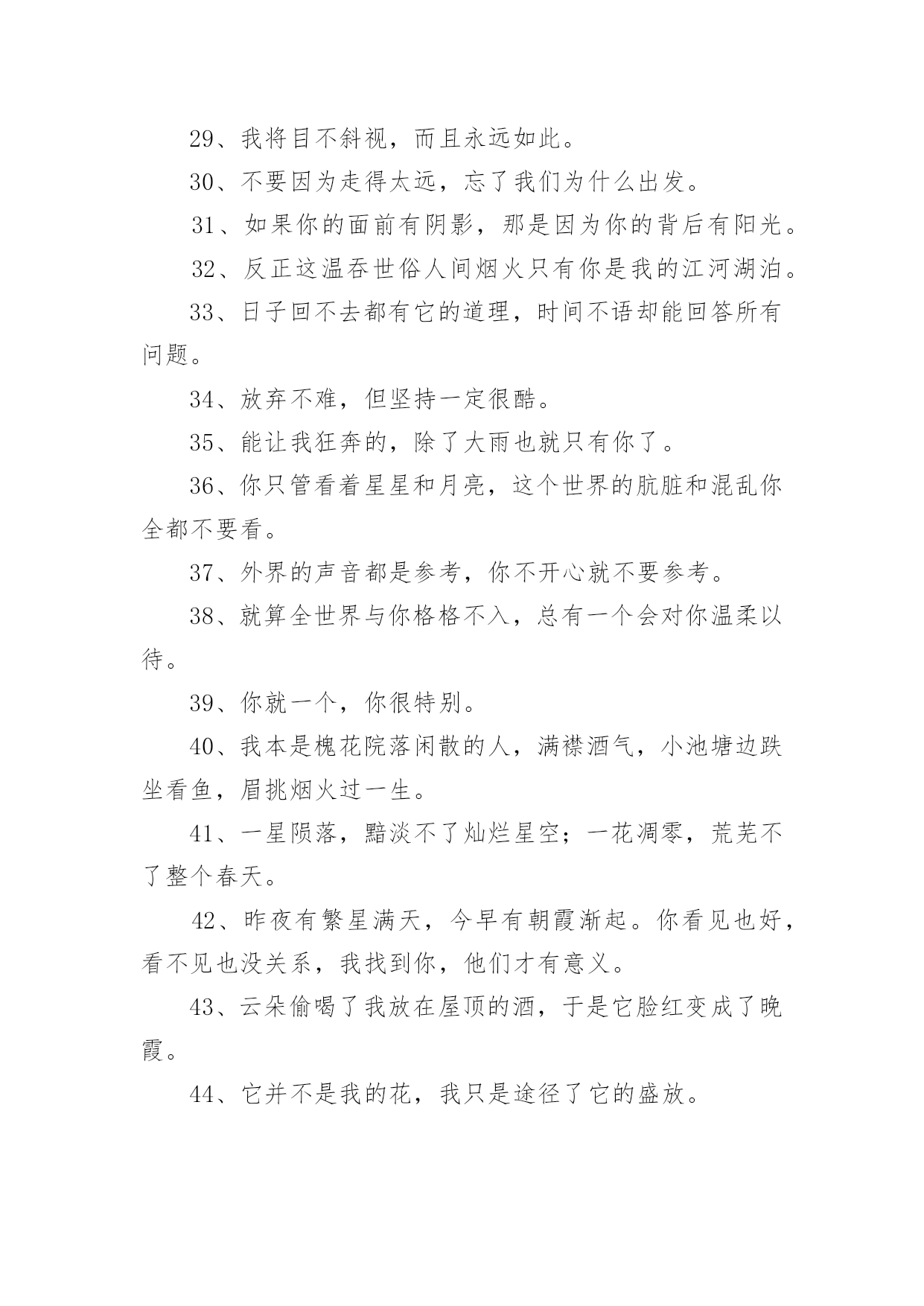 高质量温柔小众文案优选高质量温柔小众文案优选随着社交网络的发展,许多人都接触过一些比较经典的文案吧,文案用以分享自己对生活的思考,表达自己的喜怒哀乐。你知道什么样的文案才有创意吗?下面是小编为大家收集的高质量温柔小众文案优选,欢迎大家分享。1、是素未谋面的故人,却早已将彼此的温柔化解。2、我从没觉得孤独,说的浪漫些,我完全自由。3、你是我结束一天疲倦后,无意掀翻烛火怕,却能点燃我双眸盛满的月色的人。4、成熟不是为了走向复杂,而是为了抵达天真。5、如果运气不好,那就试试勇气。6、冬天从这里夺去的,春天会交还给你。7、世界上最让人底气十足的,不是尊重与平等,而是被偏爱。8、你不是暗淡渺小的星光,而是囊括了明月的整个银河。9、有时差的时候,我就会半夜起来,自己出去走一走,有点像偷来的时光。10、星星醉酒到处跑,月亮跌进深海,我以前从未觉得人间美好,直到你来了。11、再次经过那个老地方,我也成了人来人往。12、不大可能的事也许今天实现,根本不可能的事也许明天会实现。13、愿你相对辛苦但绝对优秀。14、从黎明到黄昏,阳光充足胜过一切过去的诗。15、你眨一眼,温驯的小鹿有跳动一下,柔软的清风有轻拂一下,远路的星星有闪烁一下,我心动却不止一下。16、煎和熬都是变成美味的方式,加油也是。17、要陪在值得的人身边,一年又一年。18、你要允许别人有安静的青春。19、生活坏到一定程度就会好起来,因为它无法更坏,努力过后,才知道许多事情,坚持坚持,就过来了。20、没有人规定一朵花一定要长成向日葵或玫瑰。21、一尘不染不是没有尘埃,而是尘埃任它飞扬,我自做我的阳光。22、所有的祝福中,我最偏爱:如你愿。23、冬天雪花的存在短暂而绚彩,雪中的生命脆弱亦坚强,雪的美与残酷,都像是我们走的路,会在天寒地冻里实现最遥远的梦。24、行至朝雾里,坠入暮云间,与星辉一同为你沉迷。25、此生棠棣开荼蘼,三遍荣华不如你。26、如果你越来越冷漠,你以为你成长了,但其实没有。长大应该是变得温柔,对全世界都温柔。27、我知道我无法惊艳谁的一生,但我想温柔你的岁月。28、永远怀春,做个少女。诗装在心里,奶油抹在脸上。29、我将目不斜视,而且永远如此。30、不要因为走得太远,忘了我们为什么出发。31、如果你的面前有阴影,那是因为你的背后有阳光。32、反正这温吞世俗人间烟火只有你是我的江河湖泊。33、日子回不去都有它的道理,时间不语却能回答所有问题。34、放弃不难,但坚持一定很酷。35、能让我狂奔的,除了大雨也就只有你了。36、你只管看着星星和月亮,这个世界的肮脏和混乱你全都不要看。37、外界的声音都是参考,你不开心就不要参考。38、就算全世界与你格格不入,总有一个会对你温柔以待。39、你就一个,你很特别。40、我本是槐花院落闲散的人,满襟酒气,小池塘边跌坐看鱼,眉挑烟火过一生。41、一星陨落,黯淡不了灿烂星空;一花凋零,荒芜不了整个春天。42、昨夜有繁星满天,今早有朝霞渐起。你看见也好,看不见也没关系,我找到你,他们才有意义。43、云朵偷喝了我放在屋顶的酒,于是它脸红变成了晚霞。44、它并不是我的花,我只是途径了它的盛放。