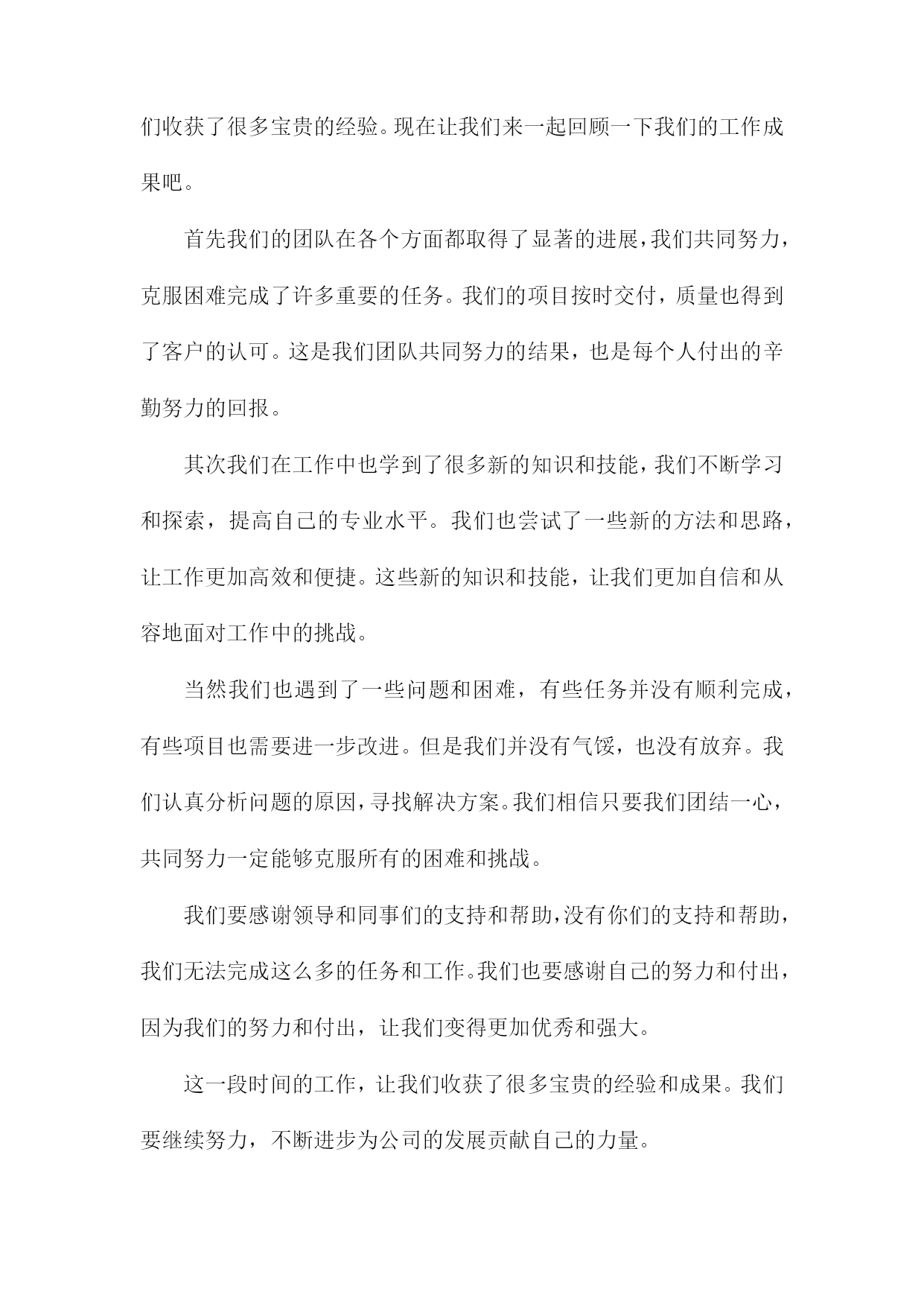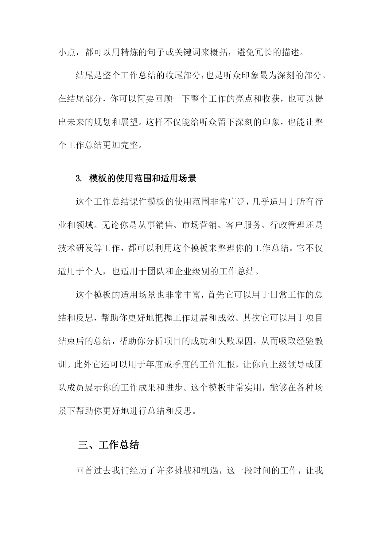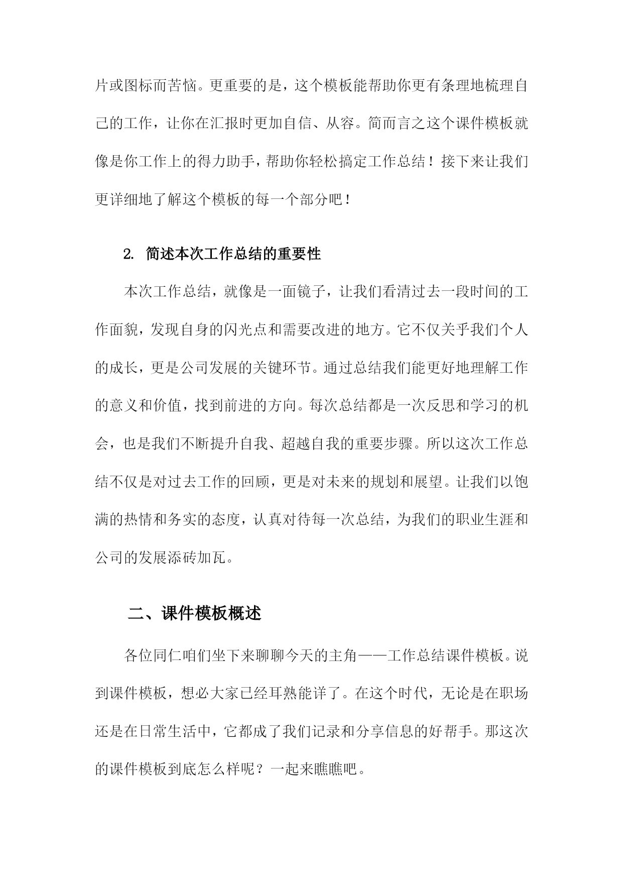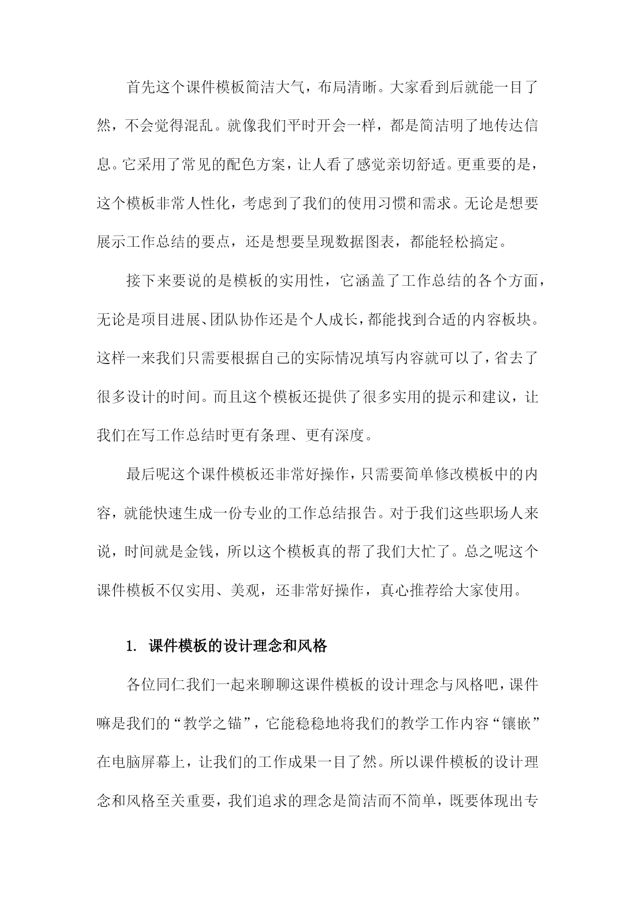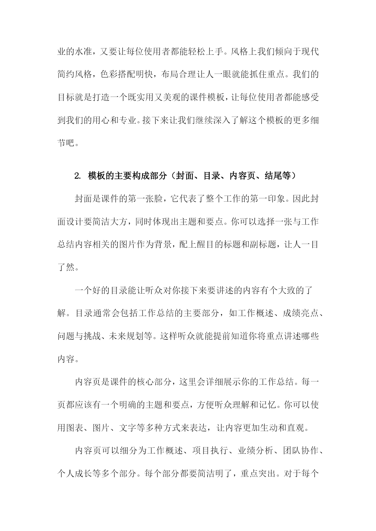 工作总结课件模板一、内容综述回首过去一段时间的工作,真是收获满满,感慨良多。我们团队共同奋斗,克服了一个又一个挑战,取得了一系列的成绩。今天就让我们一起回顾下这份沉甸甸的工作总结吧。在这段时间里,我们围绕公司的发展目标,齐心协力共同推进了多个重要项目。从项目启动到落地执行,每一步都离不开大家的辛勤付出。可以说我们在各个方面都取得了显著的进展,不仅提升了工作效率,还优化了工作流程,为公司的发展注入了新的活力。当然过程中也遇到了一些困难和挑战,但正是这些困难,让我们更加团结,更加坚定前行的步伐。这段时间的工作成果是令人振奋的,我们团队一起努力,一起奋斗共同创造了一个又一个亮点。当然未来的路还很长,我们还需要继续努力,继续前行。让我们携手共进,共同迎接新的挑战,创造更加辉煌的明天!1.介绍课件模板的背景和目的使用这个模板,你可以快速搭建出一个结构清晰、内容详实的工作总结报告。不再为繁琐的格式设置烦恼,也不再为找不到合适的图片或图标而苦恼。更重要的是,这个模板能帮助你更有条理地梳理自己的工作,让你在汇报时更加自信、从容。简而言之这个课件模板就像是你工作上的得力助手,帮助你轻松搞定工作总结!接下来让我们更详细地了解这个模板的每一个部分吧!2.简述本次工作总结的重要性本次工作总结,就像是一面镜子,让我们看清过去一段时间的工作面貌,发现自身的闪光点和需要改进的地方。它不仅关乎我们个人的成长,更是公司发展的关键环节。通过总结我们能更好地理解工作的意义和价值,找到前进的方向。每次总结都是一次反思和学习的机会,也是我们不断提升自我、超越自我的重要步骤。所以这次工作总结不仅是对过去工作的回顾,更是对未来的规划和展望。让我们以饱满的热情和务实的态度,认真对待每一次总结,为我们的职业生涯和公司的发展添砖加瓦。二、课件模板概述各位同仁咱们坐下来聊聊今天的主角——工作总结课件模板。说到课件模板,想必大家已经耳熟能详了。在这个时代,无论是在职场还是在日常生活中,它都成了我们记录和分享信息的好帮手。那这次的课件模板到底怎么样呢?一起来瞧瞧吧。首先这个课件模板简洁大气,布局清晰。大家看到后就能一目了然,不会觉得混乱。就像我们平时开会一样,都是简洁明了地传达信息。它采用了常见的配色方案,让人看了感觉亲切舒适。更重要的是,这个模板非常人性化,考虑到了我们的使用习惯和需求。无论是想要展示工作总结的要点,还是想要呈现数据图表,都能轻松搞定。接下来要说的是模板的实用性,它涵盖了工作总结的各个方面,无论是项目进展、团队协作还是个人成长,都能找到合适的内容板块。这样一来我们只需要根据自己的实际情况填写内容就可以了,省去了很多设计的时间。而且这个模板还提供了很多实用的提示和建议,让我们在写工作总结时更有条理、更有深度。最后呢这个课件模板还非常好操作,只需要简单修改模板中的内容,就能快速生成一份专业的工作总结报告。对于我们这些职场人来说,时间就是金钱,所以这个模板真的帮了我们大忙了。总之呢这个课件模板不仅实用、美观,还非常好操作,真心推荐给大家使用。1.课件模板的设计理念和风格各位同仁我们一起来聊聊这课件模板的设计理念与风格吧,课件嘛是我们的“教学之锚”,它能稳稳地将我们的教学工作内容“镶嵌”在电脑屏幕上,让我们的工作成果一目了然。所以课件模板的设计理念和风格至关重要,我们追求的理念是简洁而不简单,既要体现出专业的水准,又要让每位使用者都能轻松上手。风格上我们倾向于现代简约风格,色彩搭配明快,布局合理让人一眼就能抓住重点。我们的目标就是打造一个既实用又美观的课件模板,让每位使用者都能感受到我们的用心和专业。接下来让我们继续深入了解这个模板的更多细节吧。2.模板的主要构成部分(封面、目录、内容页、结尾等)封面是课件的第一张脸,它代表了整个工作的第一印象。因此封面设计要简洁大方,同时体现出主题和要点。你可以选择一张与工作总结内容相关的图片作为背景,配上醒目的标题和副标题,让人一目了然。一个好的目录能让听众对你接下来要讲述的内容有个大致的了解。目录通常会包括工作总结的主要部分,如工作概述、成绩亮点、问题与挑战、未来规划等。这样听众就能提前知道你将重点讲述哪些内容。内容页是课件的核心部分,这里会详细展示你的工作总结。每一页都应该有一个明确的主题和要点,方便听众理解和记忆。你可以使用图表、图片、文字等多种方式来表达,让内容更加生动和直观。内容页可以细分为工作概述、项目执行、业绩分析、团队协作、个人成长等多个部分。每个部分都要简洁明了,重点突出。对于每个小点,都可以用精炼的句子或关键词来概括,避免冗长的描述。结尾是整个工作总结的收尾部分,也是听众印象最为深刻的部分。在结尾部分,你可以简要回顾一下整个工作的亮点和收获,也可以提出未来的规划和展望。这样不